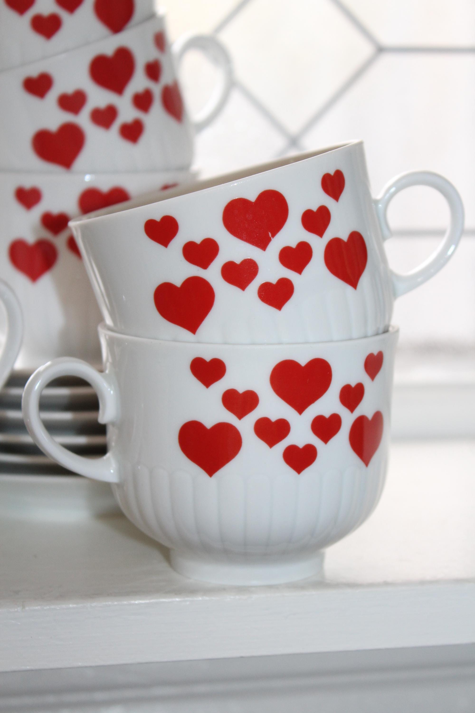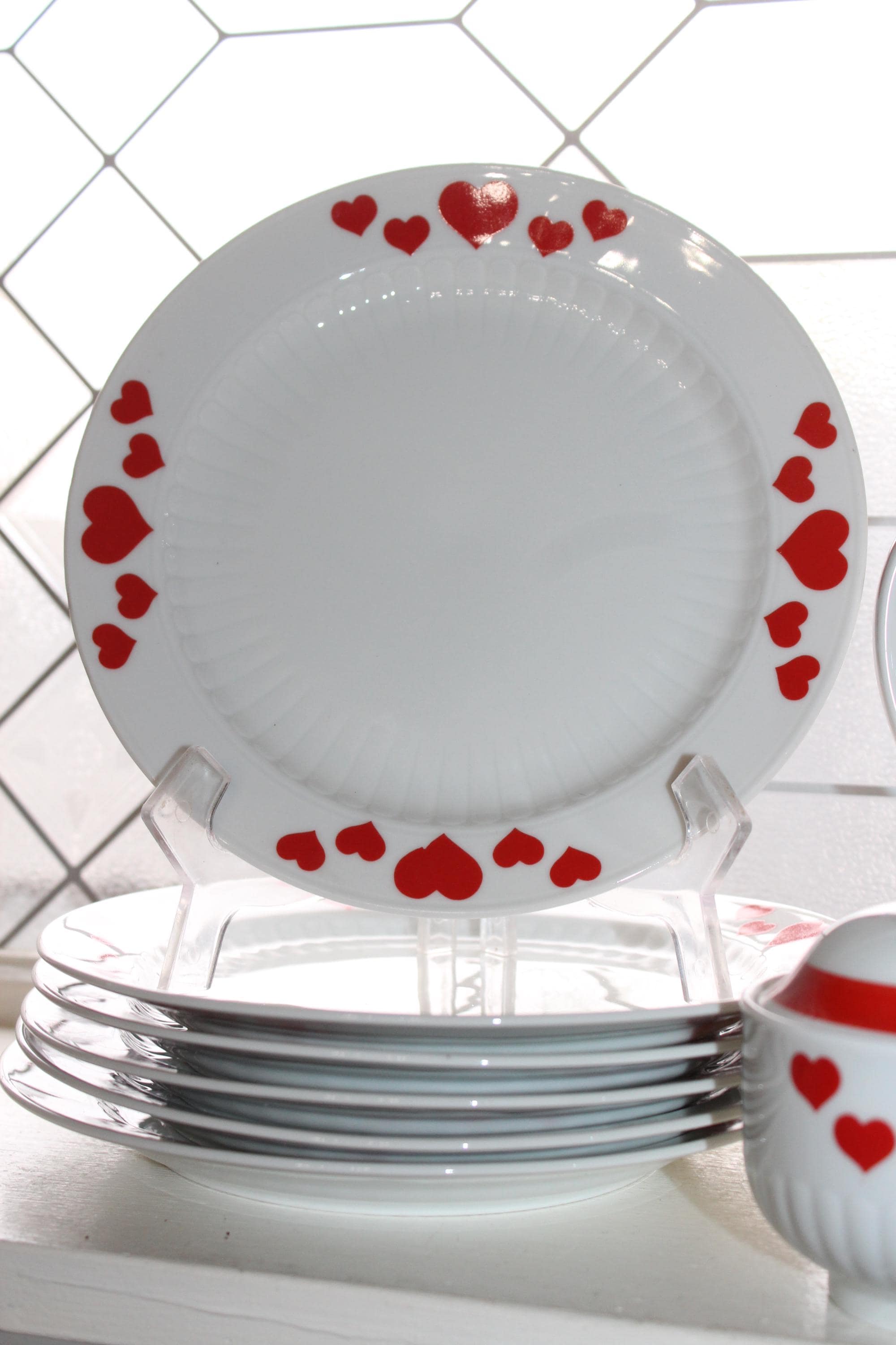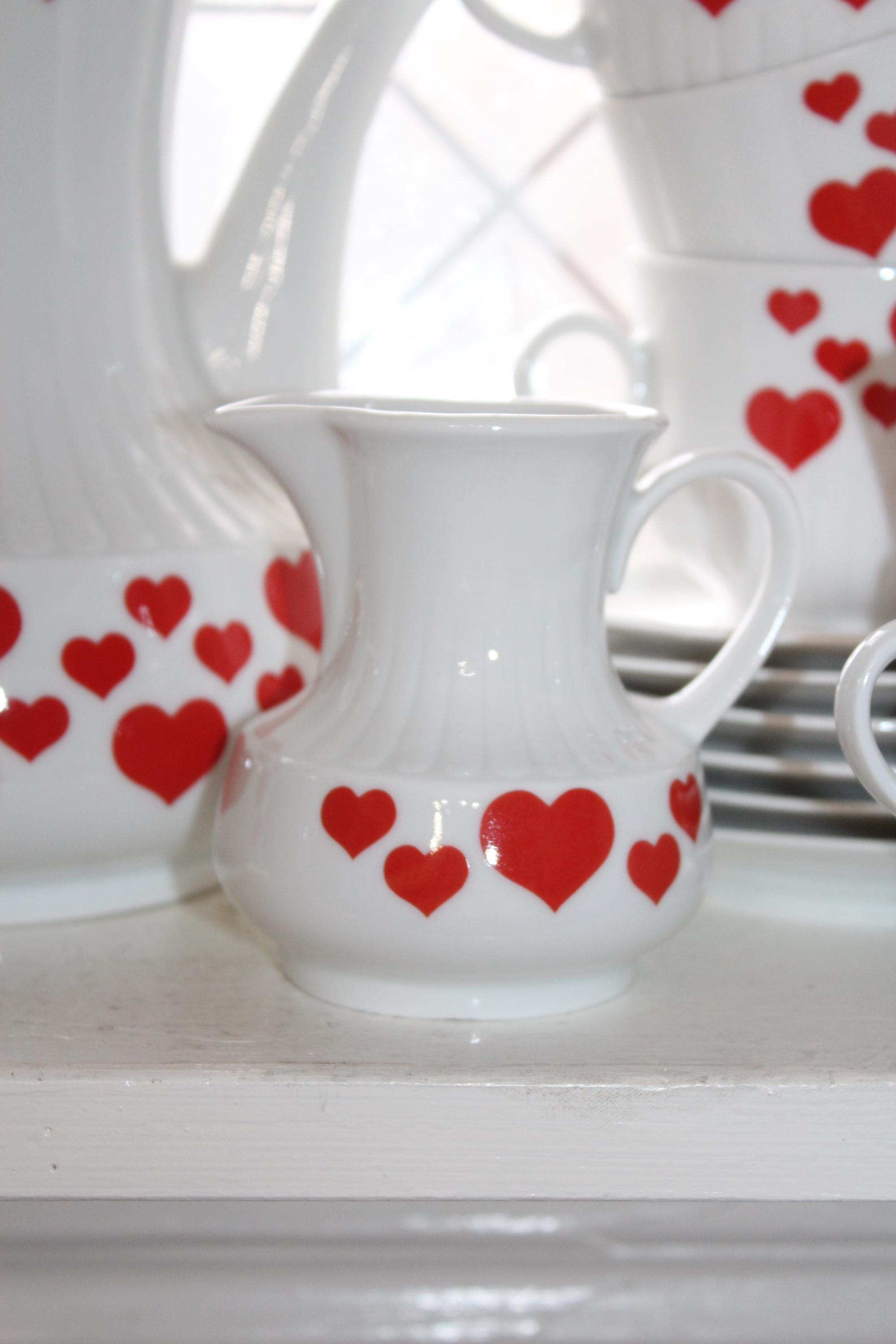 Vintage Winterling Marktleuthen Bavaria Hearts luncheon set/tea service, great for use or display. Wonderful Mid Century styling with a bold red and white hearts design. The set consists of teapot or coffee pot with lid, creamer, sugar bowl with lid, 6 luncheon or salad plates, 5 cups, 6 saucers. The plates measure 7 3/4" wide. No chips or cracks, just some age appropriate light wear on the plates. Enjoy!