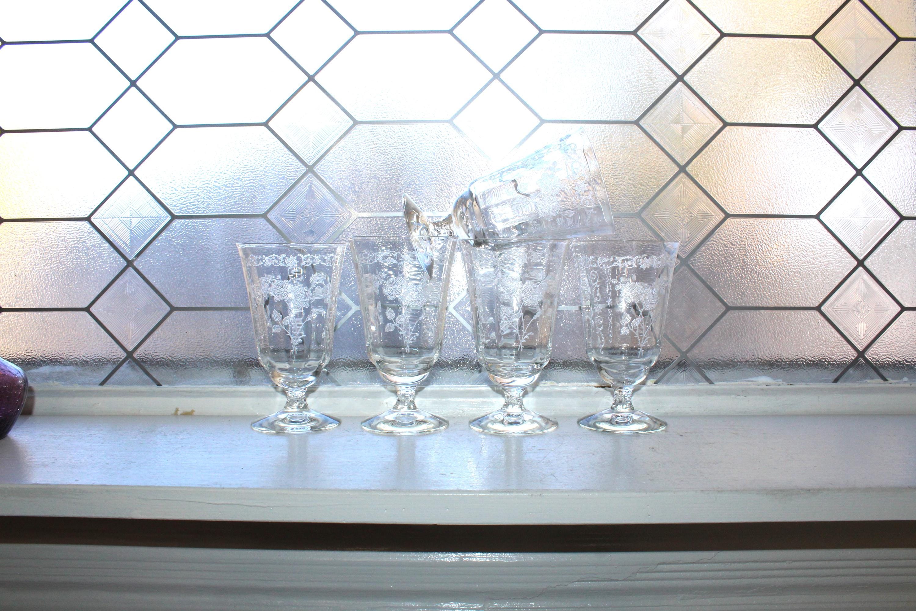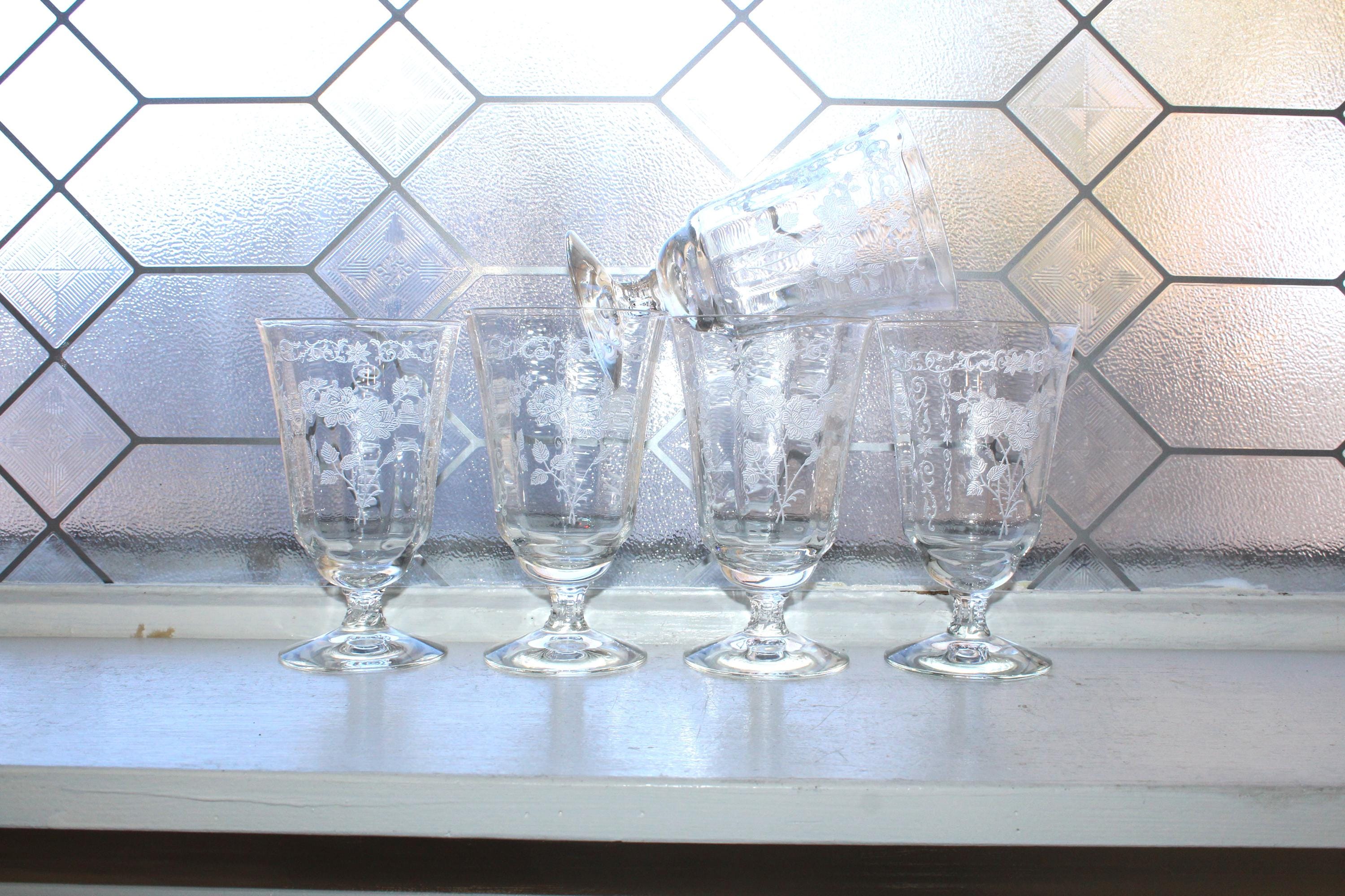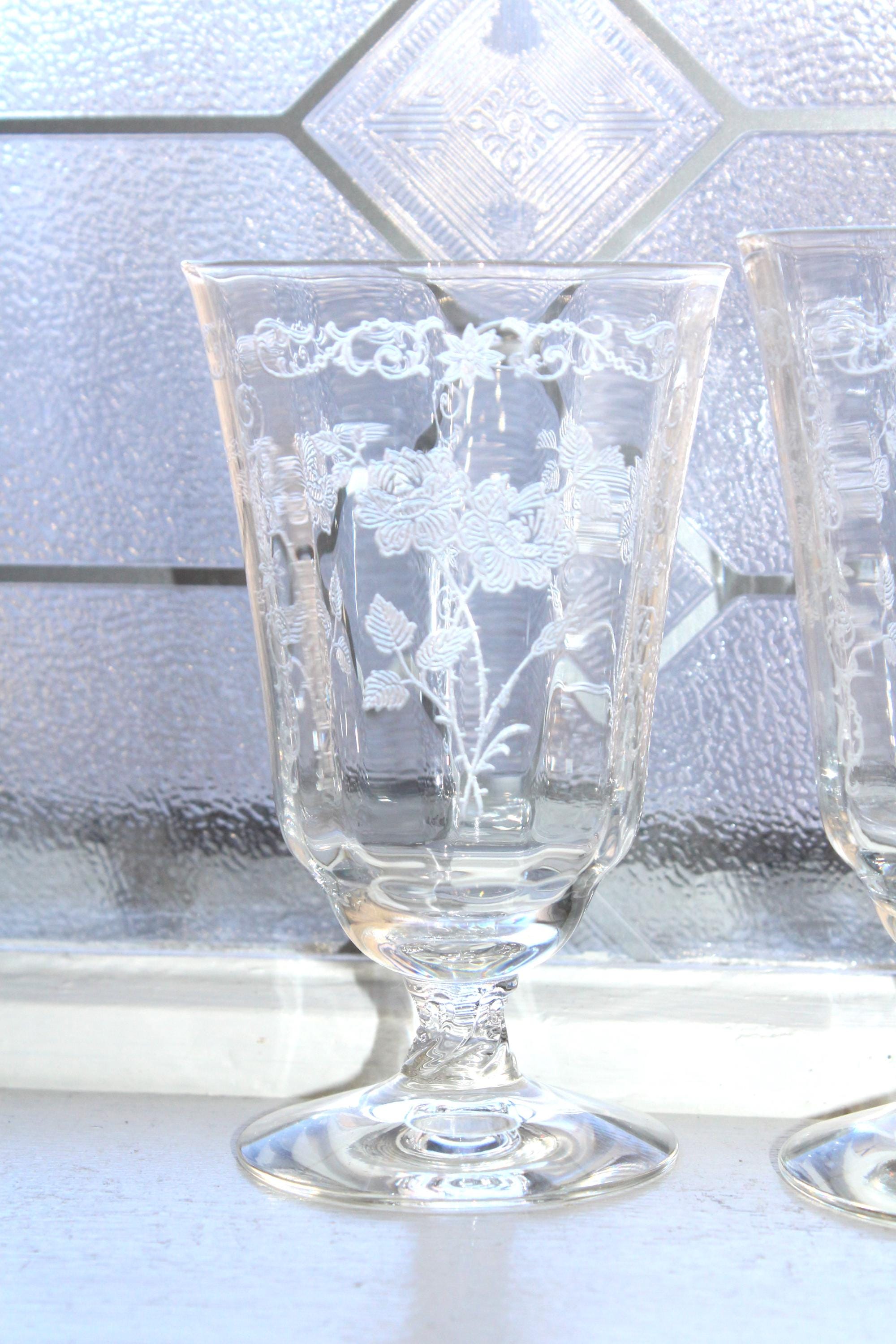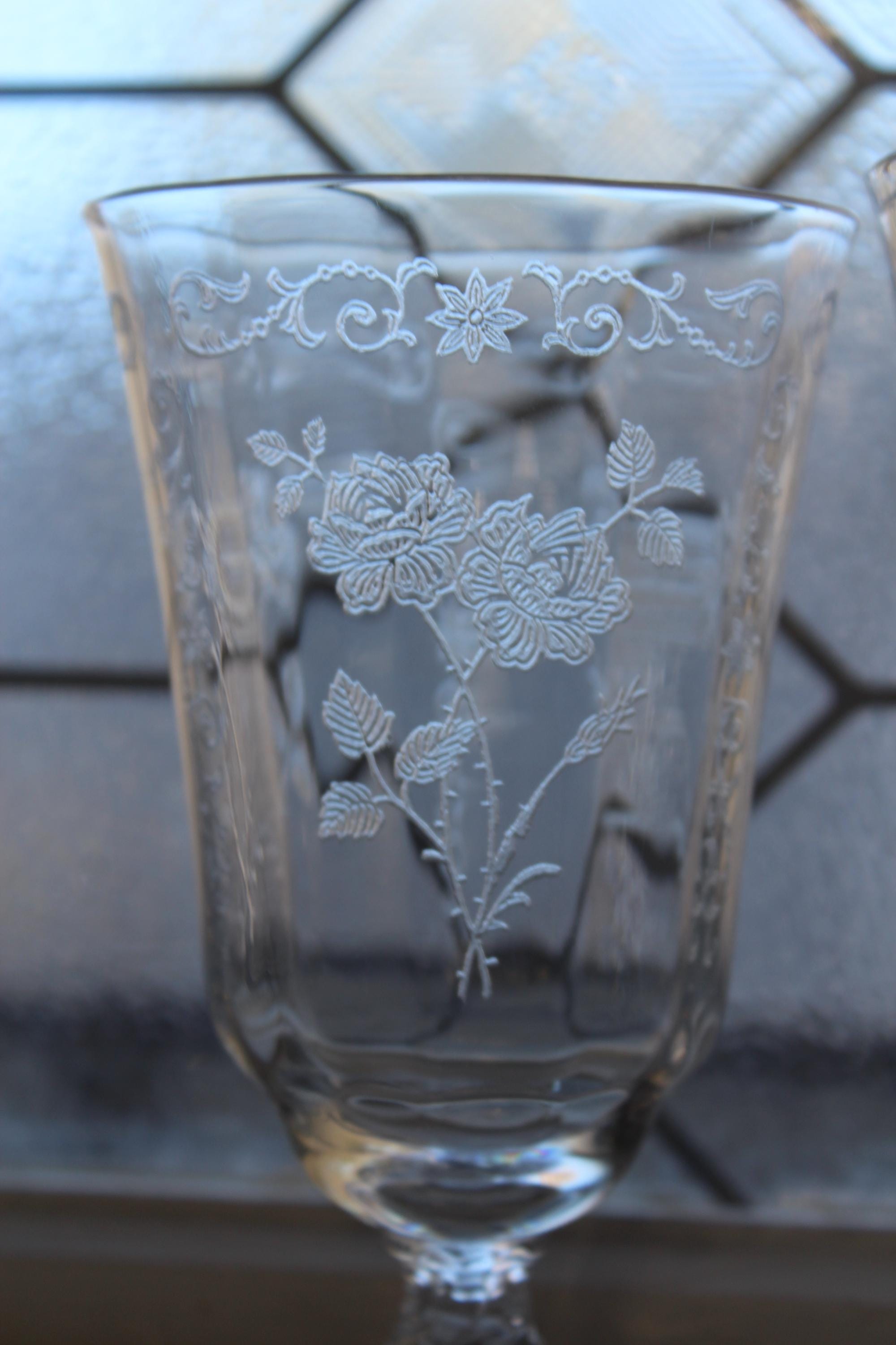 5 vintage 1950s Fostoria glass Midnight Rose etched glass footed tumblers, in excellent condition. They measure 5 1/4" high. No chips or cracks, perfect for use or display. Enjoy!