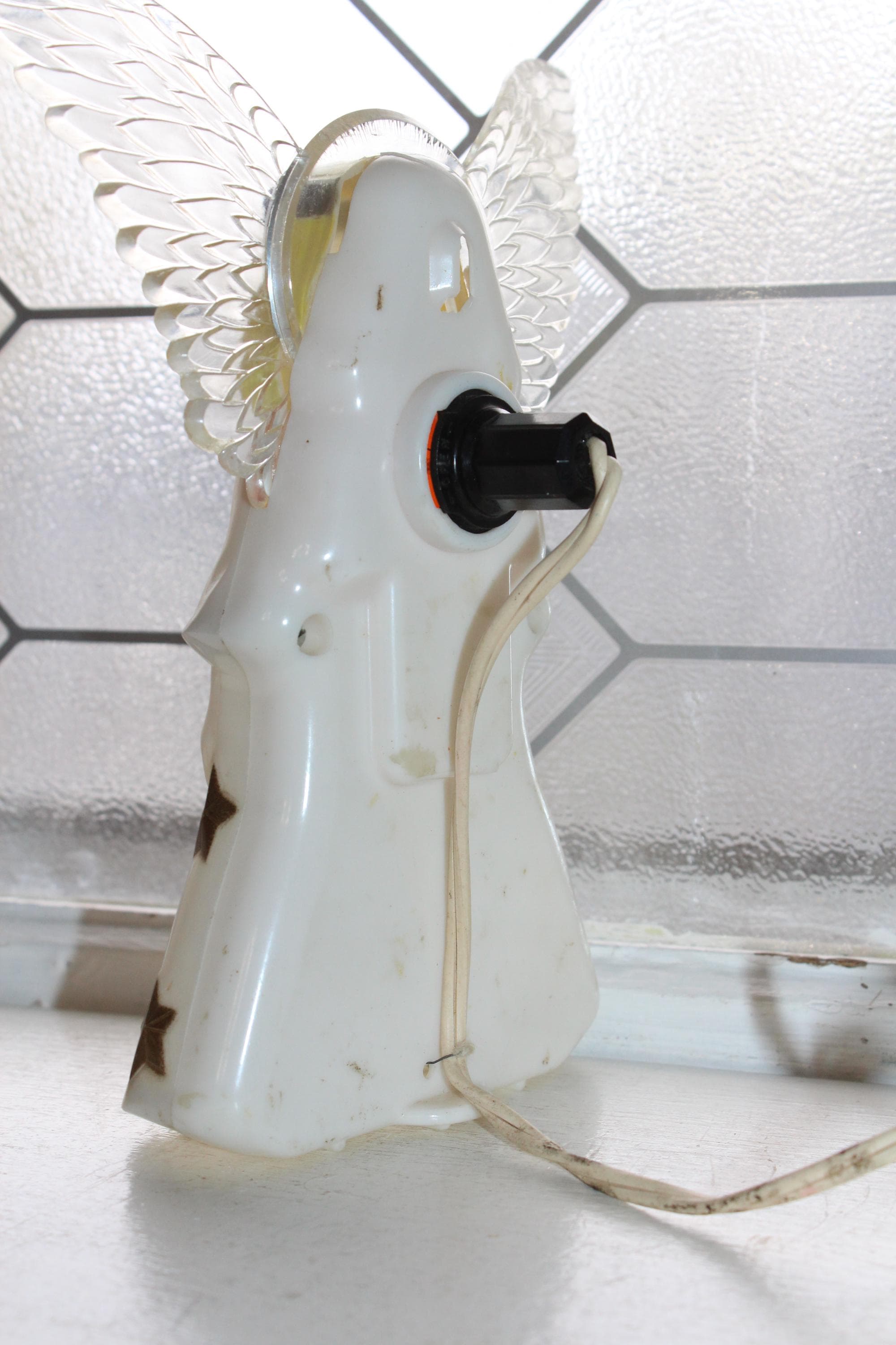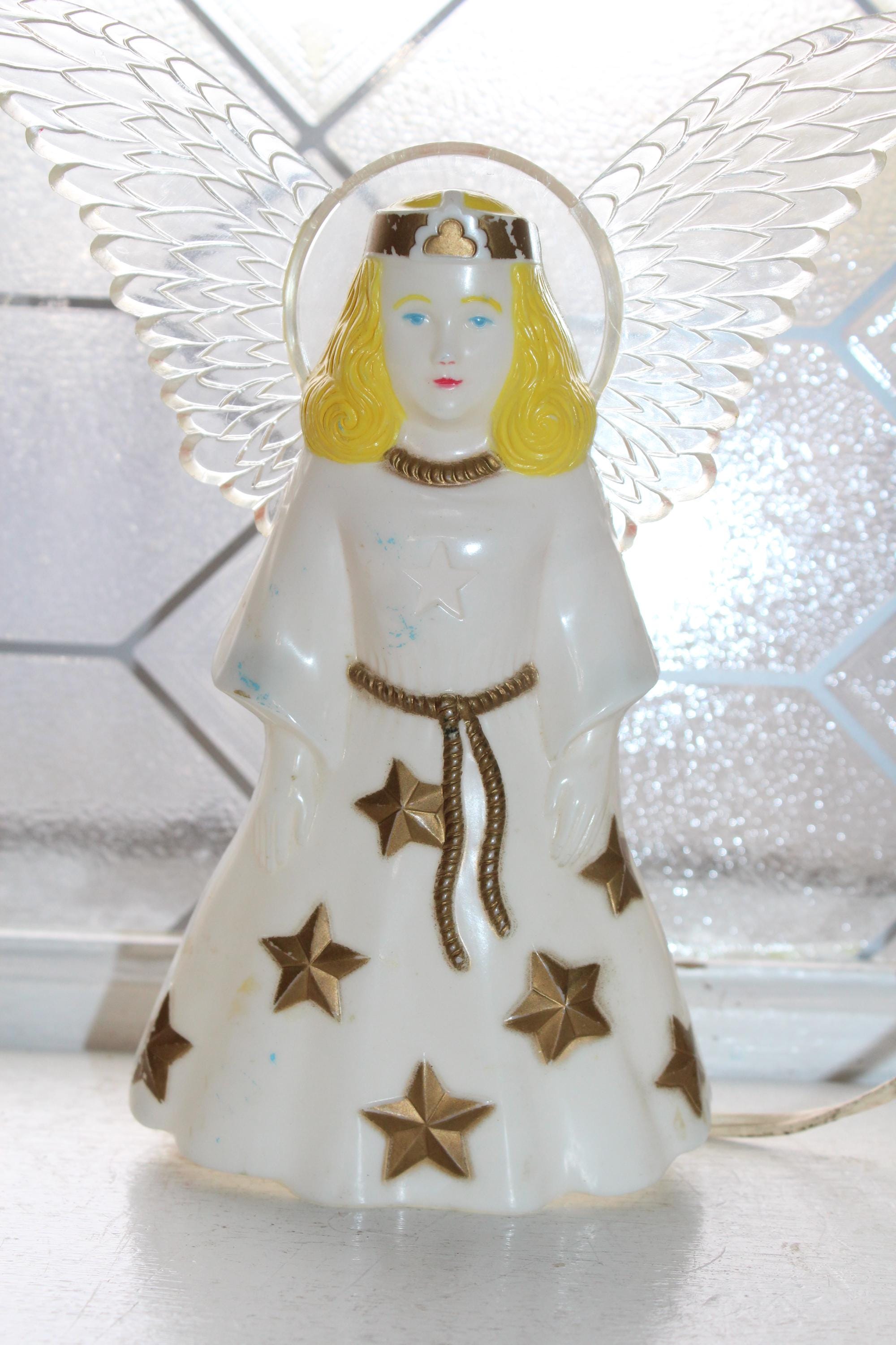 Vintage Paramount illuminated angel light up Christmas tree topper ornament, in good condition. It has a flat bottom so it can also be displayed on a flat surface. It measures 8 1/4" high. There is some age appropriate wear but no damage. It works and displays well, great for a Mid Century Christmas tree. Enjoy!