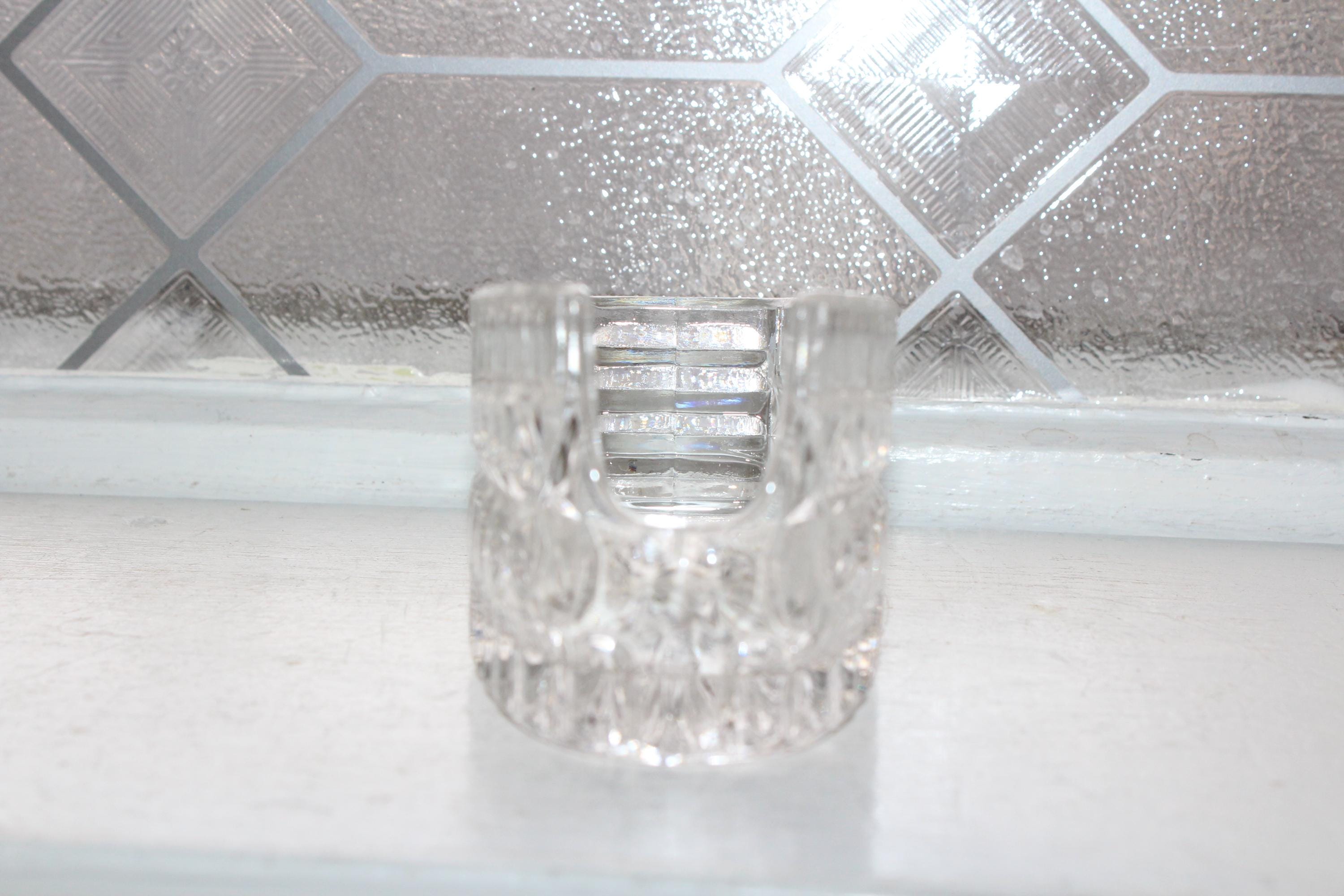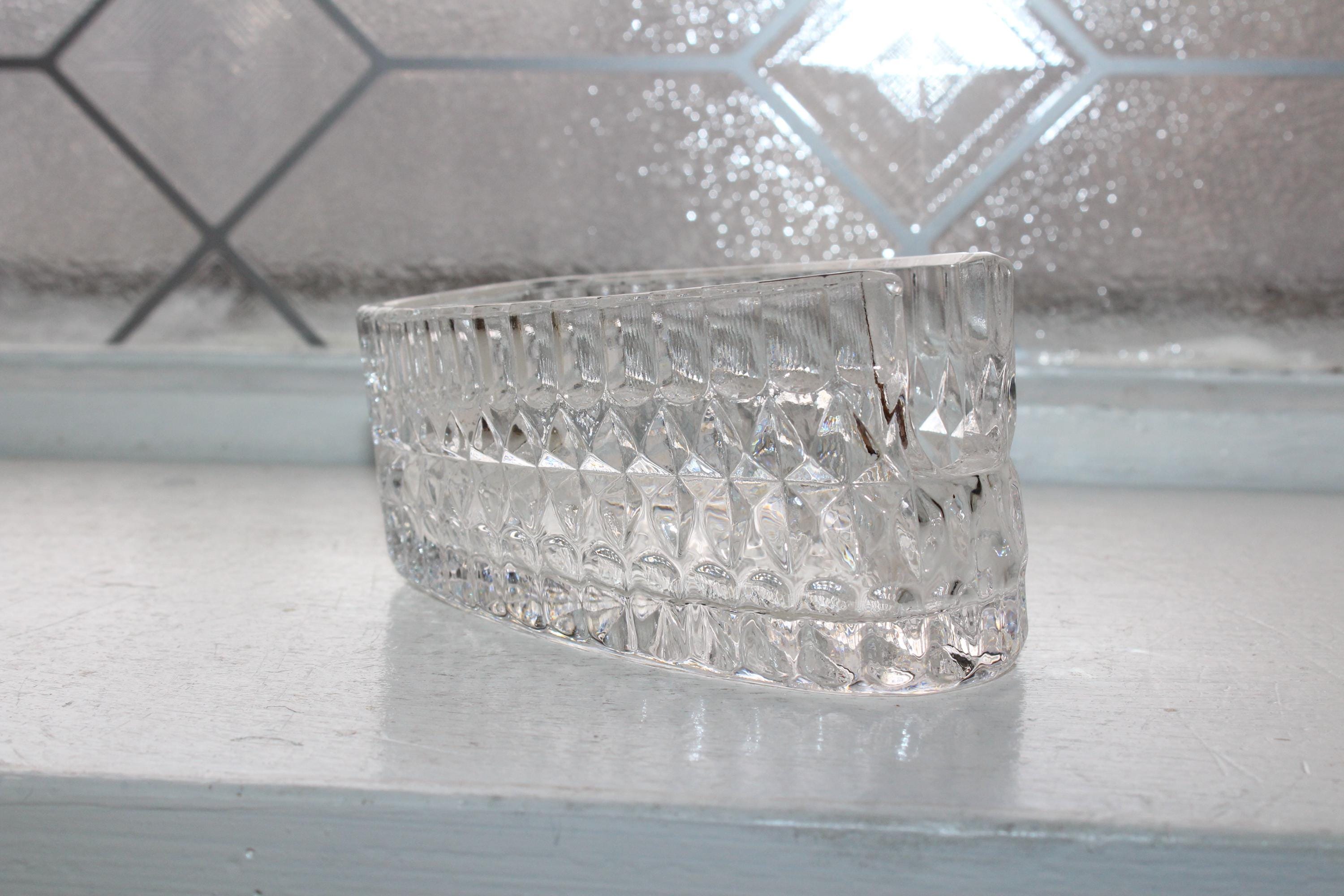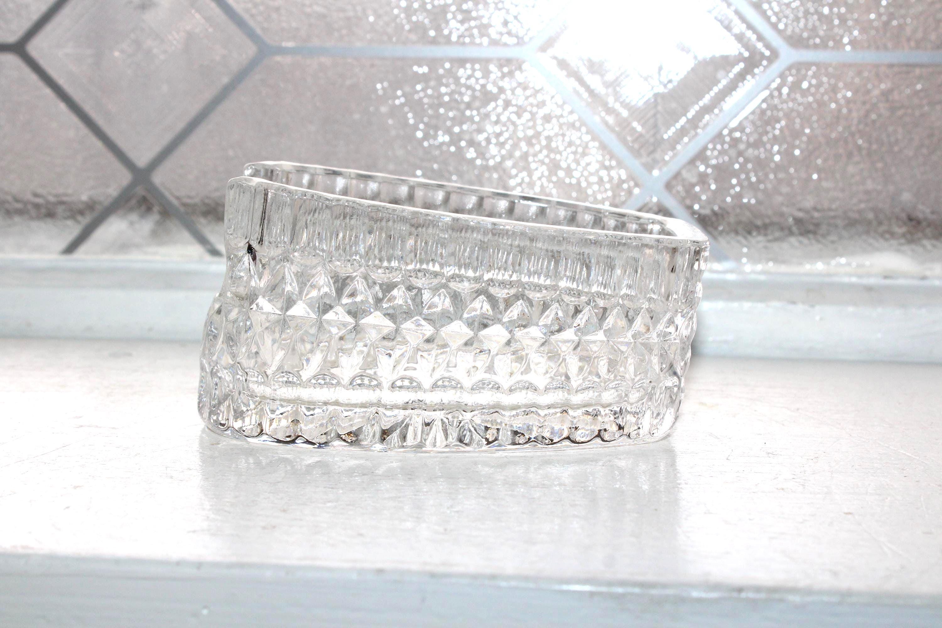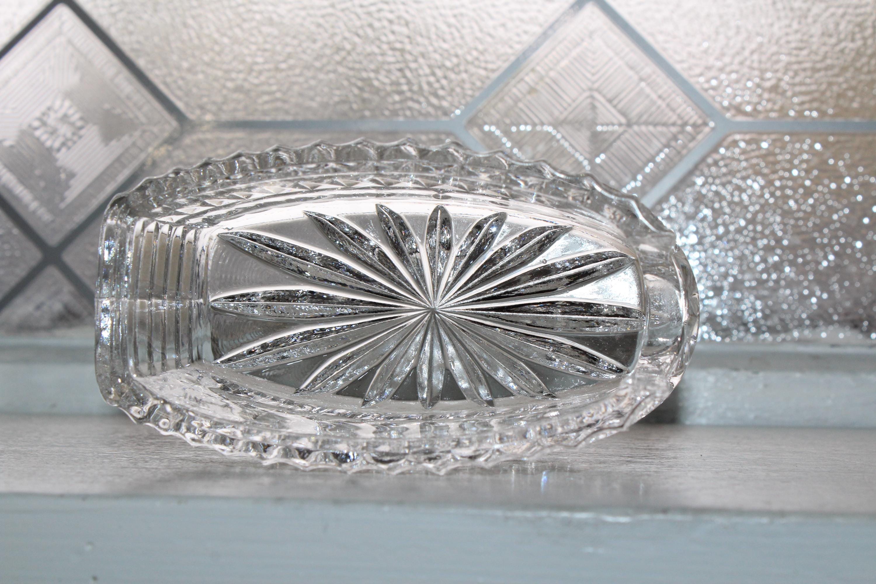 This is a lead crystal spoon or utensil holder, in excellent condition. It measures 4 1/4" long. There are no chips or cracks, and the piece is stunning overall. Enjoy!