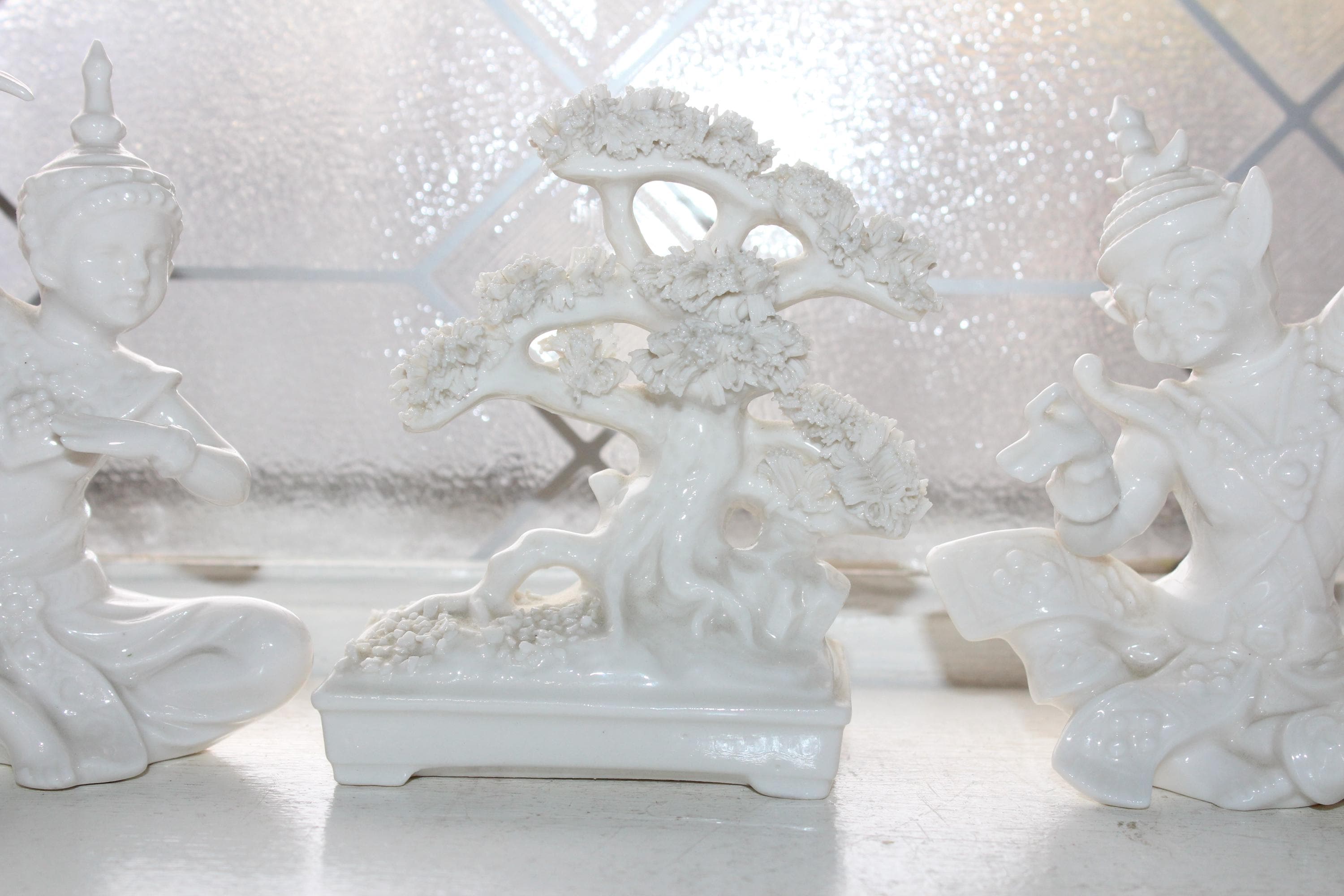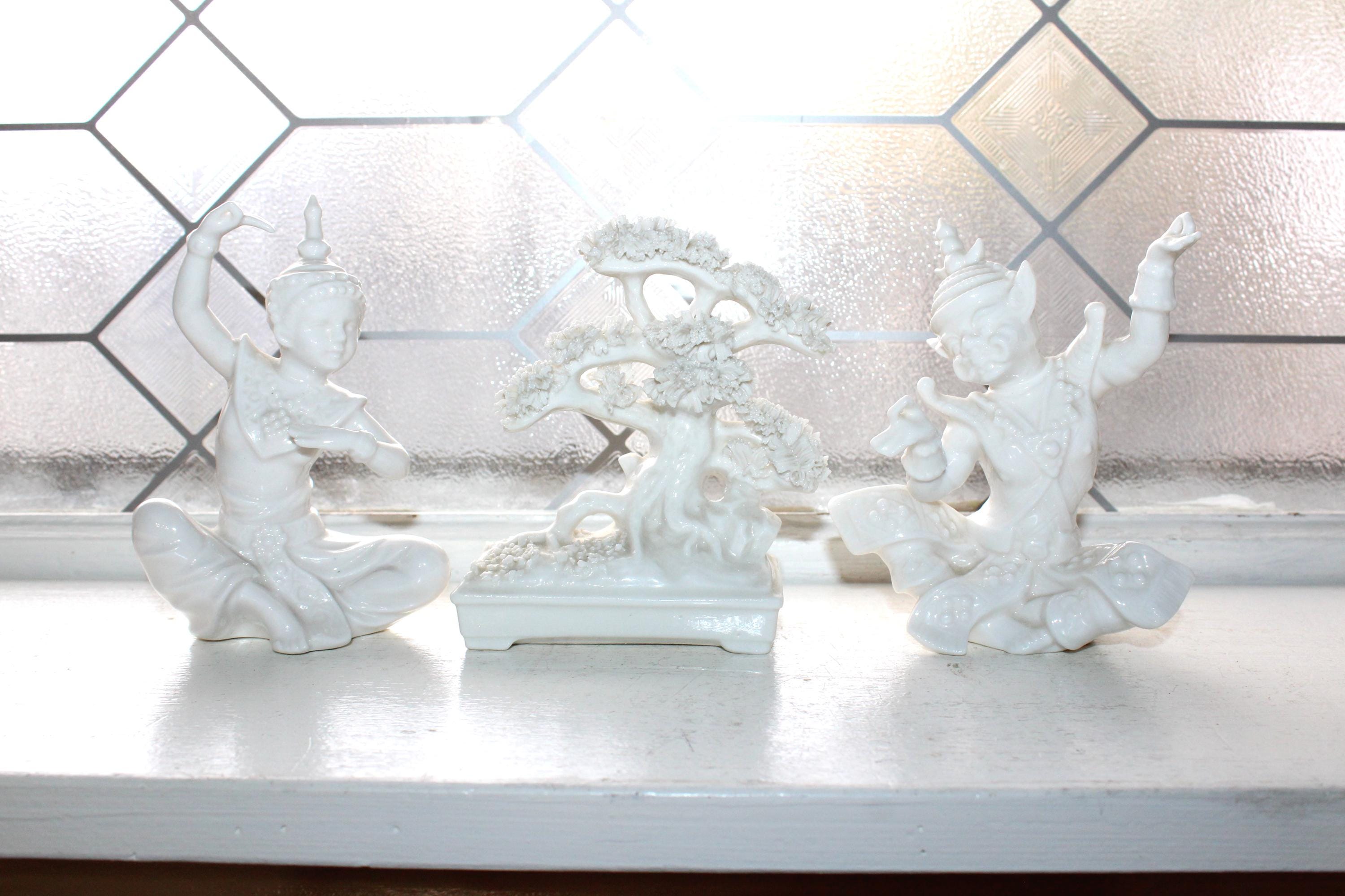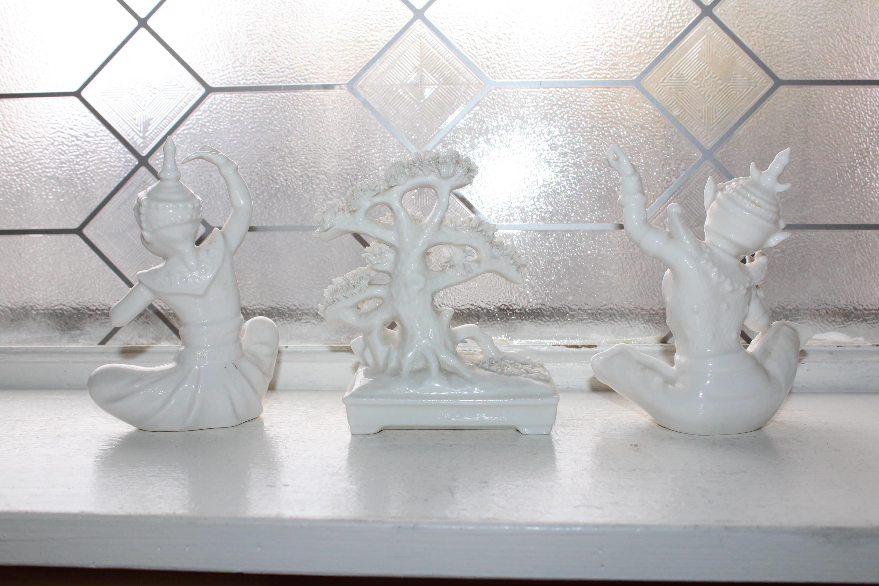 Vintage Ardalt Verithin porcelain Thai temple dancers and bonsai tree trio, all in excellent condition. They measure 5" high and are marked 6947A, 6947B, and 6793B on the underside. No chips or cracks. He's adorable- enjoy!