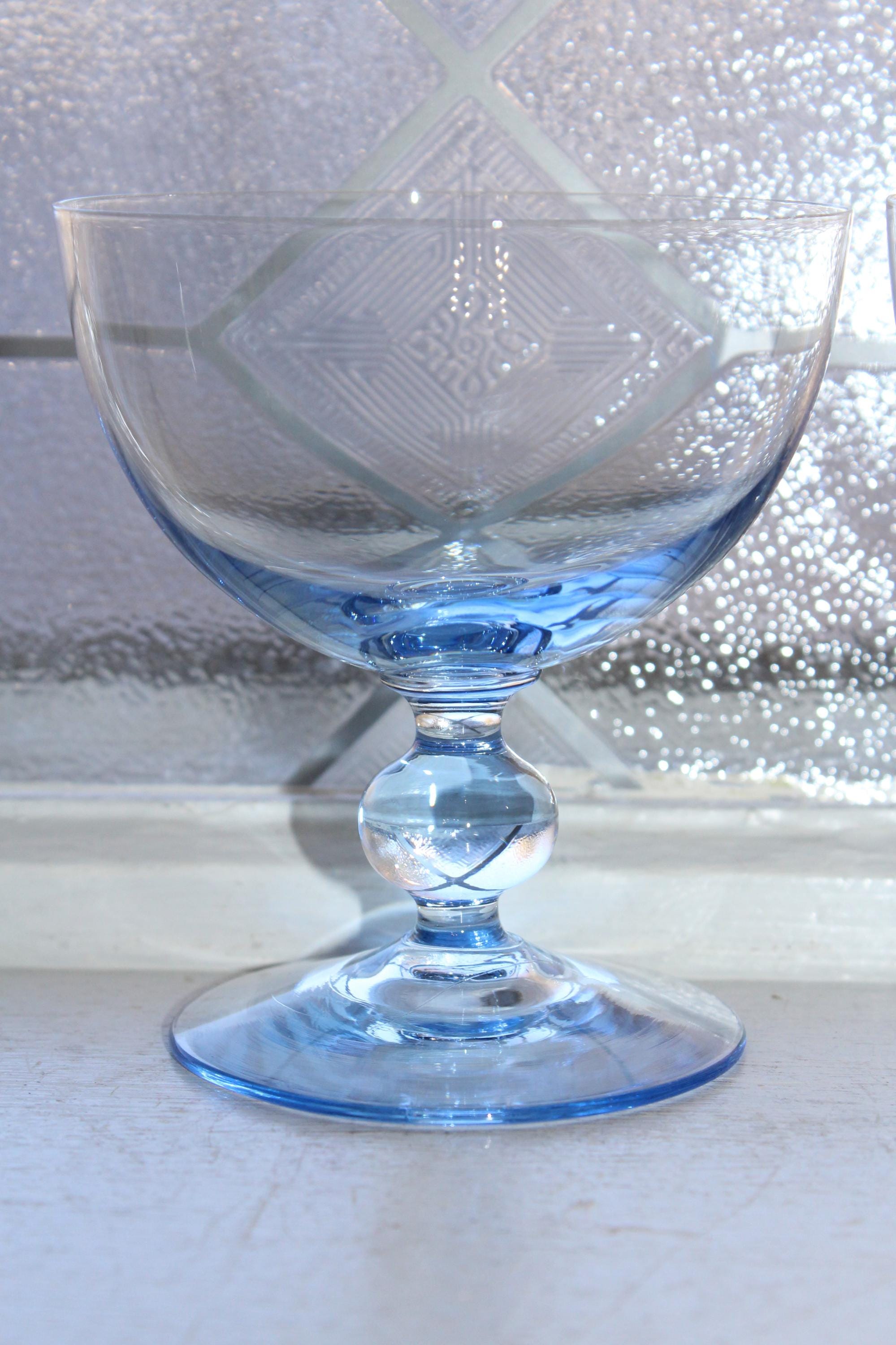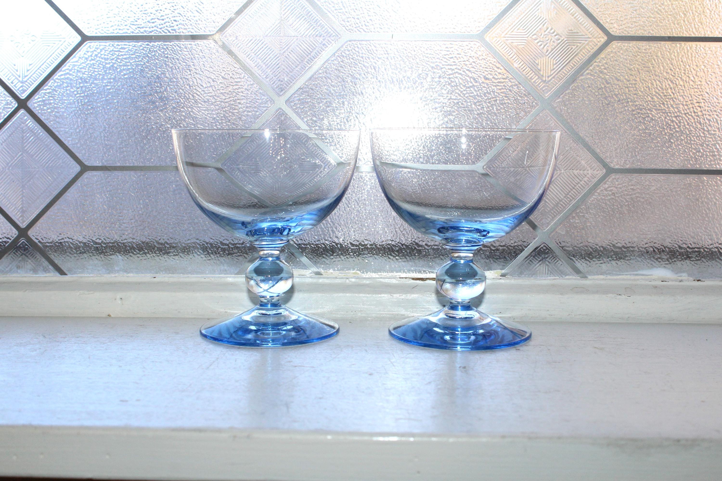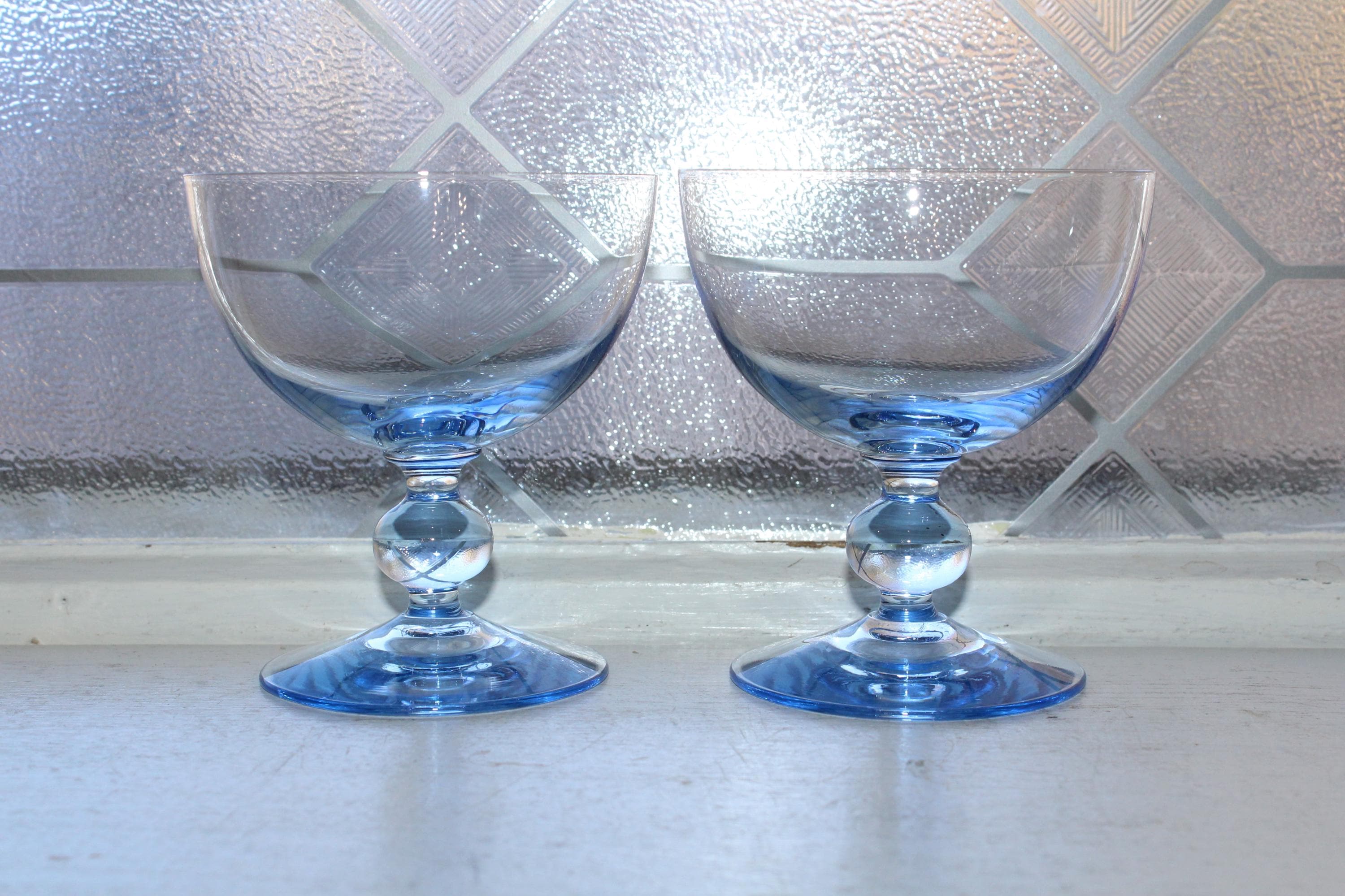 2 vintage Kosta Boda blue glass champagne coupes or sherbet dishes, in excellent condition.  Each glass measures 4" high x 3 3/4" wide at the top and has no chips or cracks.  They display exceptionally well.  Enjoy!