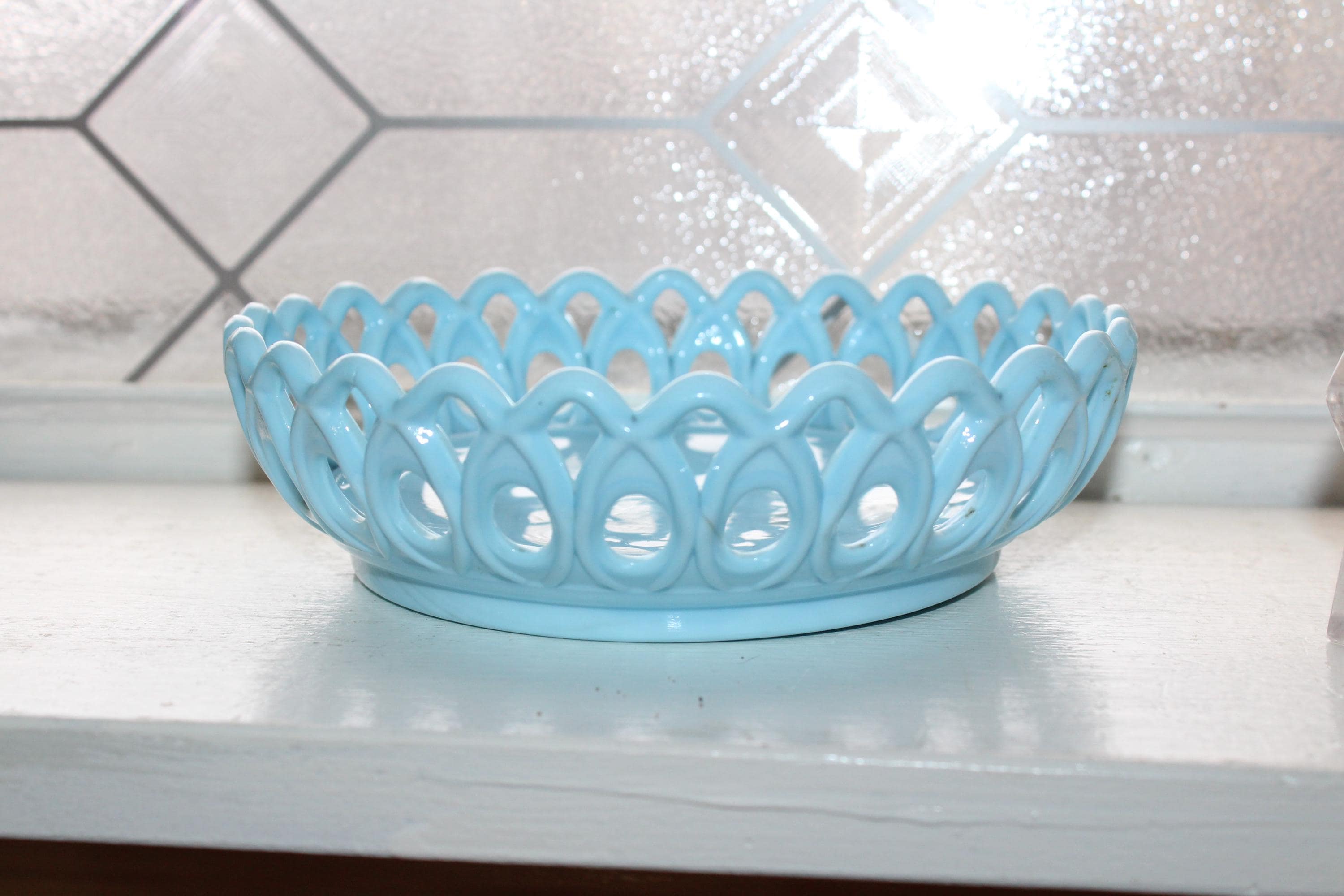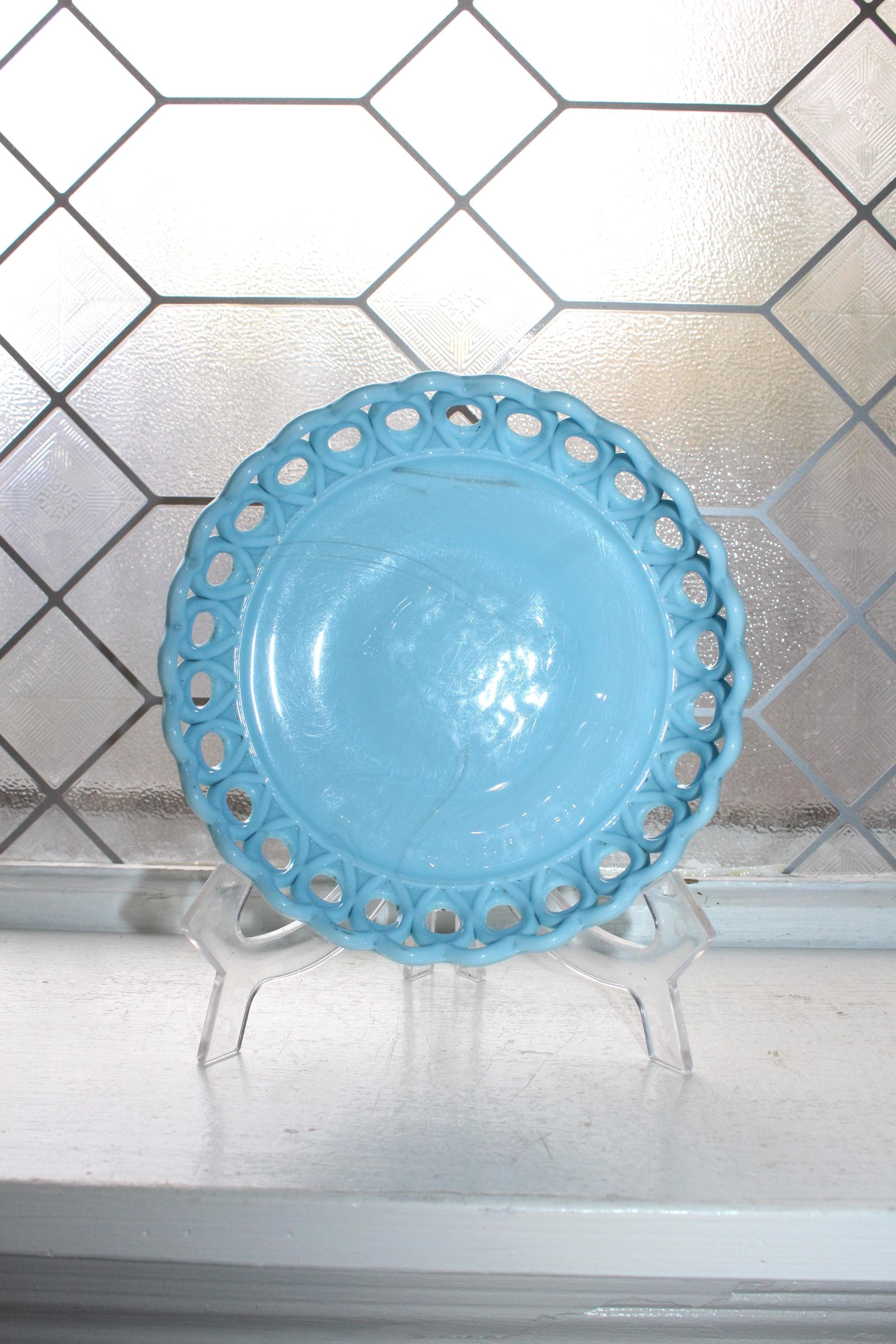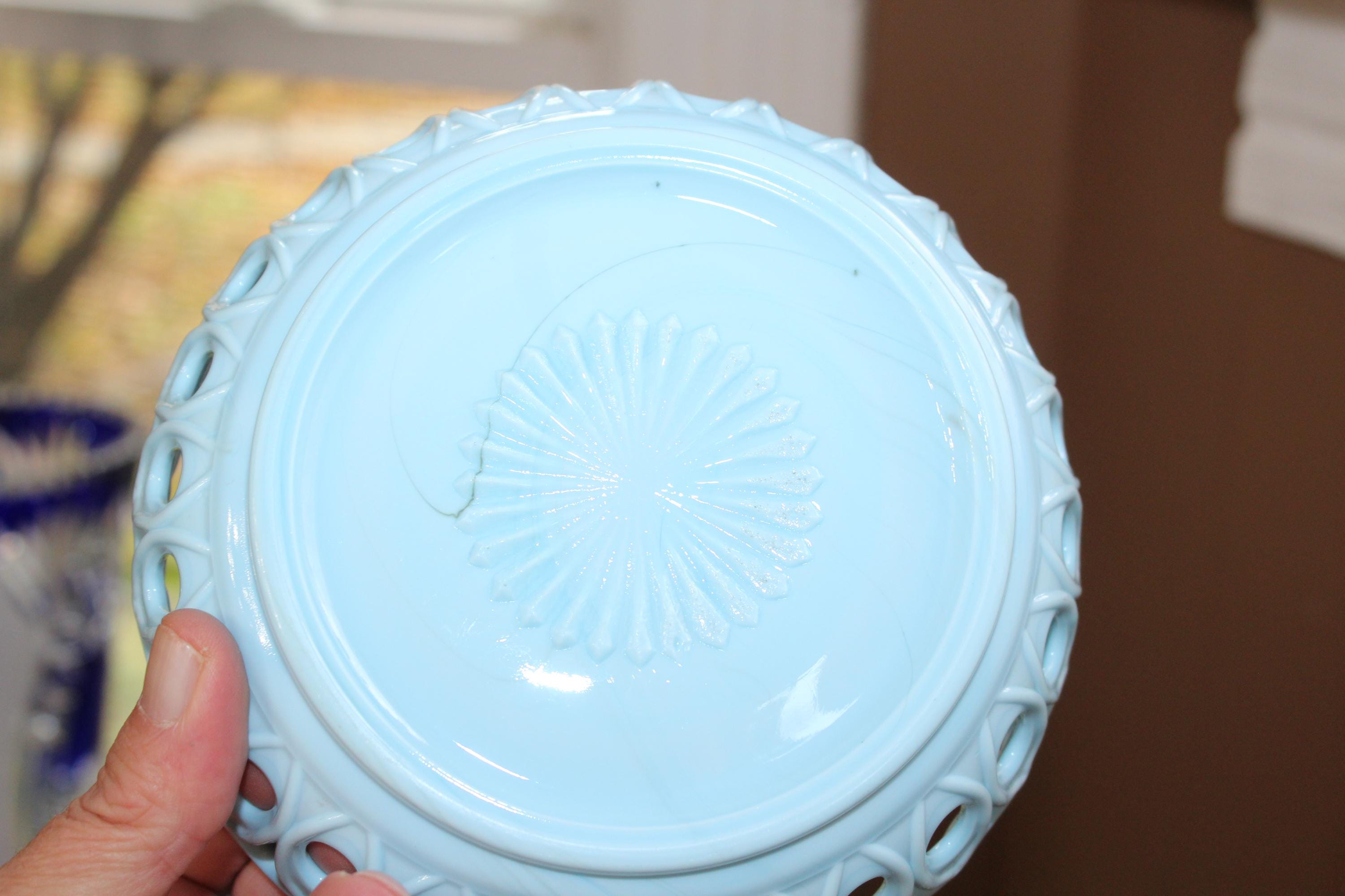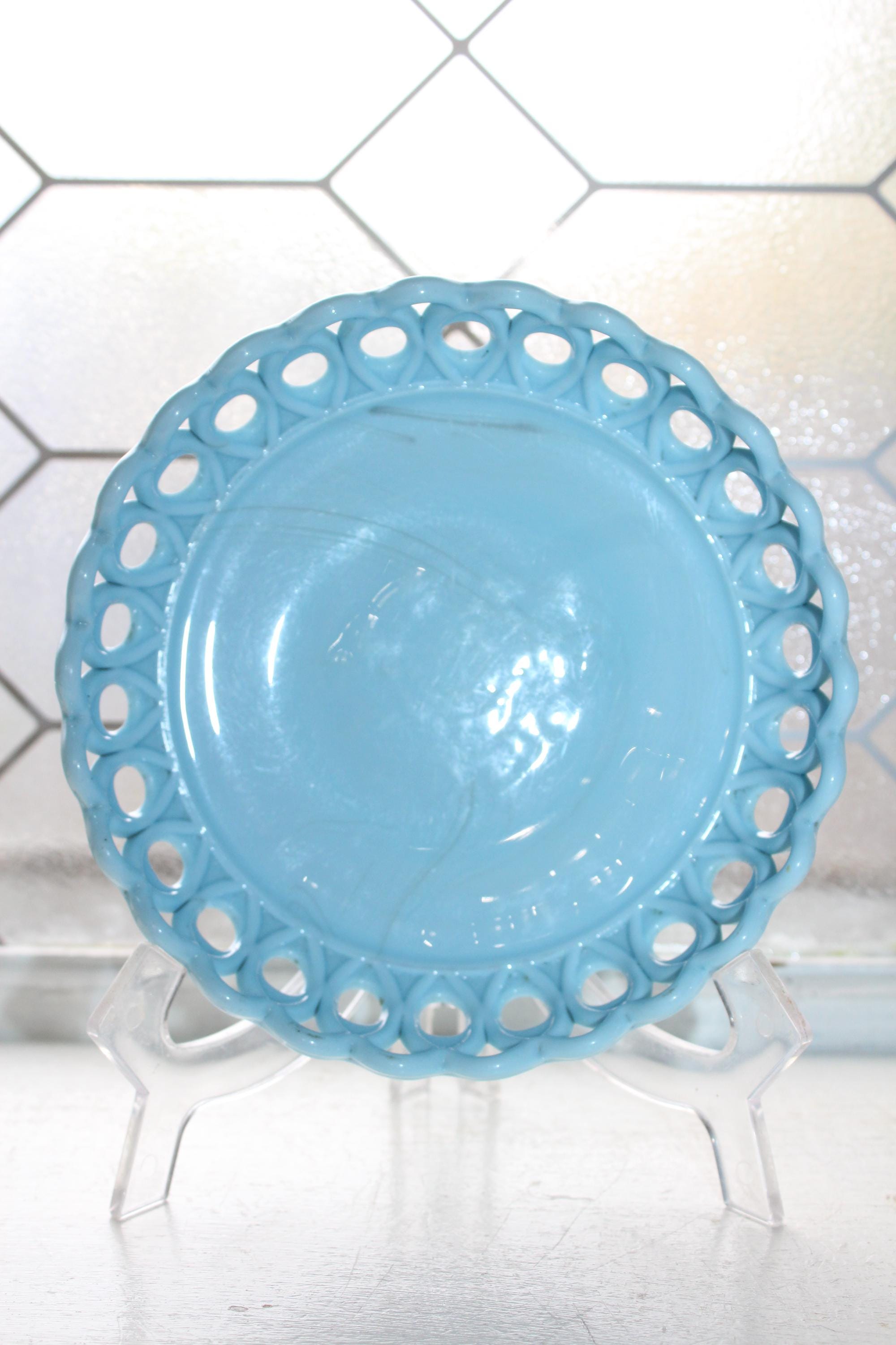 This is a vintage blue slag glass lace edge bowl, gorgeous and in excellent condition. It measures 6 1/2" wide x 2" high. No chips, cracks or other damage. Enjoy!