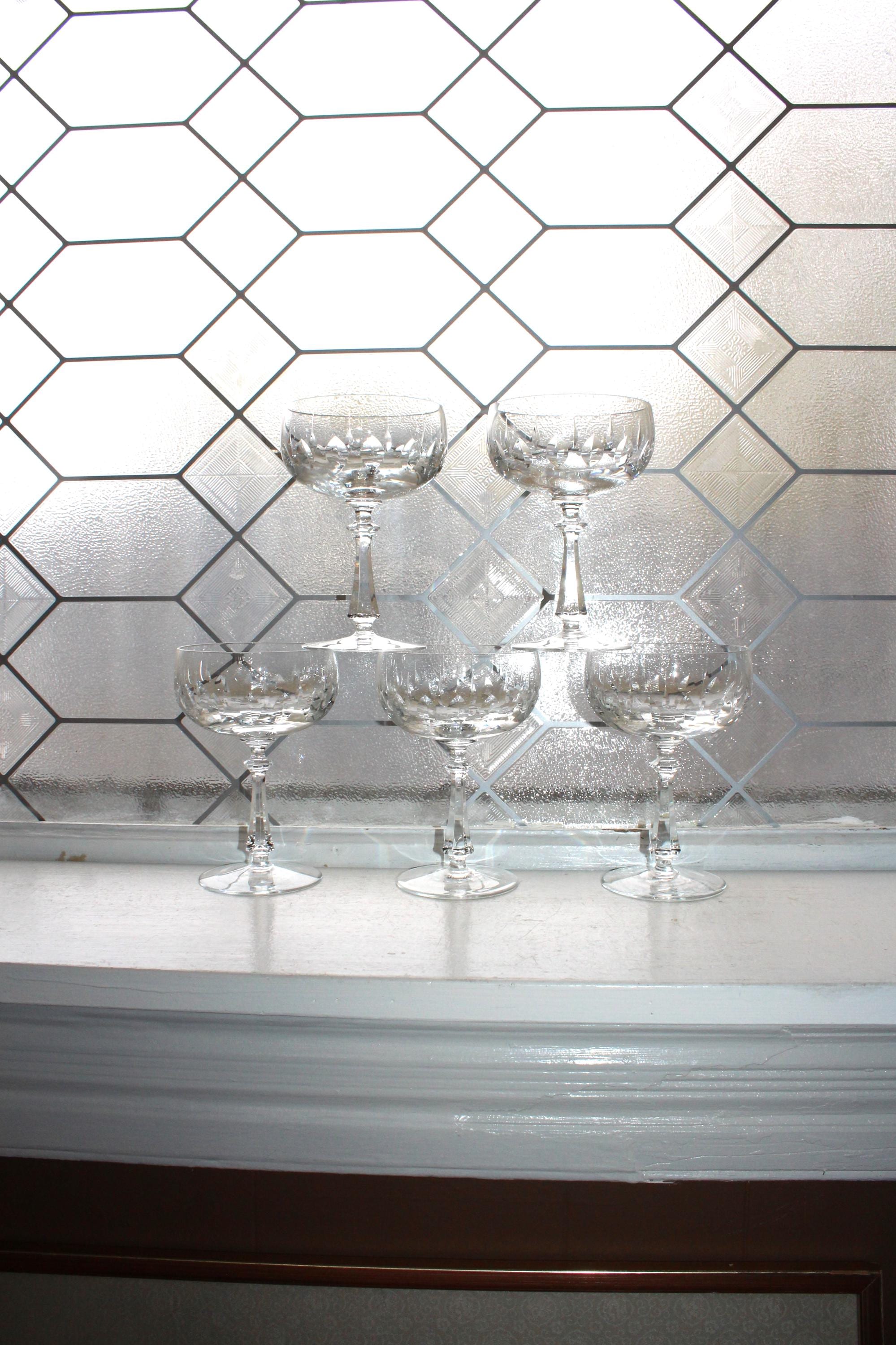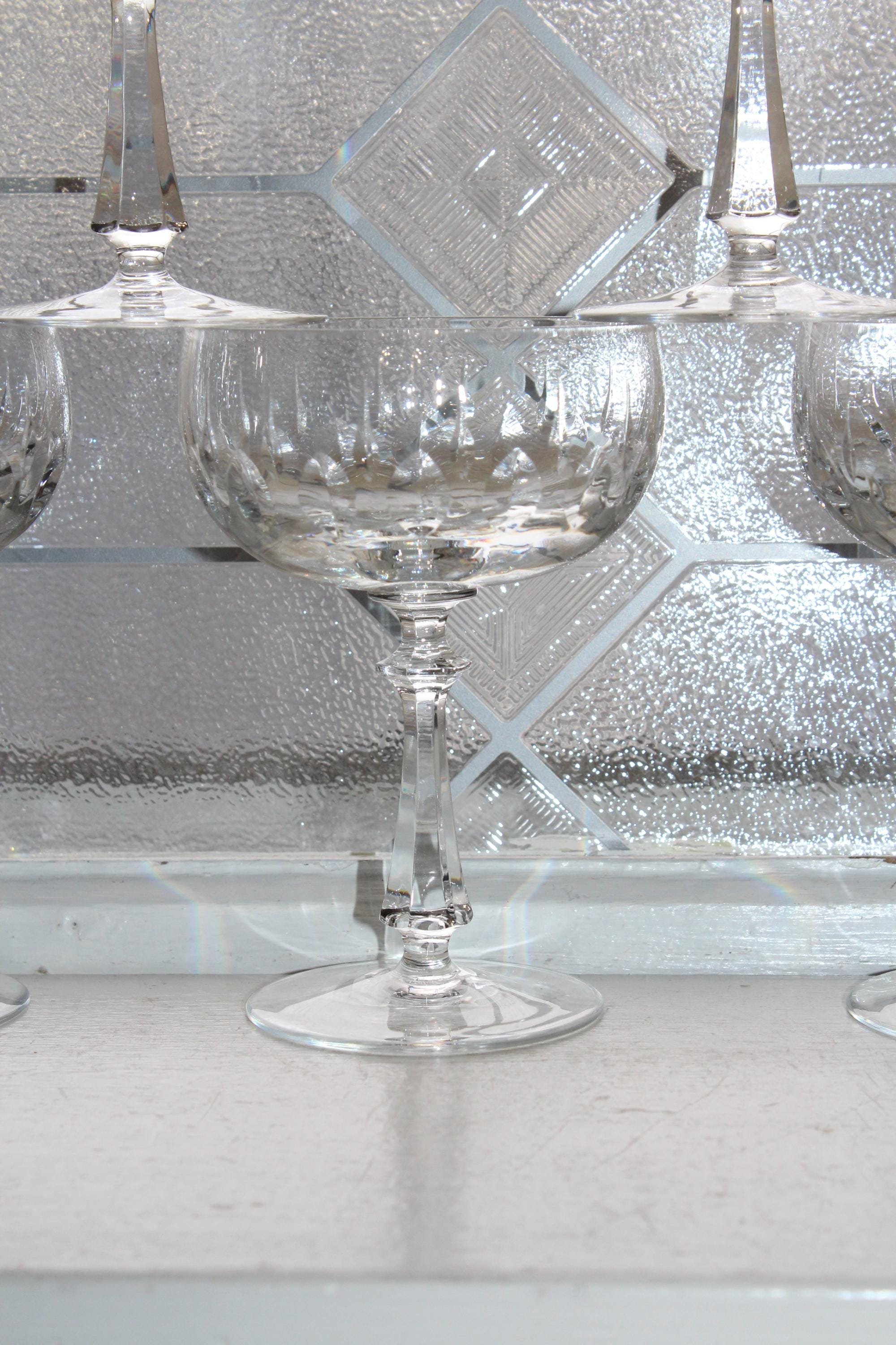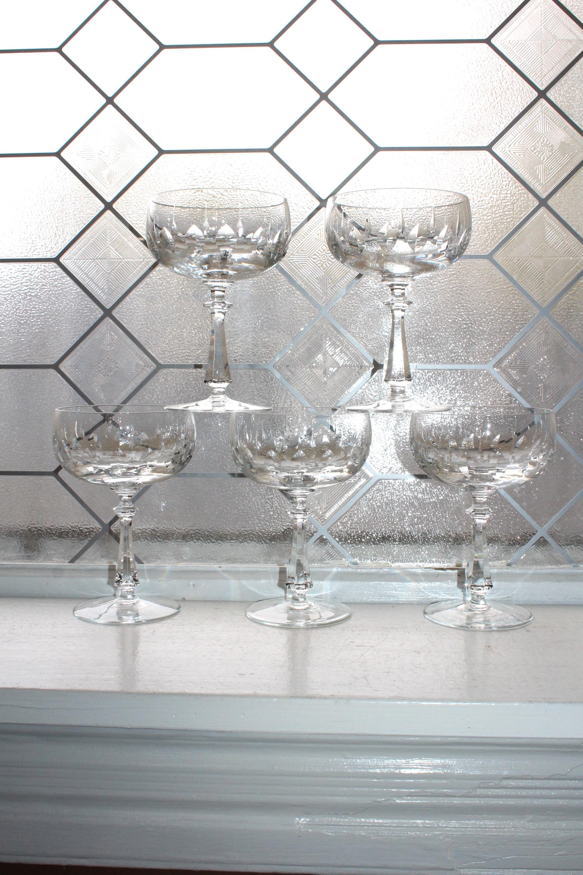 Set of 5 vintage Gorham crystal champagne coupes in the Tivoli pattern made in the 1970s, in excellent condition. Each one measures 5 1/8" high. No chips or cracks, perfect for use or display. I also have other pieces of this pattern available in my shop. Enjoy!