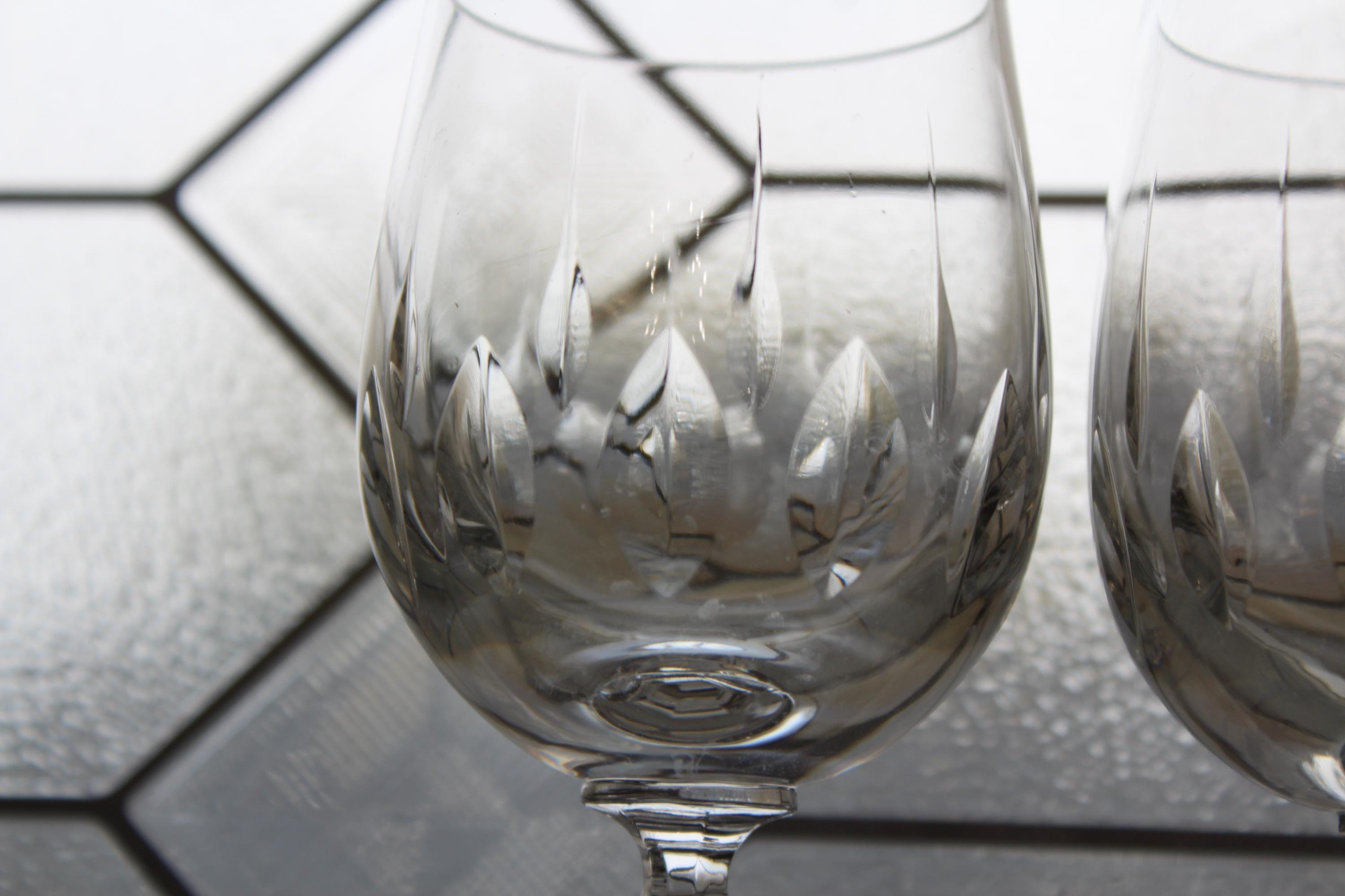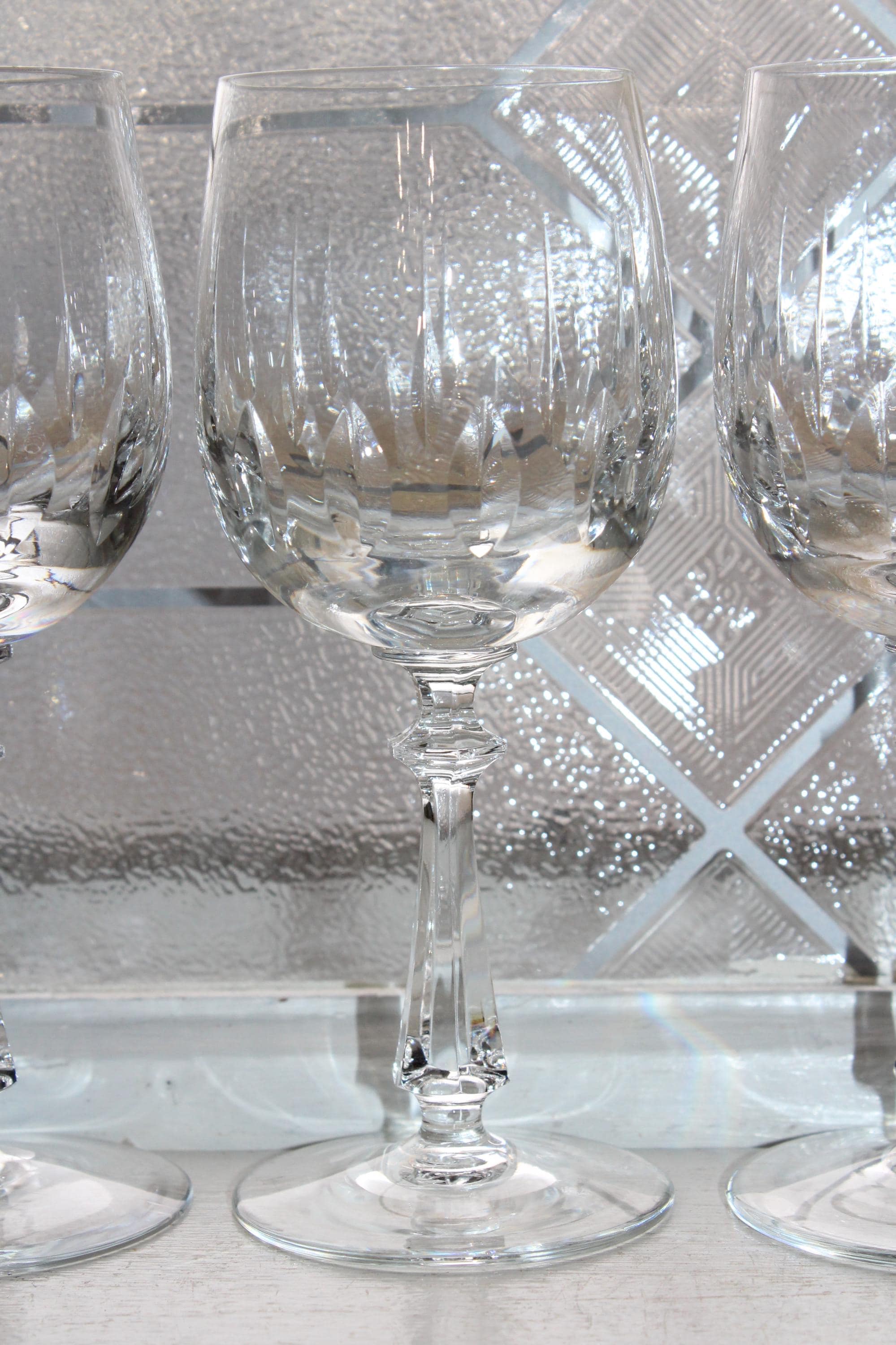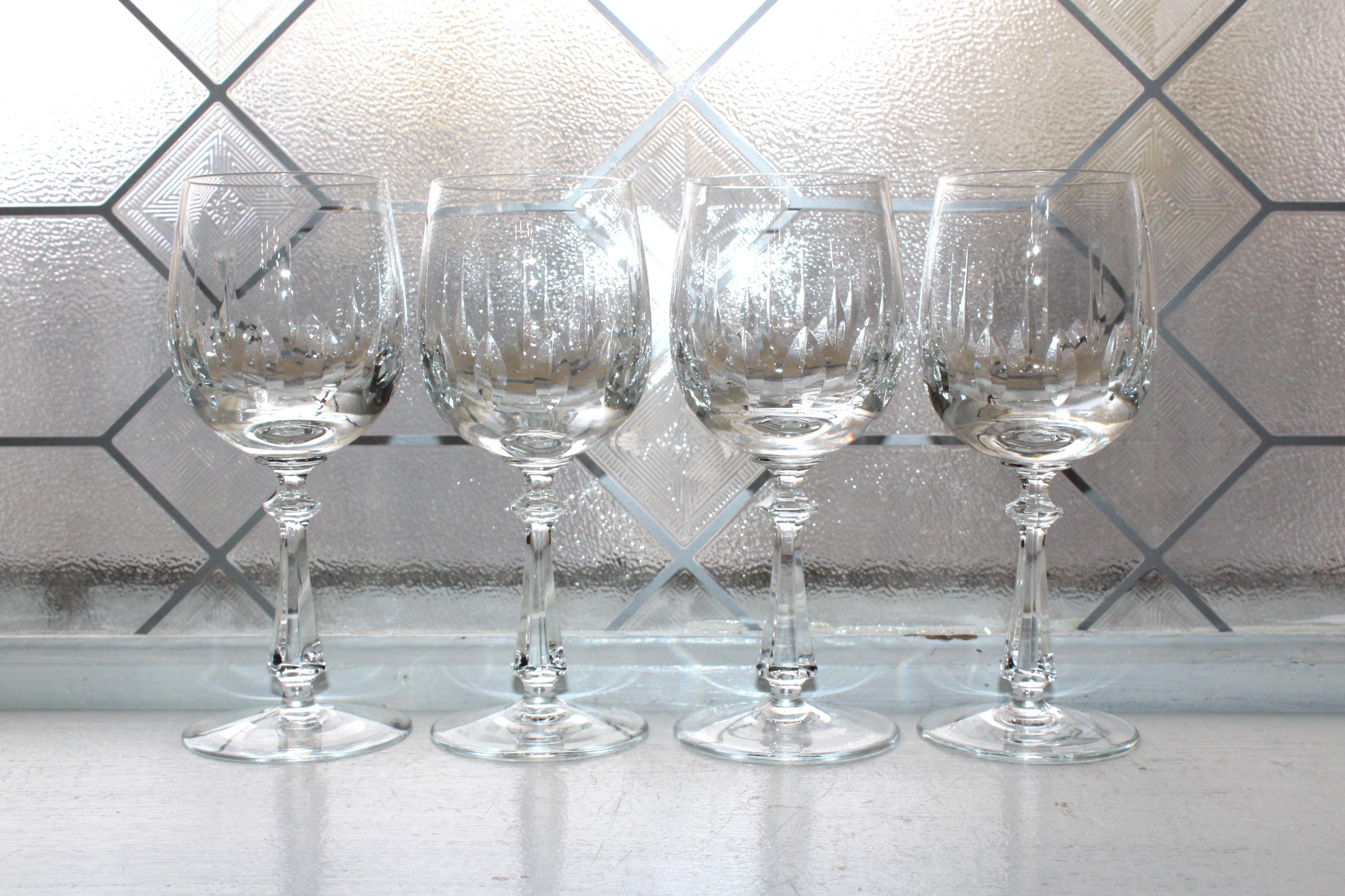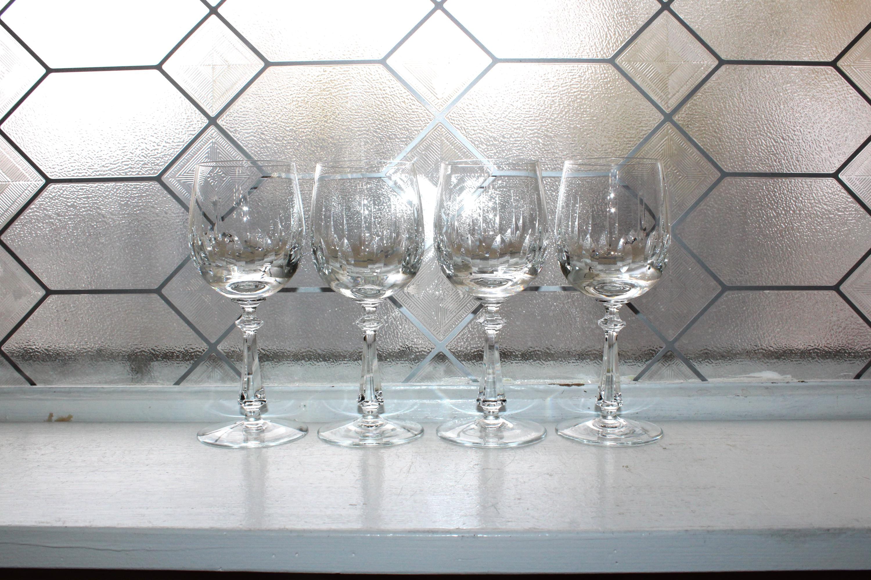 Set of 4 vintage Gorham crystal wine glasses in the Tivoli pattern made in the 1970s, in excellent condition. Each one measures 6 3/8" high. No chips or cracks, perfect for use or display. THERE ARE 2 SETS OF 4 AVAILABLE FOR PURCHASE VIA THE DROP DOWN BOX. I also have other pieces of this pattern available in my shop. Enjoy!