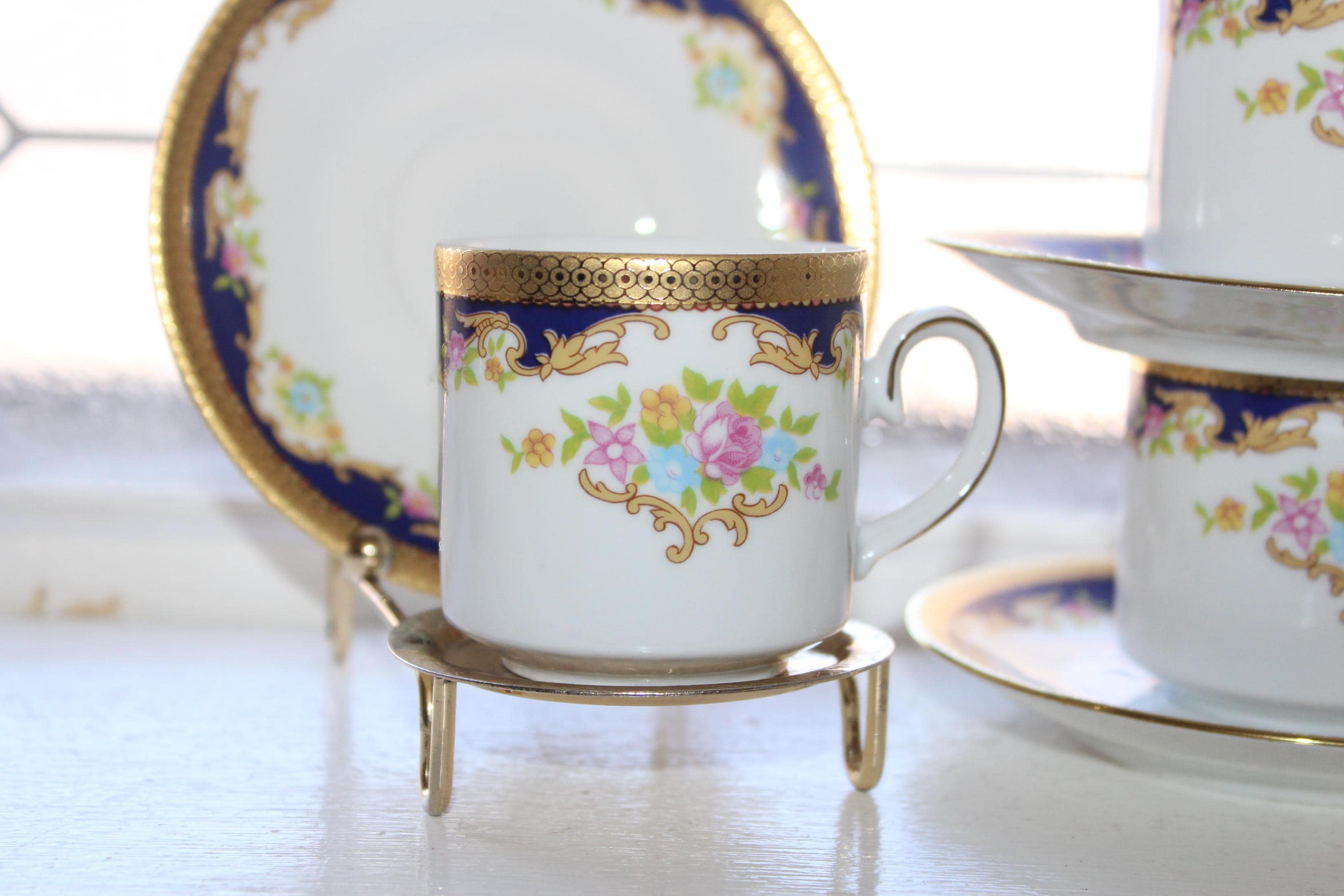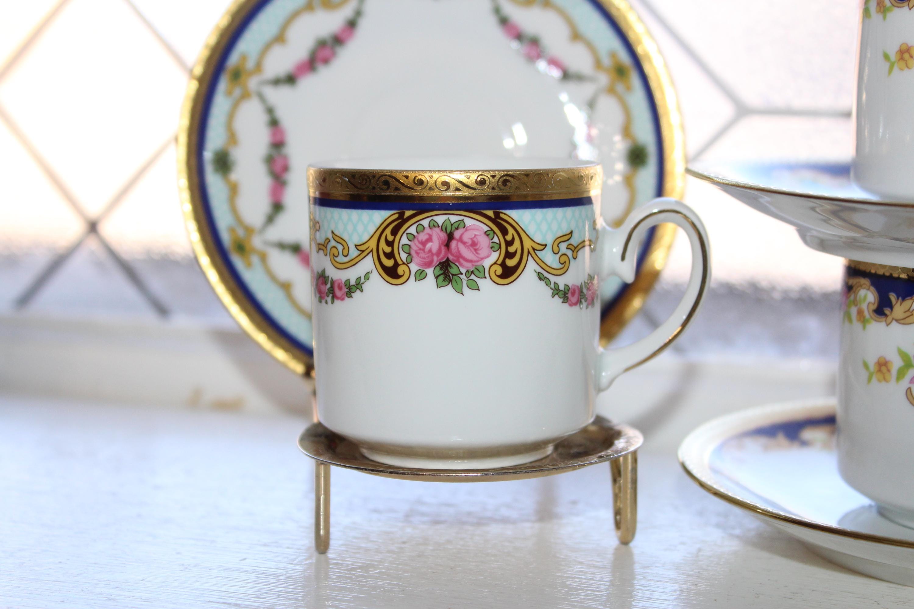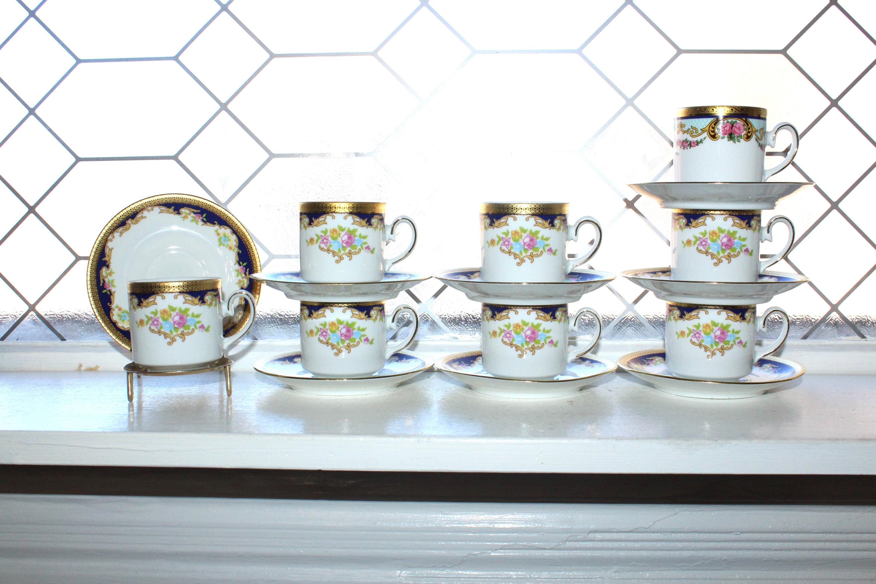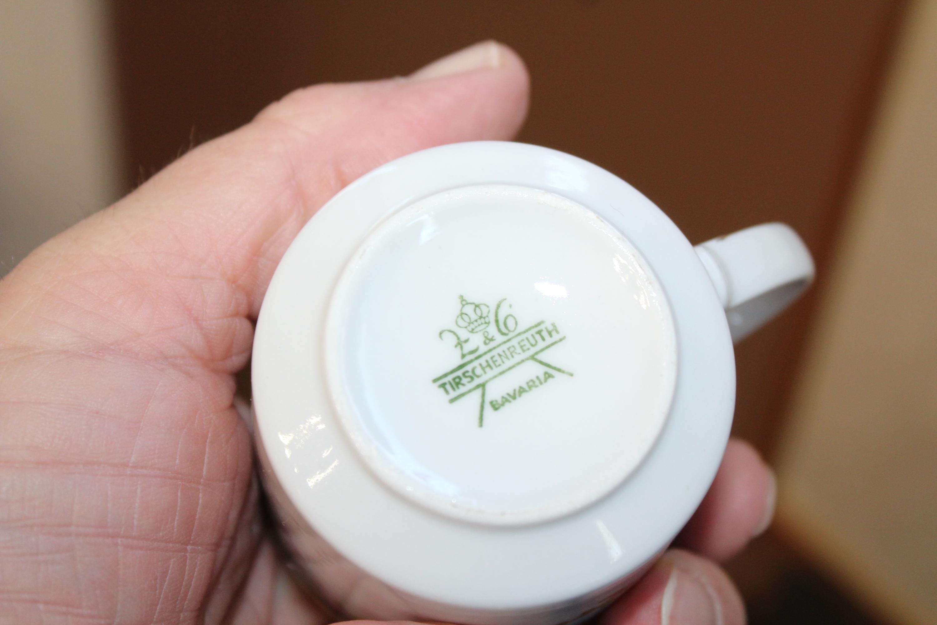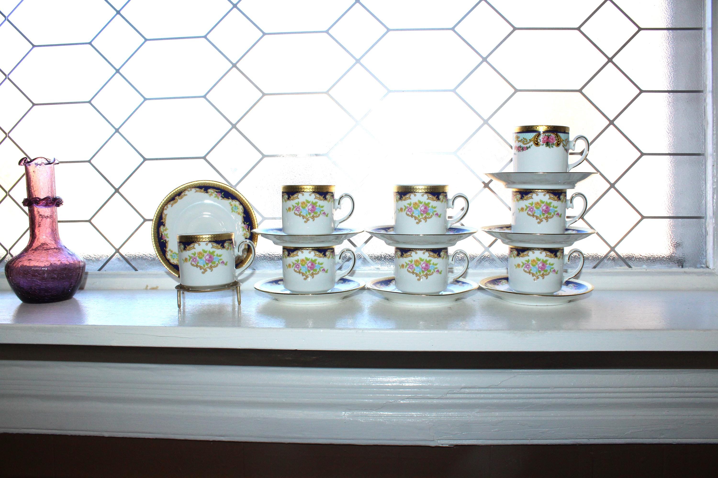 Vintage set of 8 Keramische Werke Zehendner Tirschenreuth Bavaria German porcelain demitasse cups and saucers, in excellent condition. Each cup measures 2 1/4" high and each saucer measures 4 3/4" wide. No chips or cracks, perfect for use or display. PLEASE NOTE, ONE OF THE CUPS AND SAUCERS IS A SLIGHTLY DIFFERENT PATTERN BY THE SAME COMPANY, SEE THE LAST 2 PHOTOS. Enjoy!