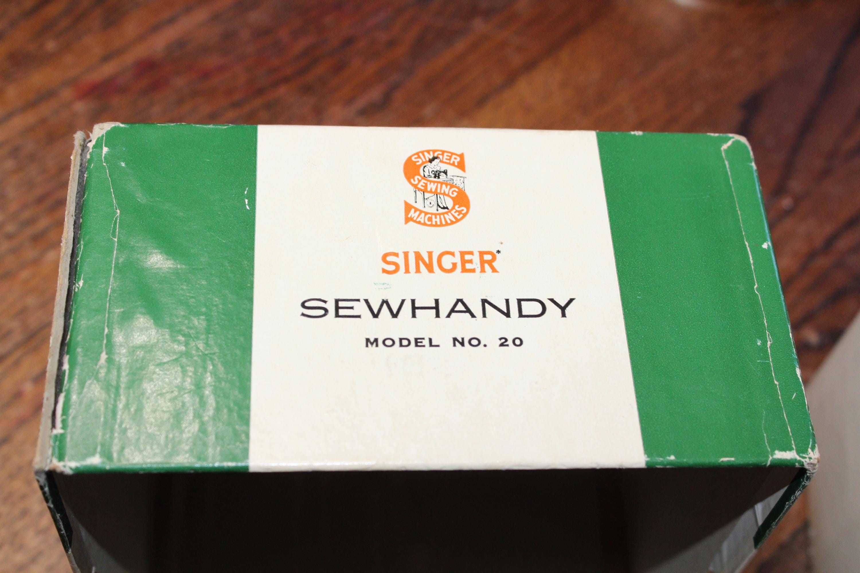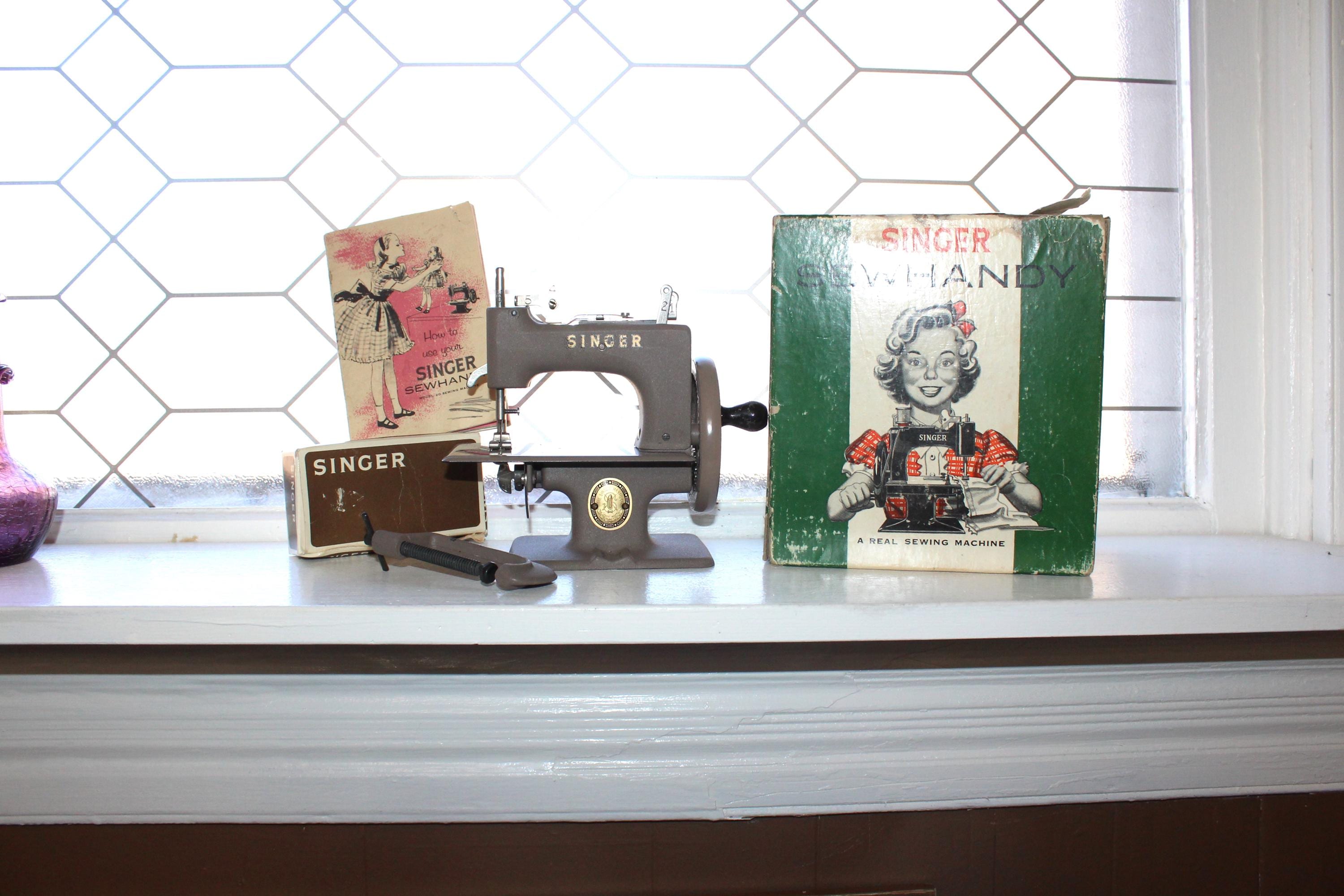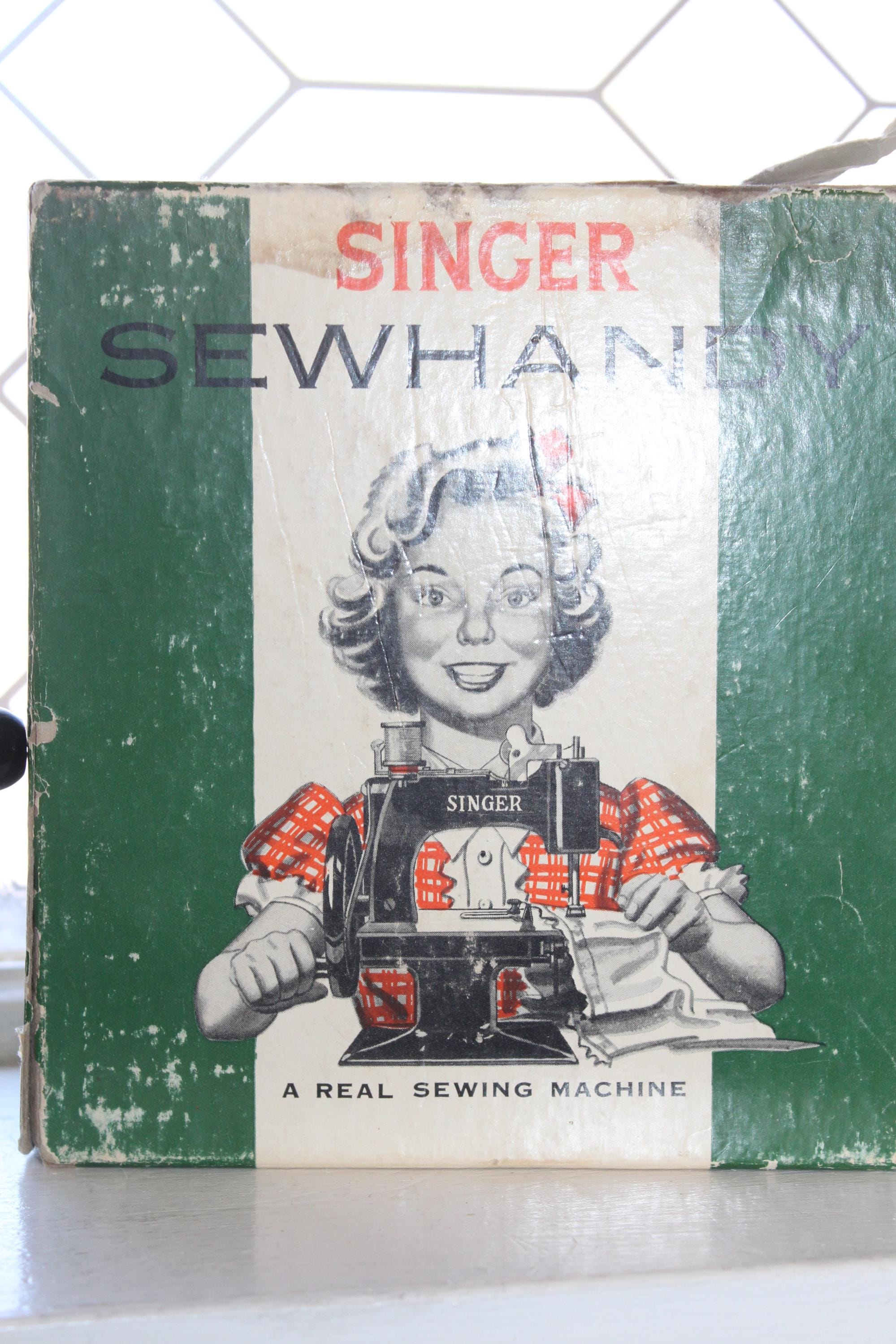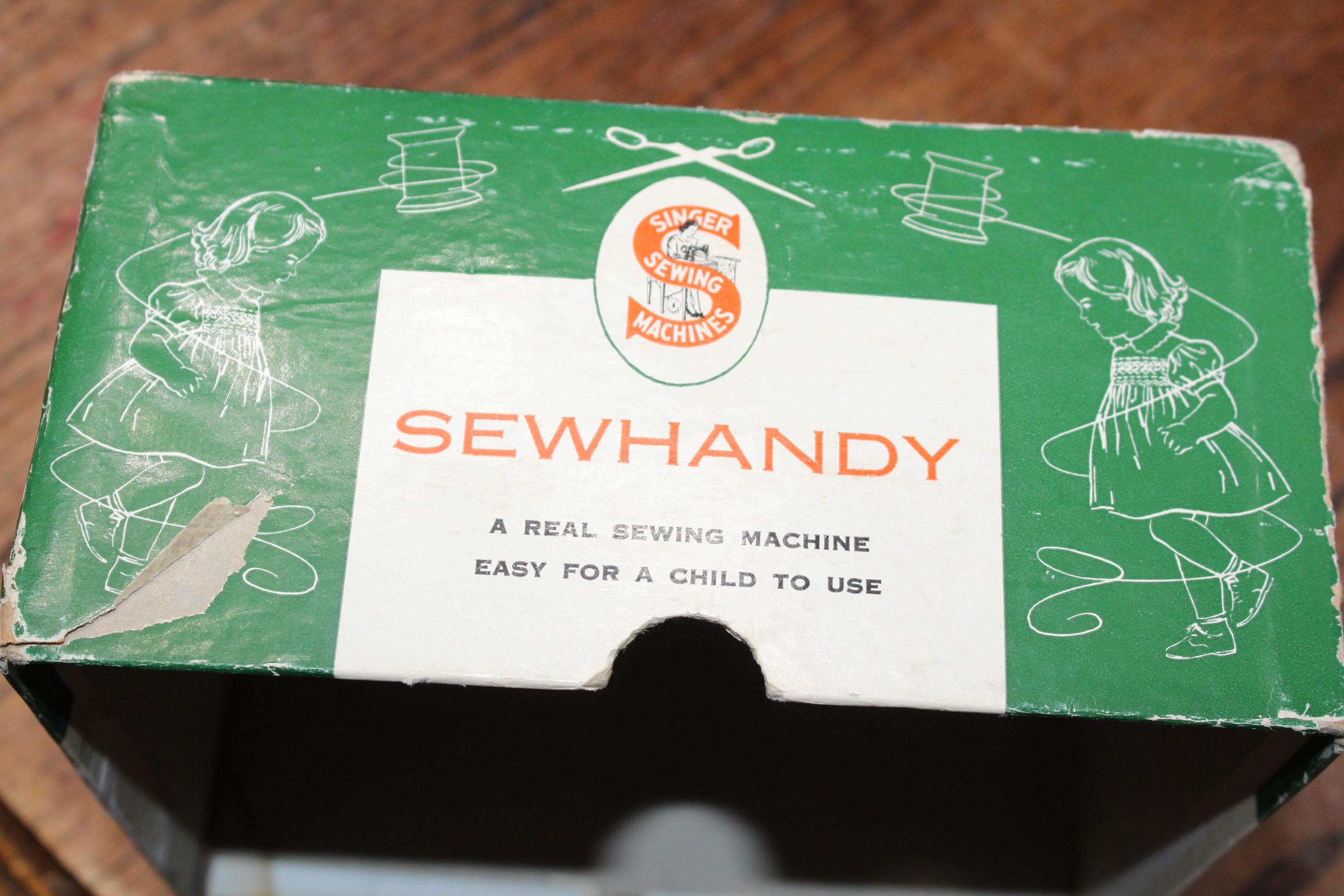 Vintage 1950s Singer Sewhandy Model 20 toy sewing machine with clamp, original box, parts box with parts, and instruction manual, great for use and display in a country home. It shows minor age appropriate wear, works and displays well. Enjoy!