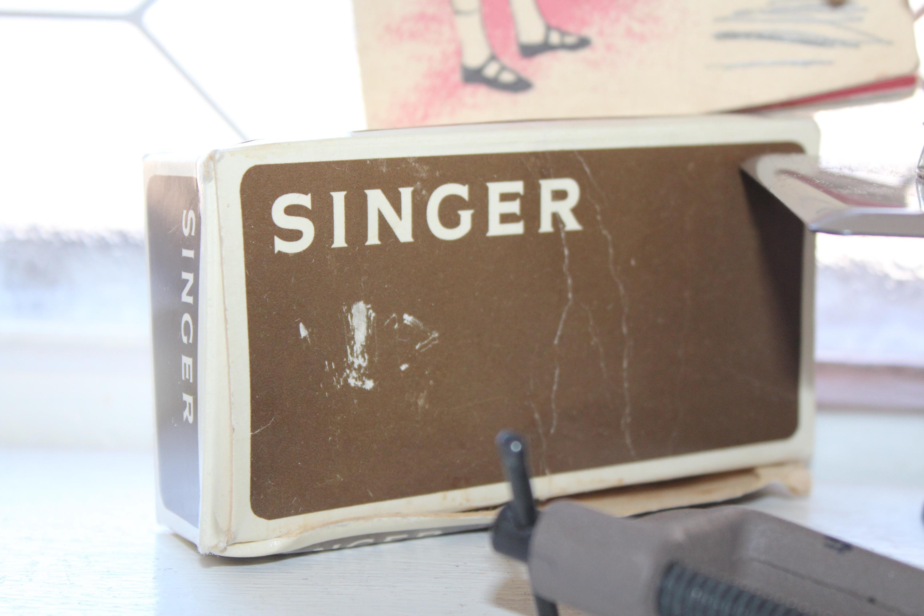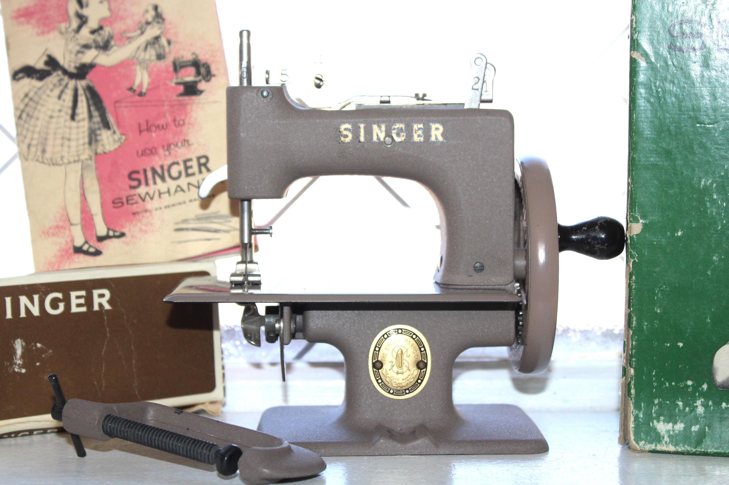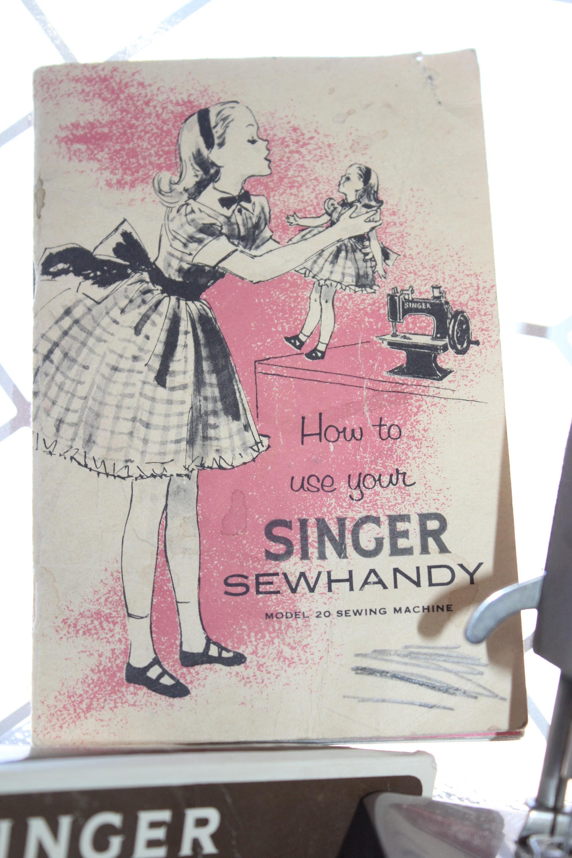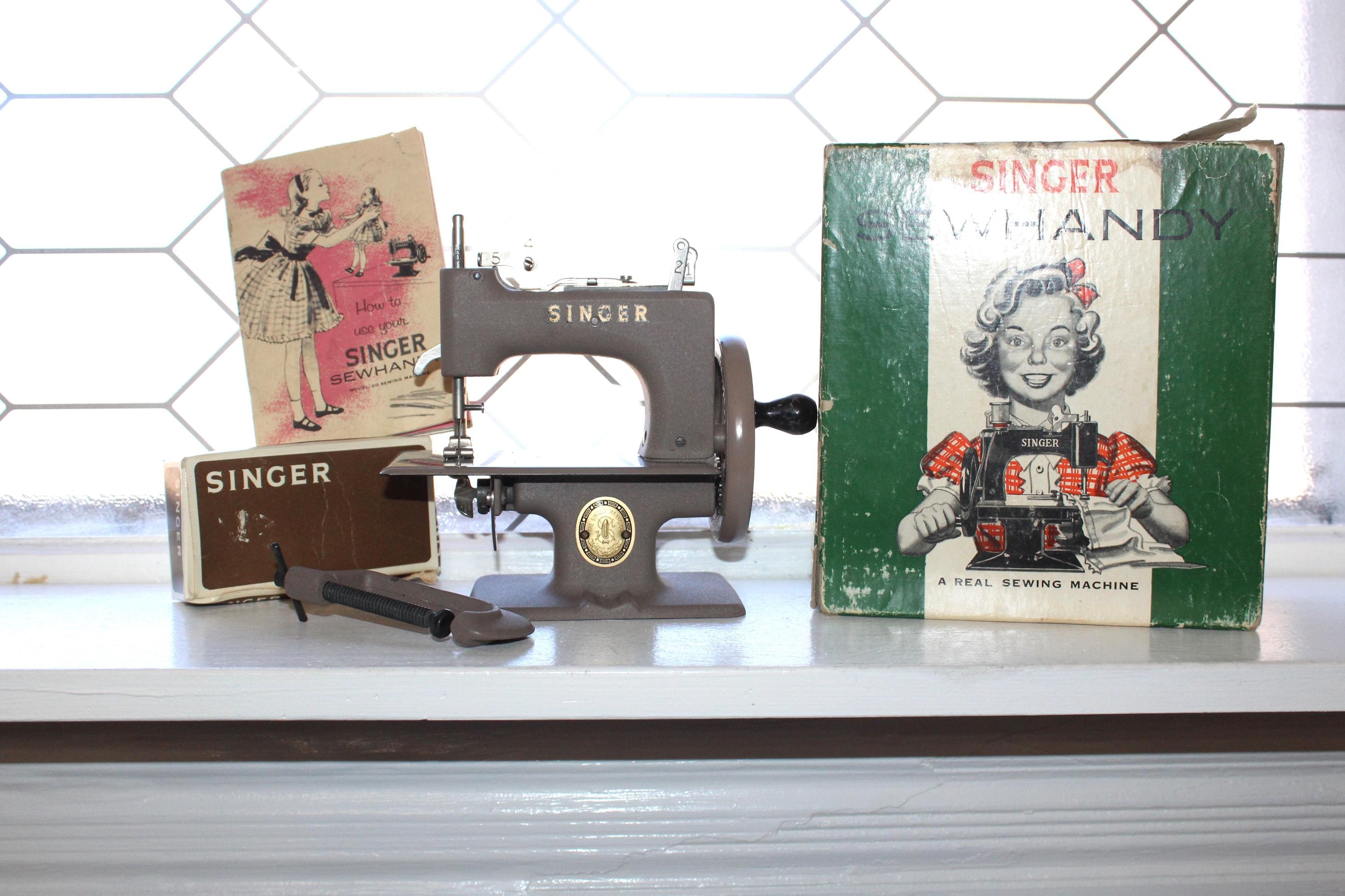Vintage 1950s Singer Sewhandy Model 20 toy sewing machine with clamp, original box, parts box with parts, and instruction manual, great for use and display in a country home. It shows minor age appropriate wear, works and displays well. Enjoy!