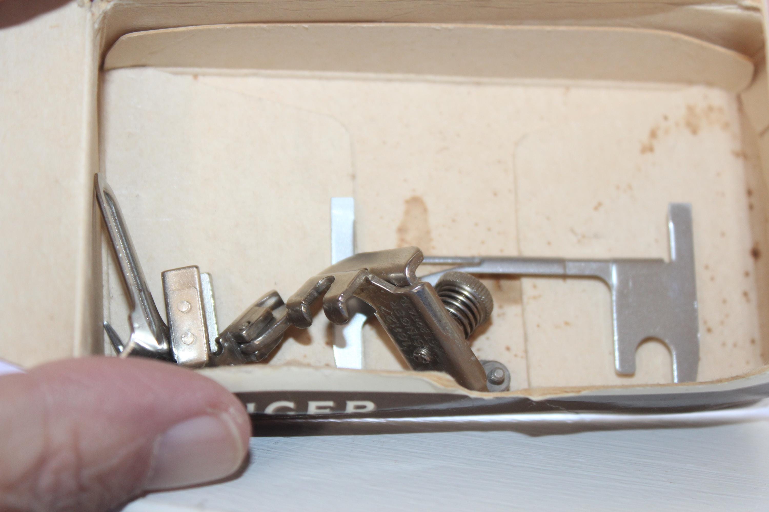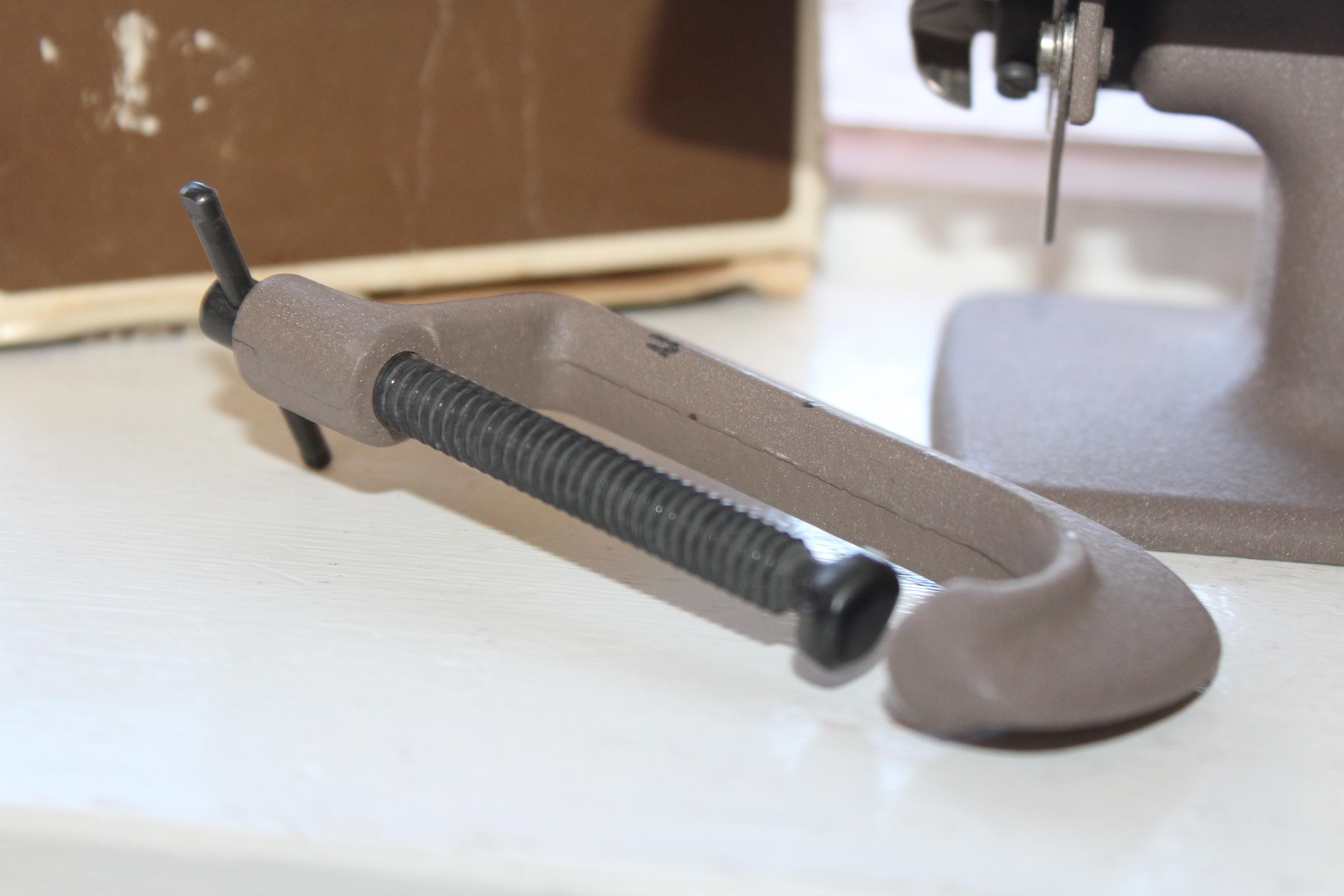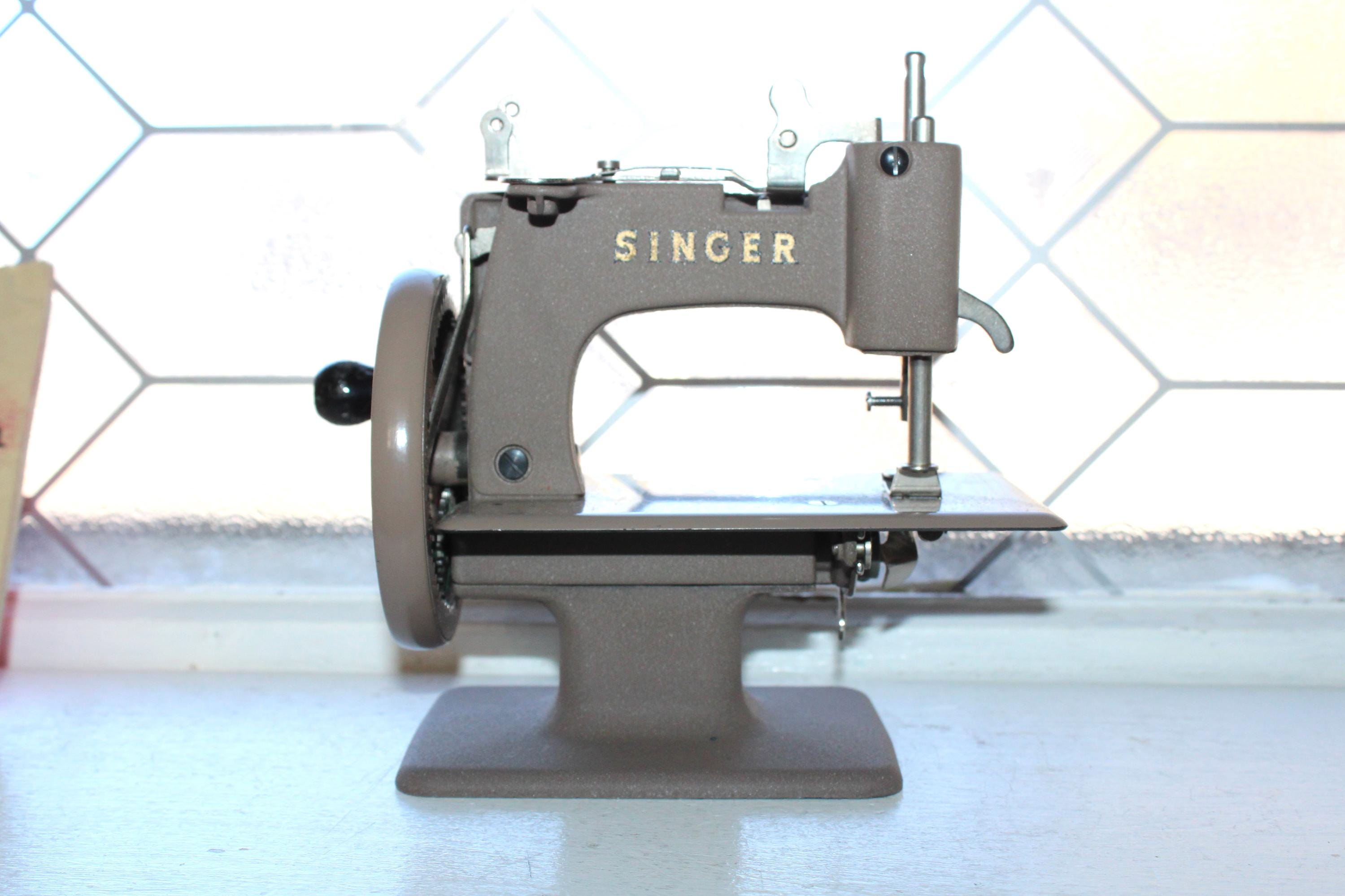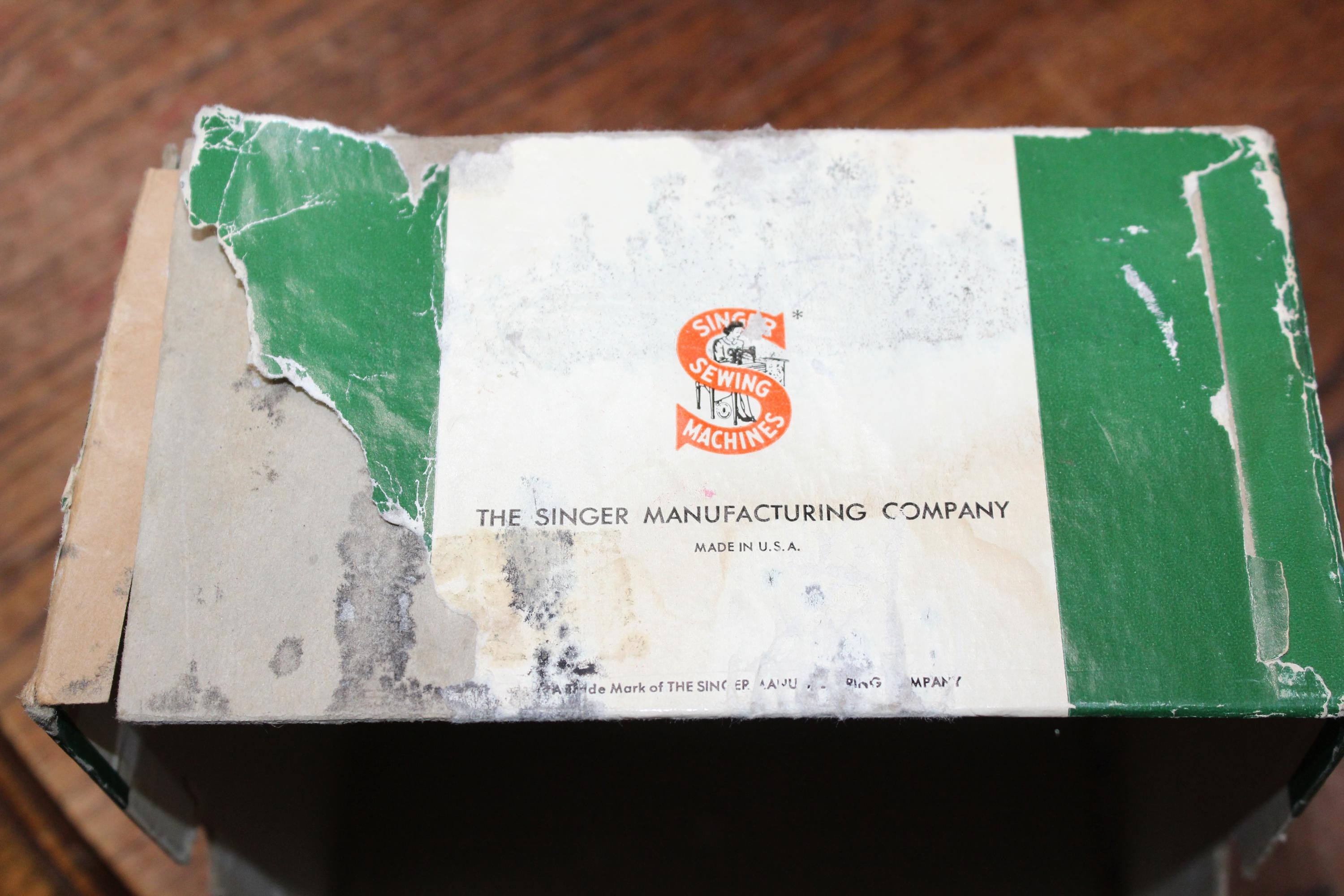 Vintage 1950s Singer Sewhandy Model 20 toy sewing machine with clamp, original box, parts box with parts, and instruction manual, great for use and display in a country home. It shows minor age appropriate wear, works and displays well. Enjoy!