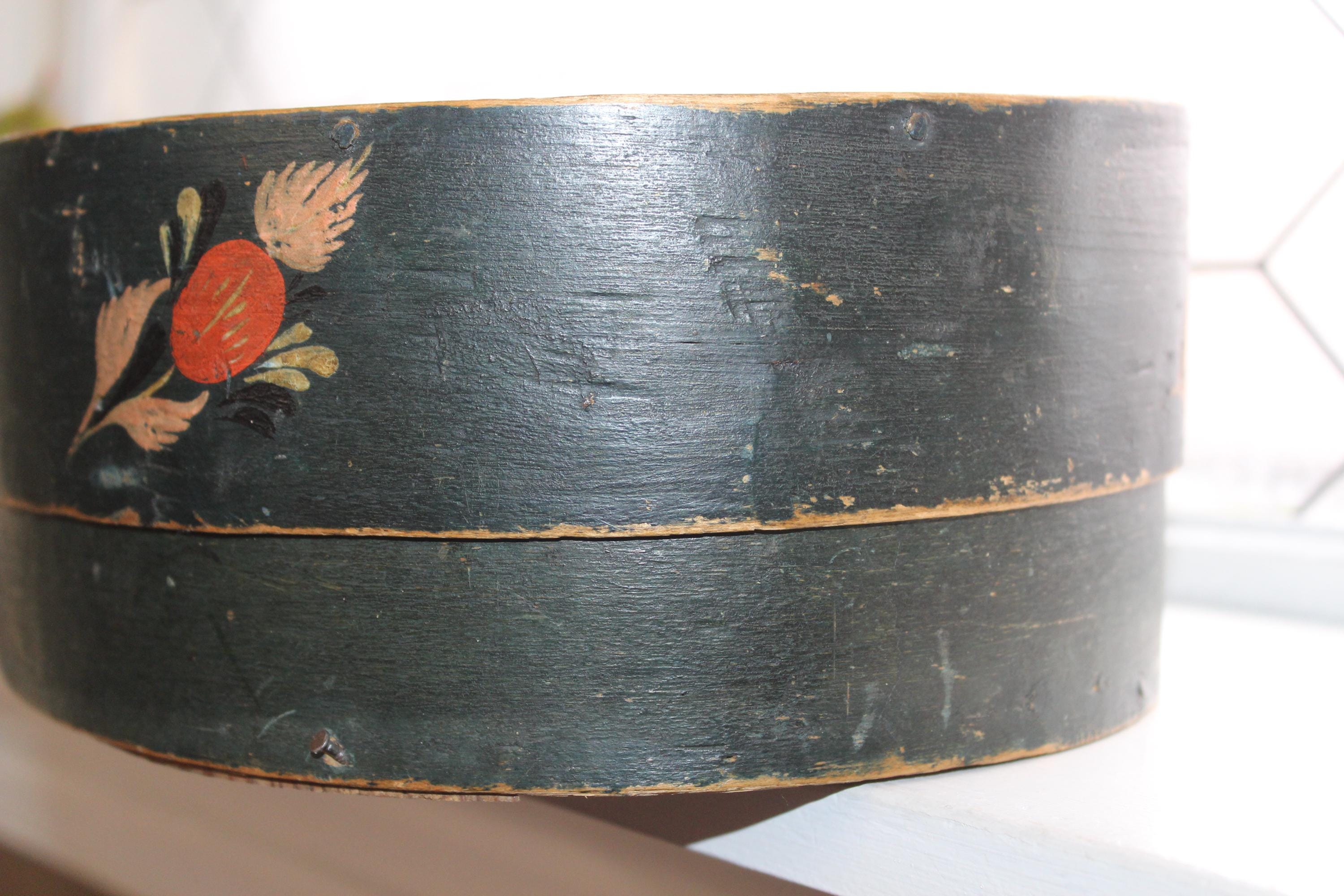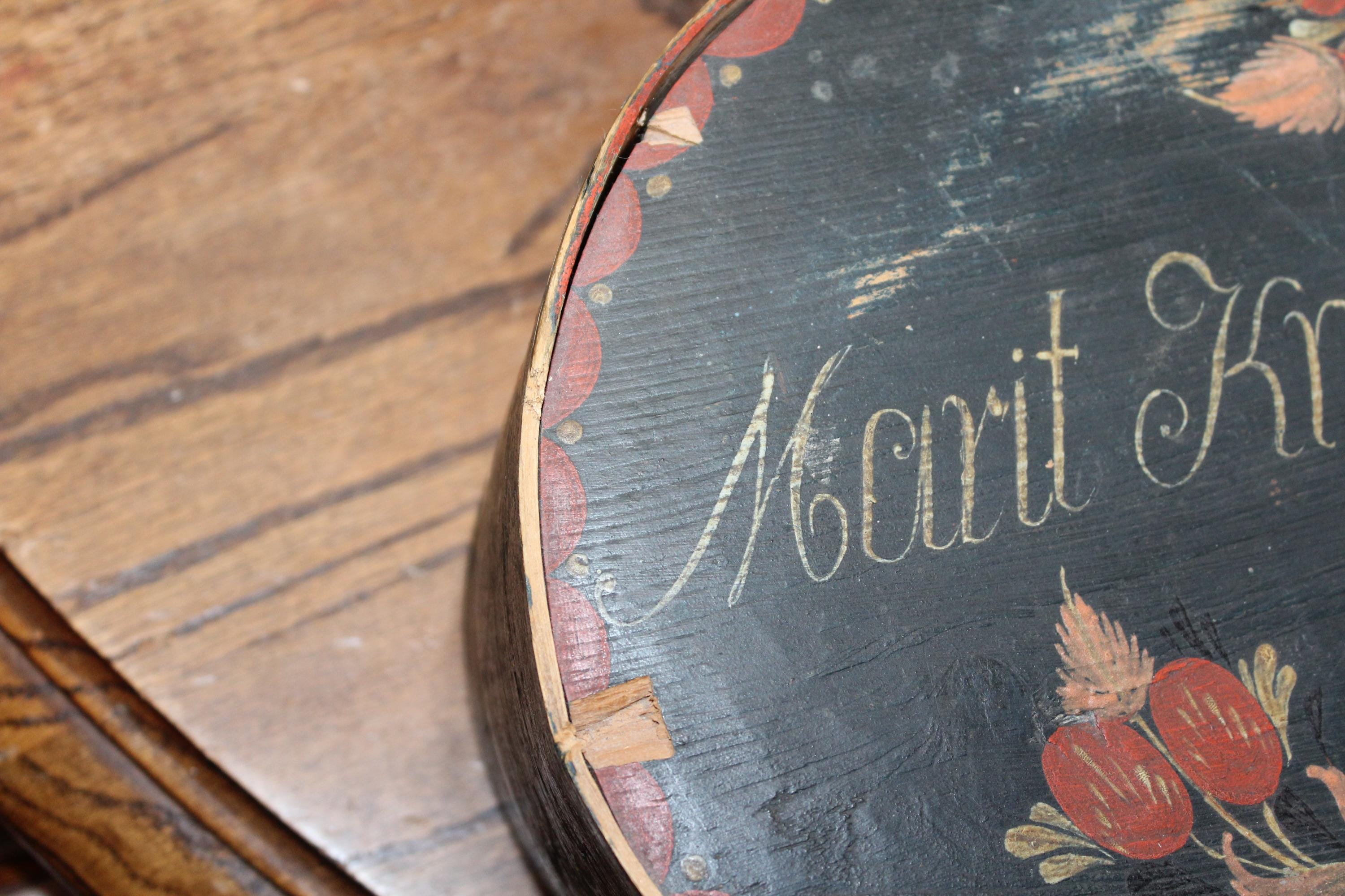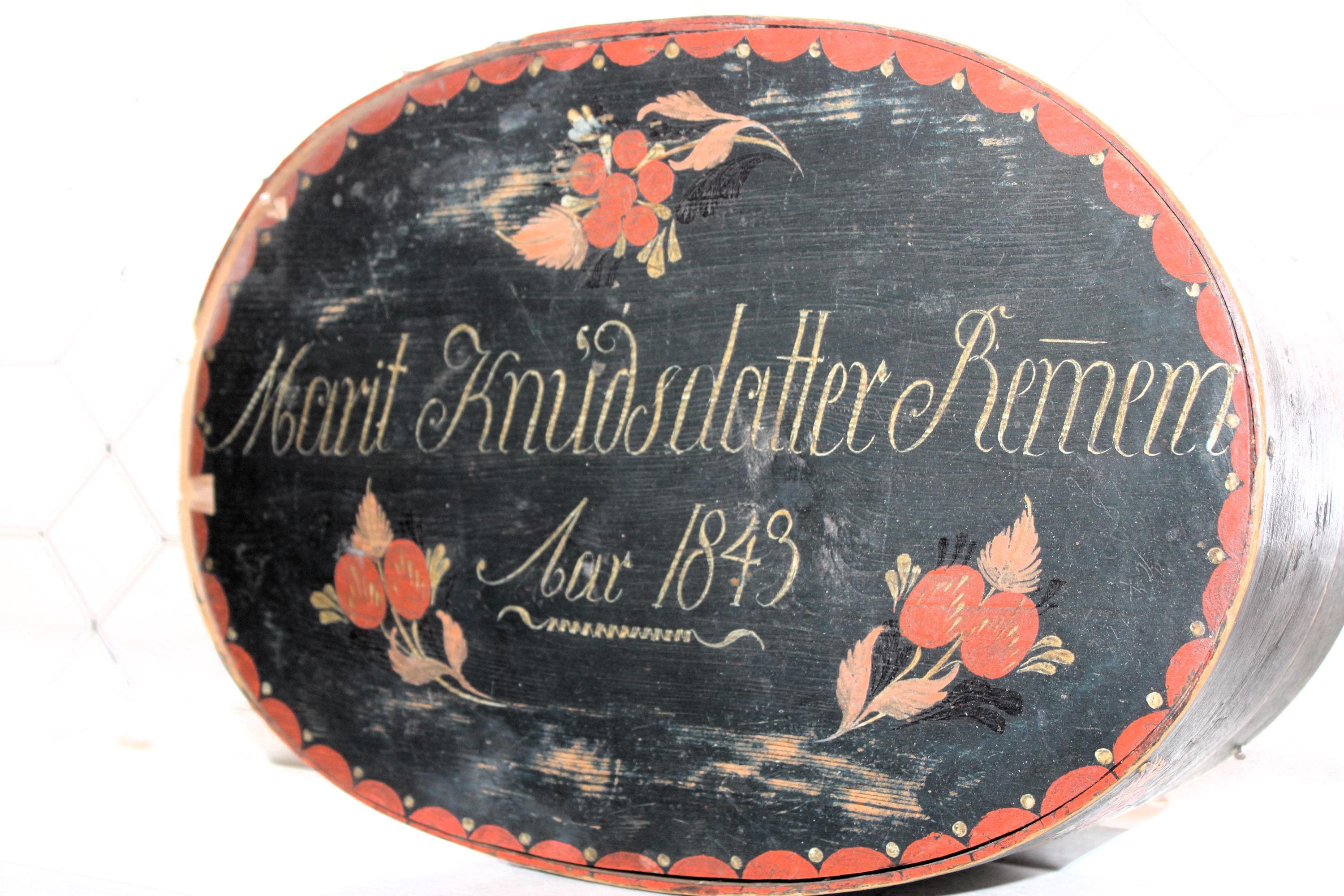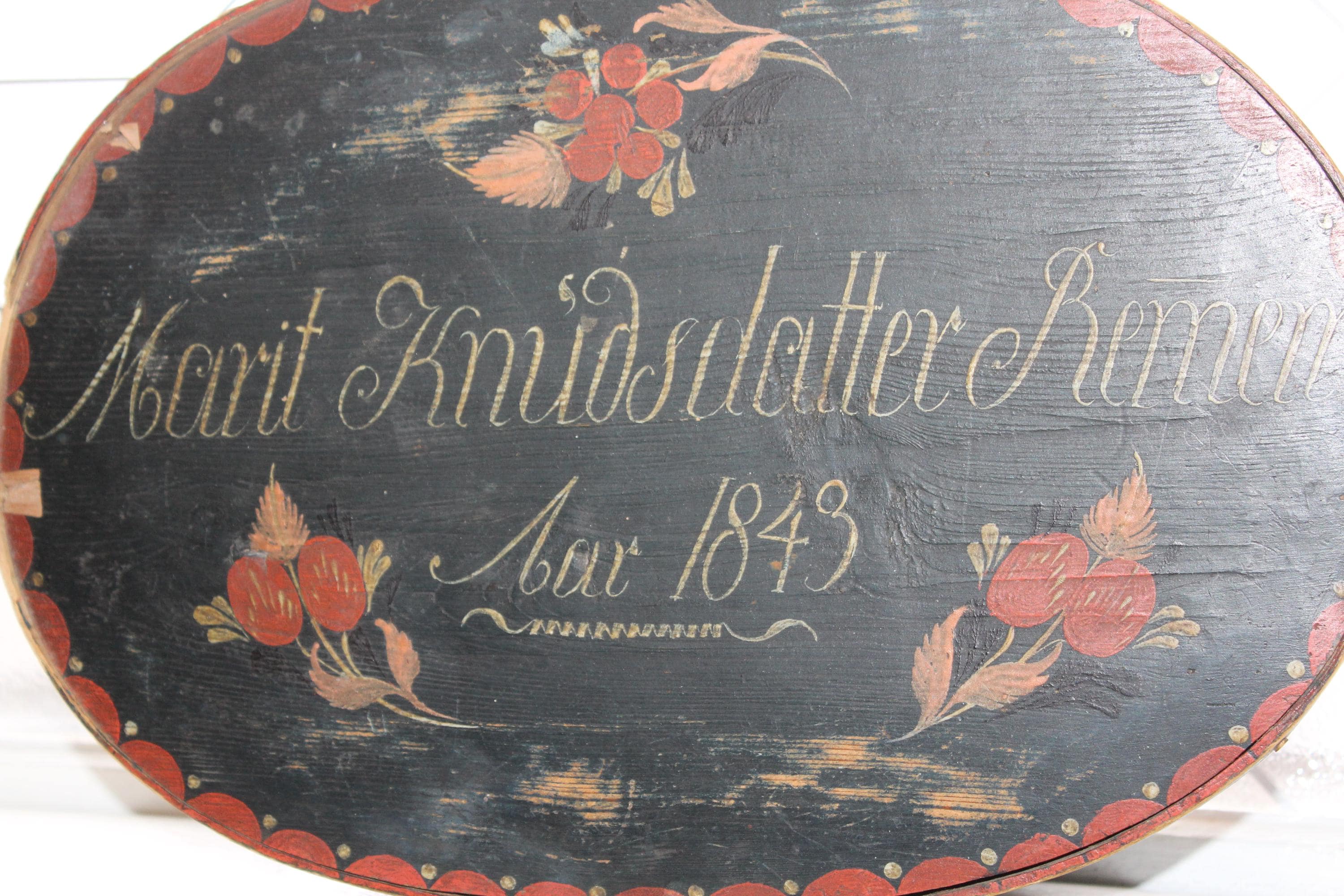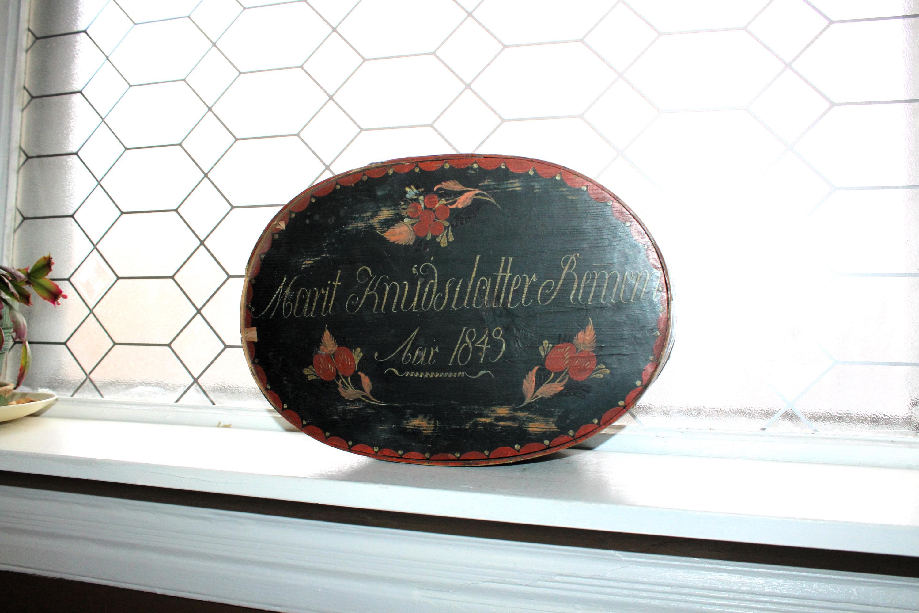 Large antique Norwegian tine box or bentwood pantry box with rosemaling, dated 1843 and all original. These have gotten so hard to find, and this big one is a beauty! The box came from a farm estate sale in eastern North Dakota. It measures 14 1/2" x 10" wide x 4 1/4" high and consists of bent wood, wood pegs and lacing construction. Some small nails were added to the base at one time to better secure the bottom. Enjoy!