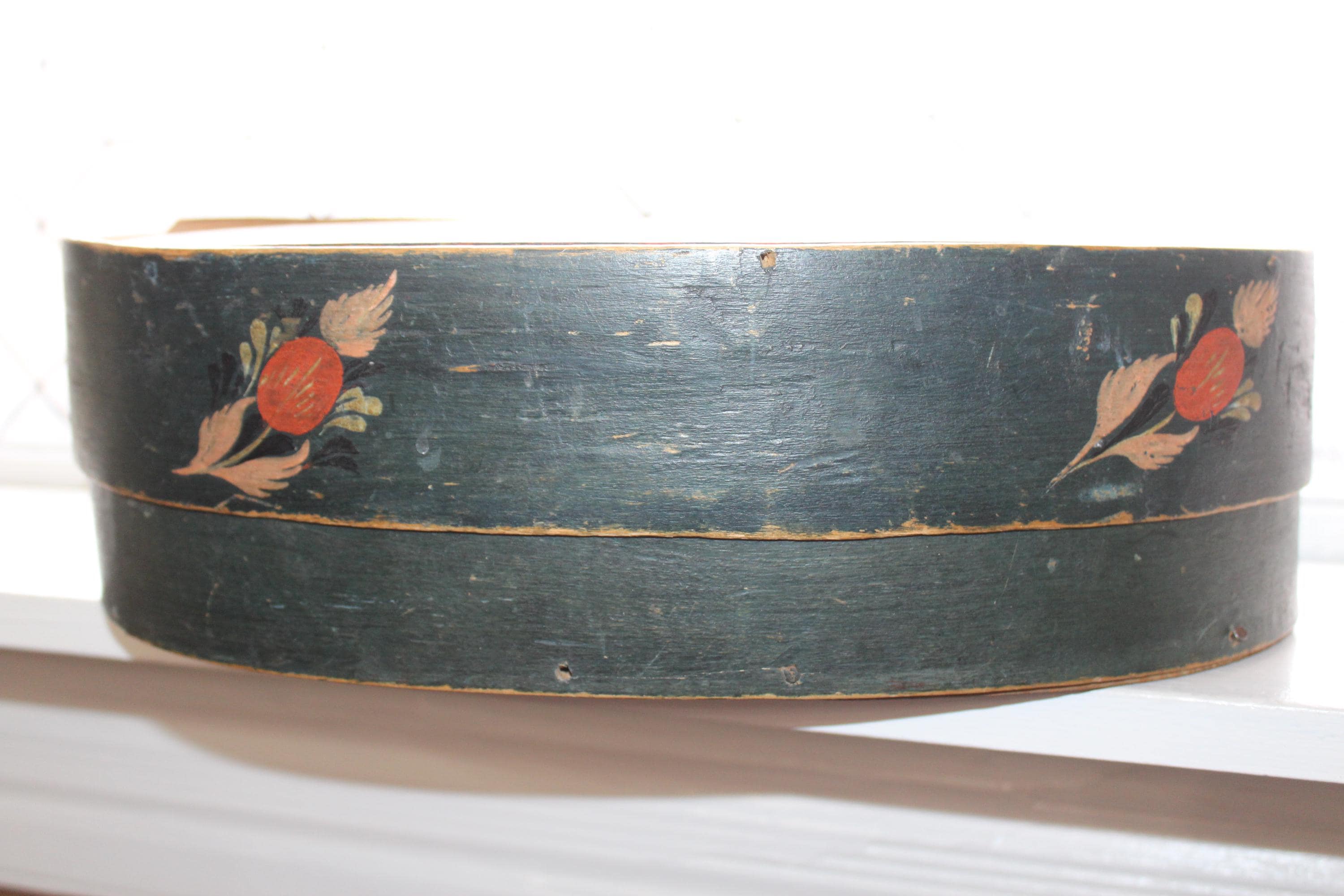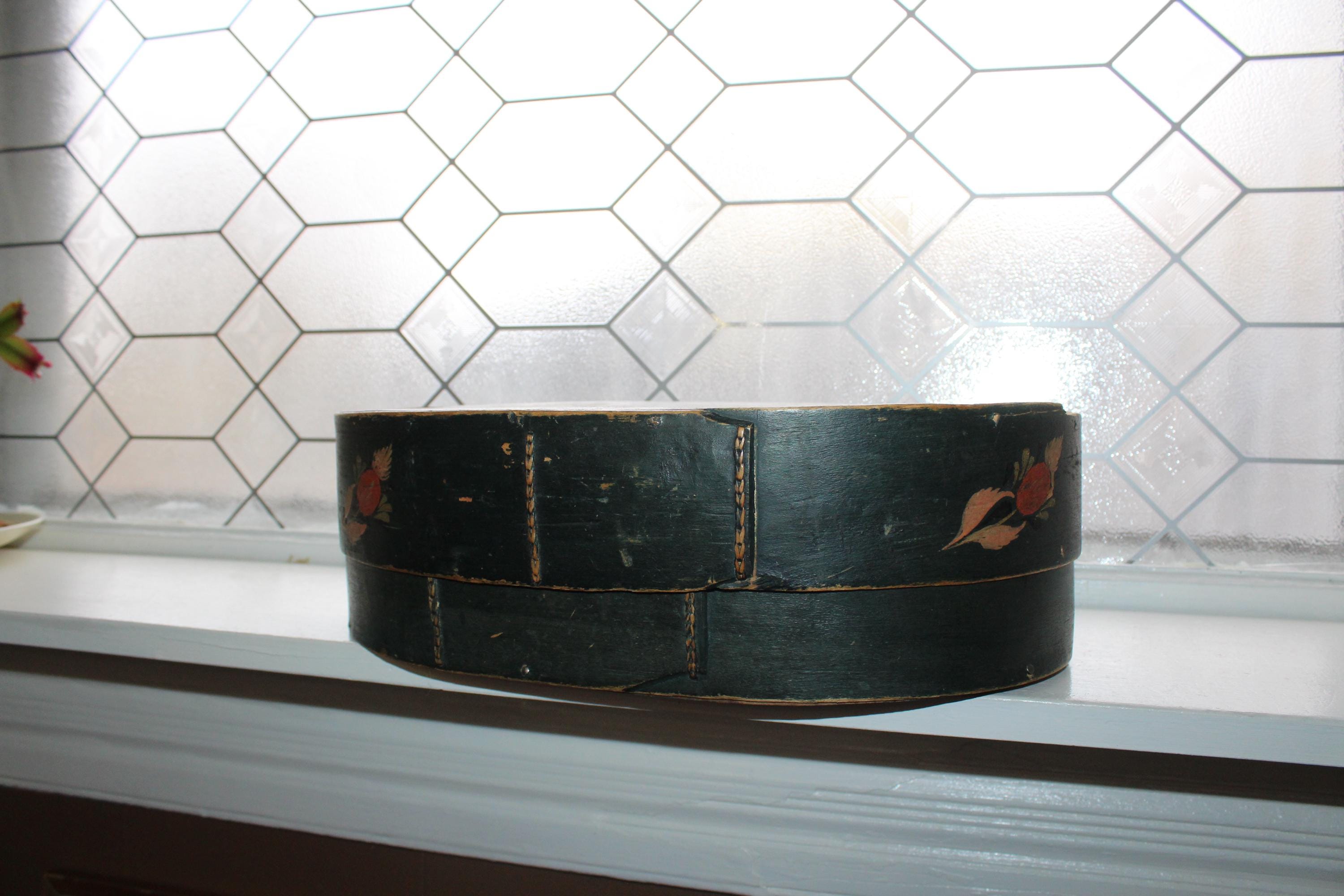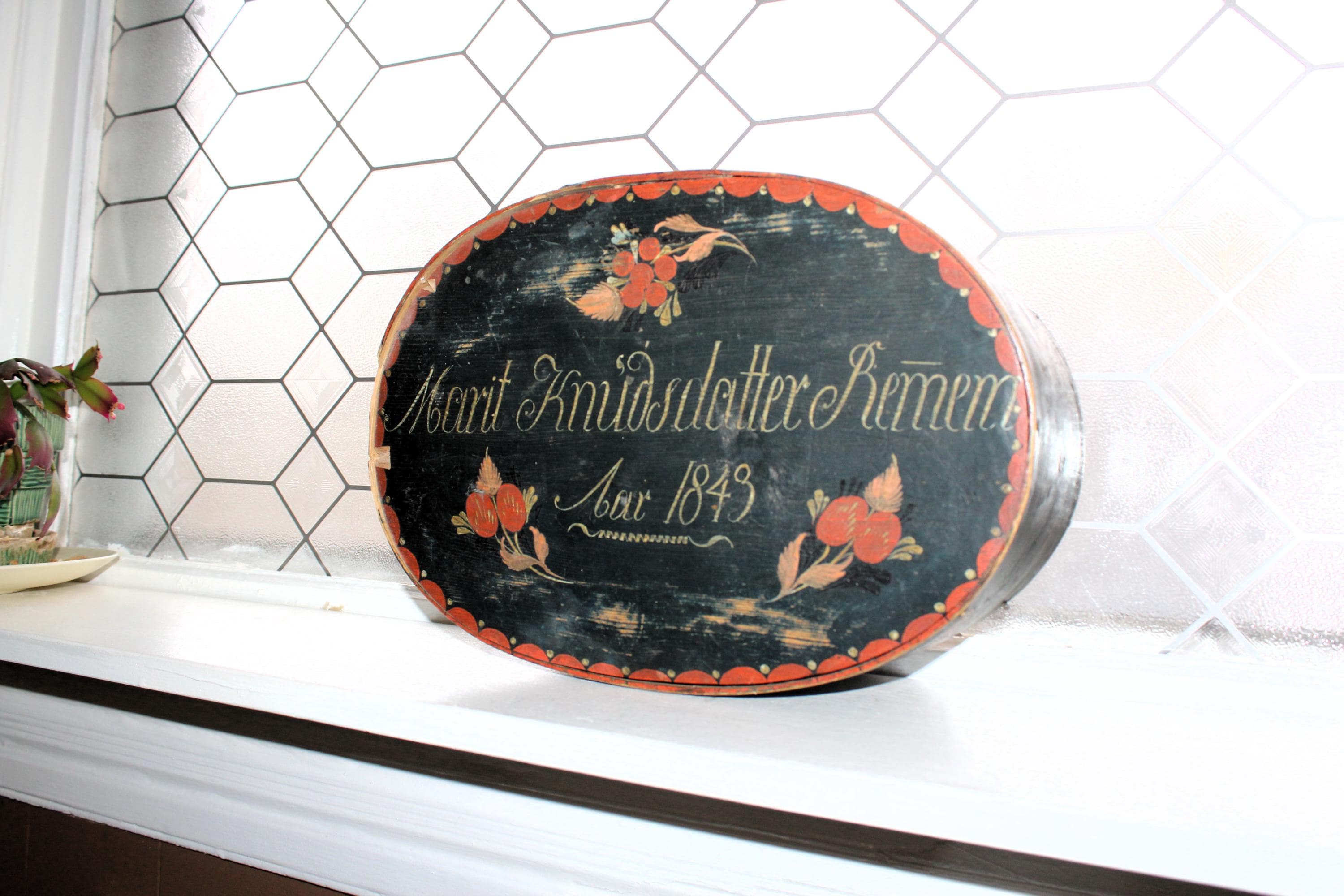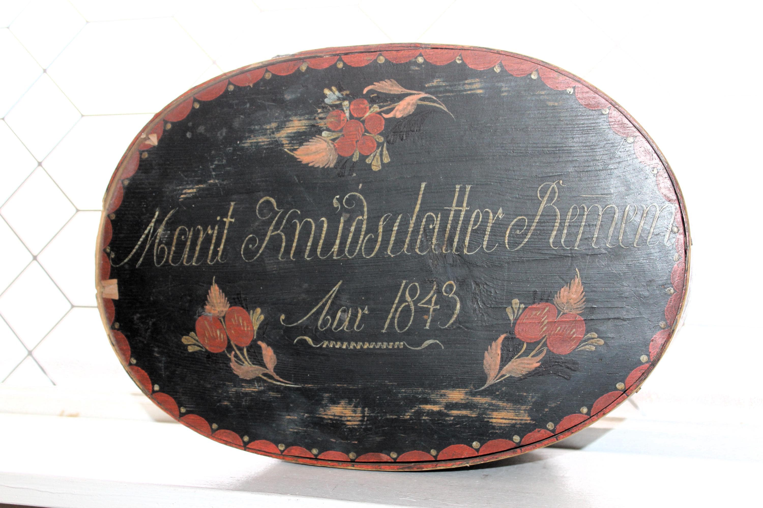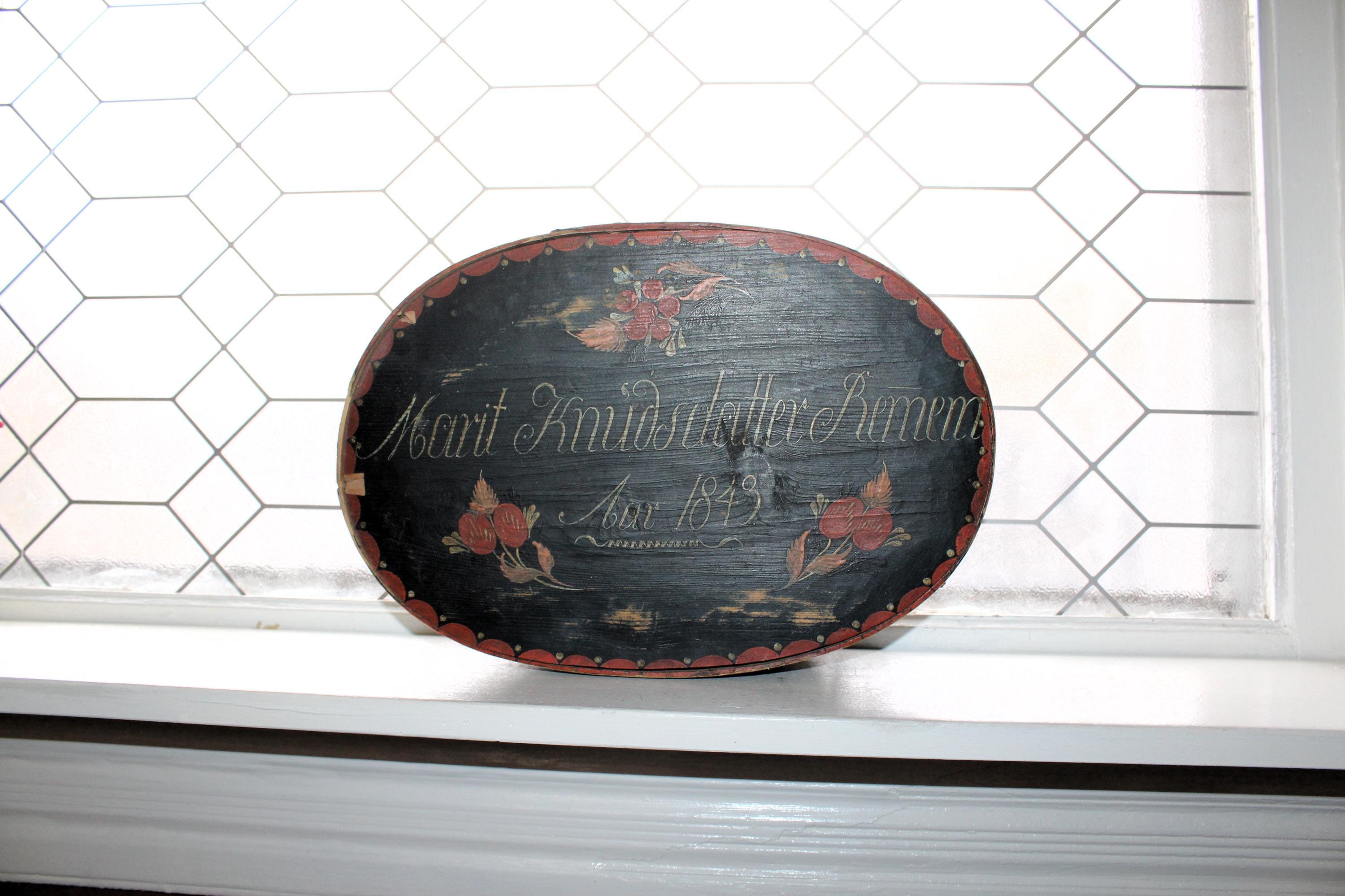 Large antique Norwegian tine box or bentwood pantry box with rosemaling, dated 1843 and all original. These have gotten so hard to find, and this big one is a beauty! The box came from a farm estate sale in eastern North Dakota. It measures 14 1/2" x 10" wide x 4 1/4" high and consists of bent wood, wood pegs and lacing construction. Some small nails were added to the base at one time to better secure the bottom. Enjoy!