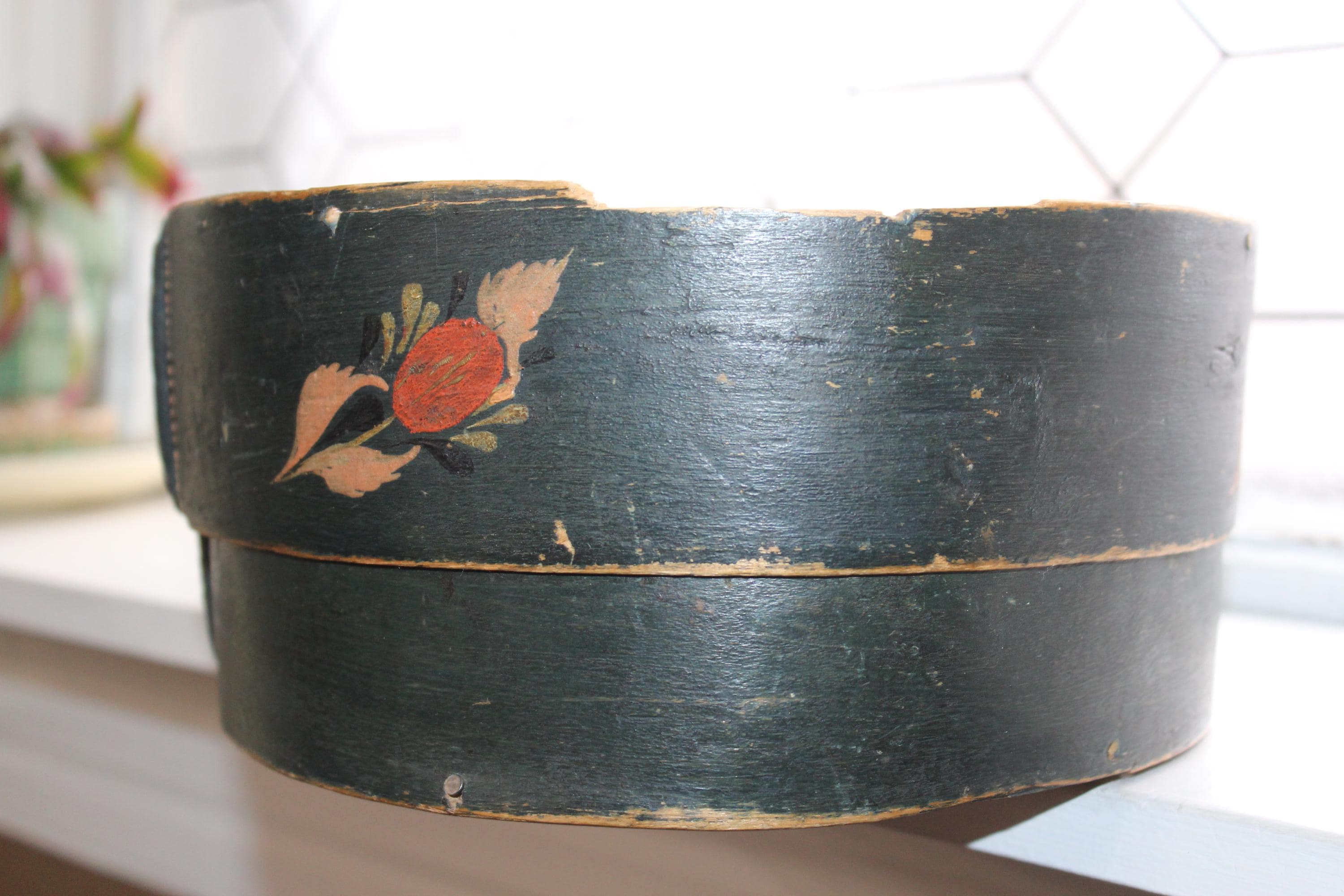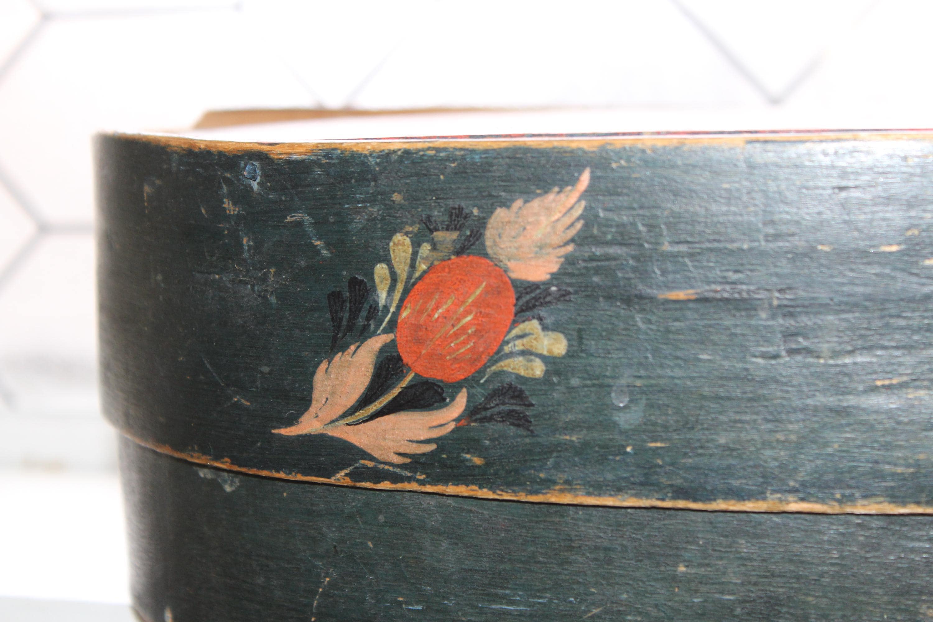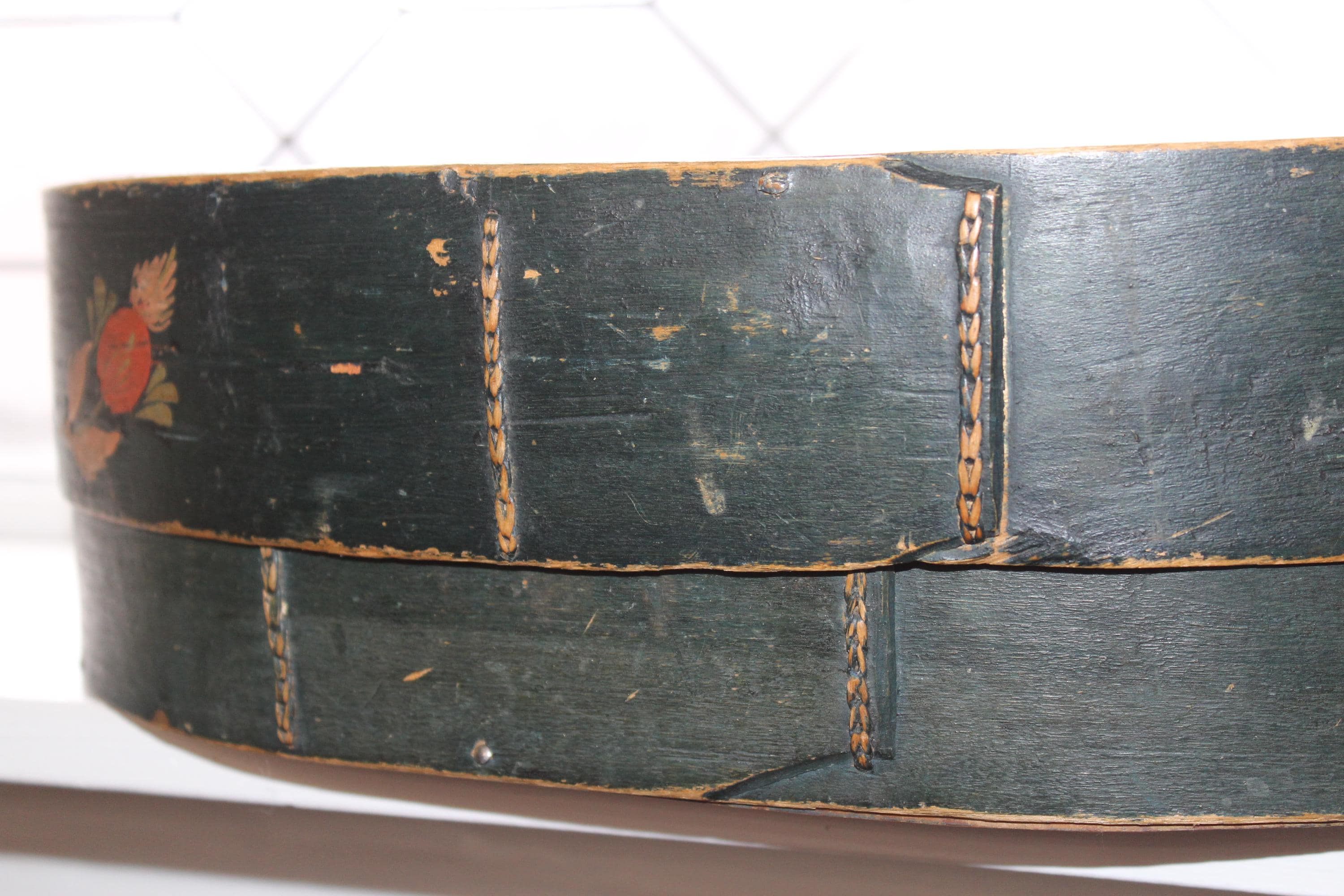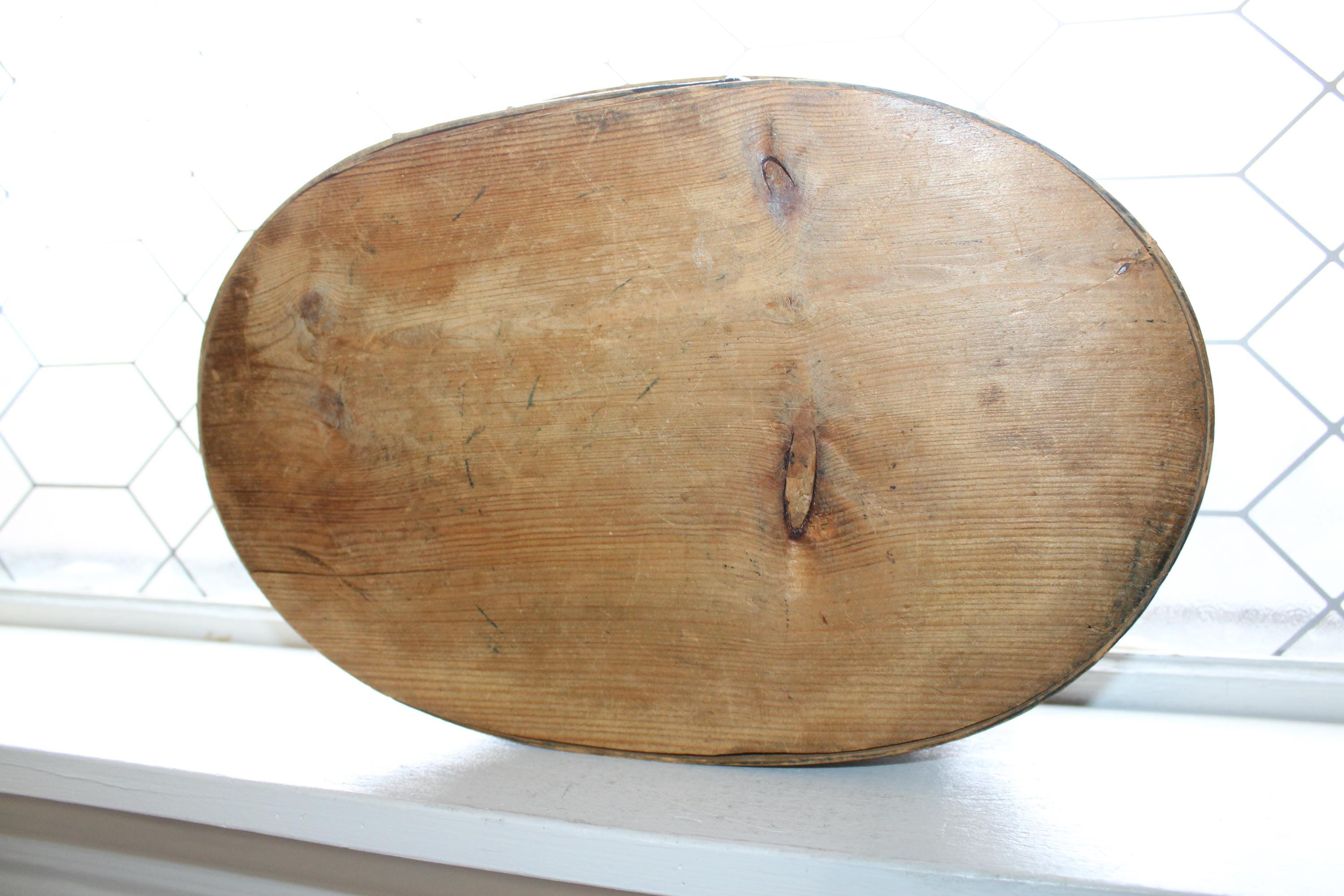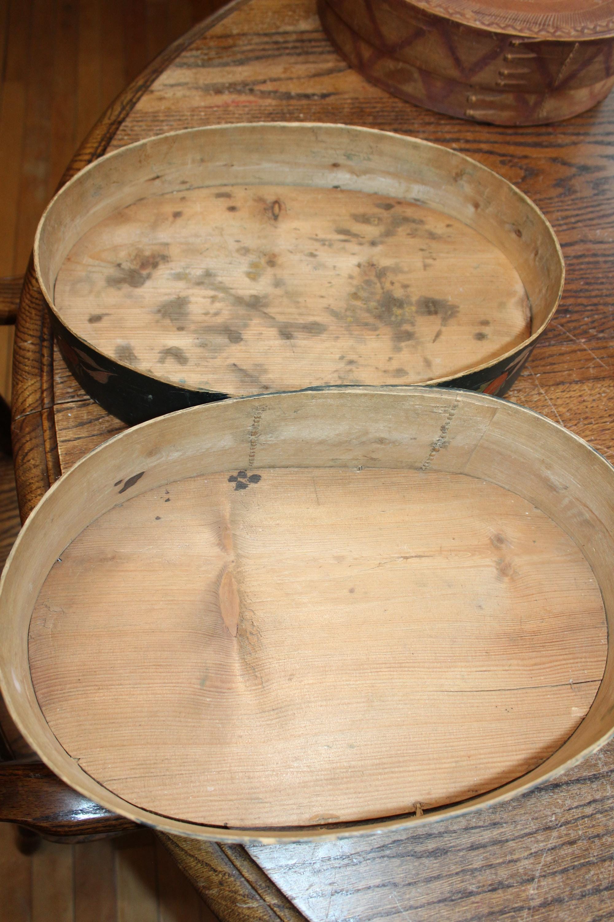Large antique Norwegian tine box or bentwood pantry box with rosemaling, dated 1843 and all original. These have gotten so hard to find, and this big one is a beauty! The box came from a farm estate sale in eastern North Dakota. It measures 14 1/2" x 10" wide x 4 1/4" high and consists of bent wood, wood pegs and lacing construction. Some small nails were added to the base at one time to better secure the bottom. Enjoy!