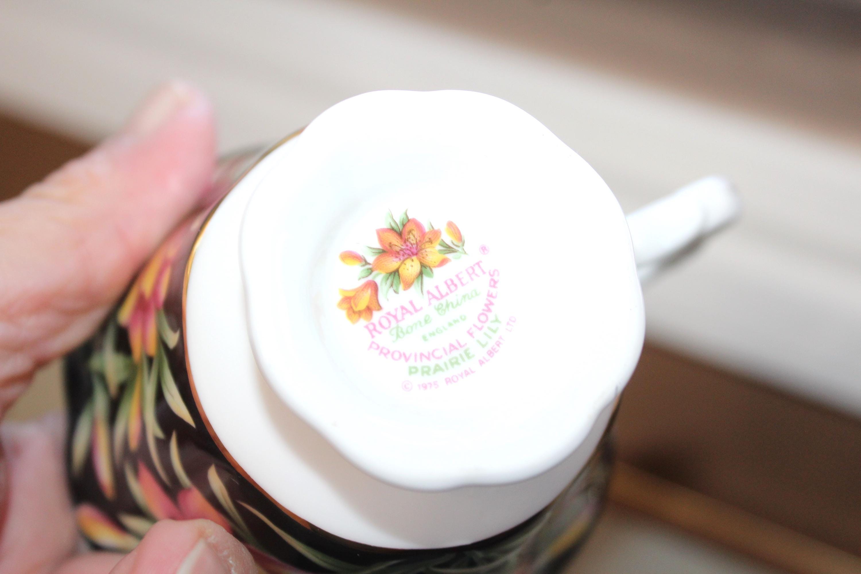 Vintage Royal Albert fine bone china tea cup and saucer, Prairie Lily pattern from the Provincial Flowers Series, in excellent condition. The cup measures 3 1/2" in diameter and 3" high, and the saucer measures 5 1/2" in diameter. No chips, cracks or wear, perfect for use or display. Enjoy!