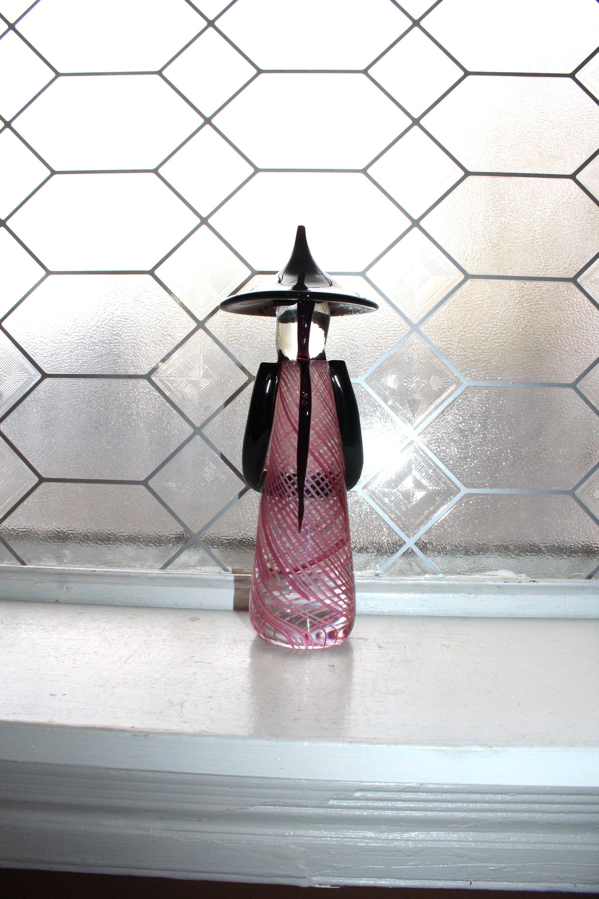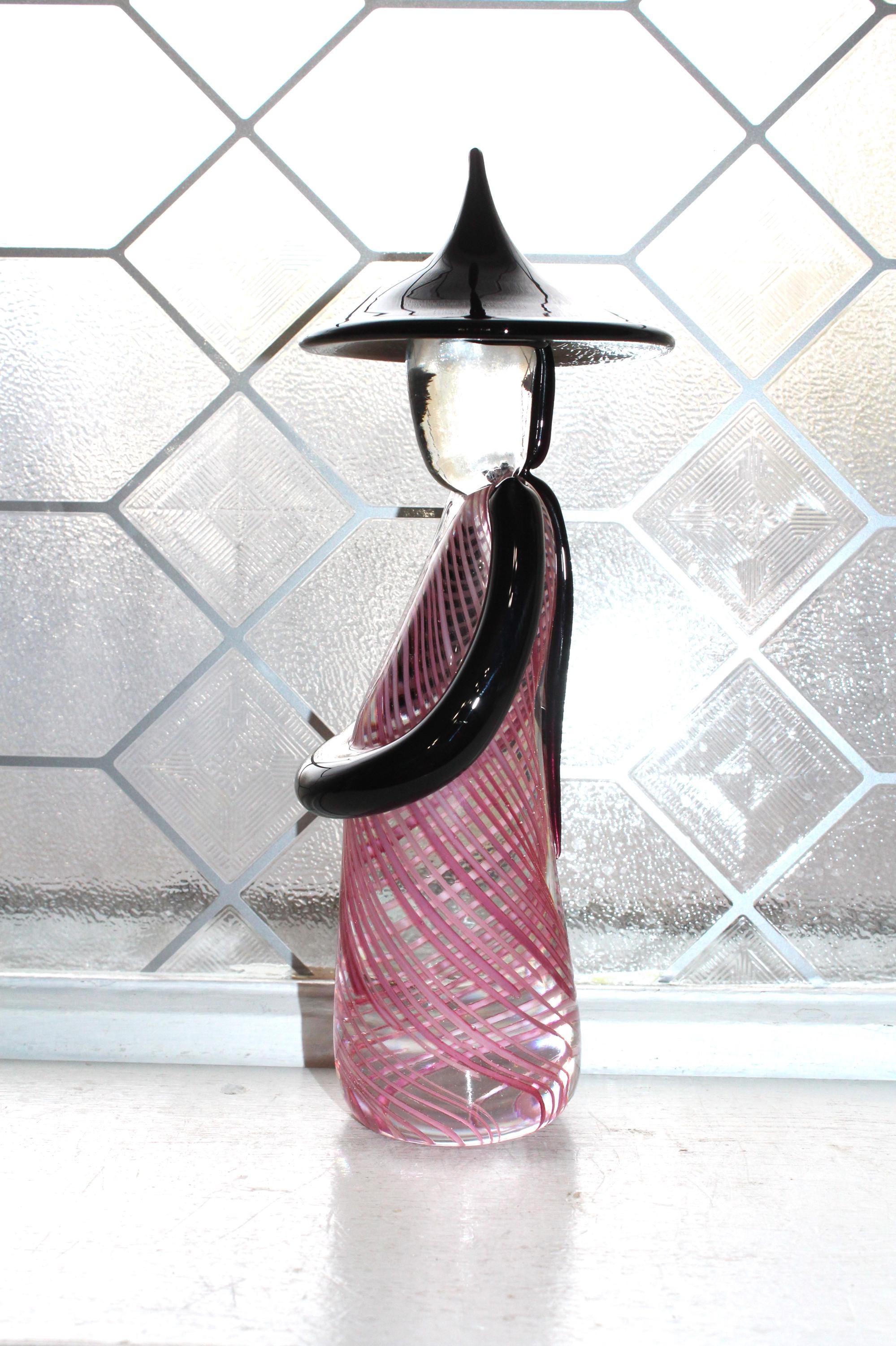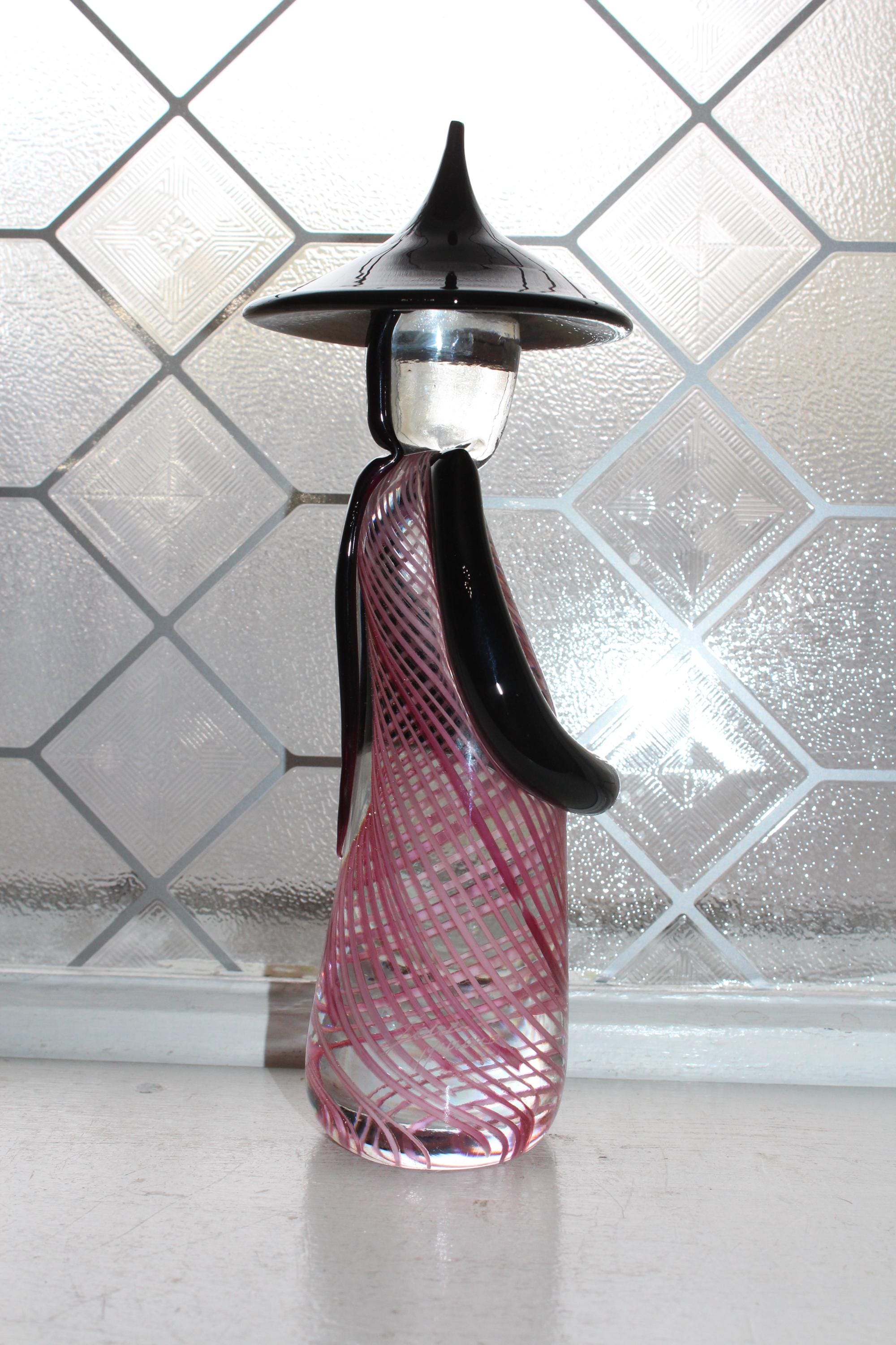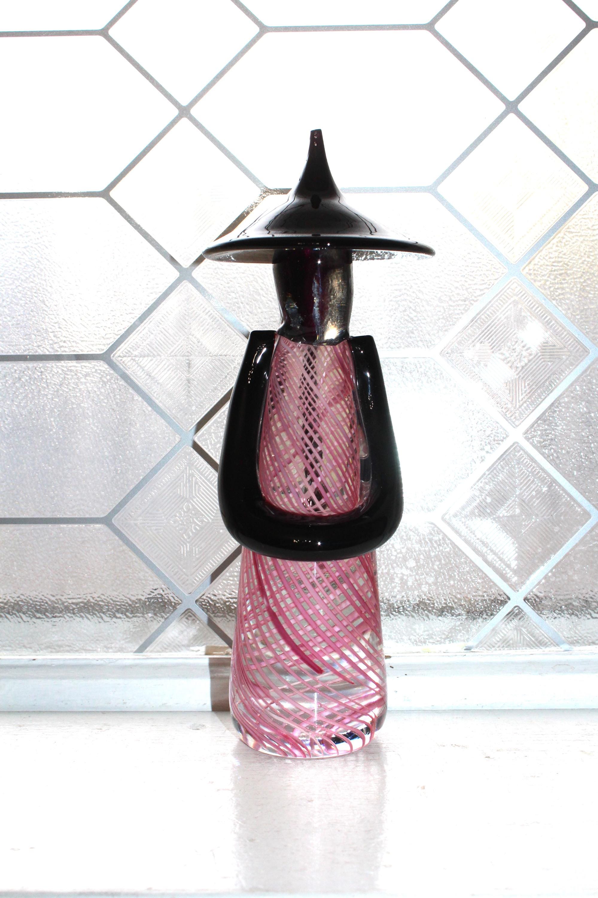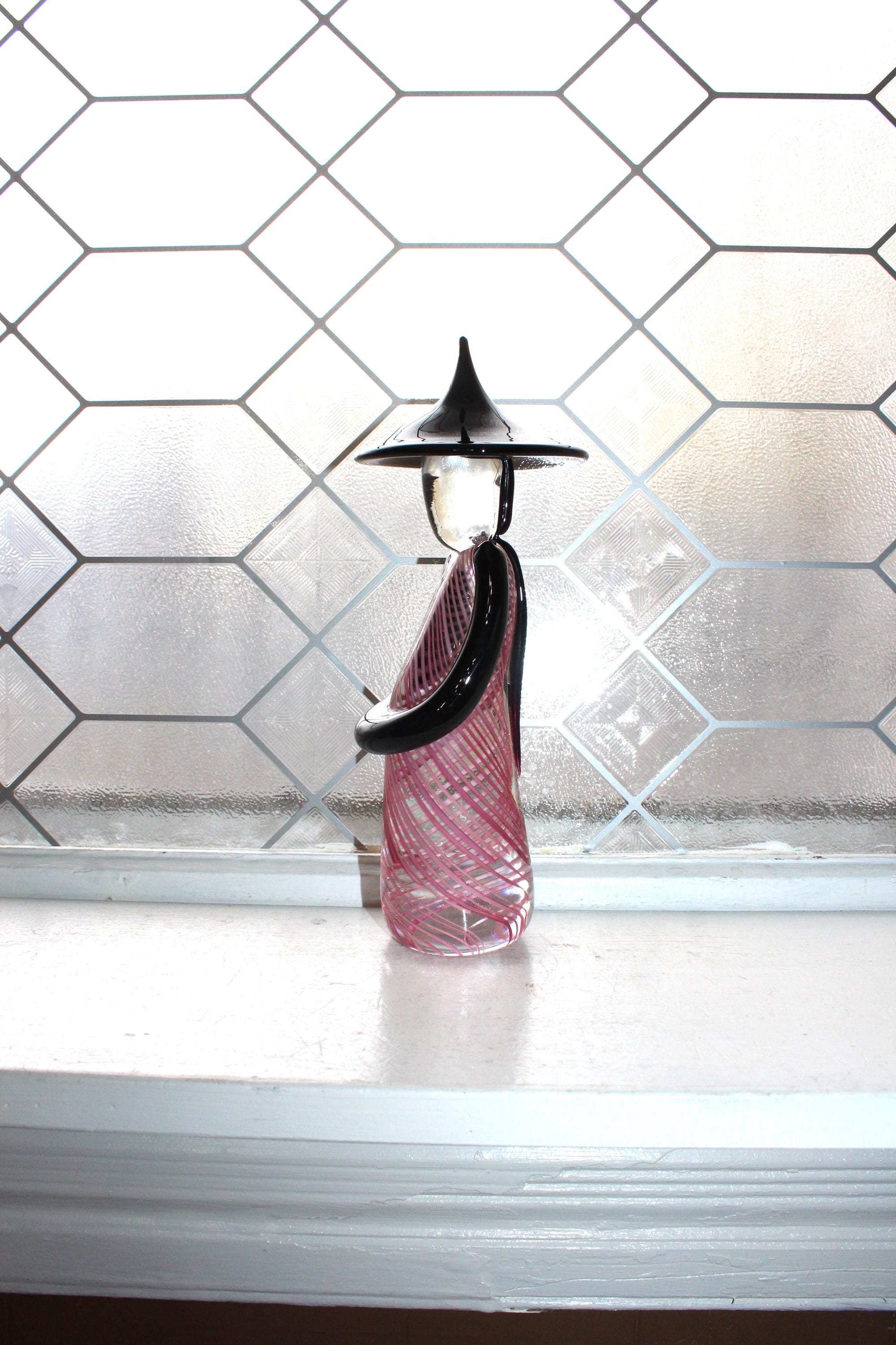 This is a fabulous vintage signed Sergio Rossi Murano latticino art glass minimalist Asian figure, in excellent condition and perfect for use or display. Featuring a pink latticino glass body, clear head and applied black glass arms, hat and hair. It measures 9 1/2" high, weighs 2 lb. 11 oz. and has no damage or wear. Enjoy!