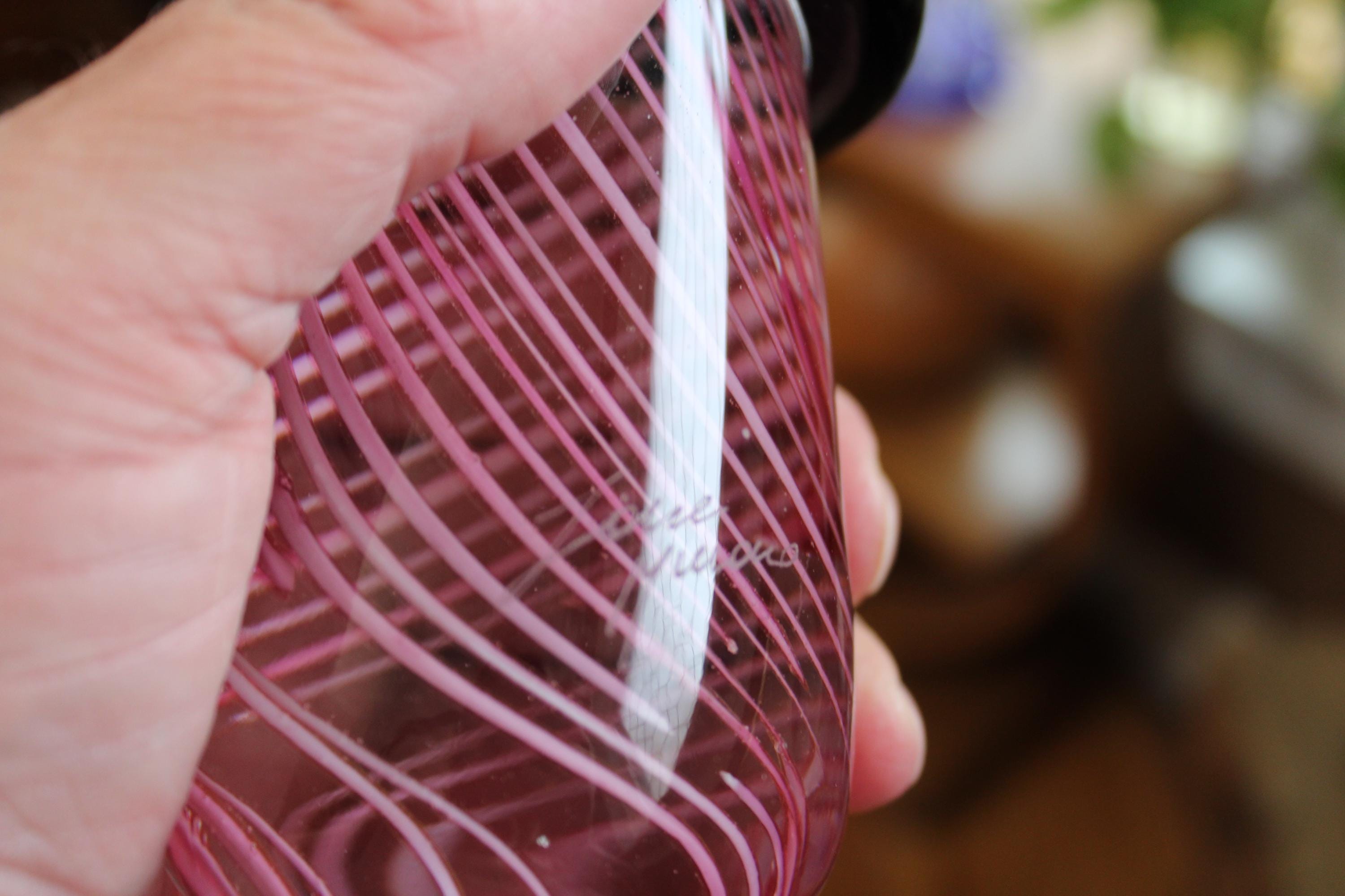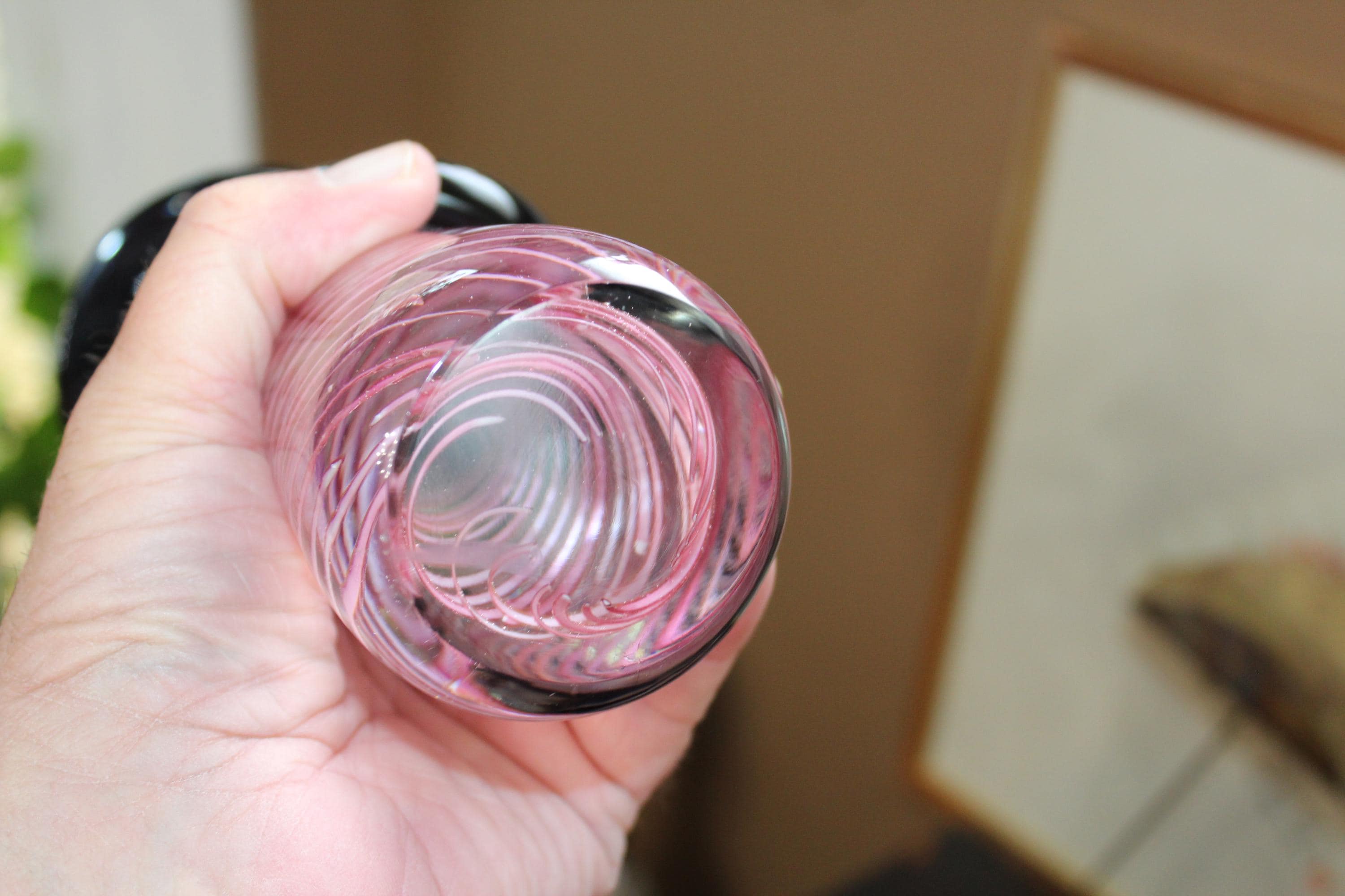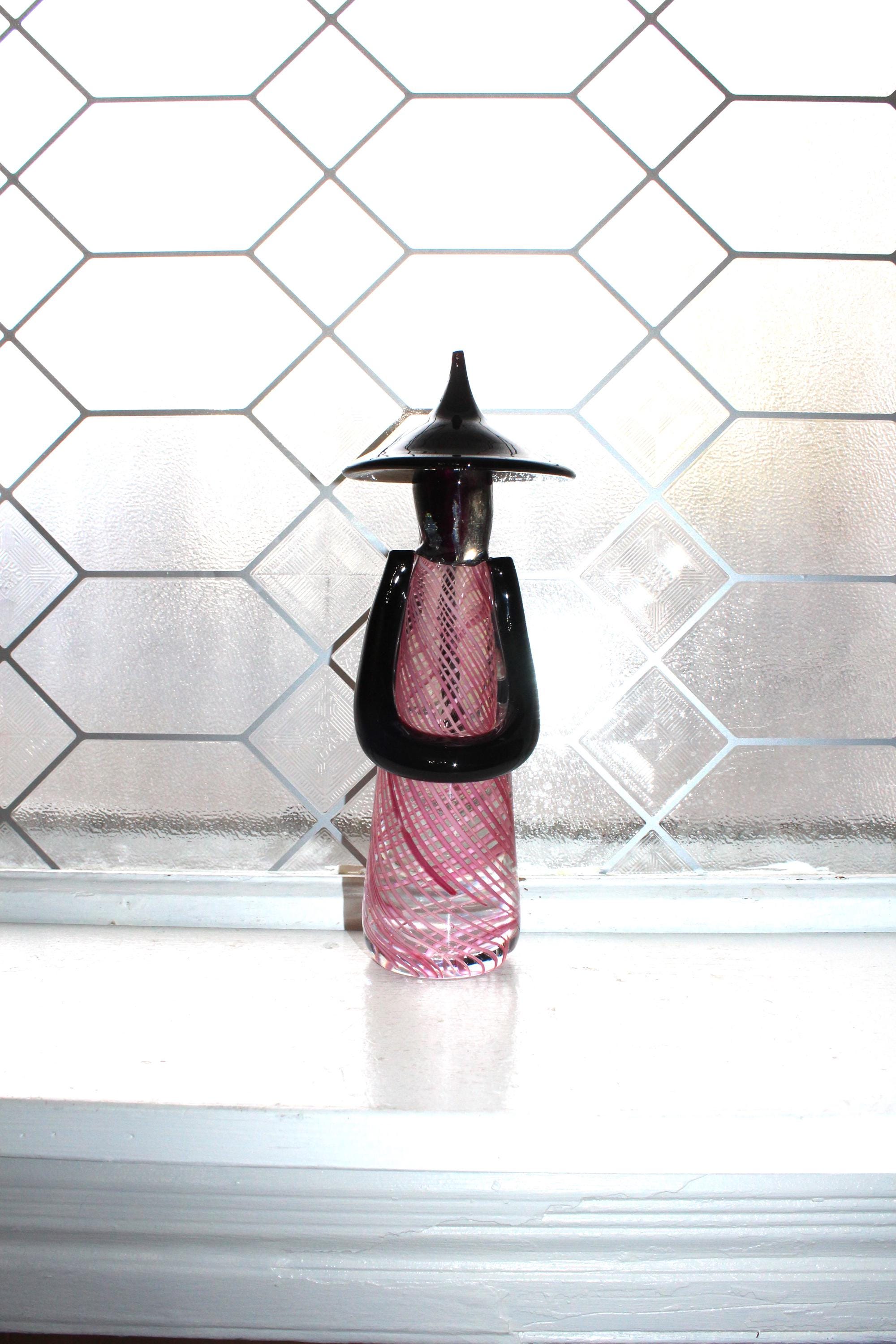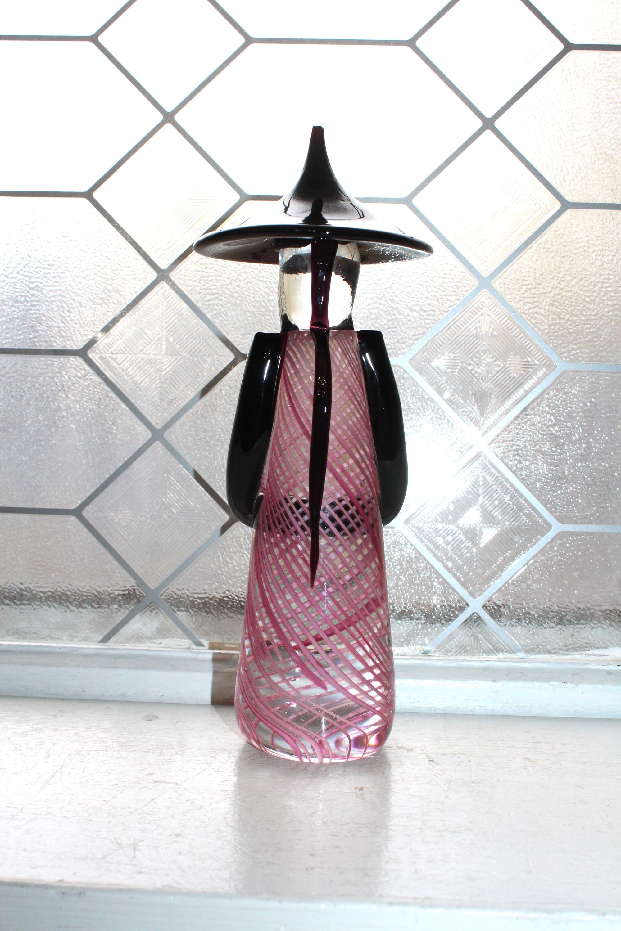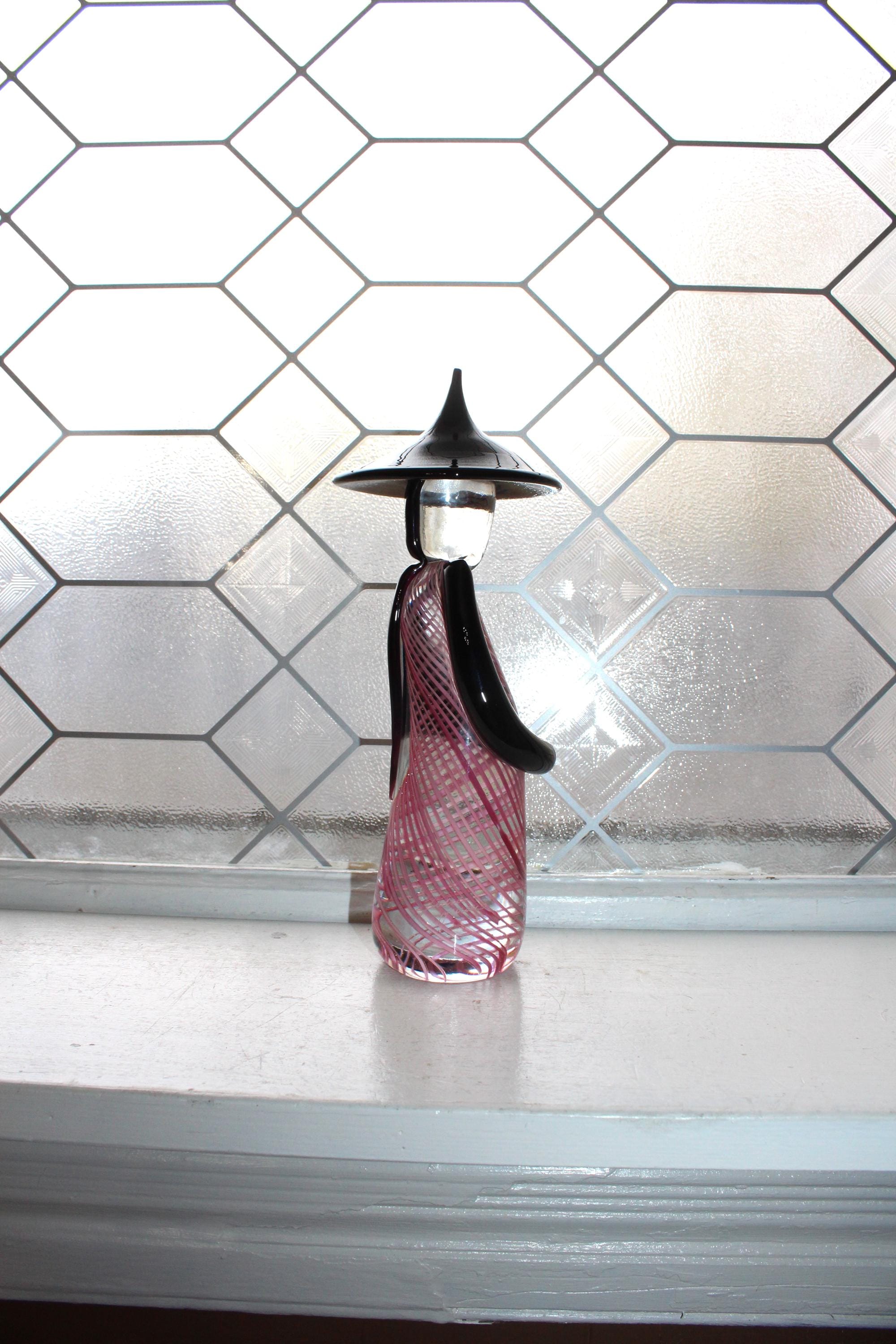This is a fabulous vintage signed Sergio Rossi Murano latticino art glass minimalist Asian figure, in excellent condition and perfect for use or display. Featuring a pink latticino glass body, clear head and applied black glass arms, hat and hair. It measures 9 1/2" high, weighs 2 lb. 11 oz. and has no damage or wear. Enjoy!