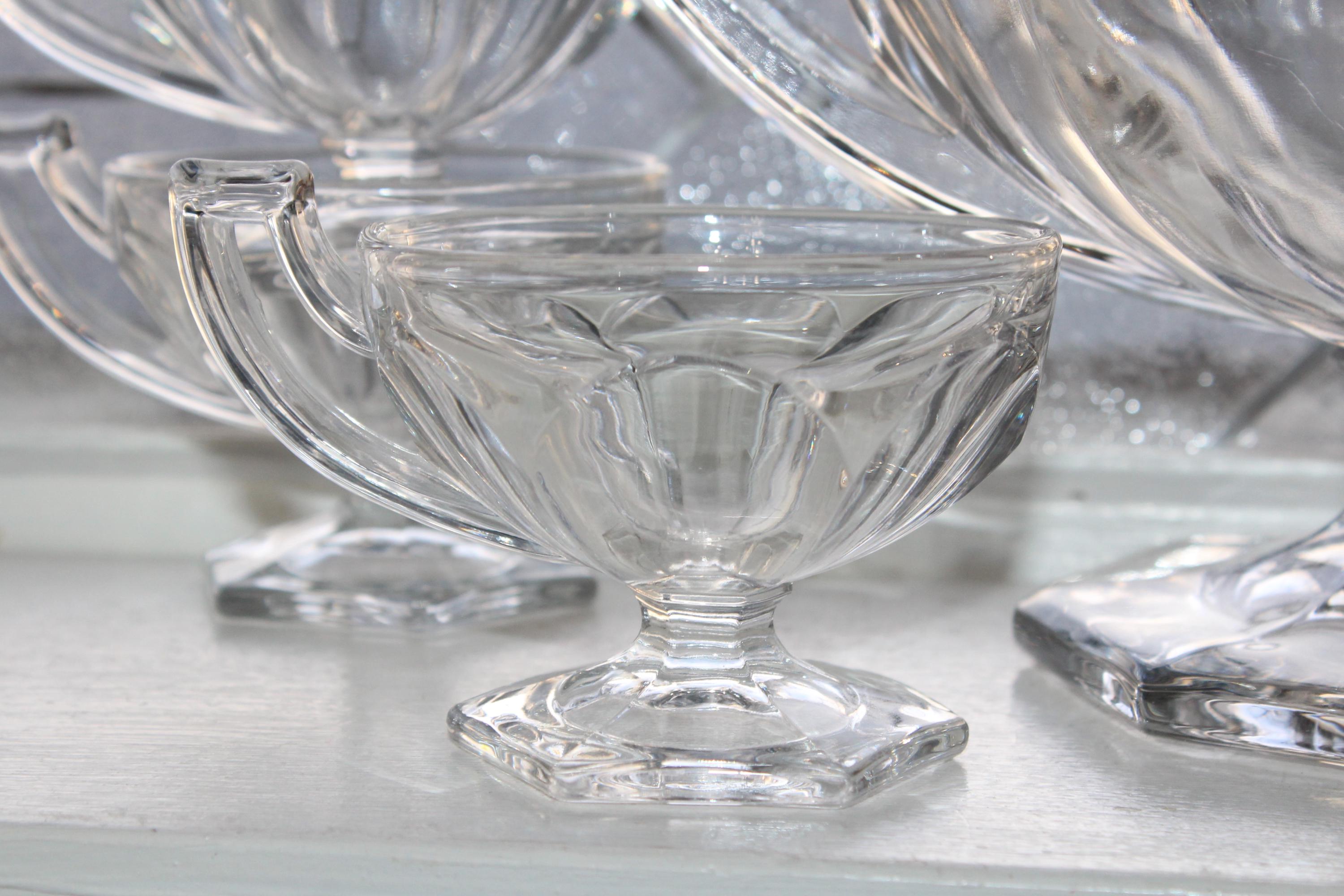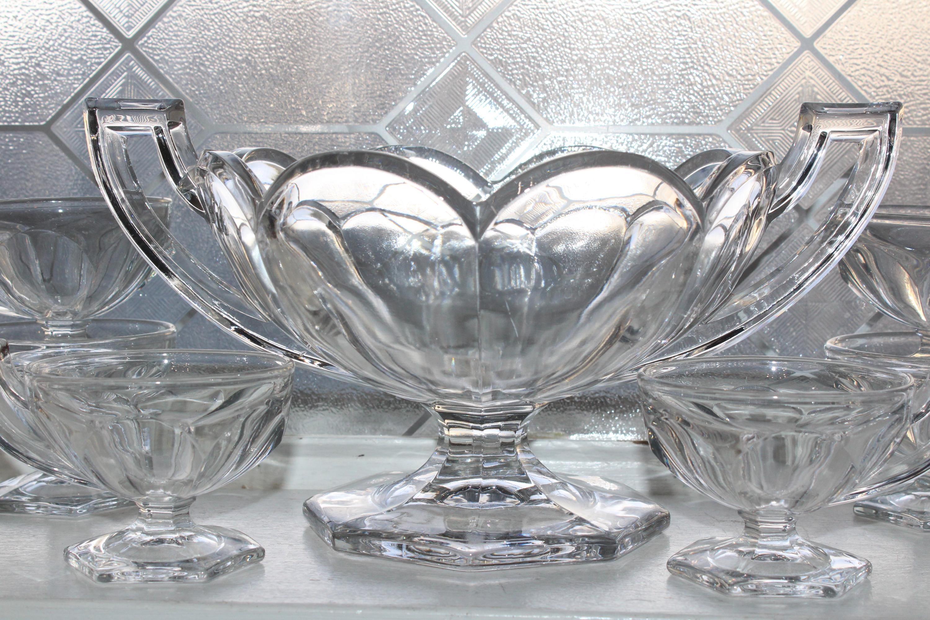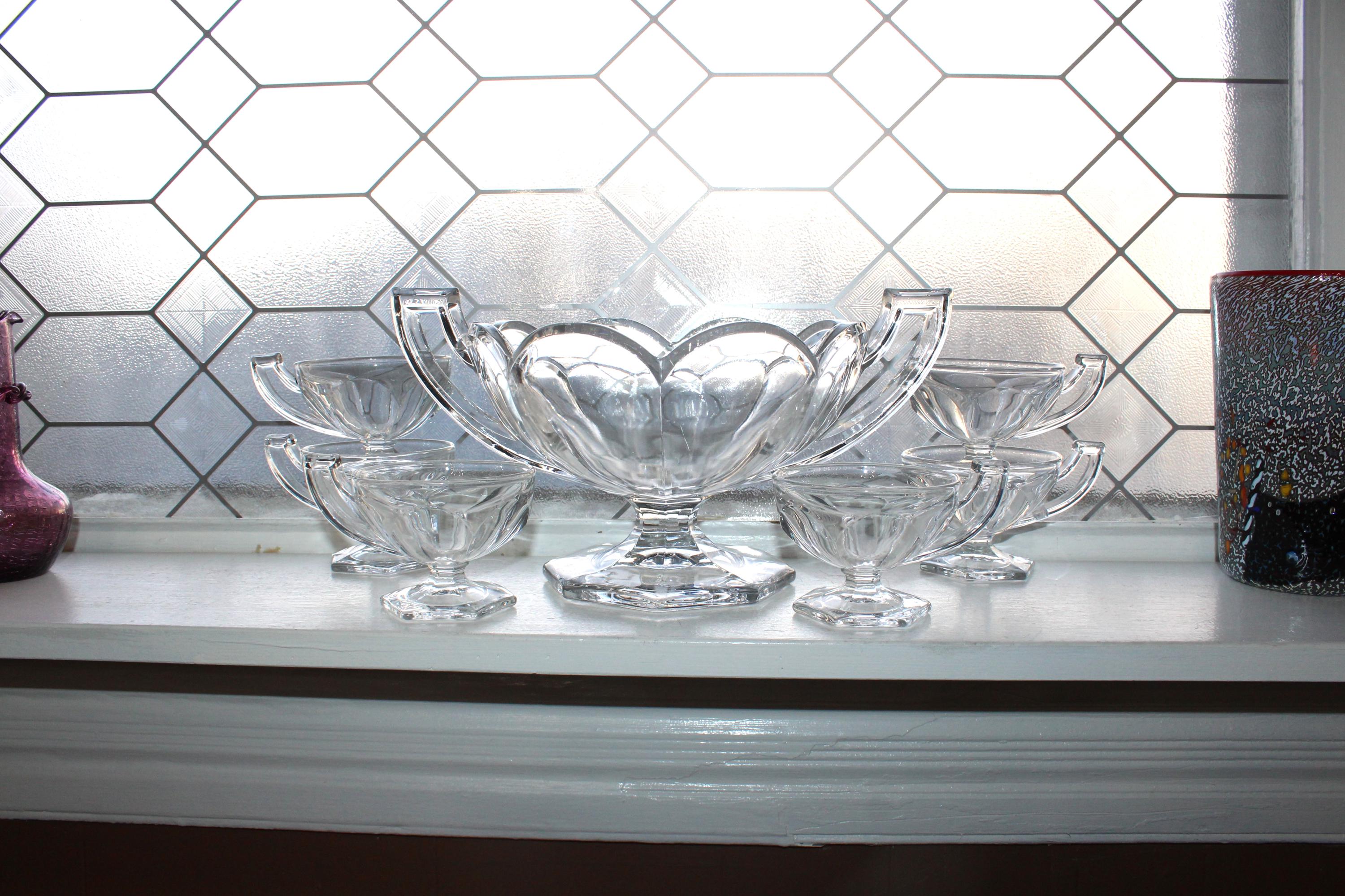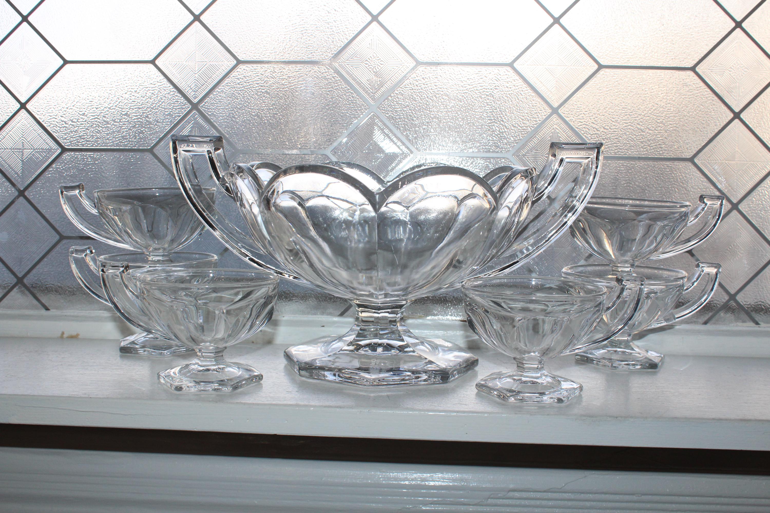 This is a fabulous antique Art Deco Kristol double handled trophy cup punch bowl with 6 matching punch cups, all in excellent condition. The bowl measures 12 1/4" wide from handle to handle x 6 1/2" high, weighs 4 lbs. and has no chips or cracks, perfect for use or display. The bowl and each cup are marked Kristol. Enjoy!