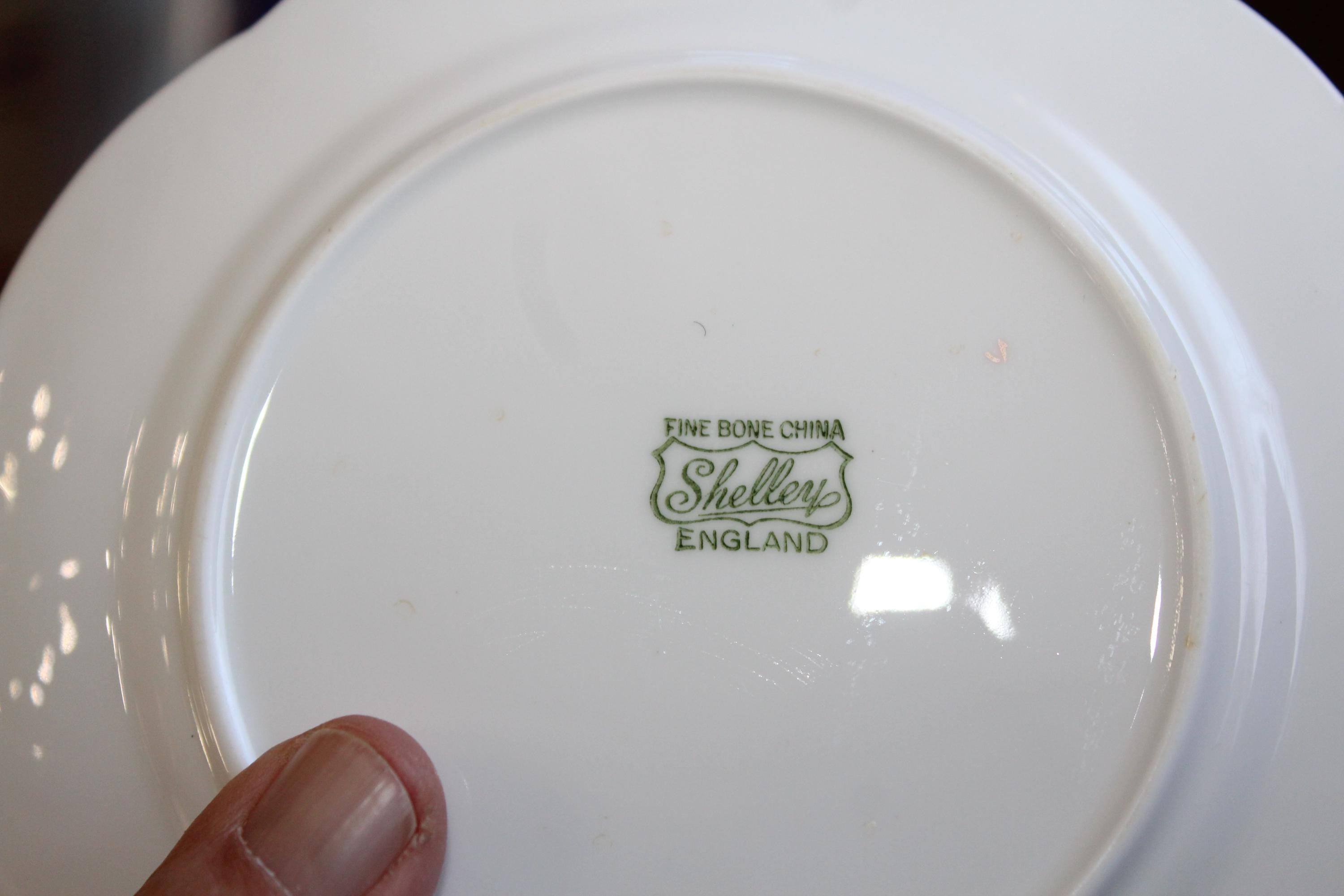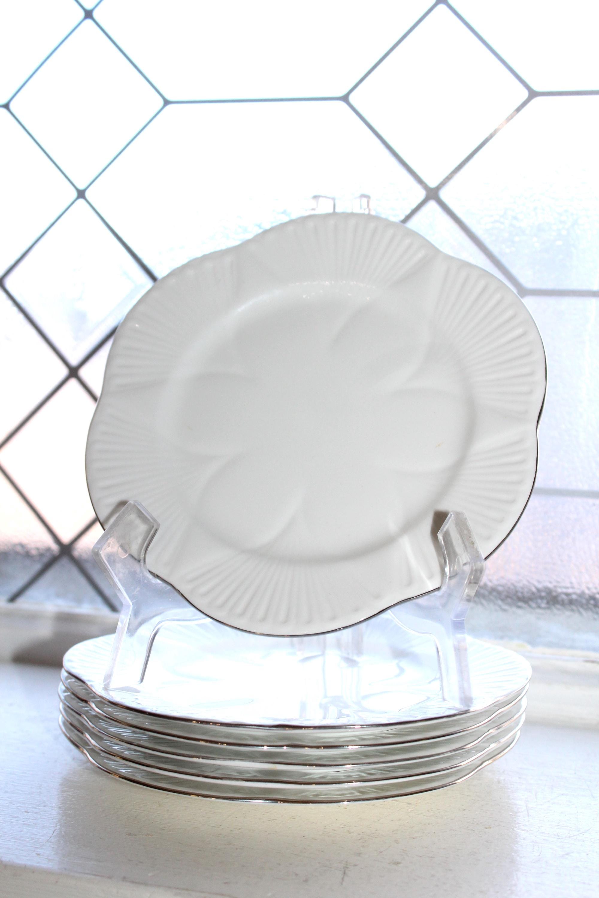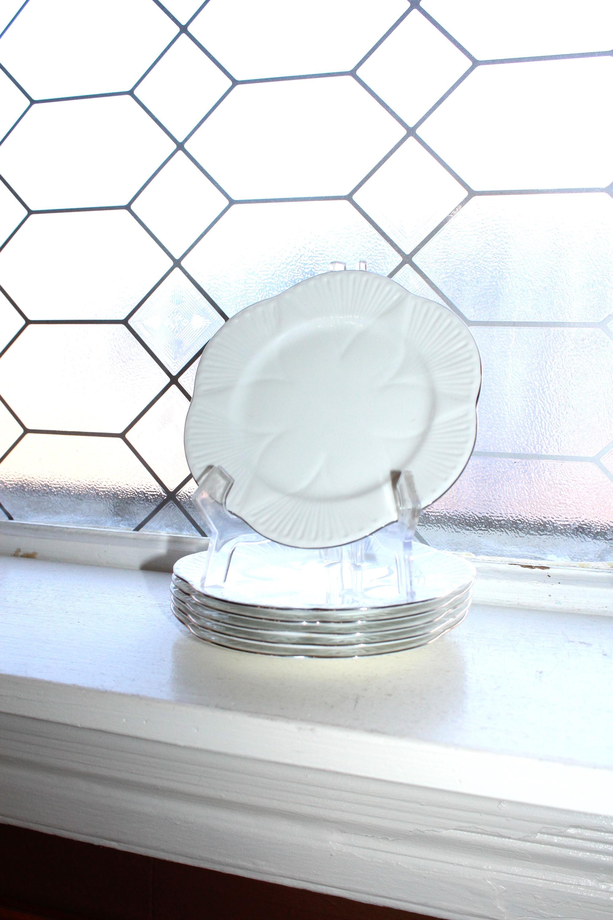 This is 6 vintage 1960s Shelley Claire De Lune bread plates, dainty white with platinum trim. Made in England, the plates measure 6" in diameter. They are in excellent condition with no chips or cracks. THERE ARE 2 SETS OF 6 AVAILABLE VIA THE DROP DOWN BOX. I also have several other pieces of this pattern available in separate listings. This pattern is similar to Shelley's Regency pattern, but with platinum trim instead of gold. Enjoy!
