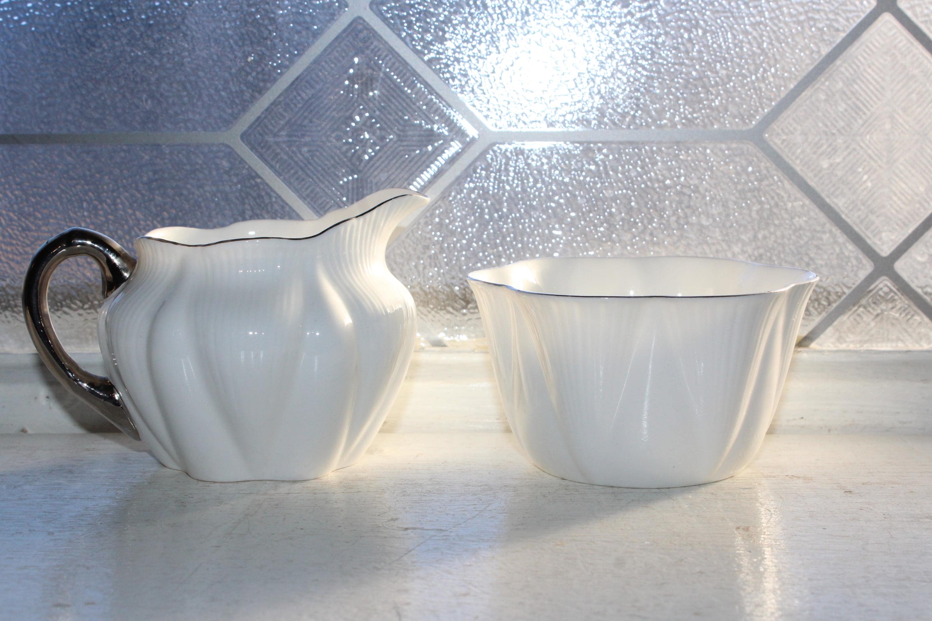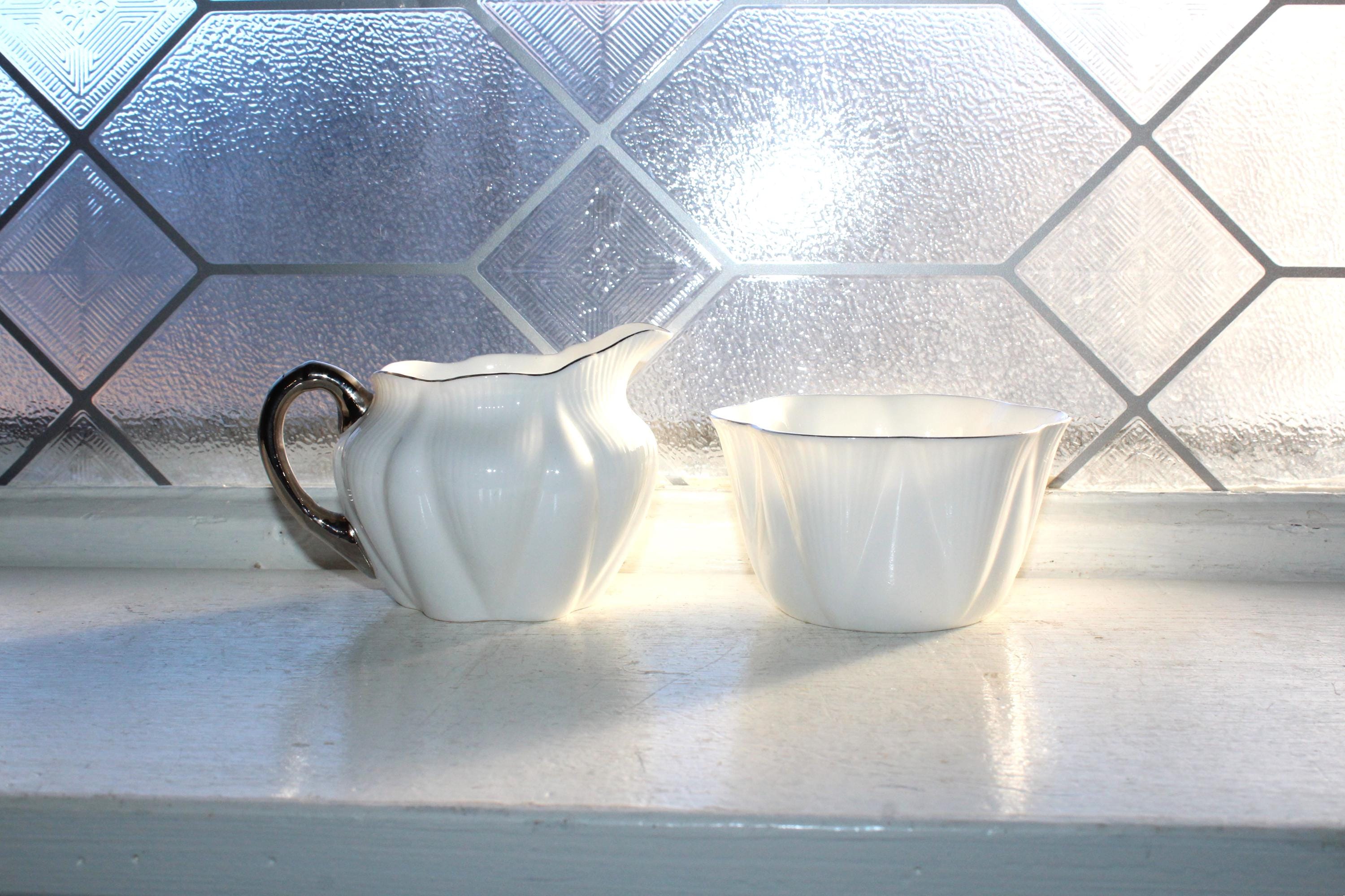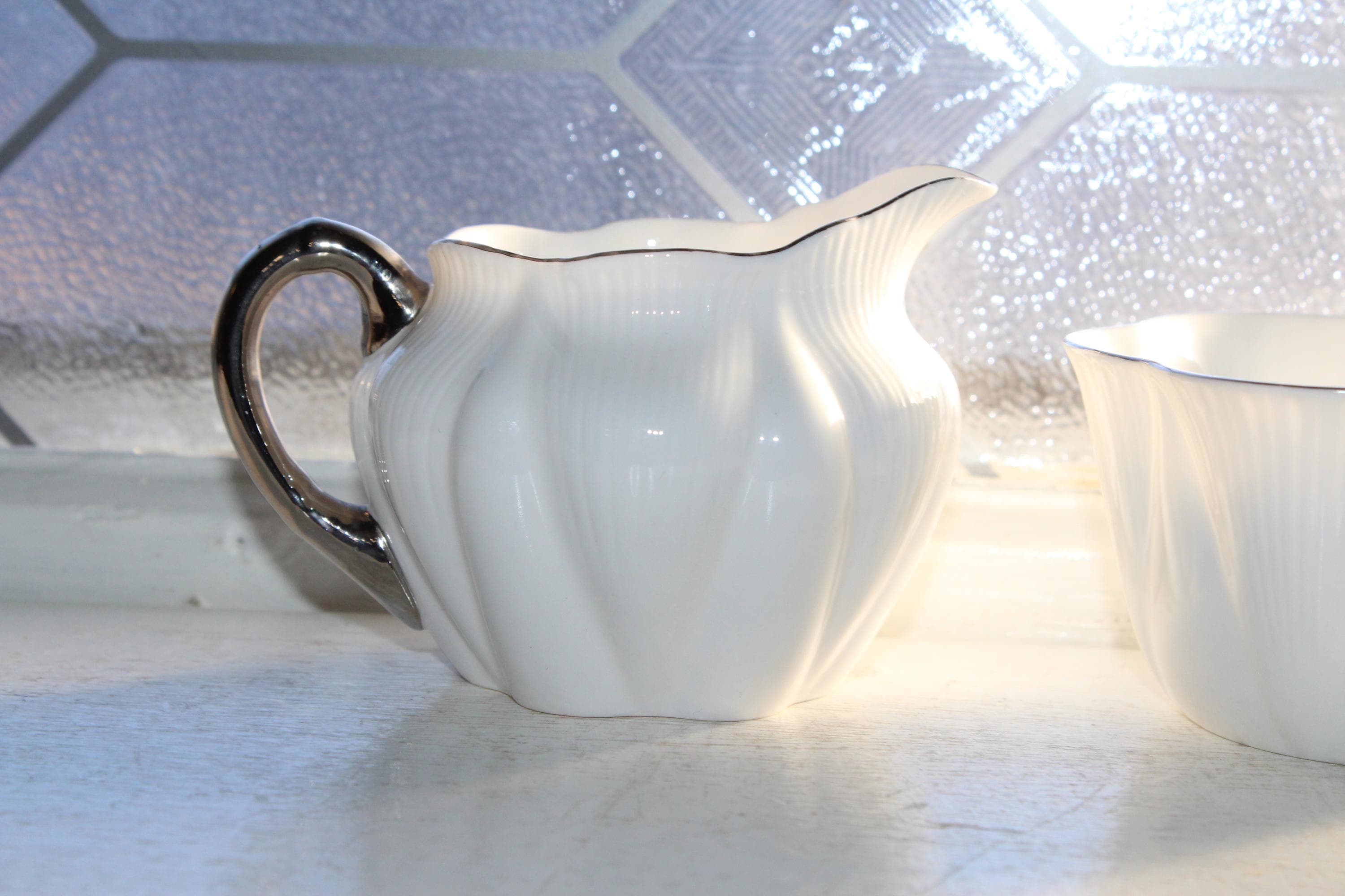 This is a vintage 1960s Shelley Claire De Lune creamer and sugar bowl set, dainty white with platinum trim. Made in England, the creamer measures 2 3/4" high. It is in excellent condition with no chips or cracks. I also have several other pieces of this pattern available in separate listings. This pattern is similar to Shelley's Regency pattern, but with platinum trim instead of gold. Enjoy!