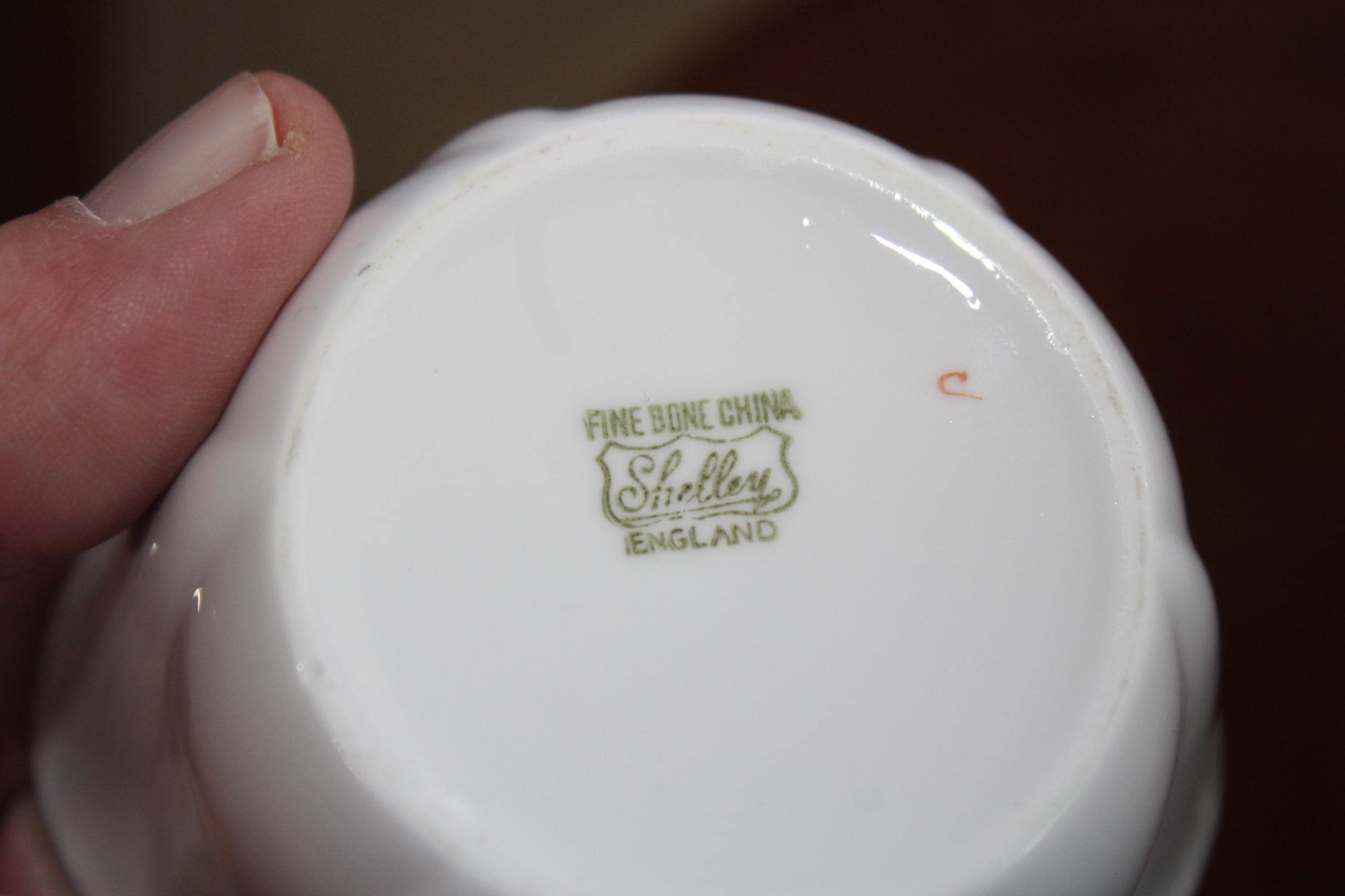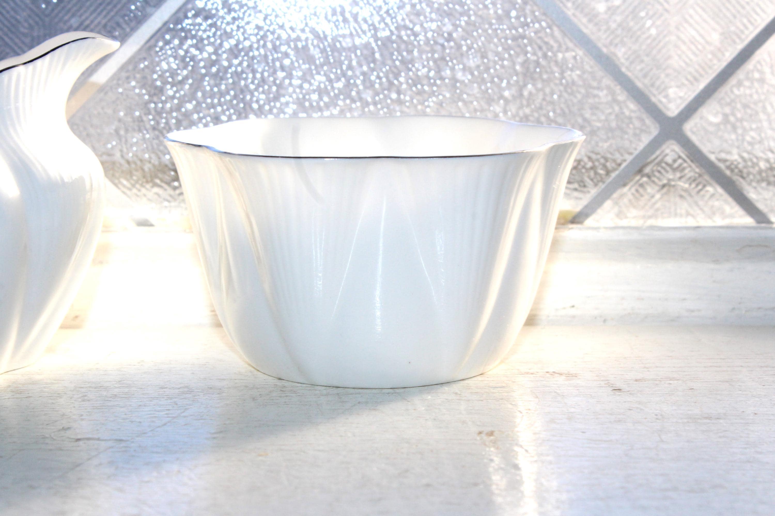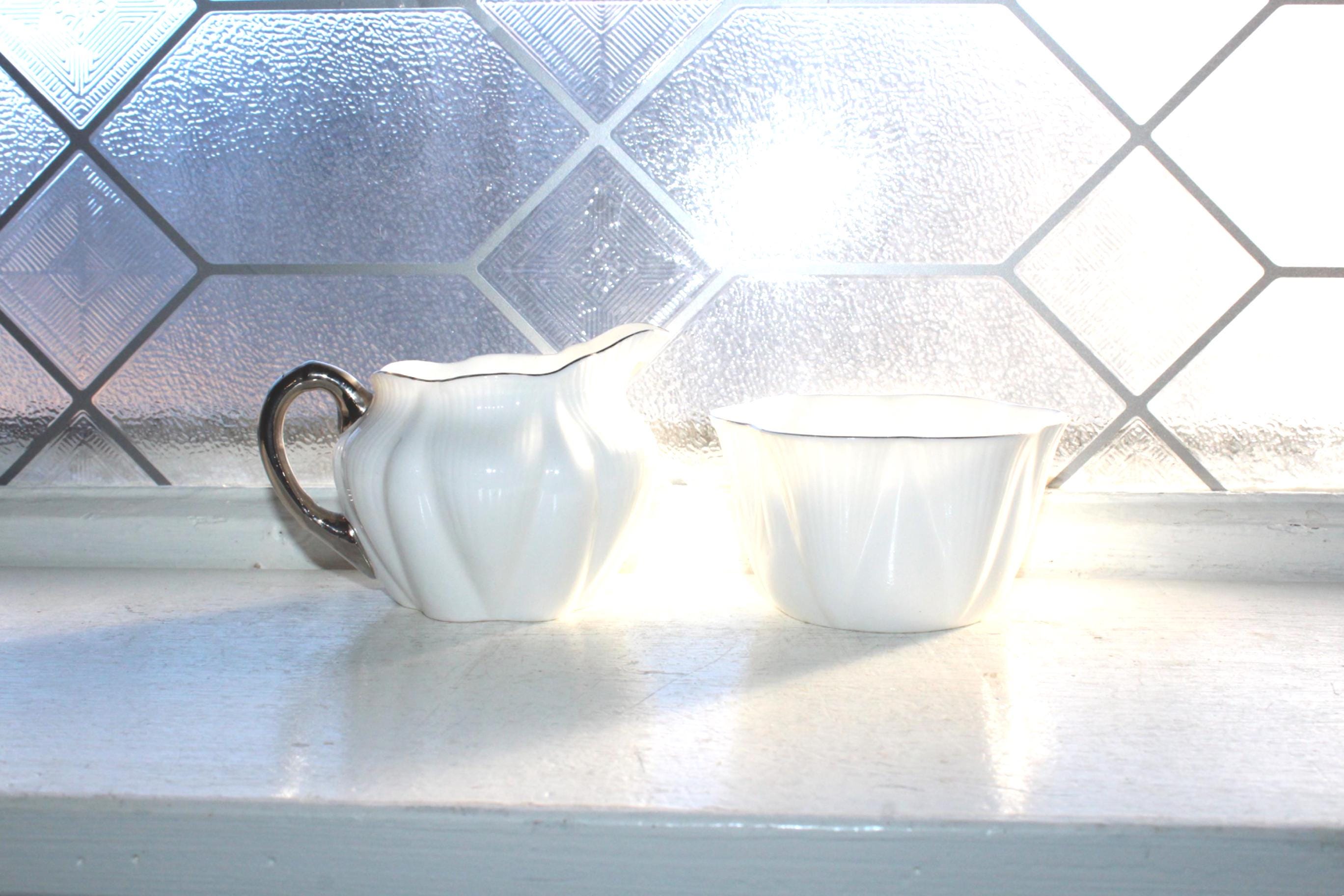 This is a vintage 1960s Shelley Claire De Lune creamer and sugar bowl set, dainty white with platinum trim. Made in England, the creamer measures 2 3/4" high. It is in excellent condition with no chips or cracks. I also have several other pieces of this pattern available in separate listings. This pattern is similar to Shelley's Regency pattern, but with platinum trim instead of gold. Enjoy!