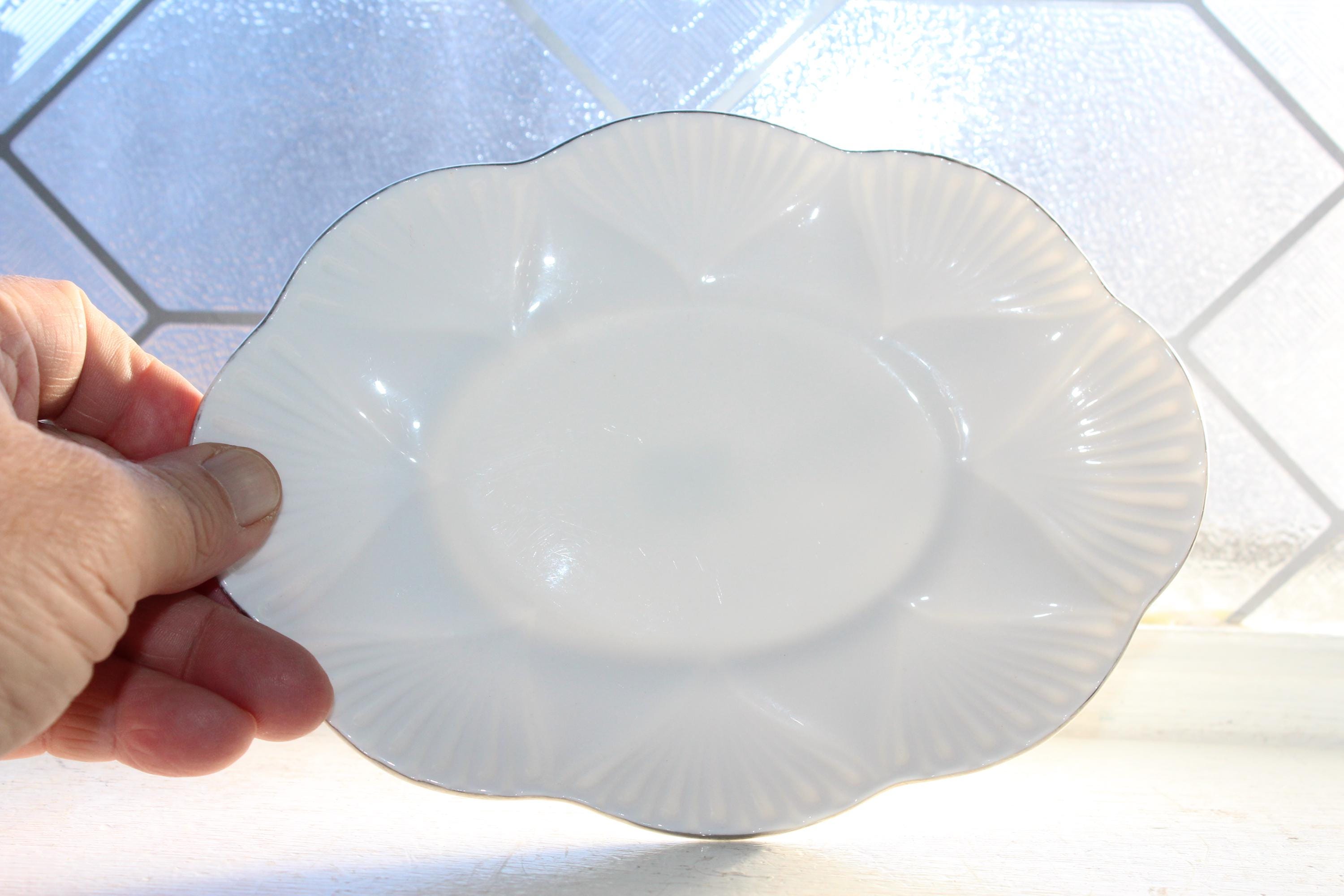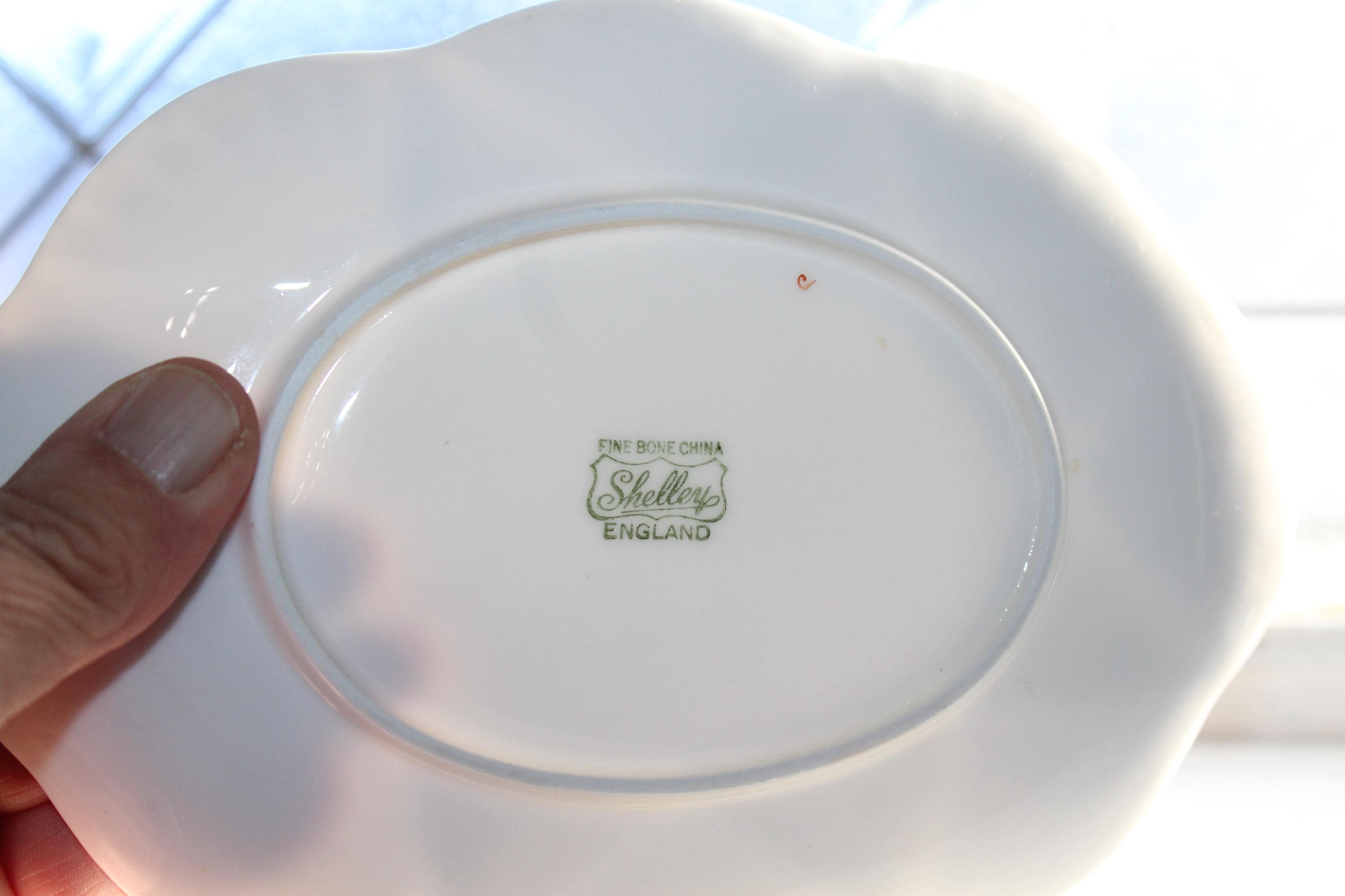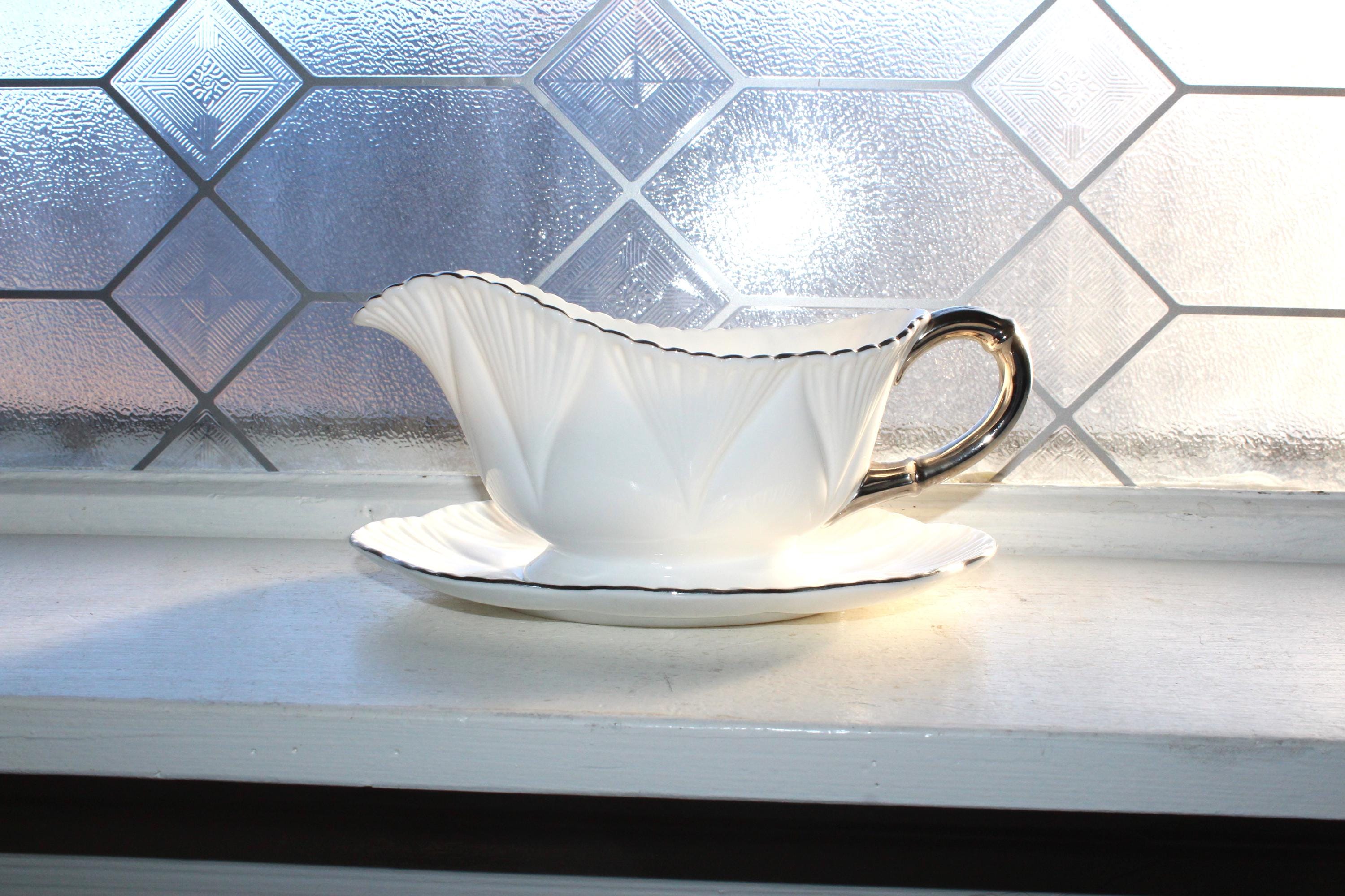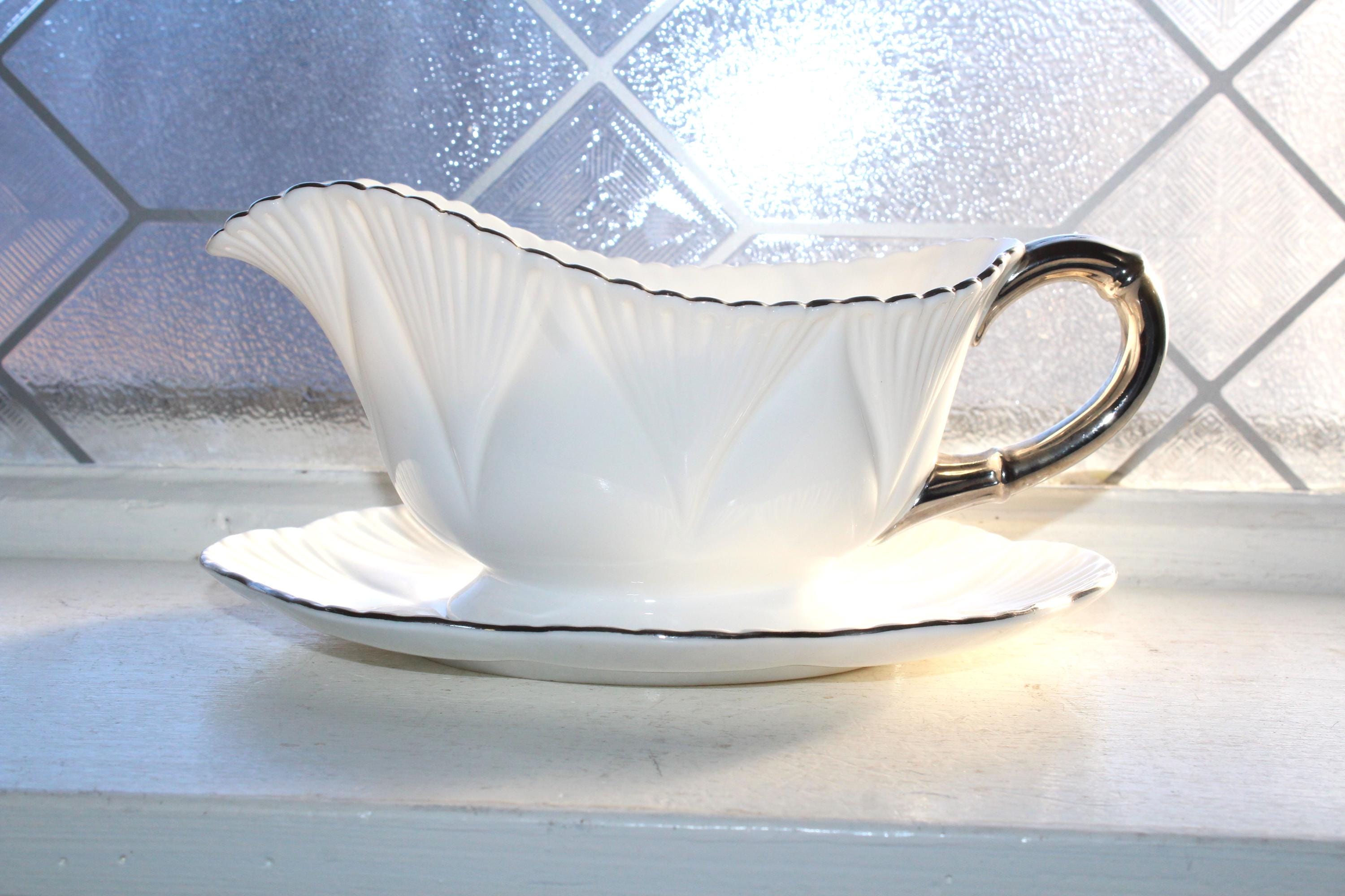 This is a vintage 1960s Shelley Claire De Lune gravy boat with underplate, dainty white with platinum trim. Made in England, it measures 8" long. It is in excellent condition with no chips or cracks. I also have several other pieces of this pattern available in separate listings. This pattern is similar to Shelley's Regency pattern, but with platinum trim instead of gold. Enjoy!