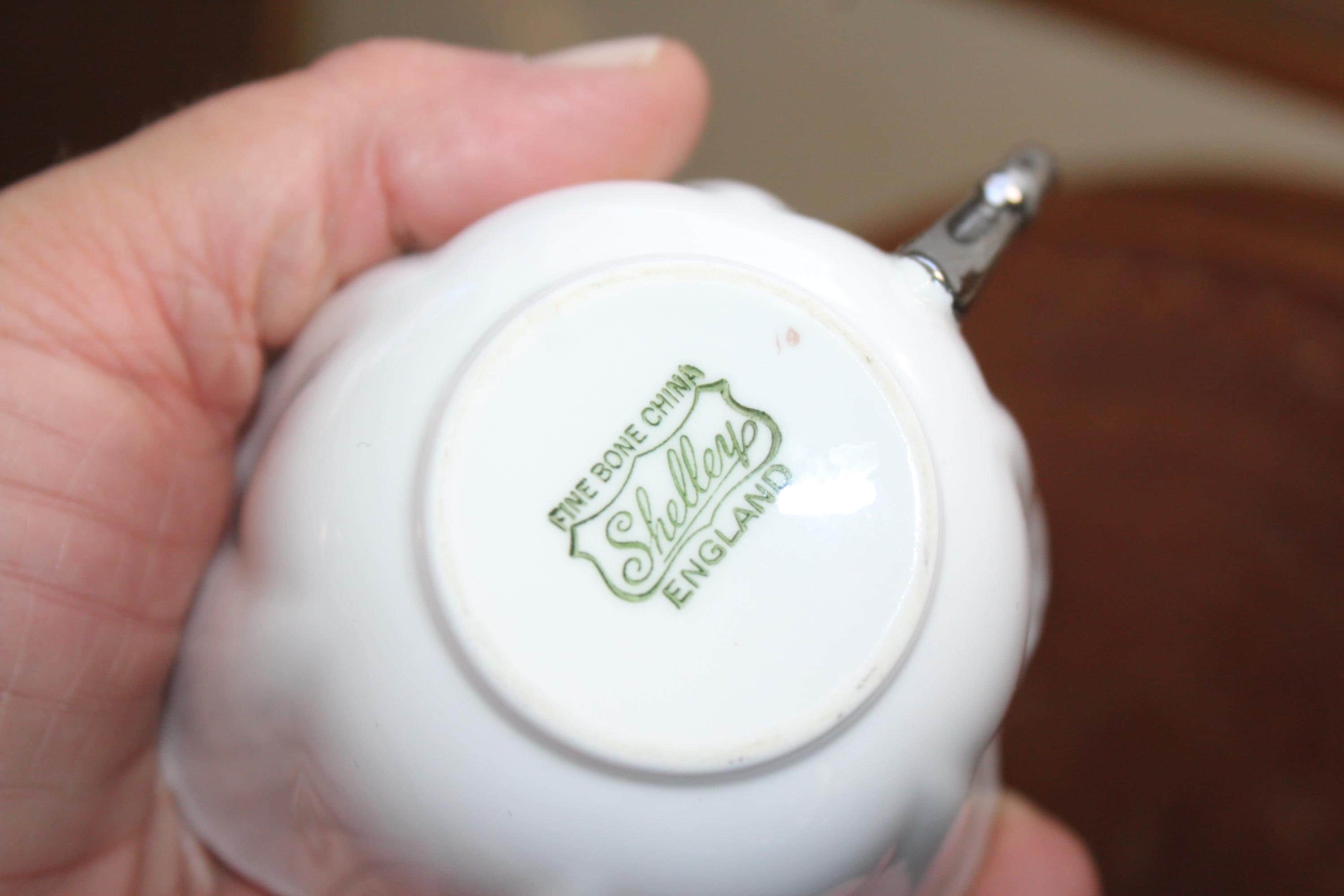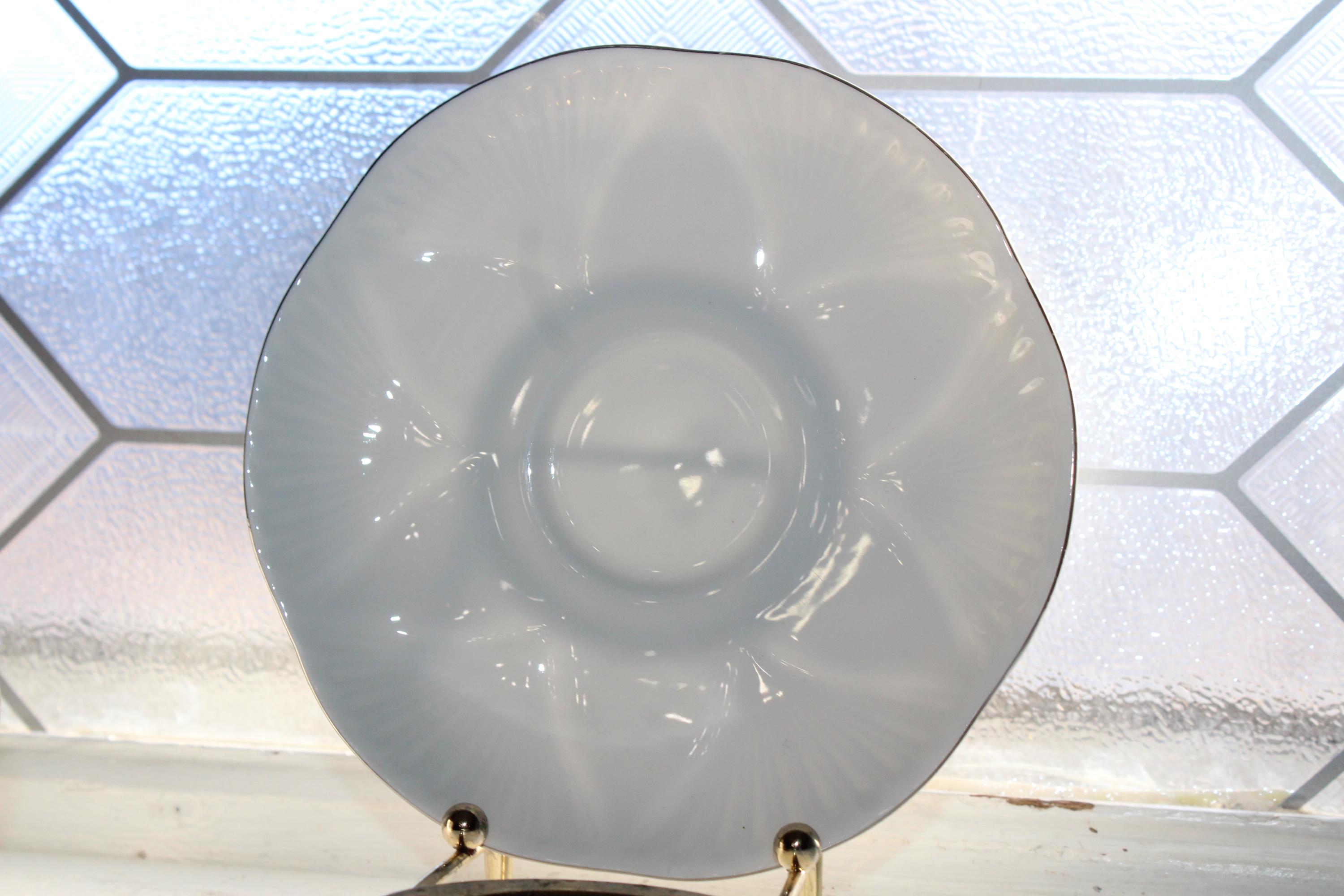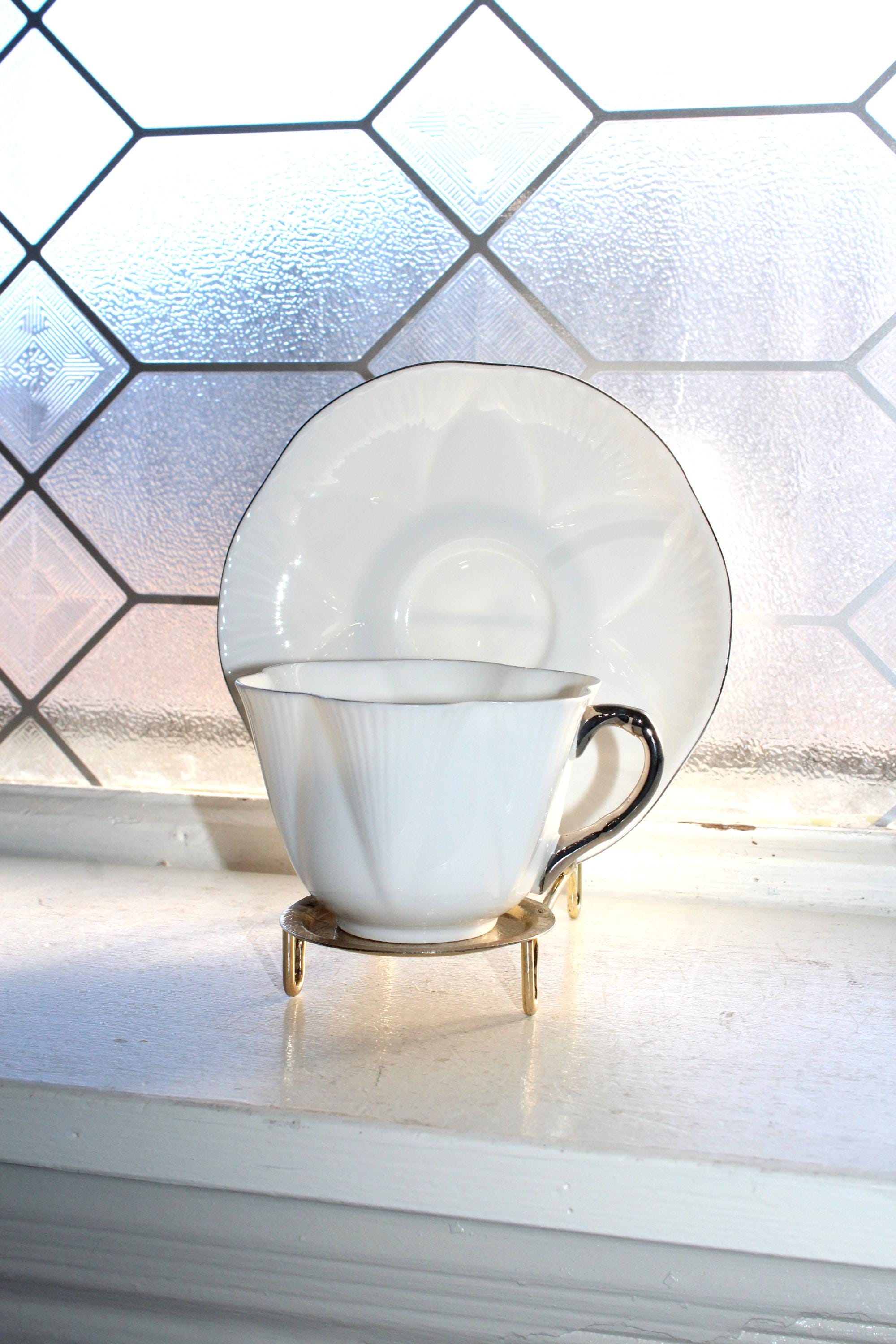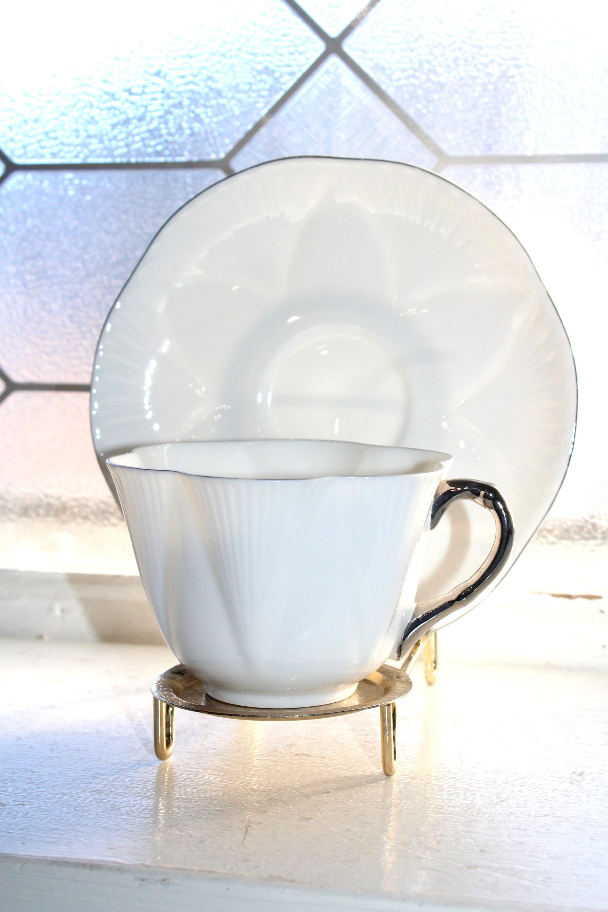 This is a vintage 1960s Shelley Claire De Lune cup and saucer, dainty white with platinum trim. Made in England, the cup measures 2 1/2" high and the saucer measures 5 3/4" wide. It is in excellent condition with no chips or cracks. I also have several other pieces of this pattern available in separate listings. This pattern is similar to Shelley's Regency pattern, but with platinum trim instead of gold. Enjoy!