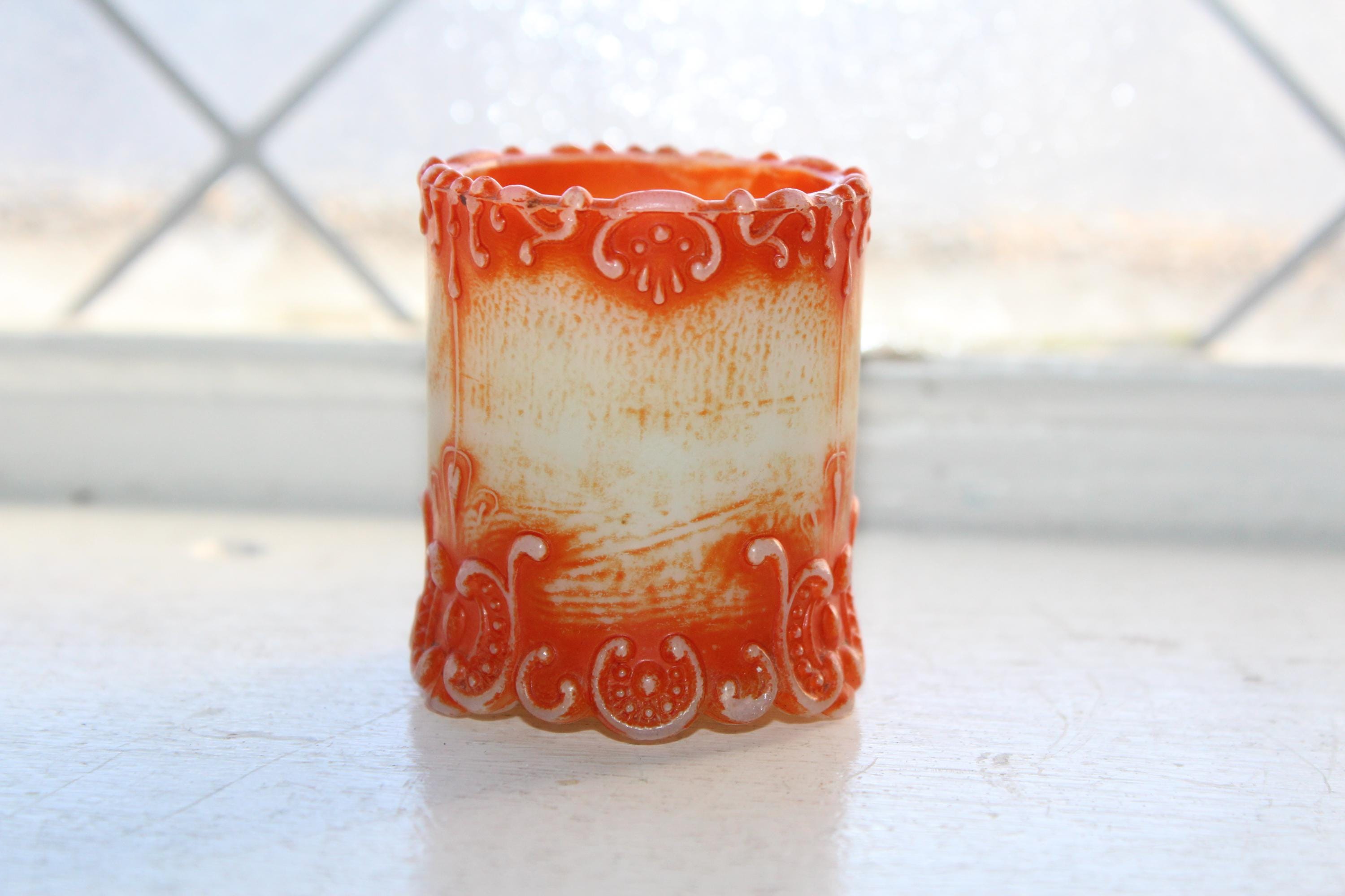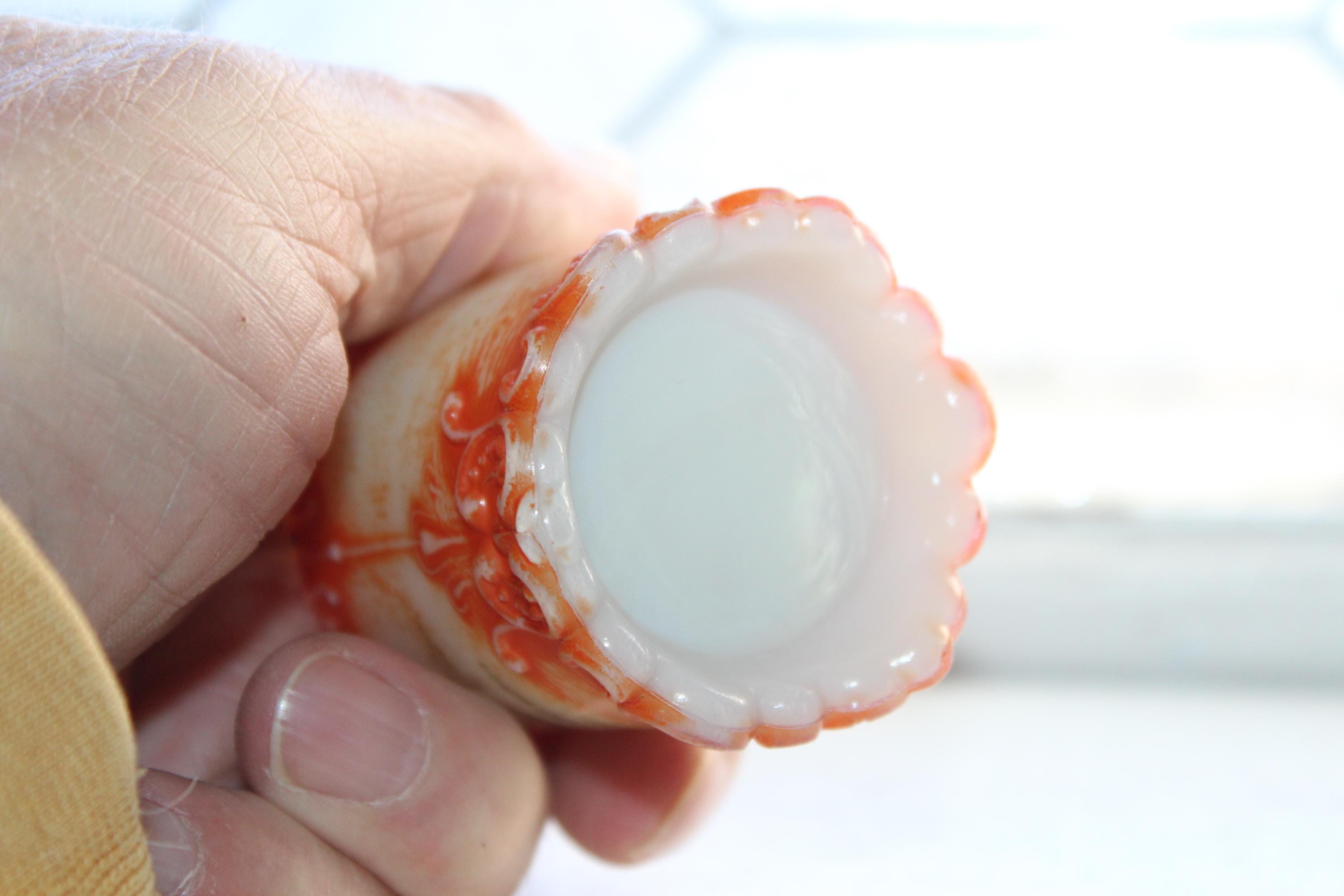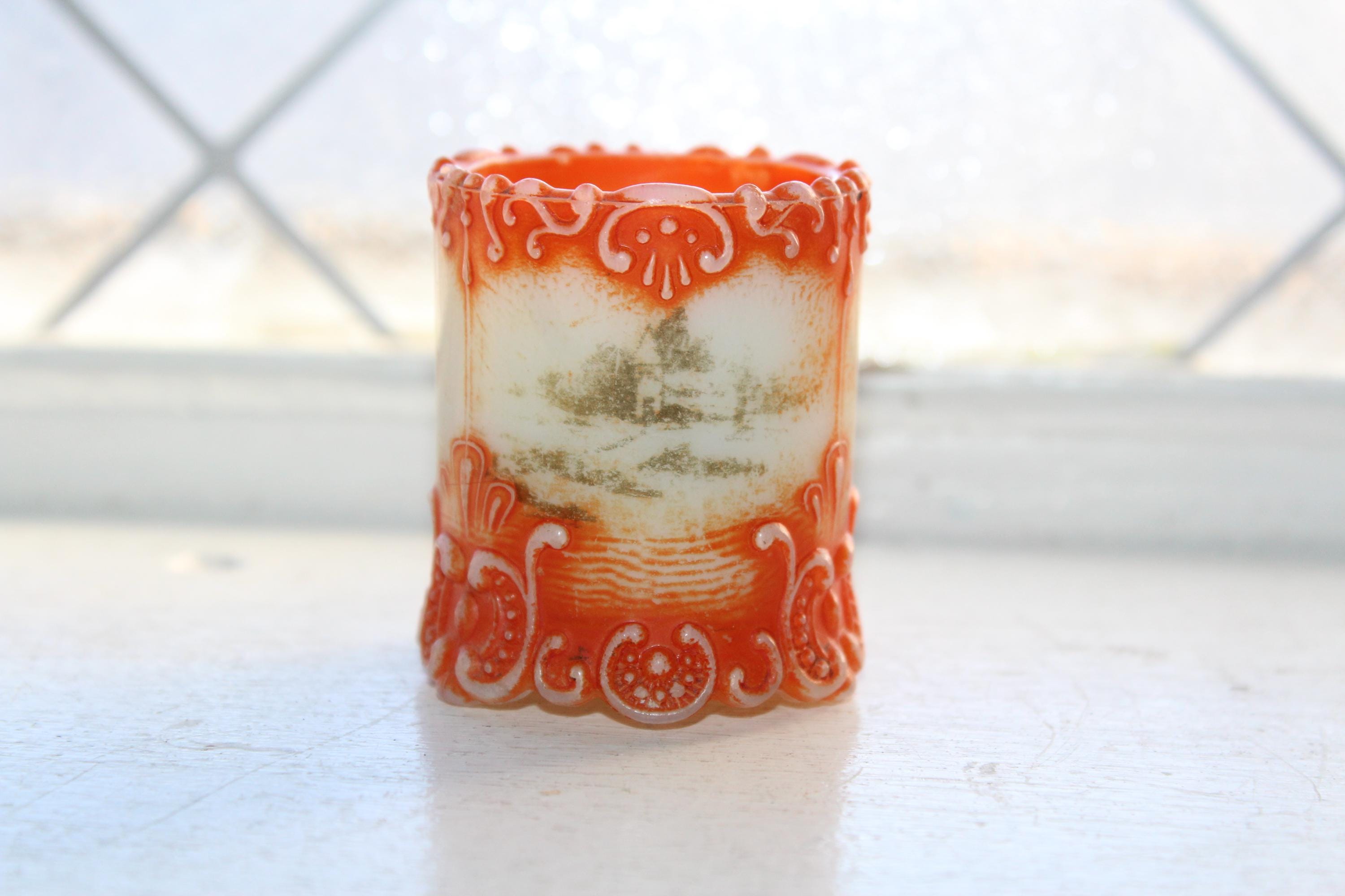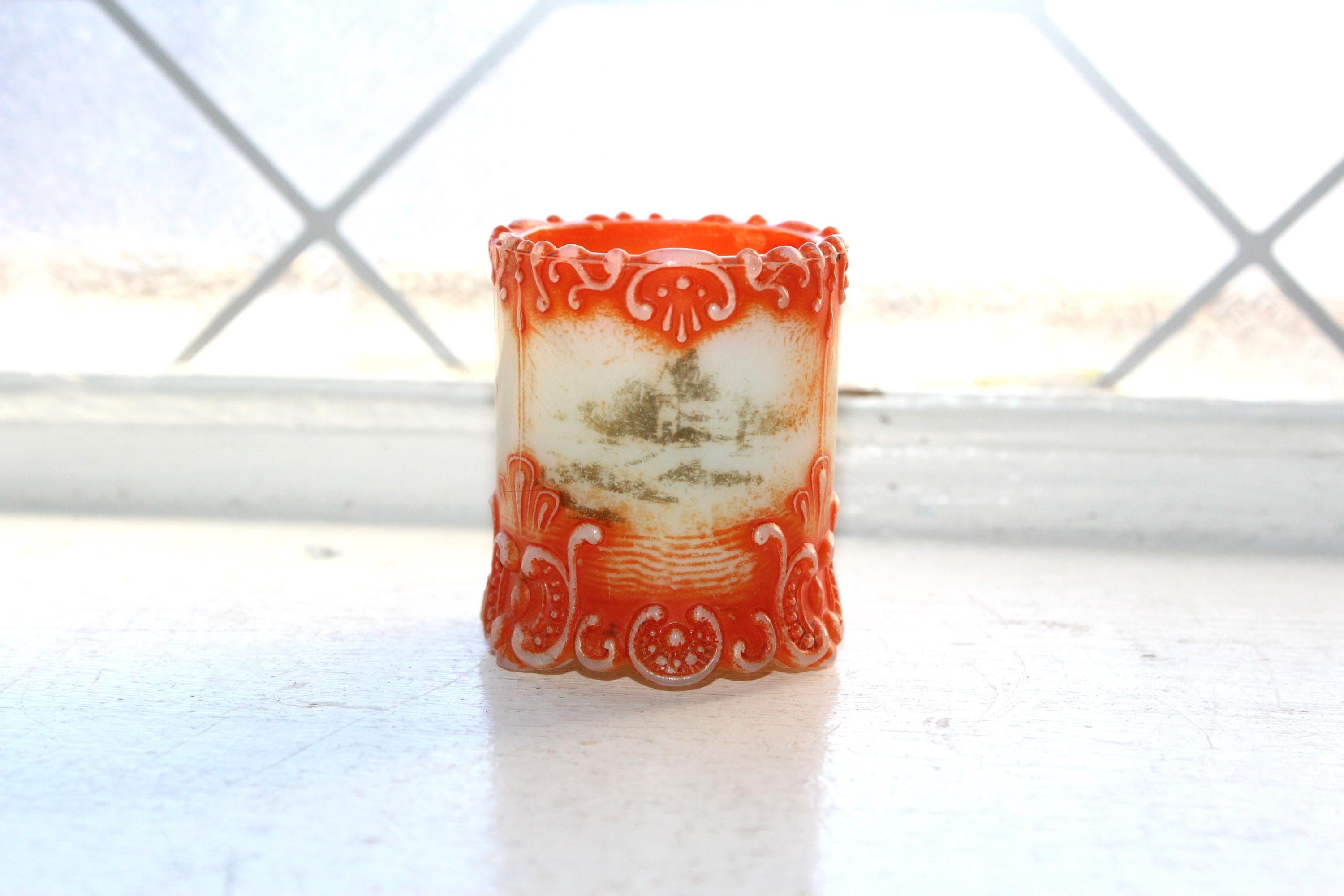 Antique EAPG Westmoreland Simplicity Scroll milk glass toothpick holder with orange and scenic decoration, in fairly good condition. It measures 2 1/8" high and shows wear to the paint, along with a small base rim chip that's not very noticeable due to the decoration. Great for use or display. Enjoy!