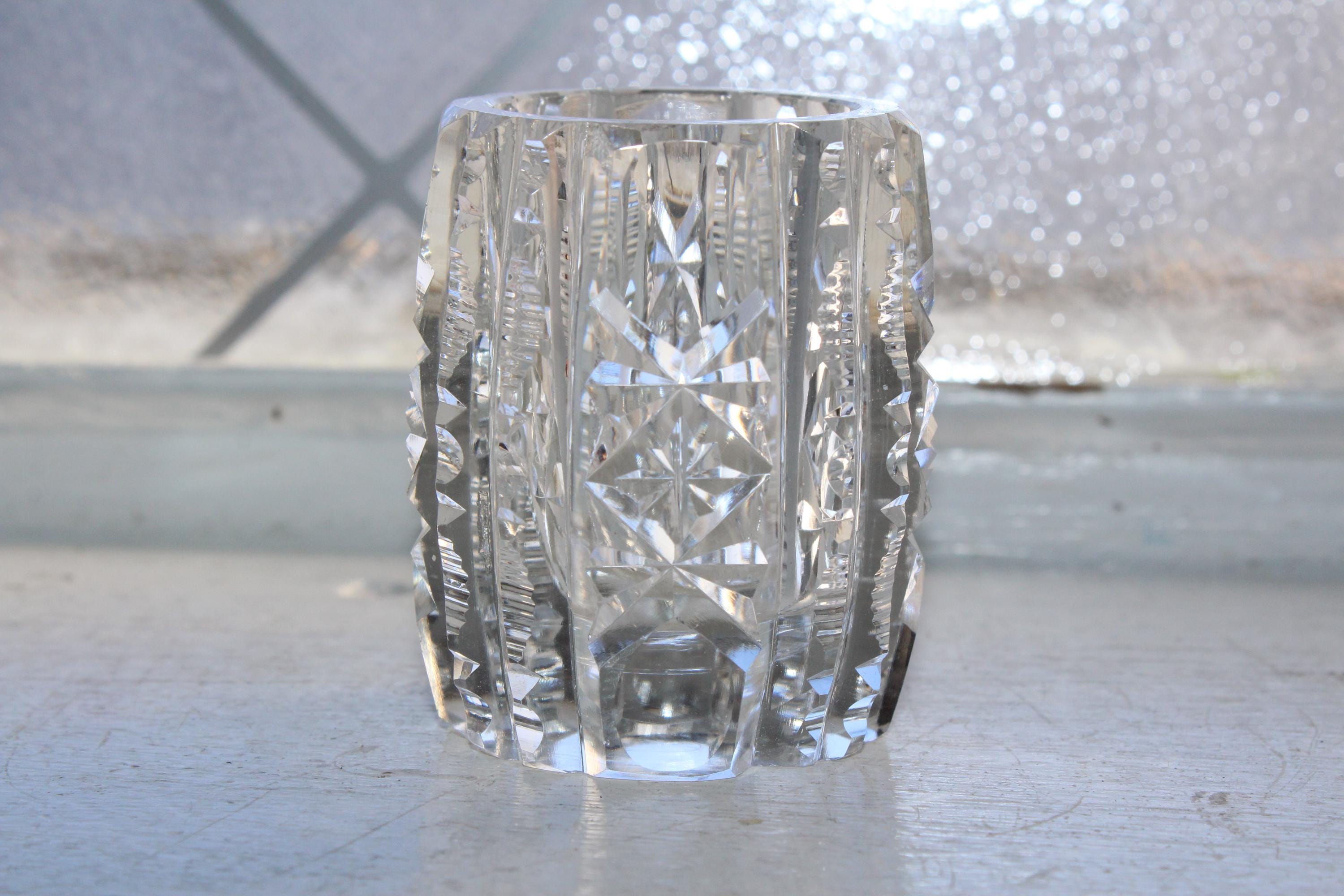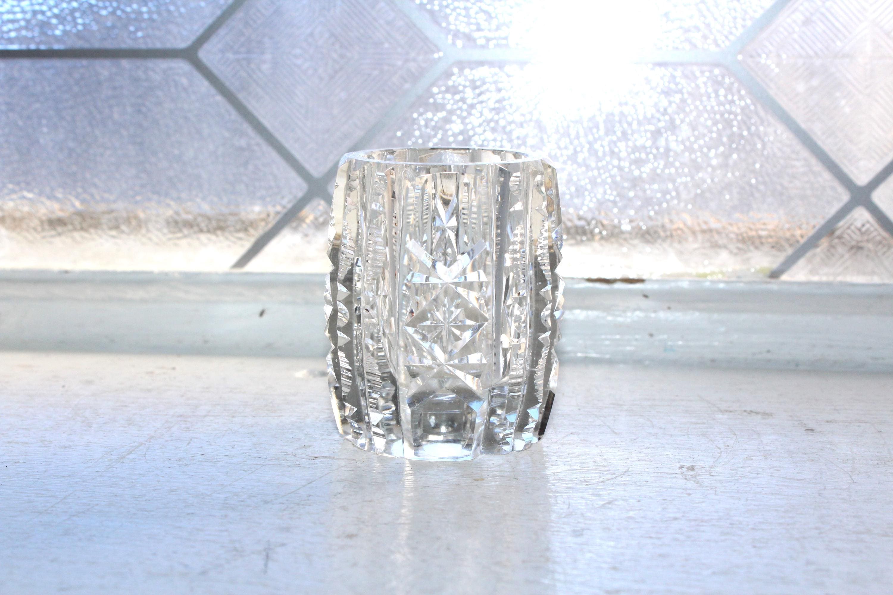 Vintage American Brilliant Period cut crystal toothpick holder with starburst and diamond pattern, in excellent condition. It measures 2 1/2" high and has no chips or cracks, perfect for use or display. Enjoy!