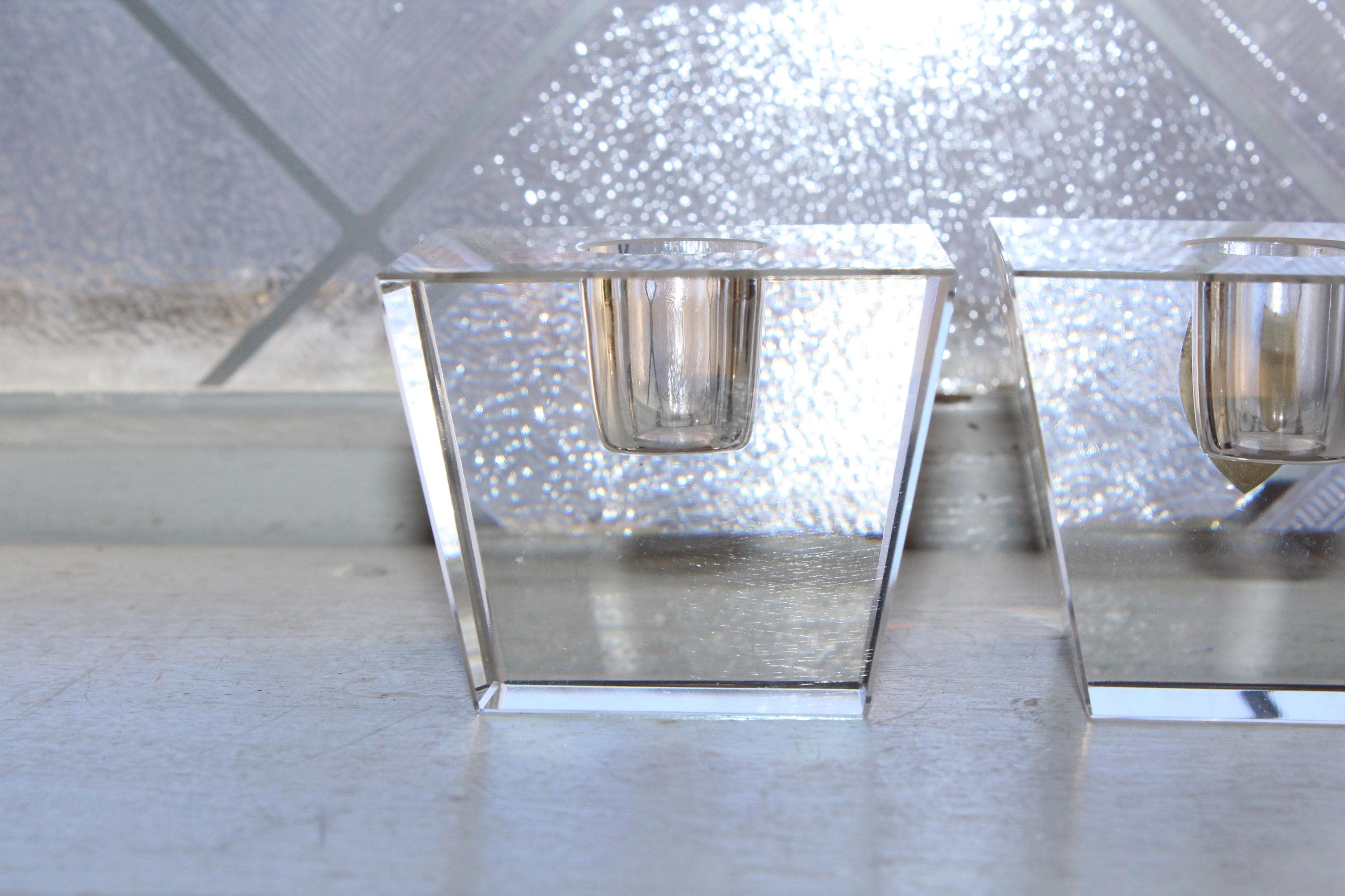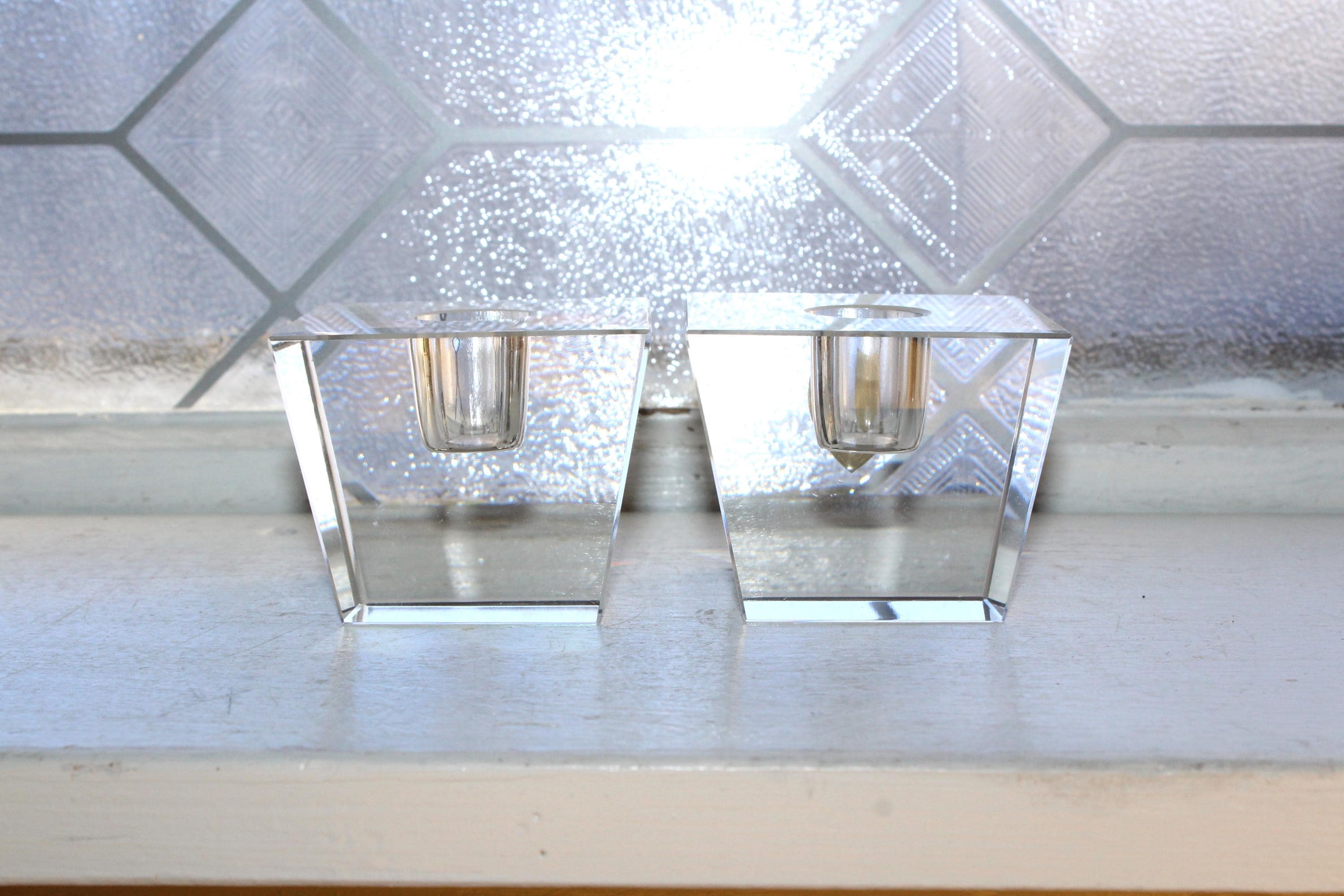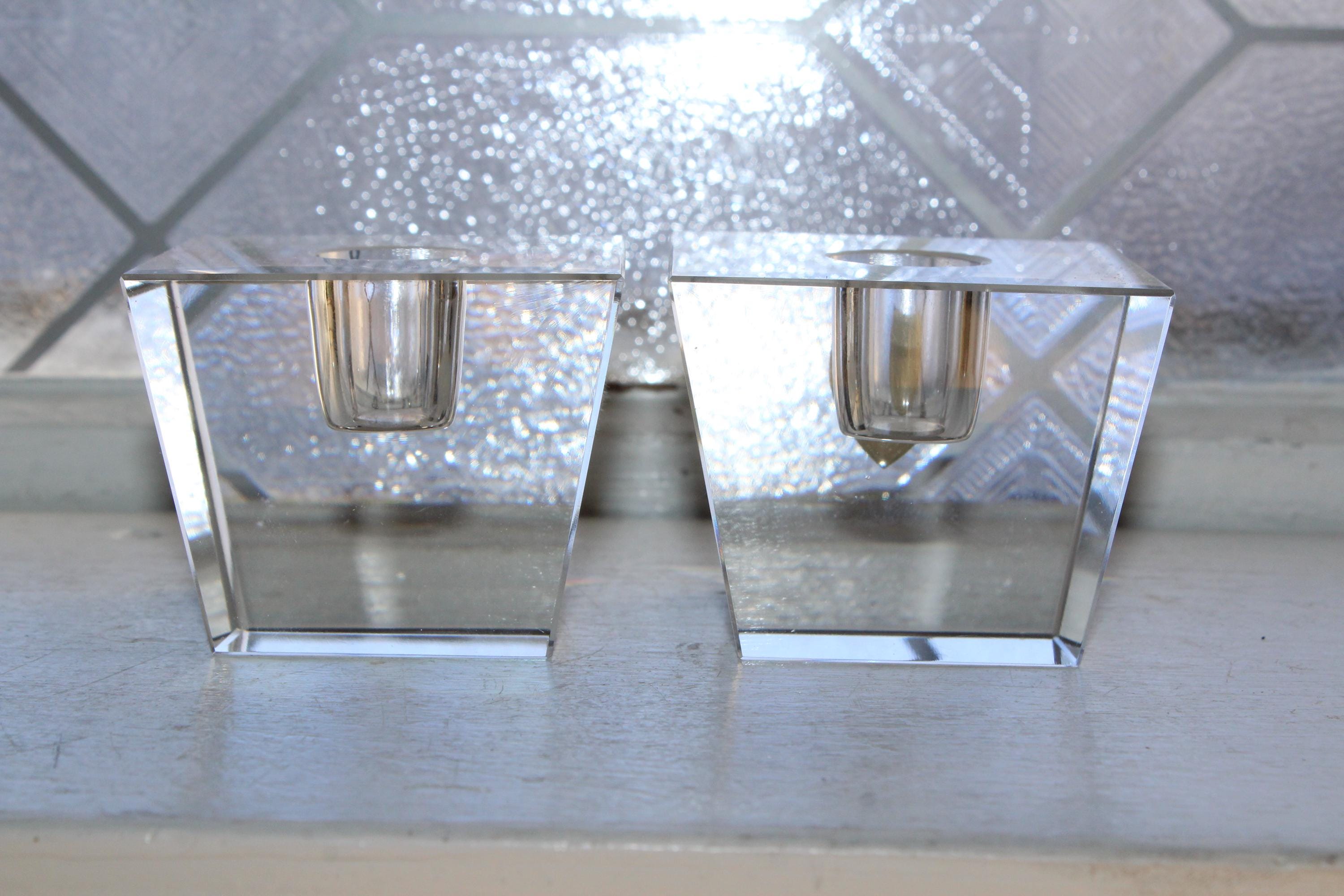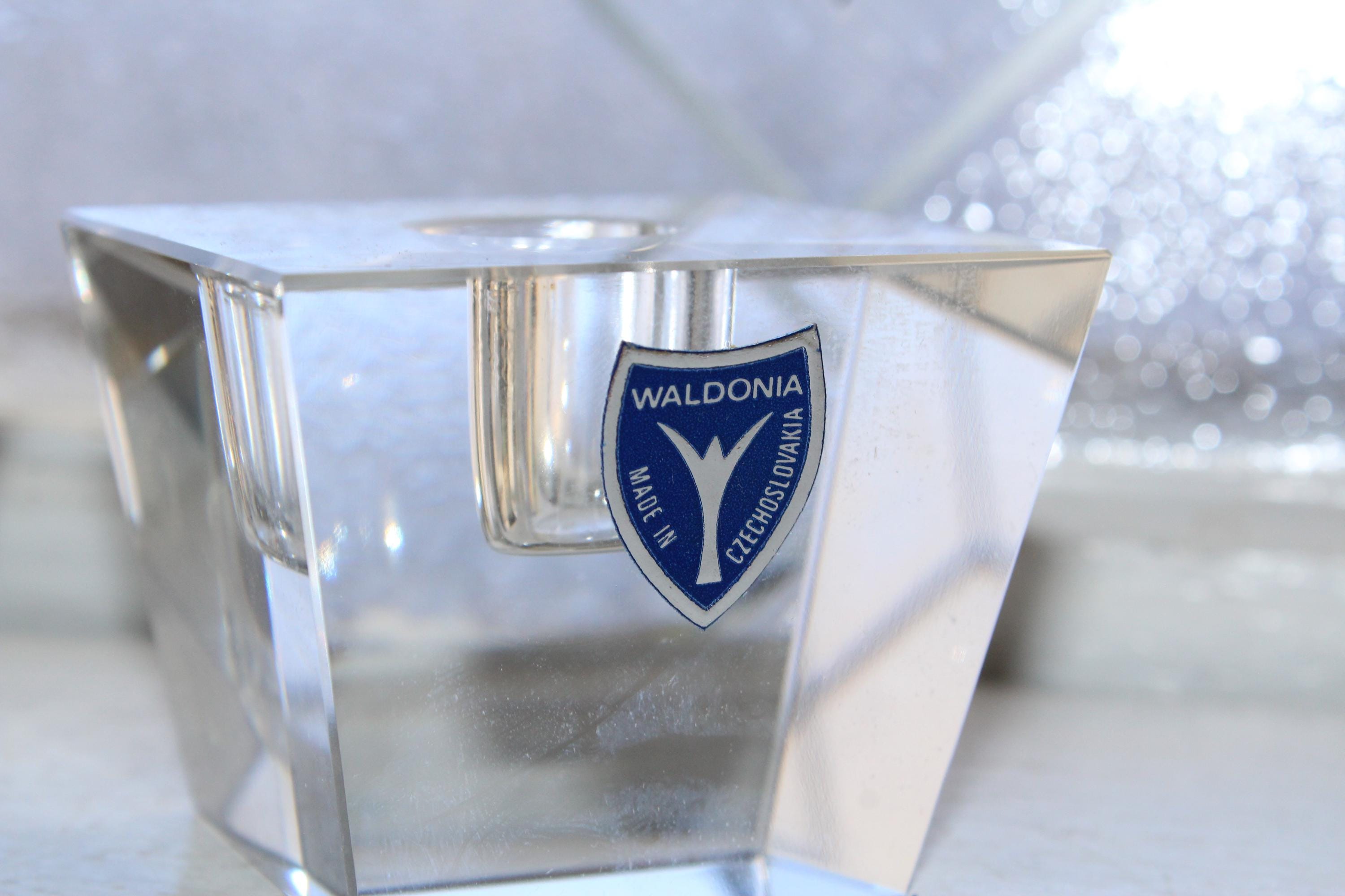 Vintage Art Deco Waldonia Czechoslovakia heavy crystal square candle holders pair, in excellent condition and beautiful. Each one measures 2 1/2" wide x 2" high and the hole measures 7/8" wide. These beauties make a perfect gift or addition to a collection. Enjoy!