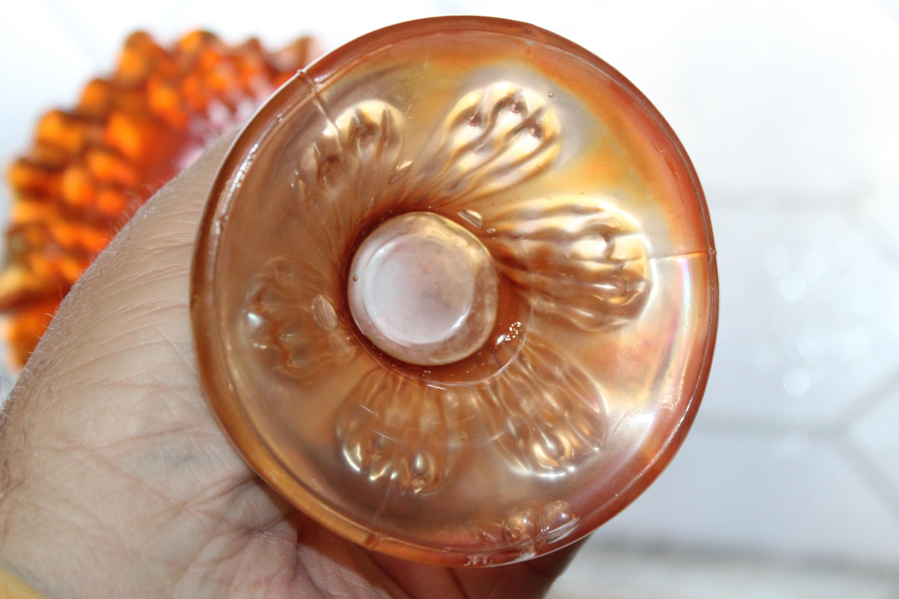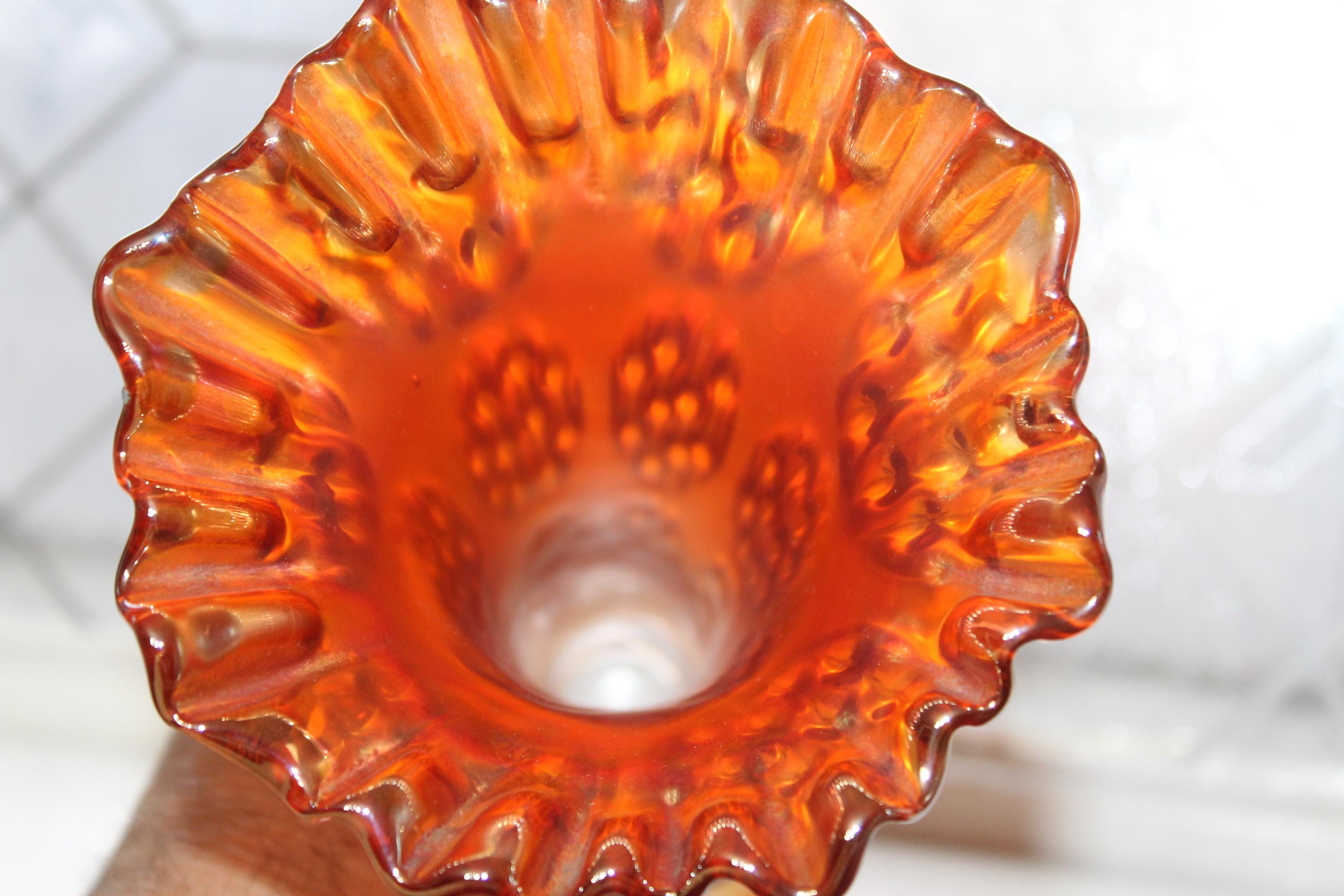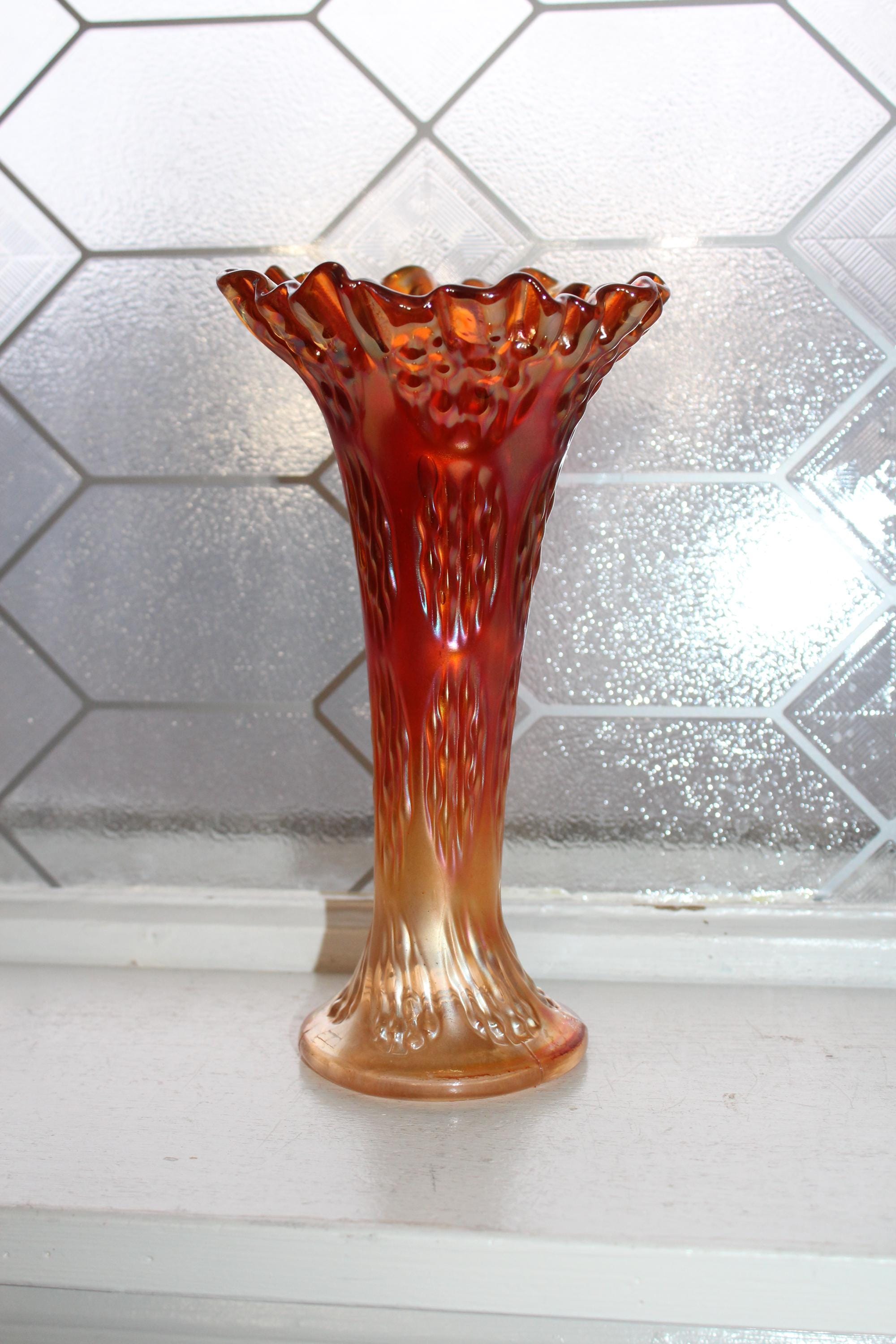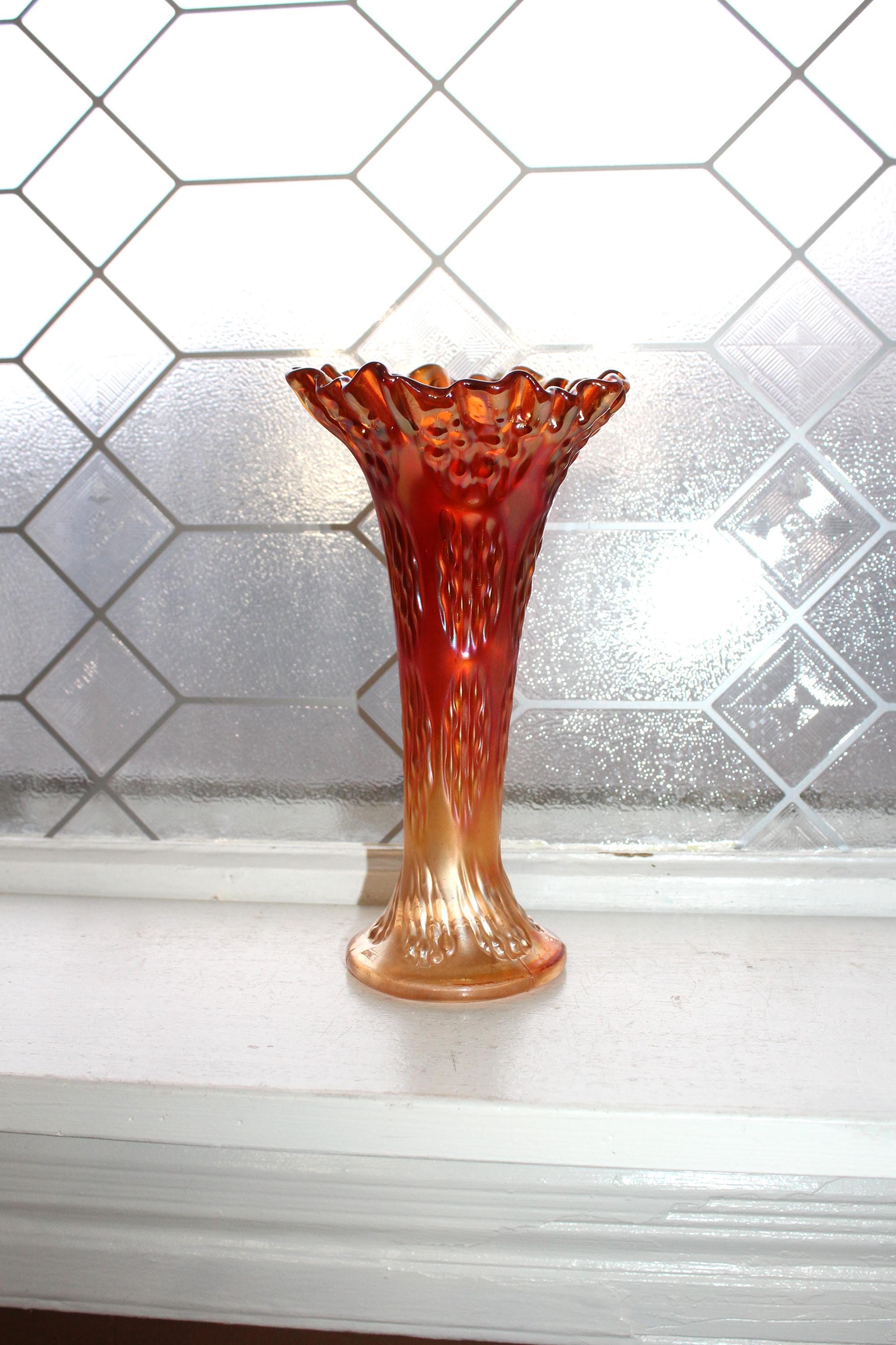 This is a gorgeous antique 1910s Fenton carnival swung glass vase in the Knotted Beads pattern, in excellent condition with no chips or cracks. The vase measures 8 1/2" high and is marigold colored. Perfect for use or display. Enjoy!