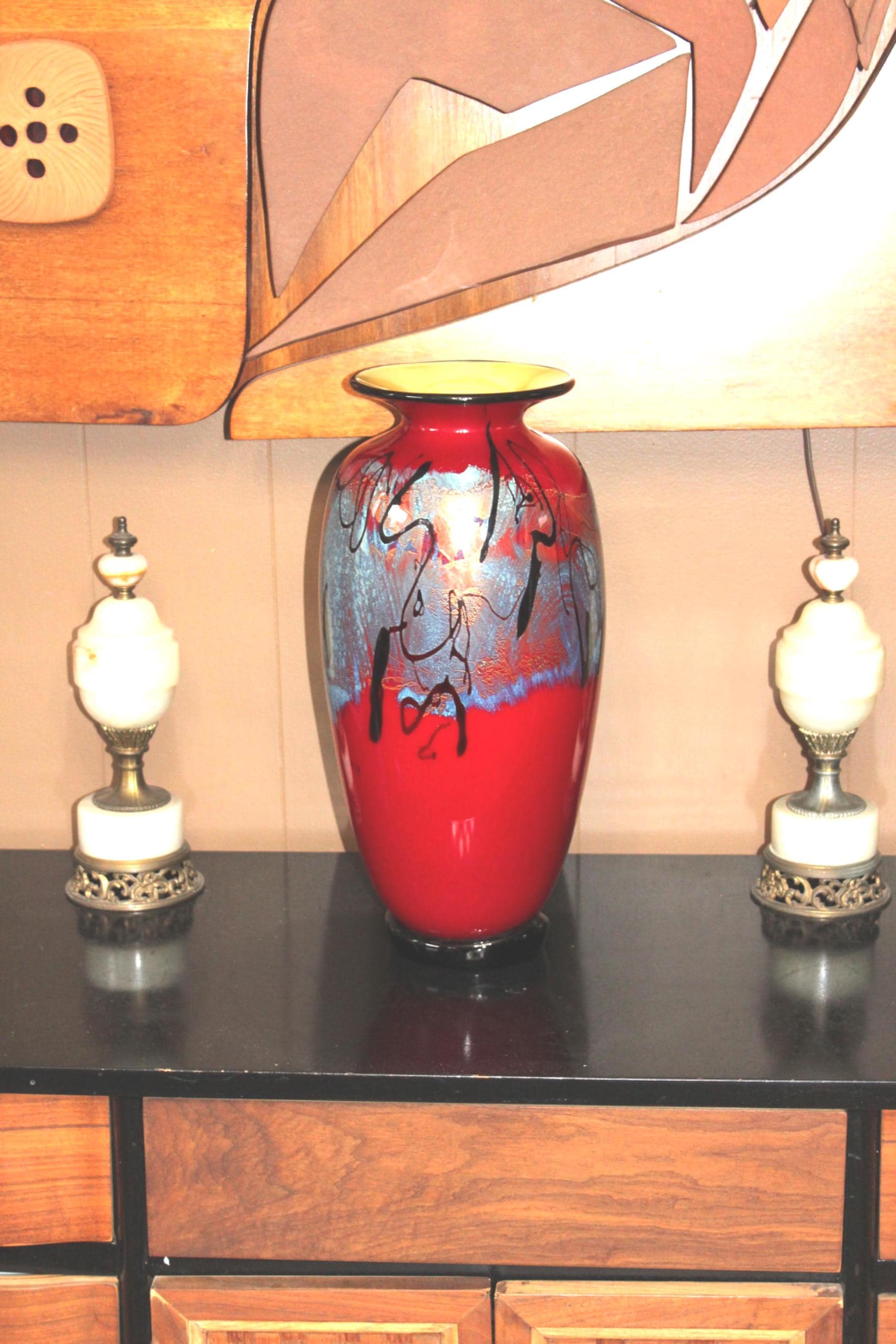 This extra large Michael Nourot and Johnny Camp studio art glass vase really makes a grand statement! It measures 17" high and is part of his Red Satin series. Nourot Art Glass has been known for unique red glass for decades. The Red Satin pattern is a classic example of their perfection of the material, with silver and 24K gold leaf on the surface layer. No chips or cracks, perfect for use or display in a mid century or modern home. Signed on the underside, circa 2001. Enjoy!