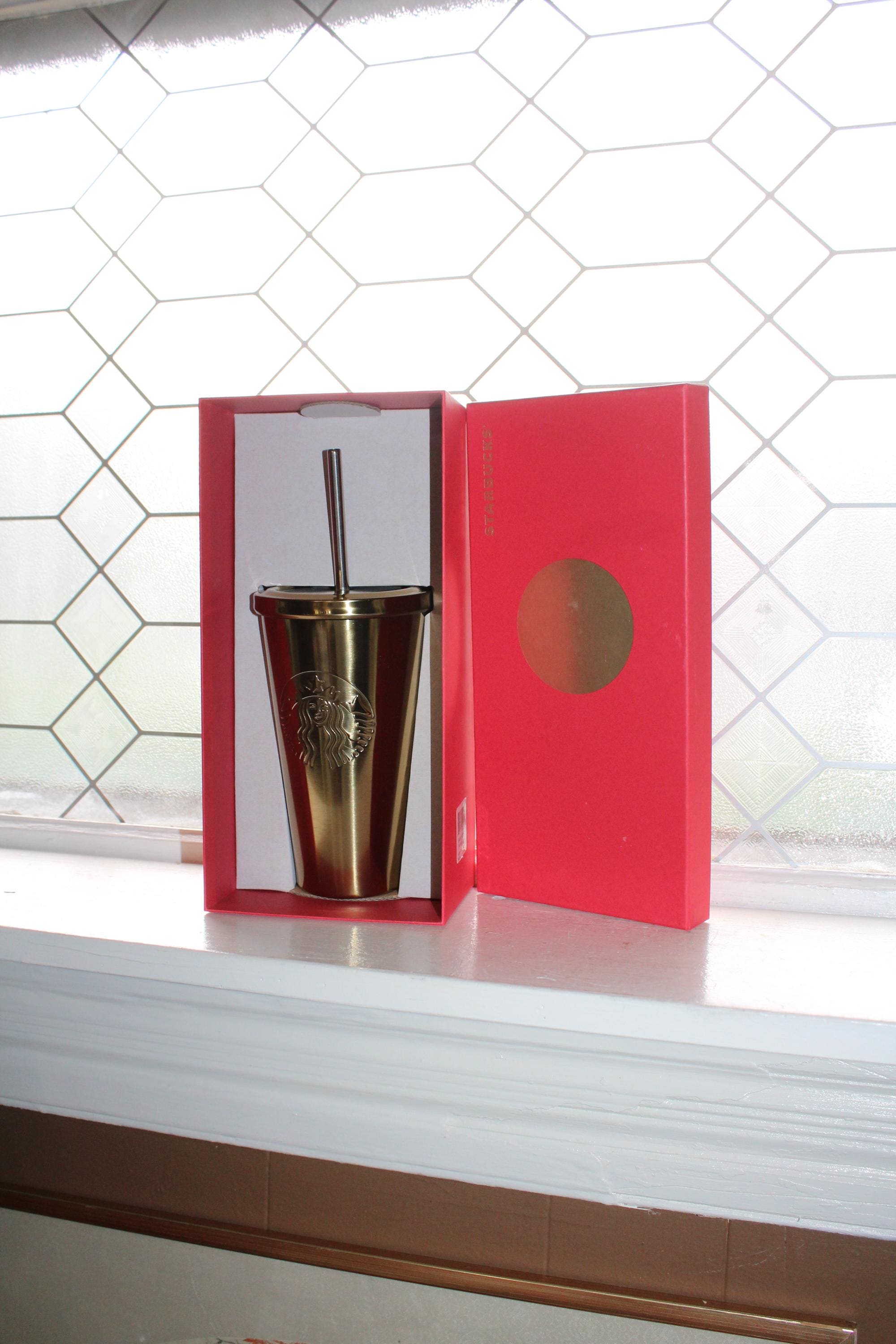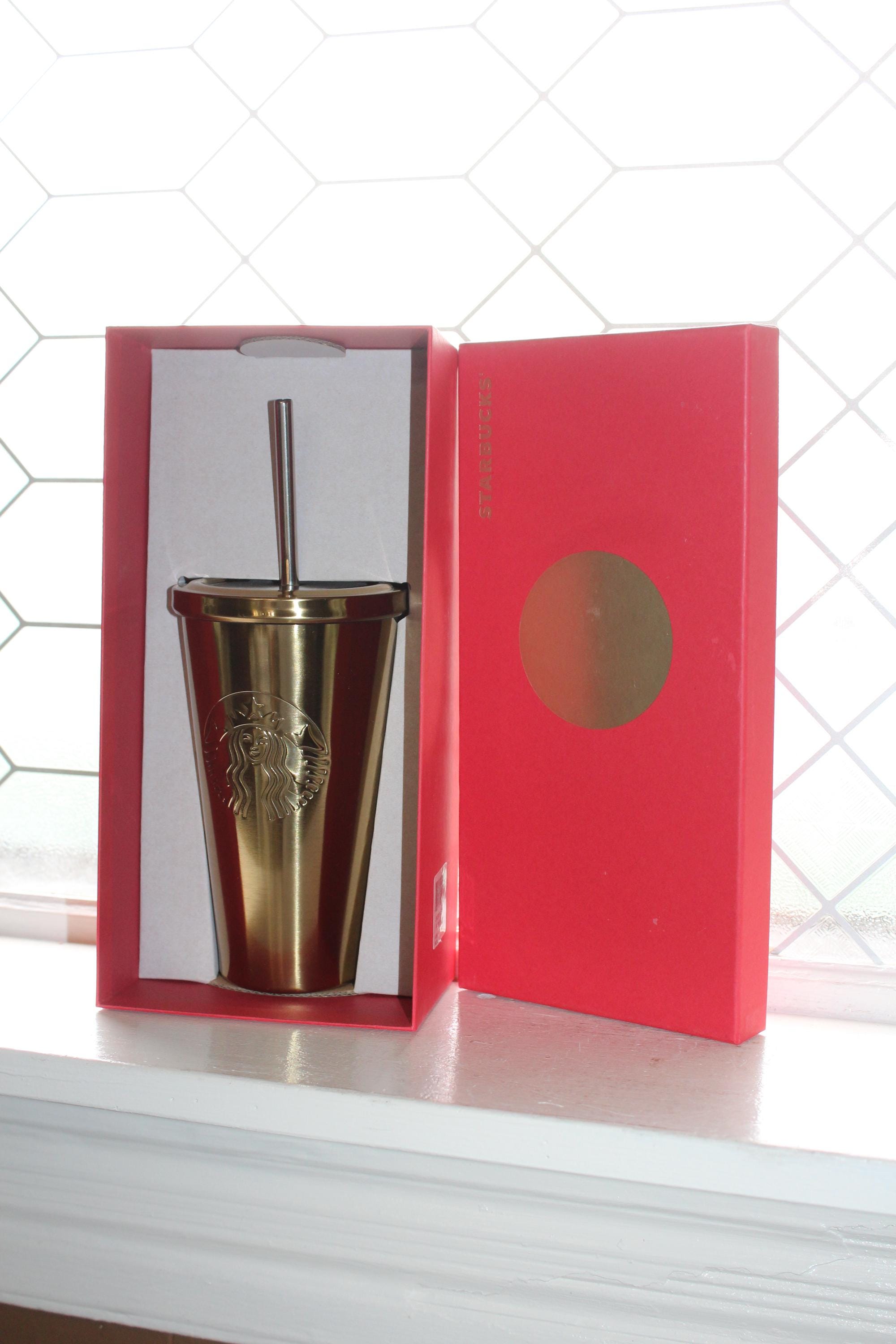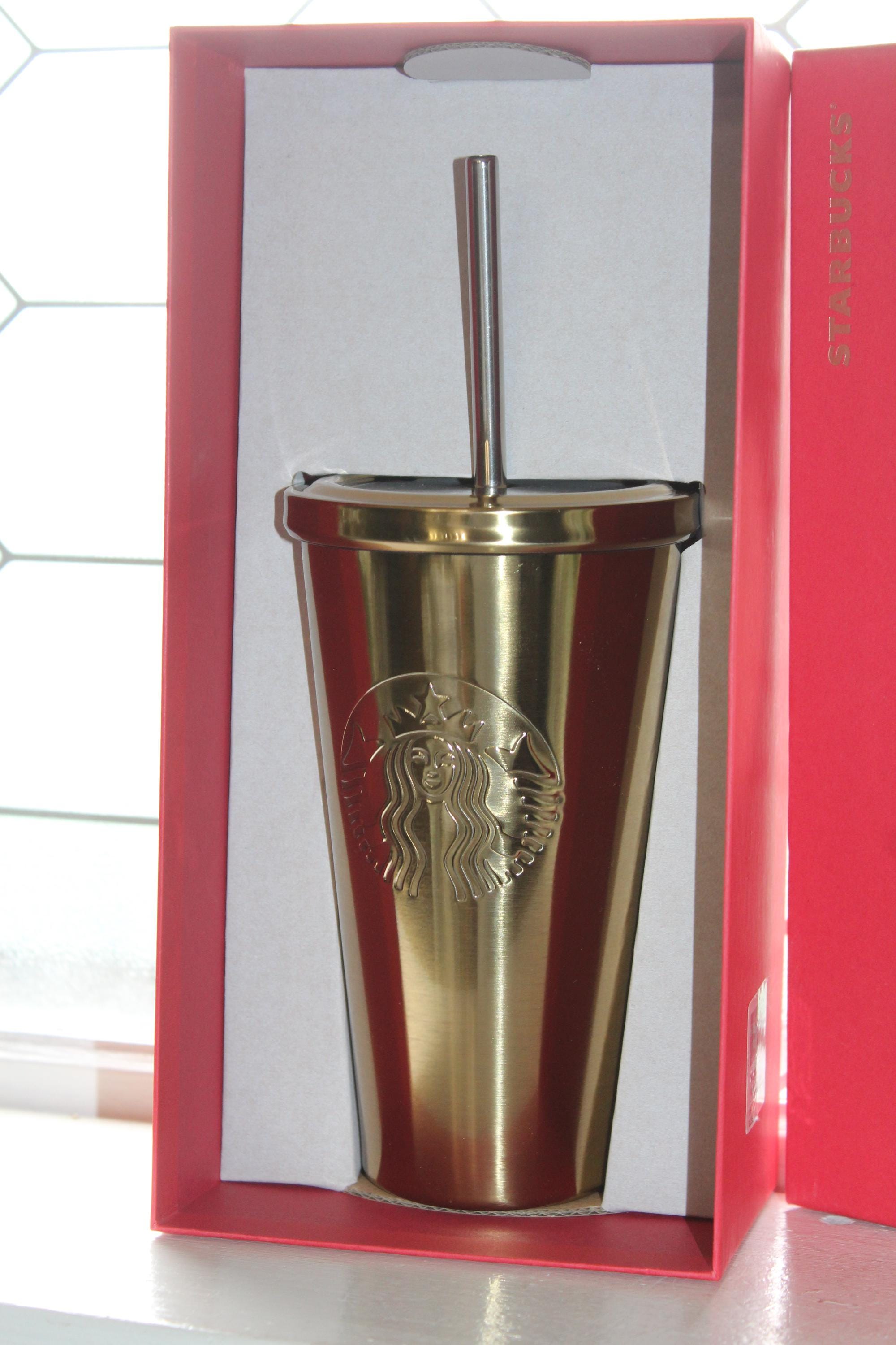 Starbucks coffee gold metal tumbler, with metal straw and original gift box, in excellent condition. It measures 7" high. Enjoy!