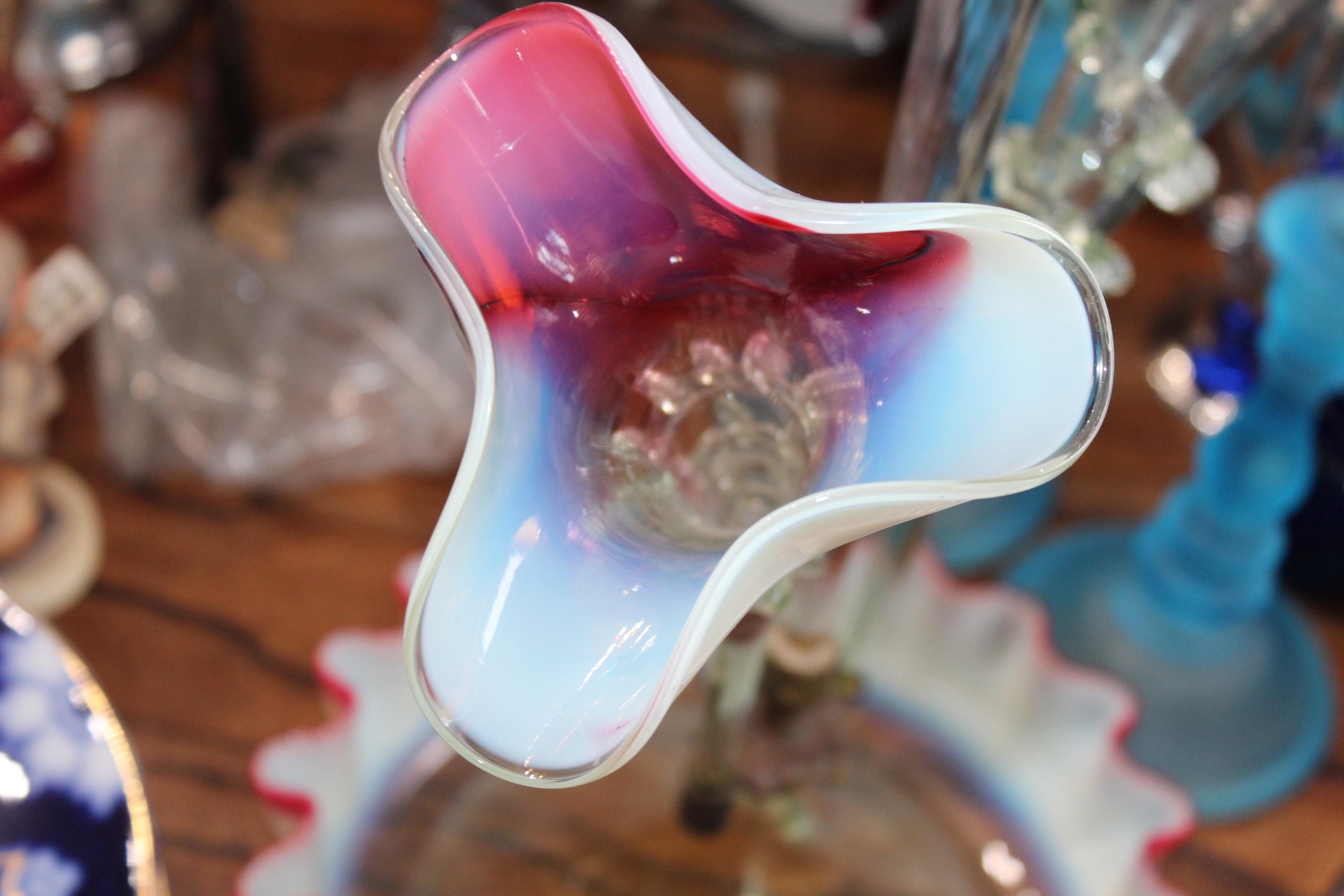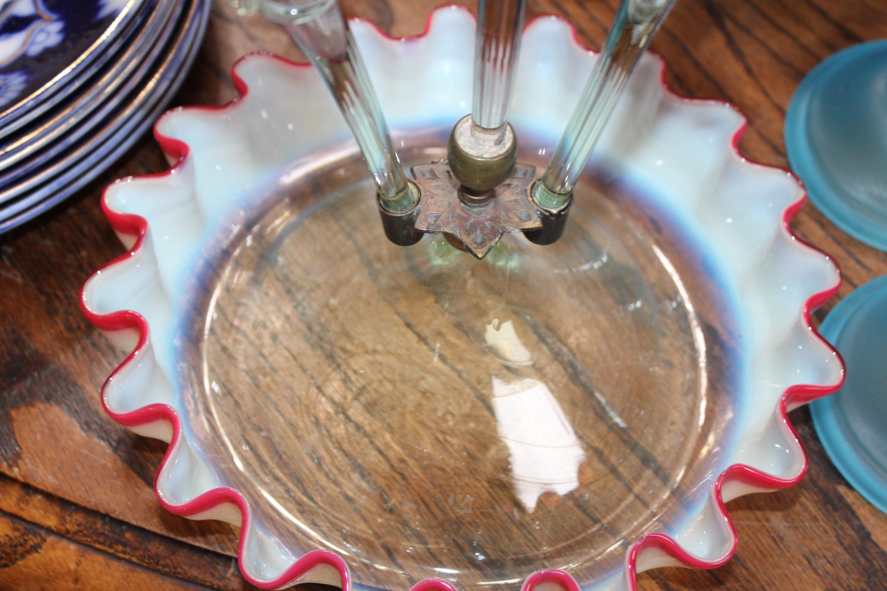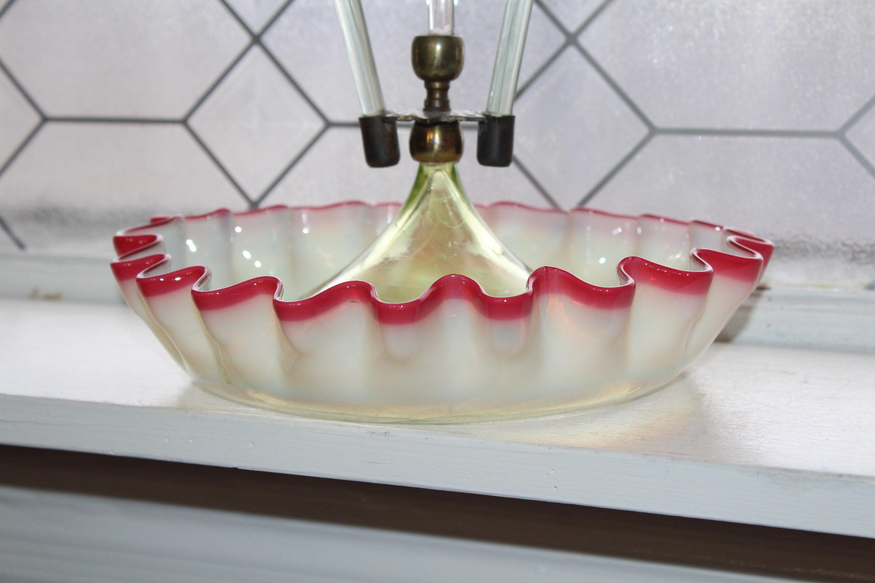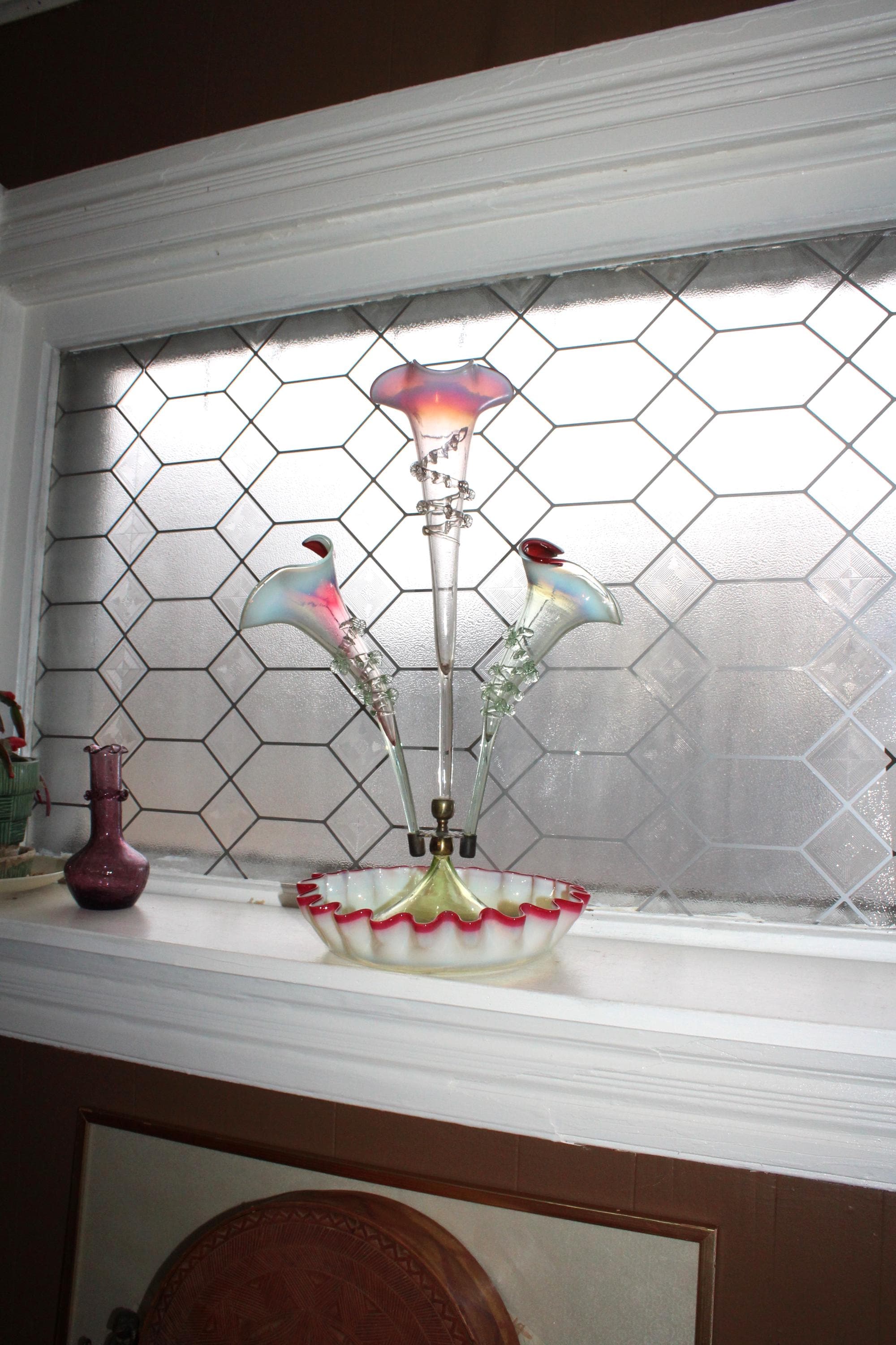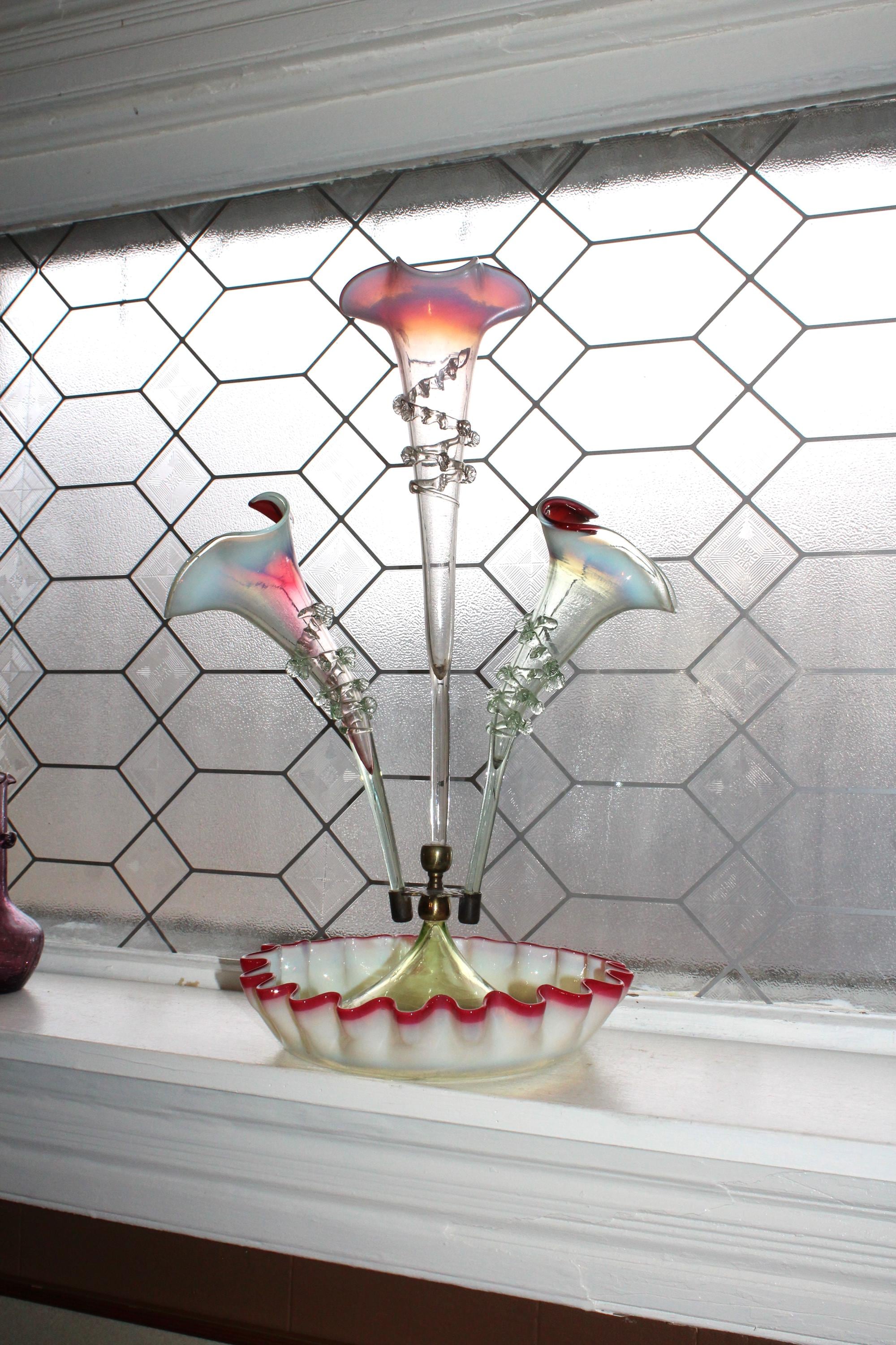 This is a gorgeous antique Victorian large cranberry opalescent uranium glass 3 horn epergne, perfect as a centerpiece. It measures 12" wide x 18 1/2" high. It's in excellent condition with no chips or cracks. Enjoy!