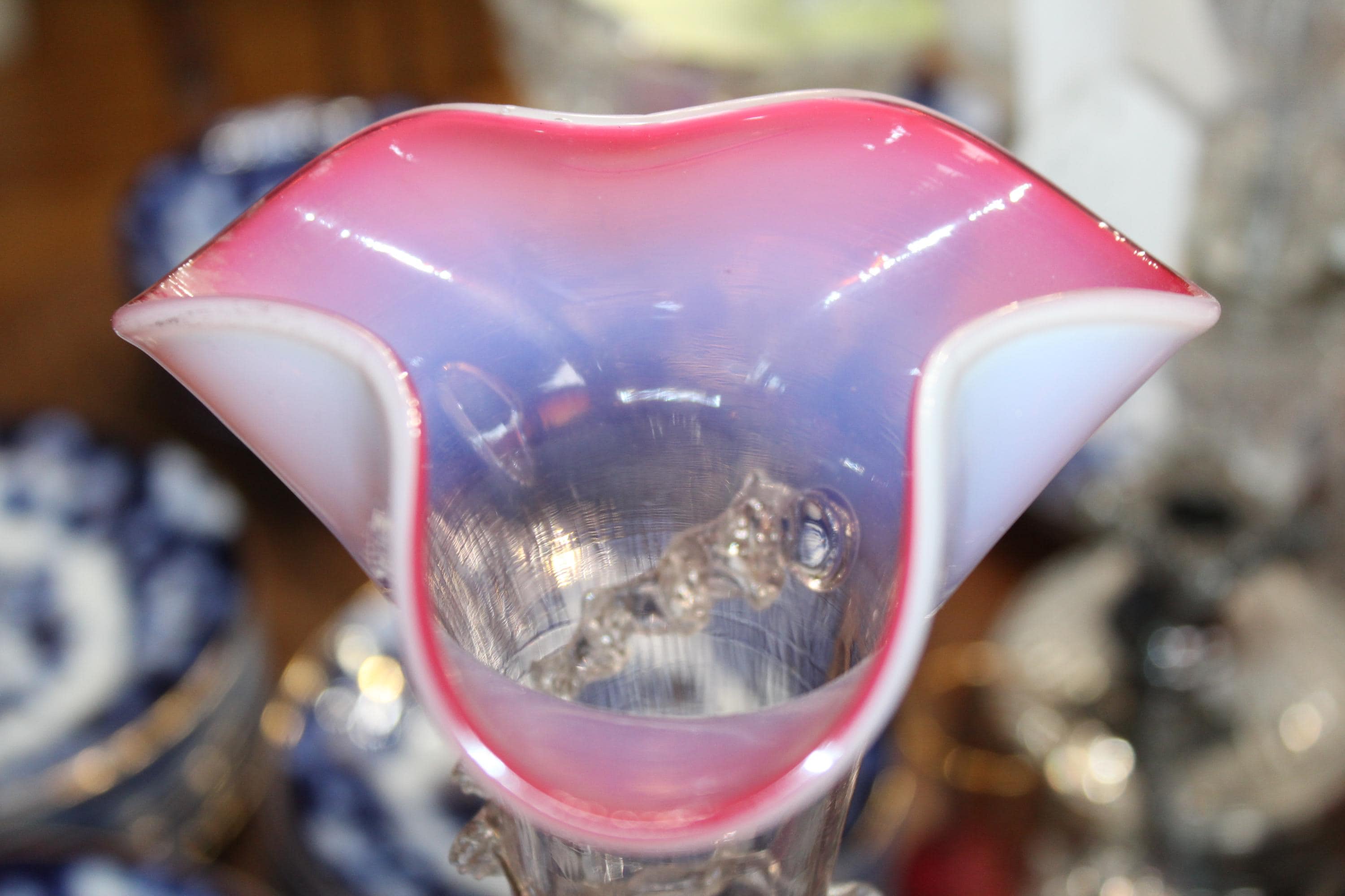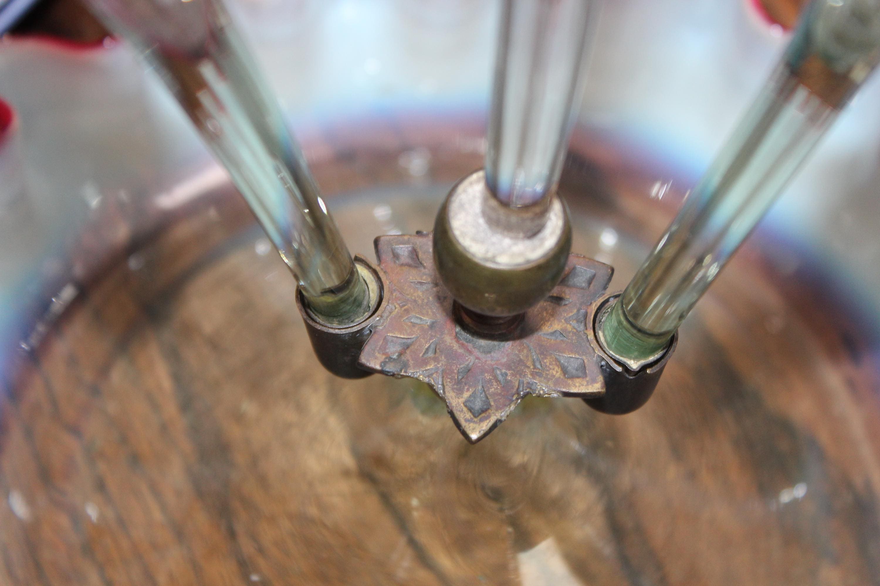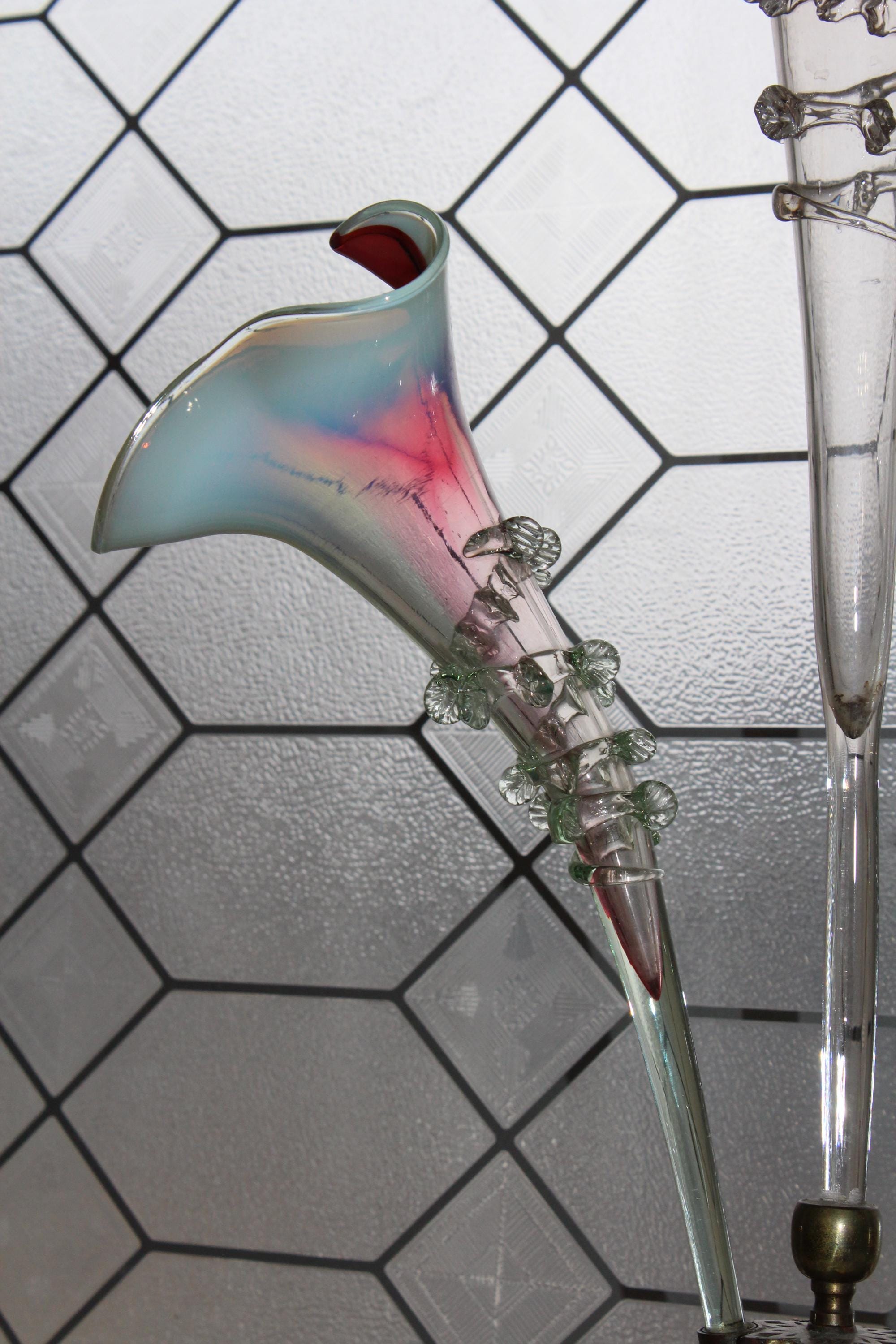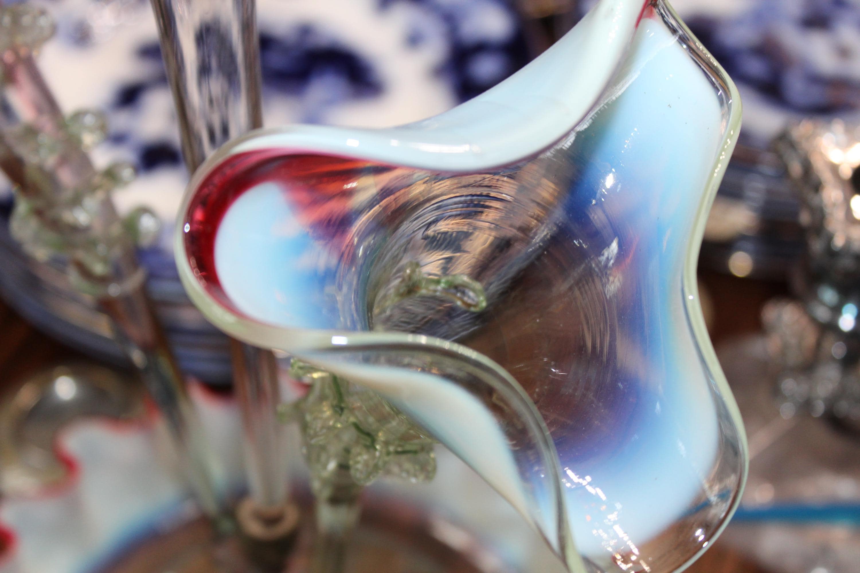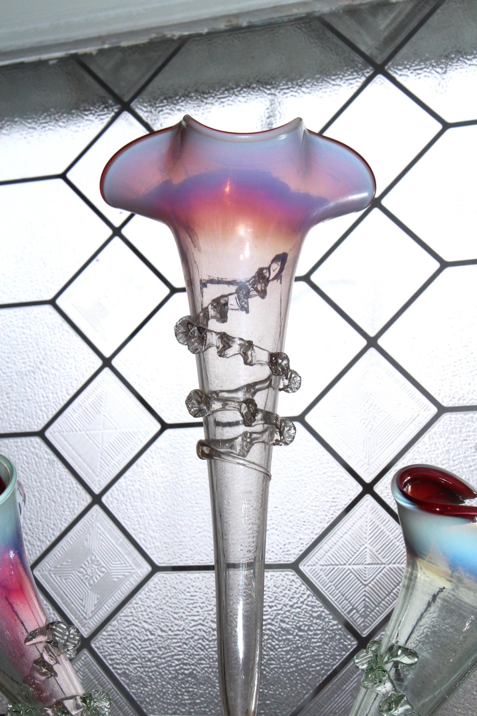 This is a gorgeous antique Victorian large cranberry opalescent uranium glass 3 horn epergne, perfect as a centerpiece. It measures 12" wide x 18 1/2" high. It's in excellent condition with no chips or cracks. Enjoy!