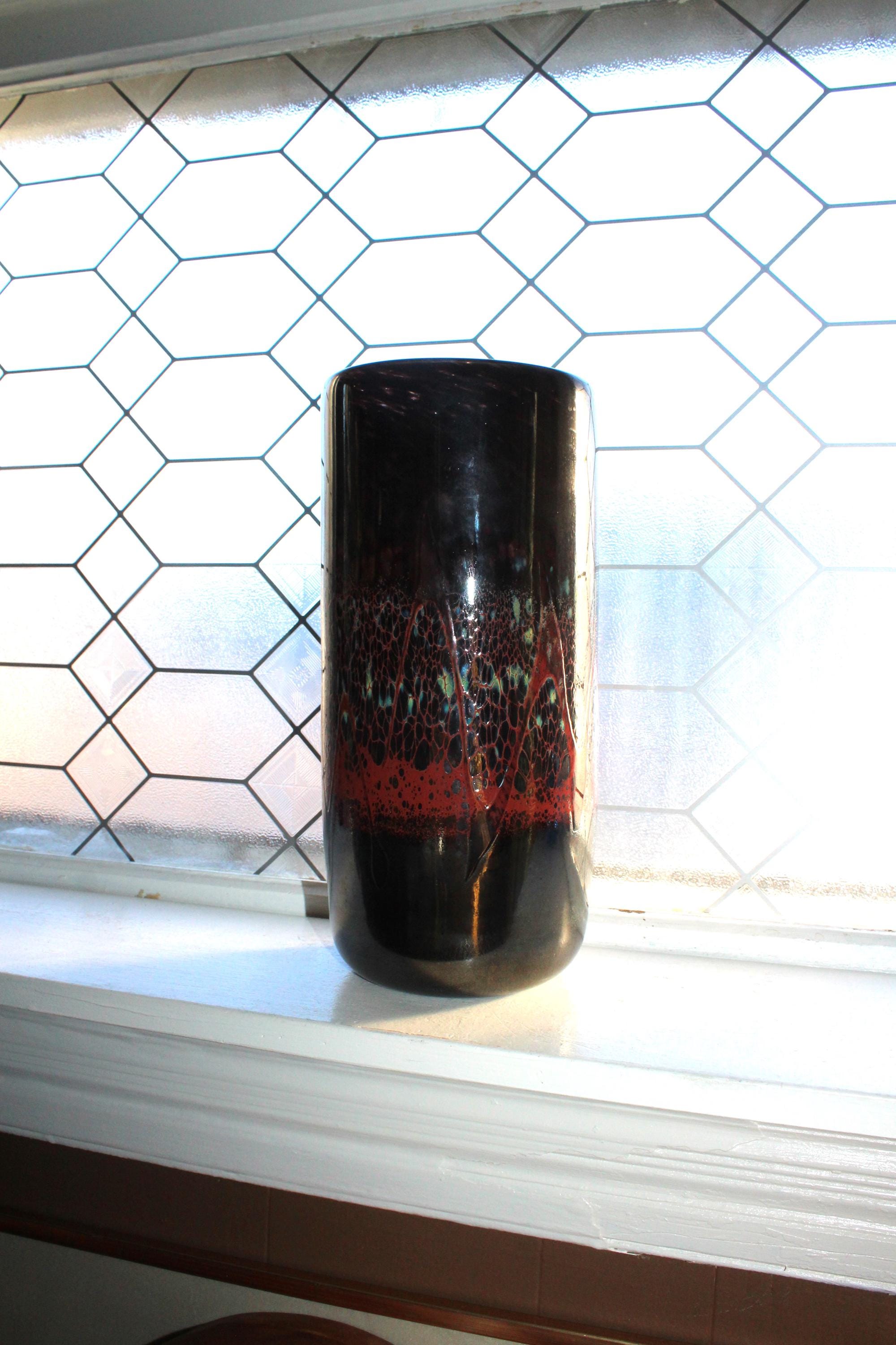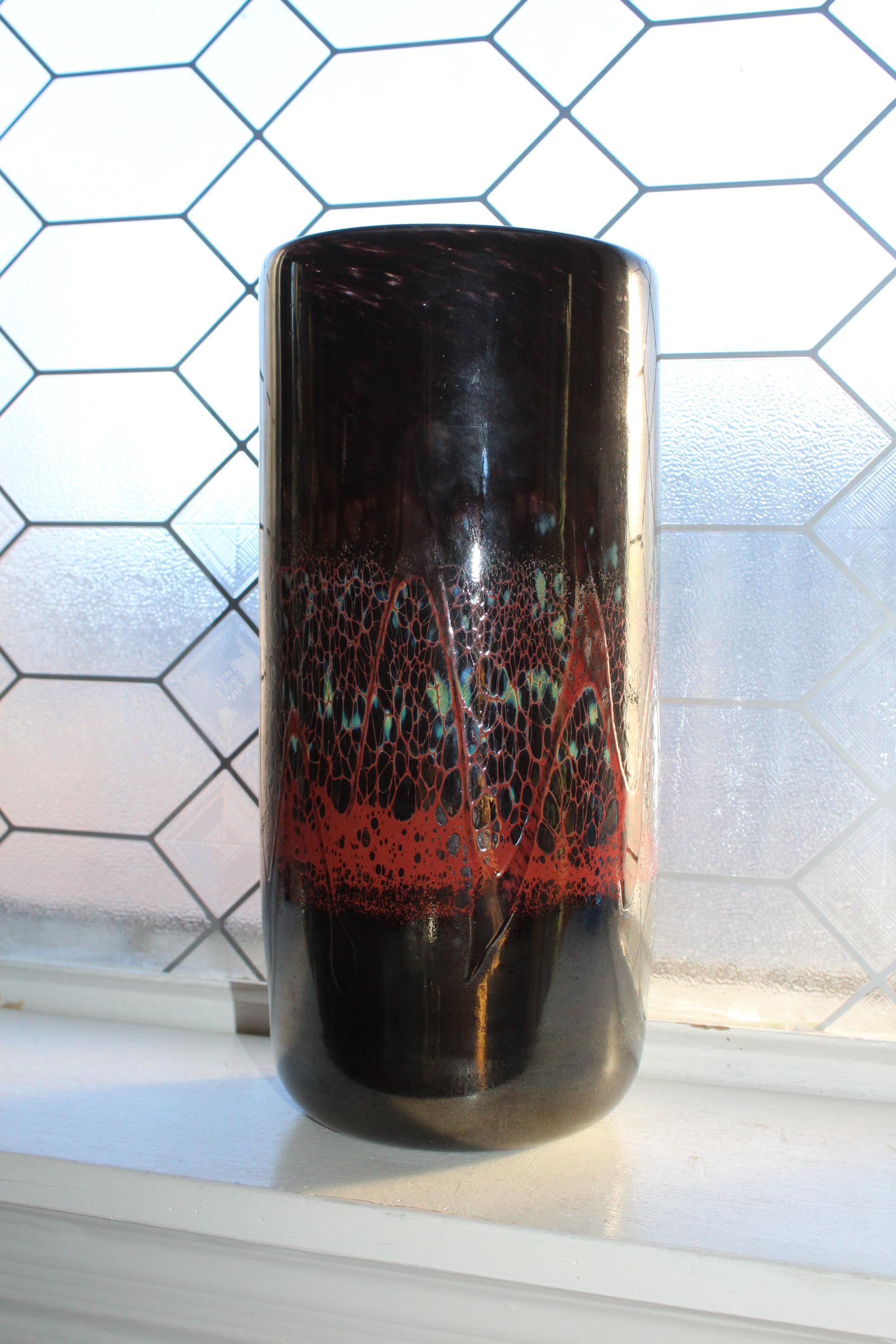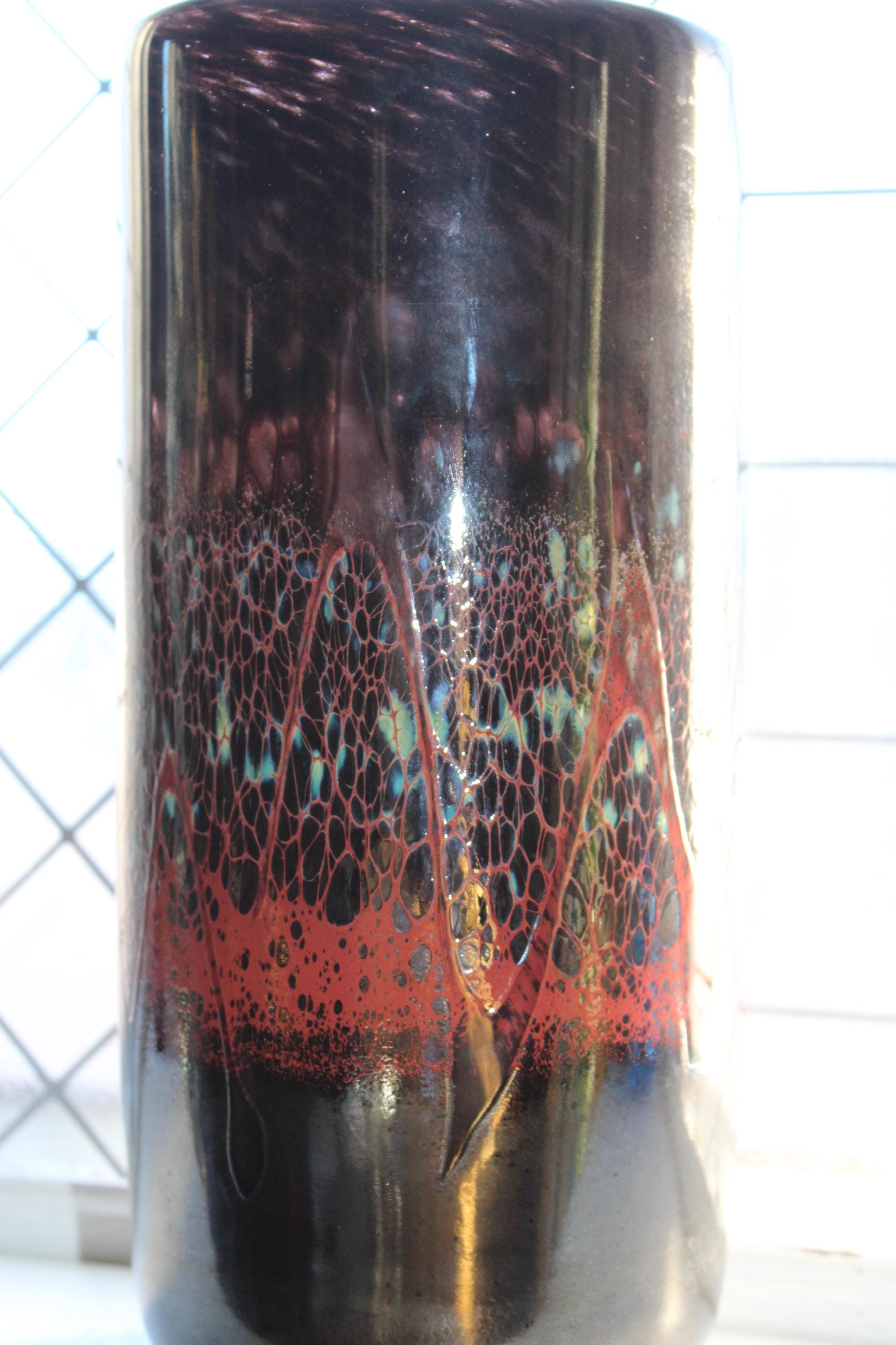This is a gorgeous large art glass cylinder vase made by Jon Offutt, a well known North Dakota artist, in excellent condition. The vase measures 12 3/4" high, weighs 5 lbs., has no chips or cracks and is signed on the underside. Enjoy!