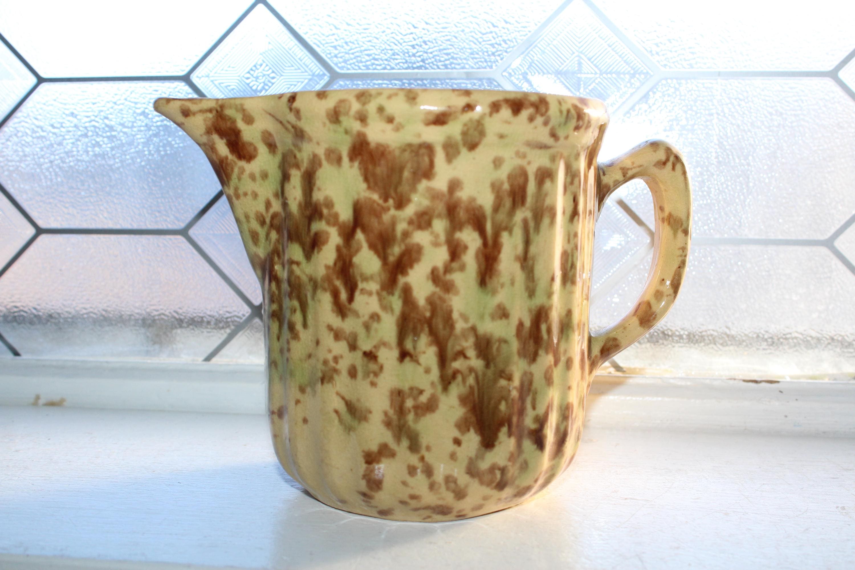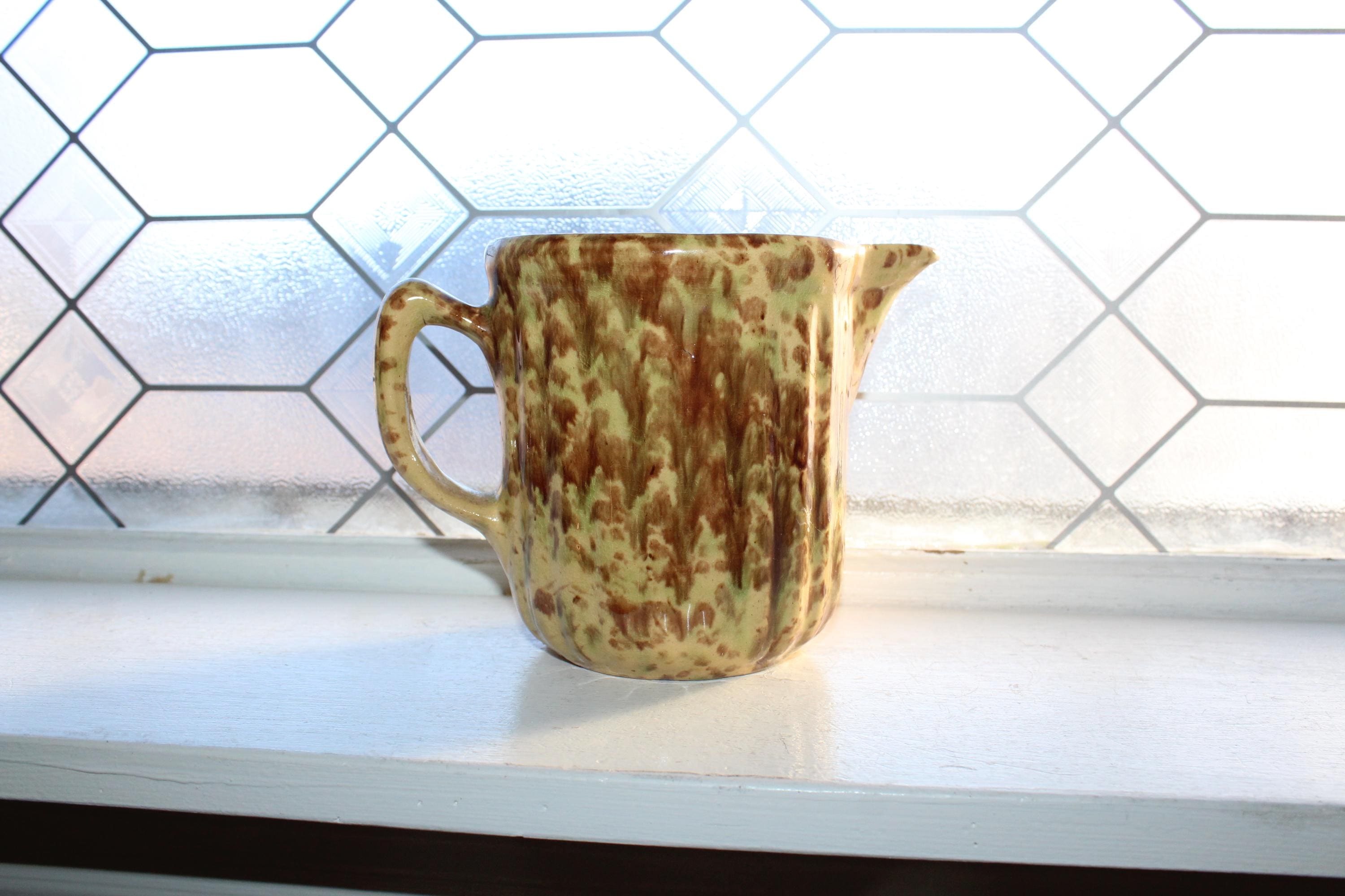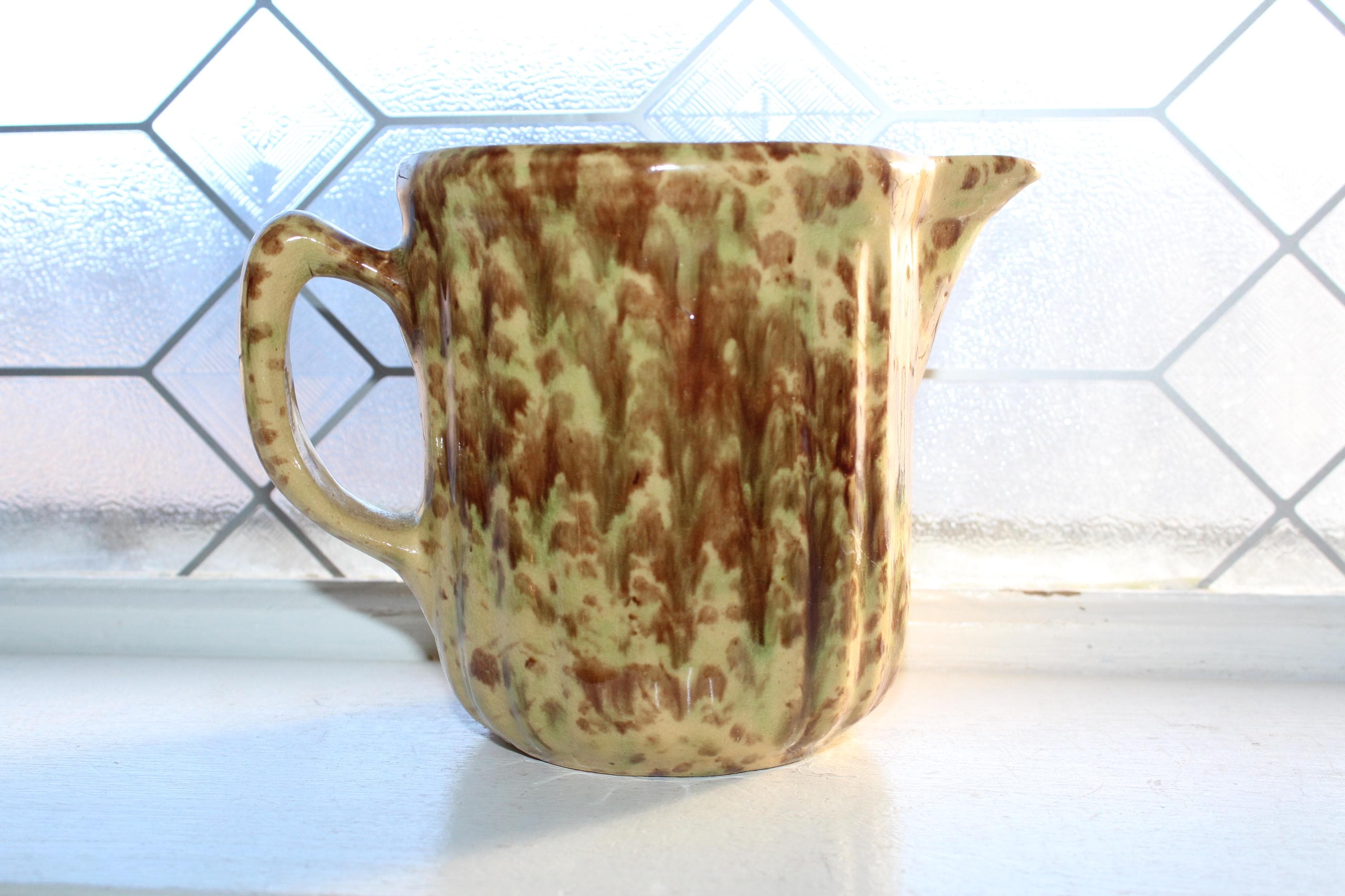 Antique brown and green on yellowware spongeware milk pitcher, in good condition. This stoneware pitcher measures 5 1/2" high and has no chips or cracks, perfect for use or display in a country kitchen. Enjoy!