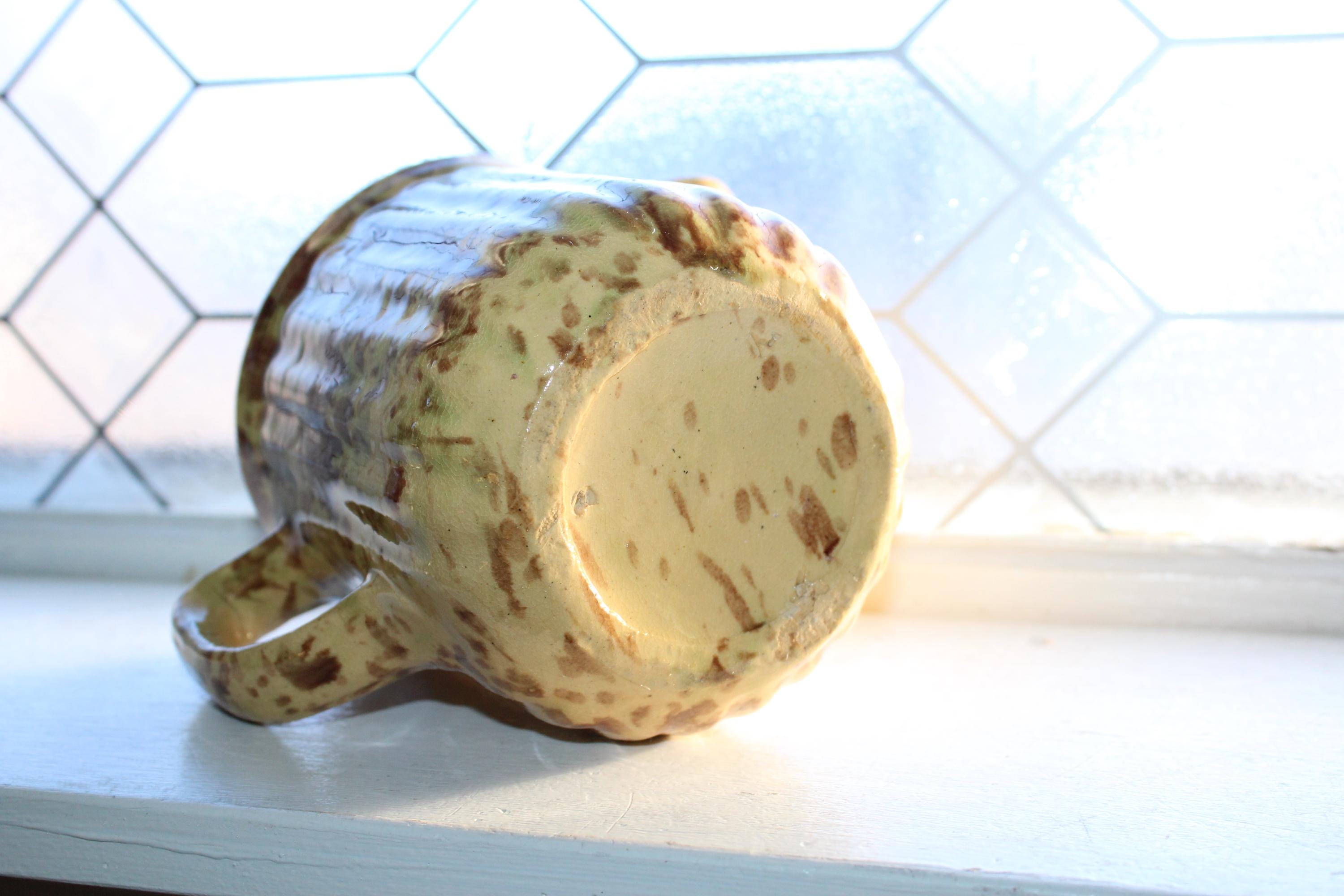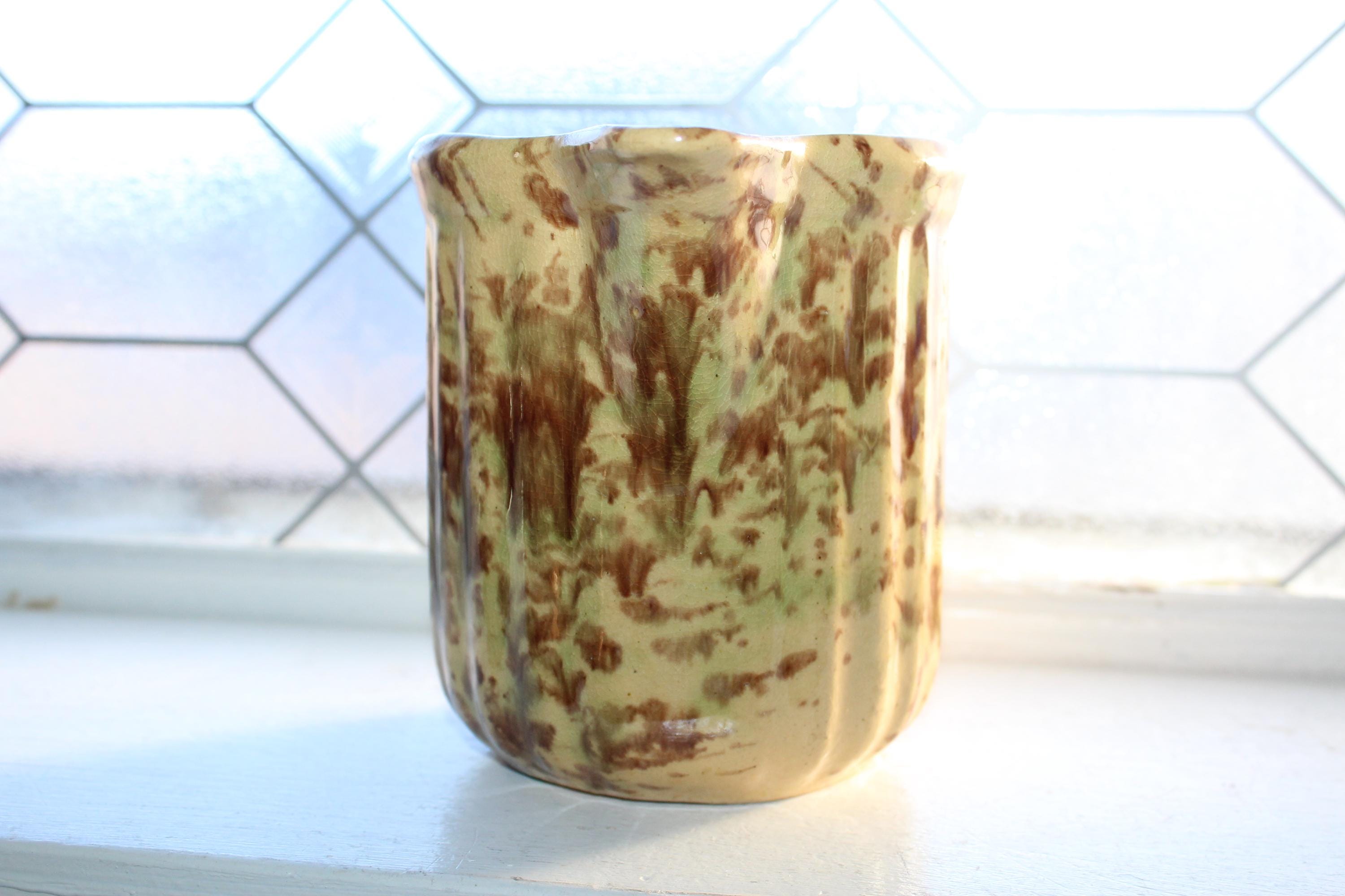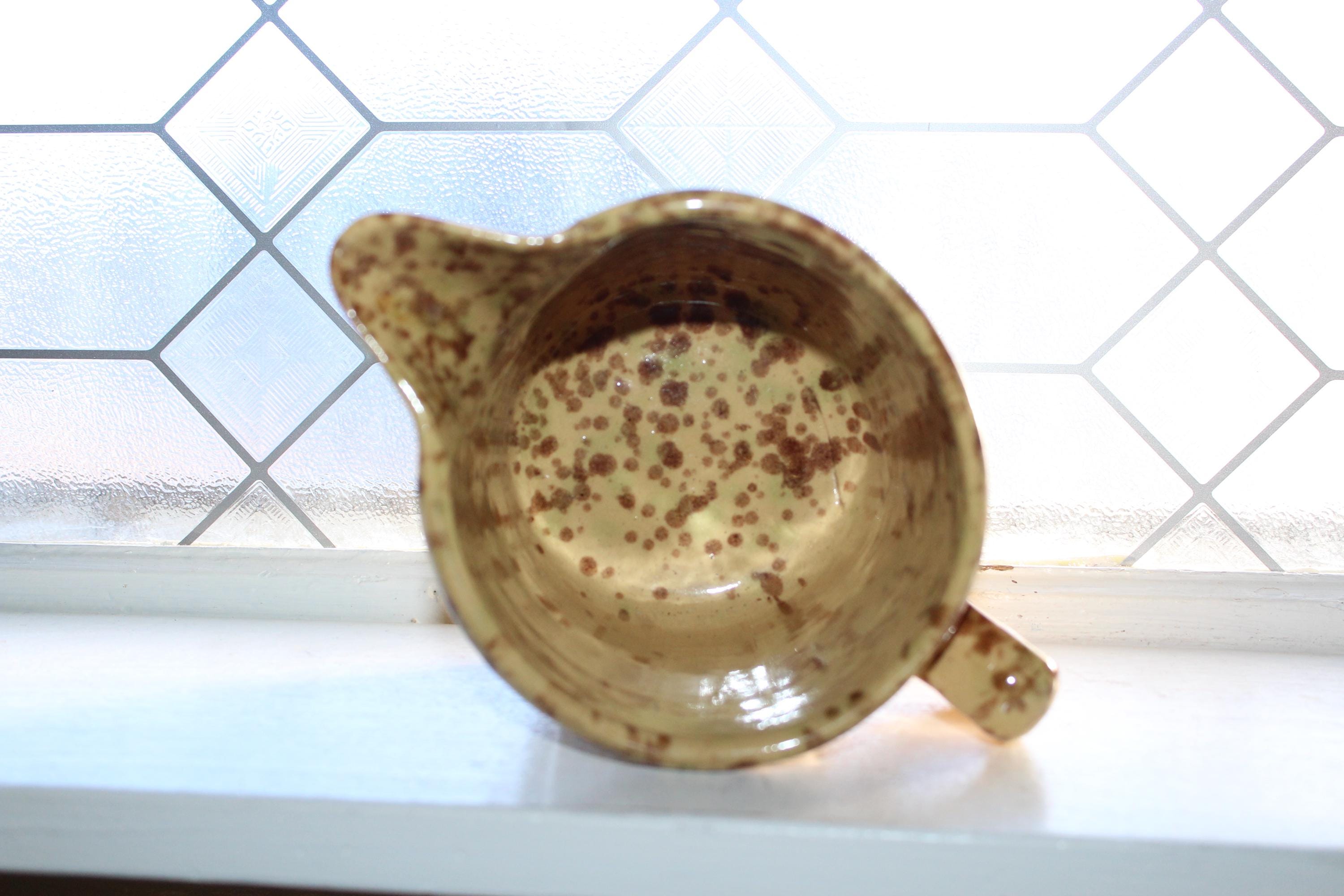 Antique brown and green on yellowware spongeware milk pitcher, in good condition. This stoneware pitcher measures 5 1/2" high and has no chips or cracks, perfect for use or display in a country kitchen. Enjoy!