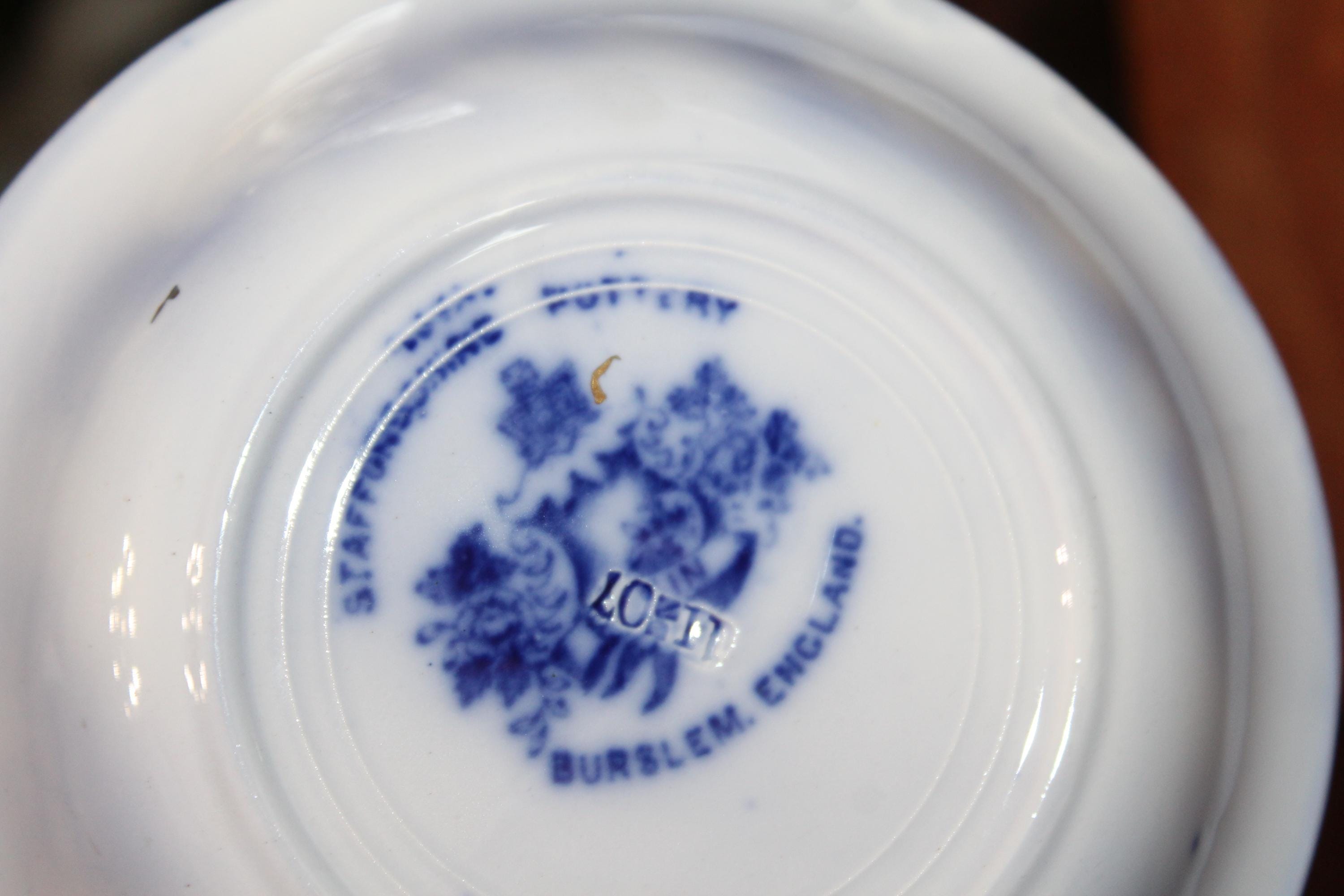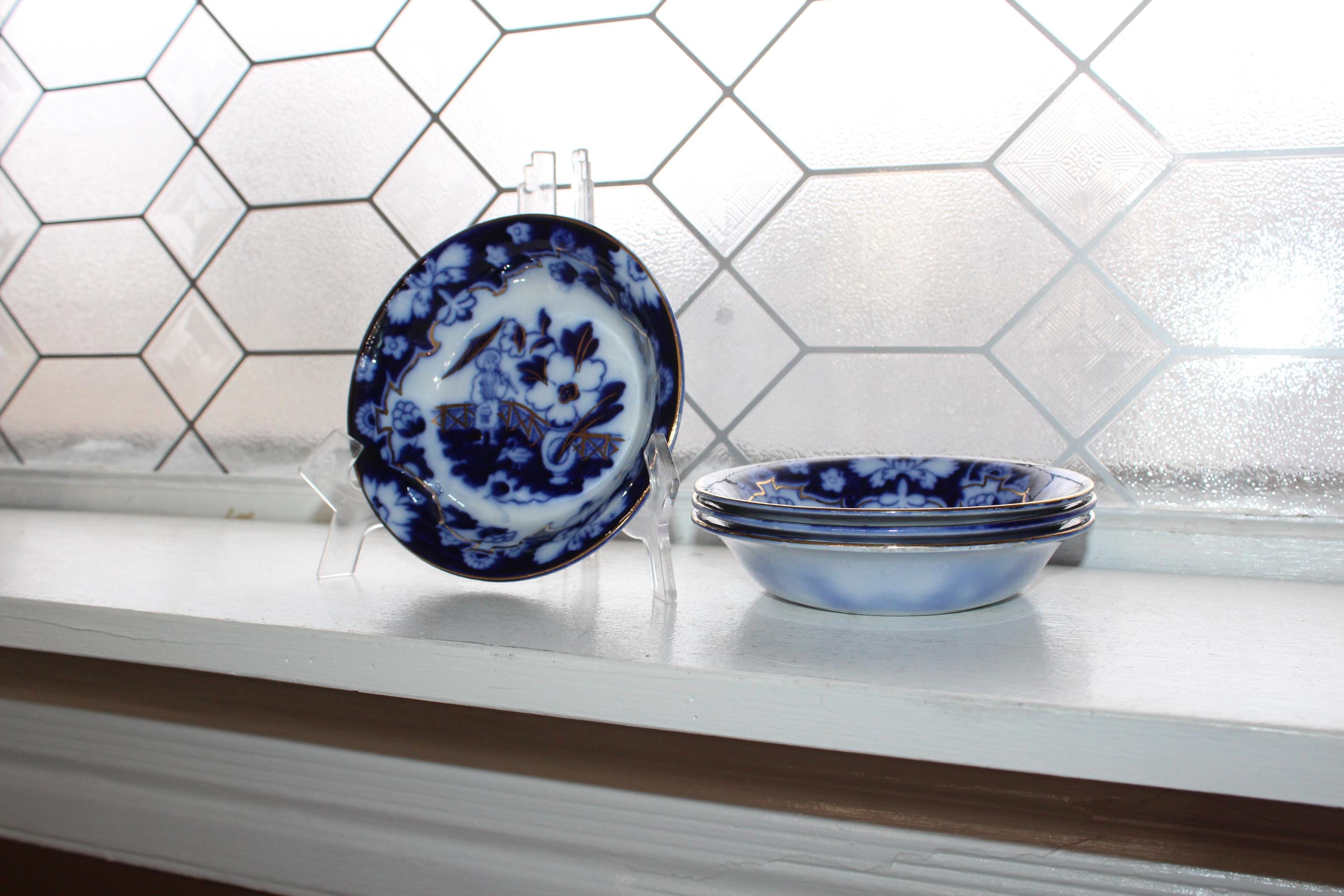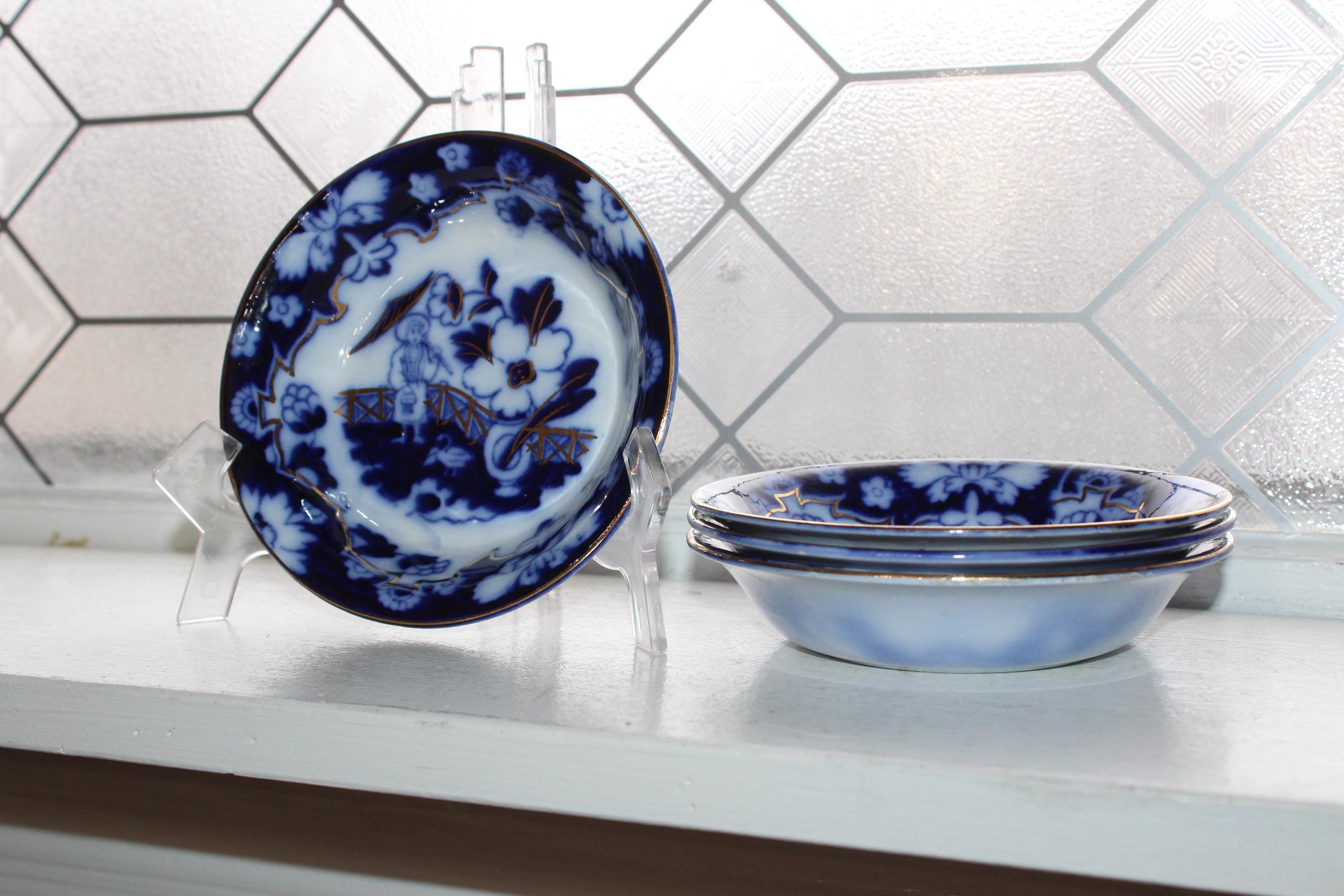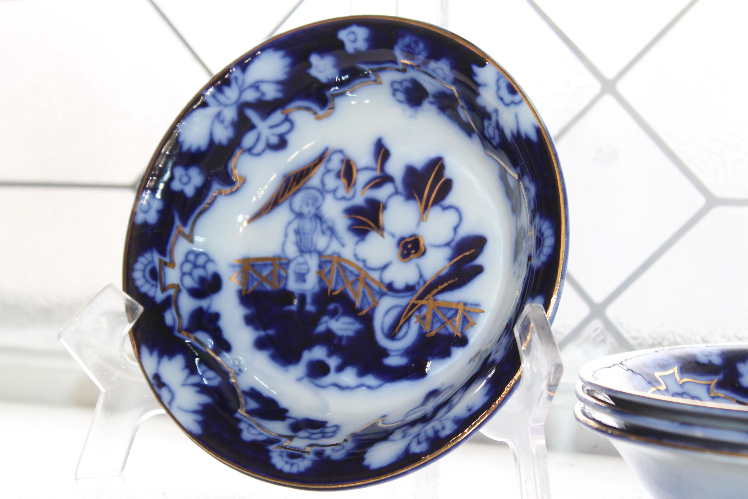 Set of 5 beautiful antique 5.5" dark flow blue dessert bowls in the Pekin pattern with gold trim, by Royal Staffordshire of Burslem, England. They are in very good condition with minor wear, perfect for use or display. I HAVE A LARGE SET OF THIS PATTERN, ALL AVAILABLE VIA SEPARATE LISTINGS. Enjoy!