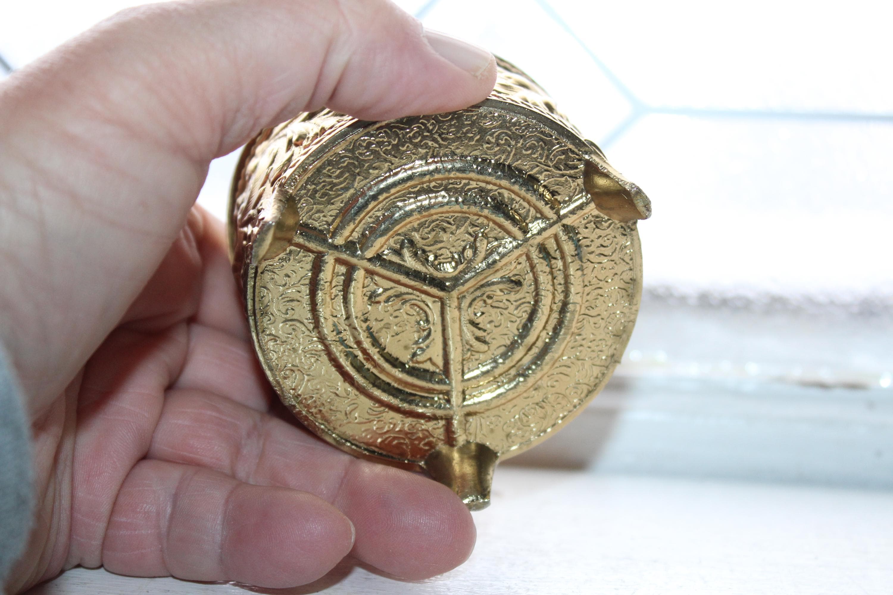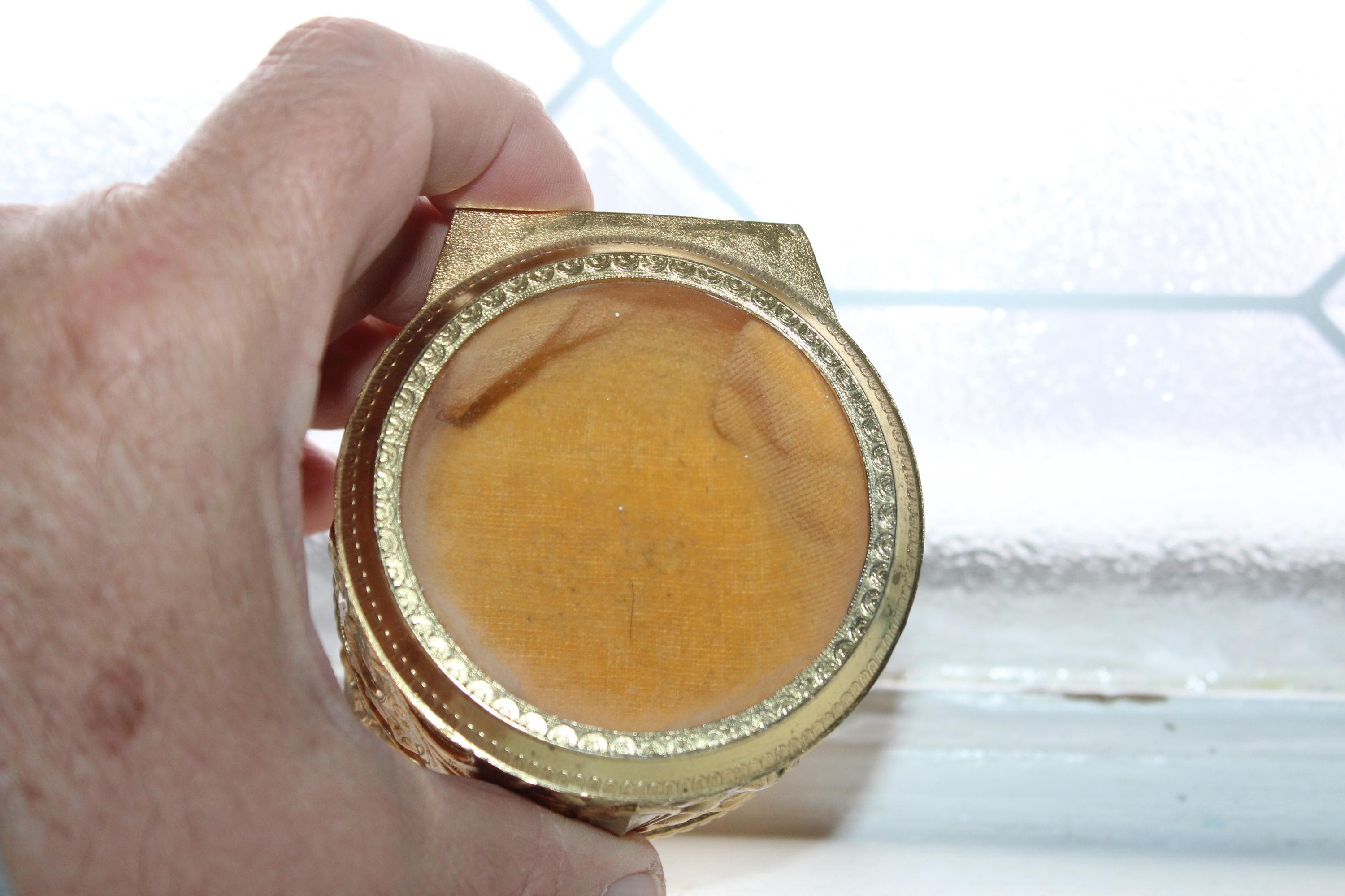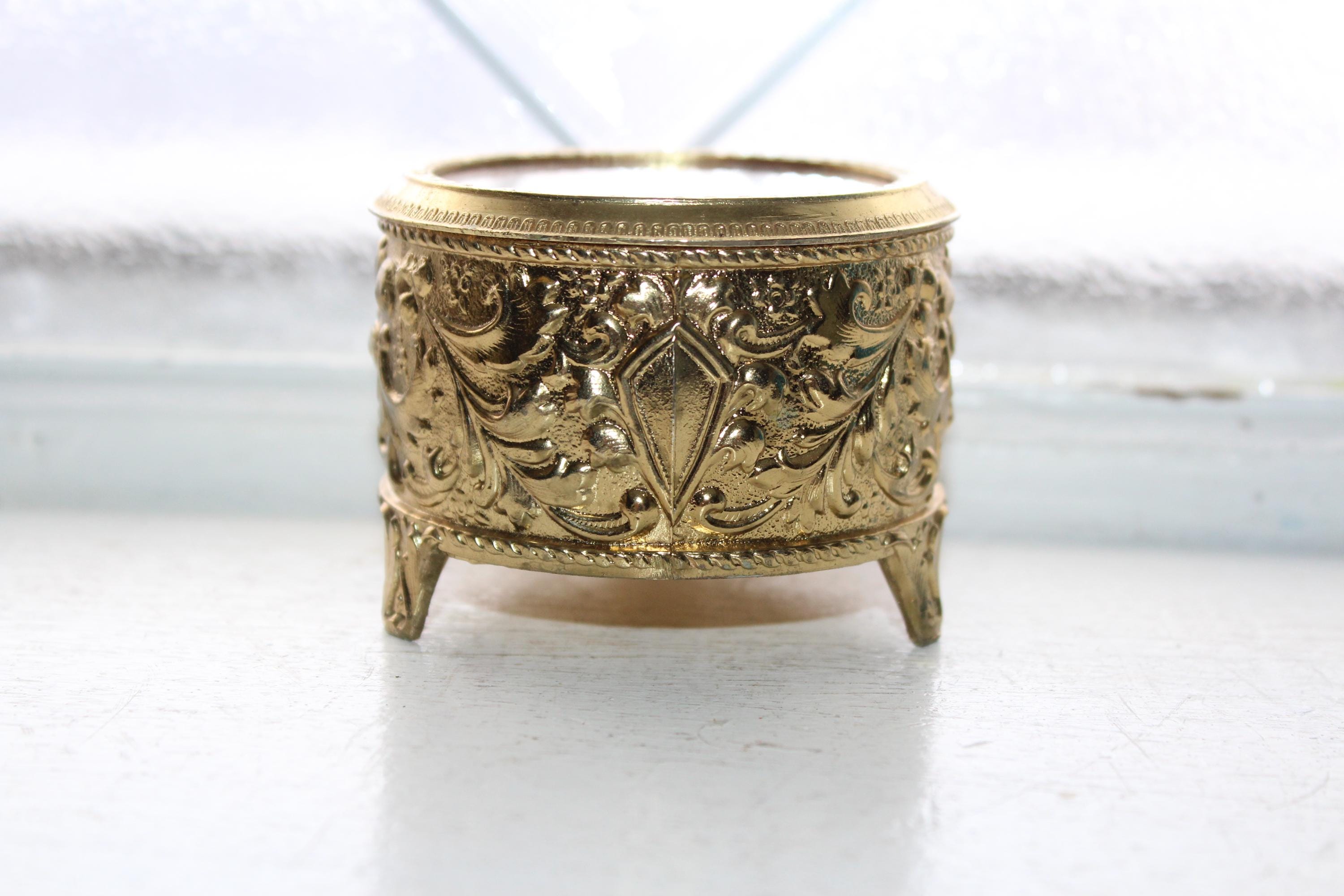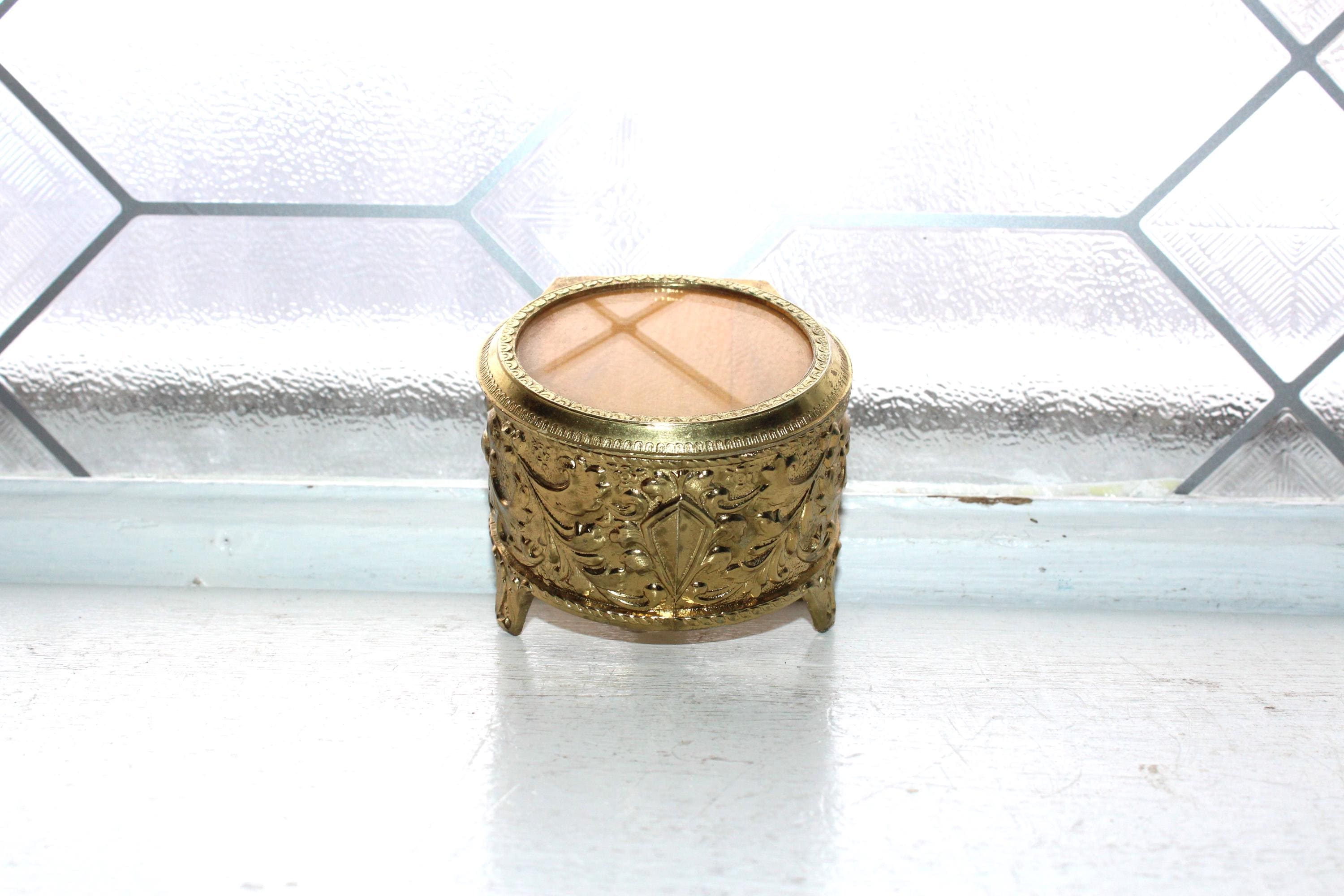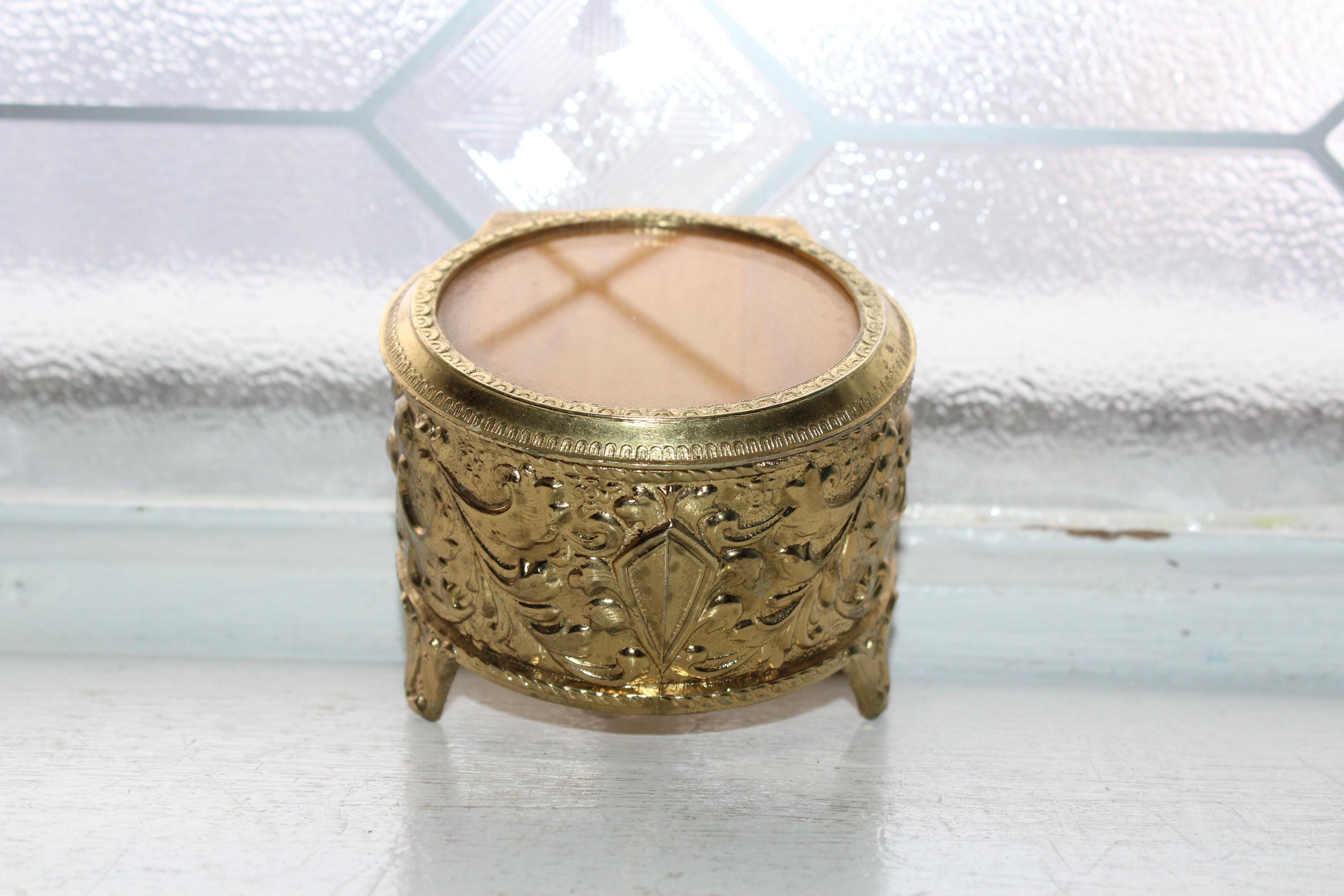 This is a gorgeous vintage jewelry casket featuring detailed filigree ormolu. It is a lovely footed metal and glass round jewelry box, in very good condition. It measures 3" wide x 2 1/4" high. This box is a great display piece- enjoy!