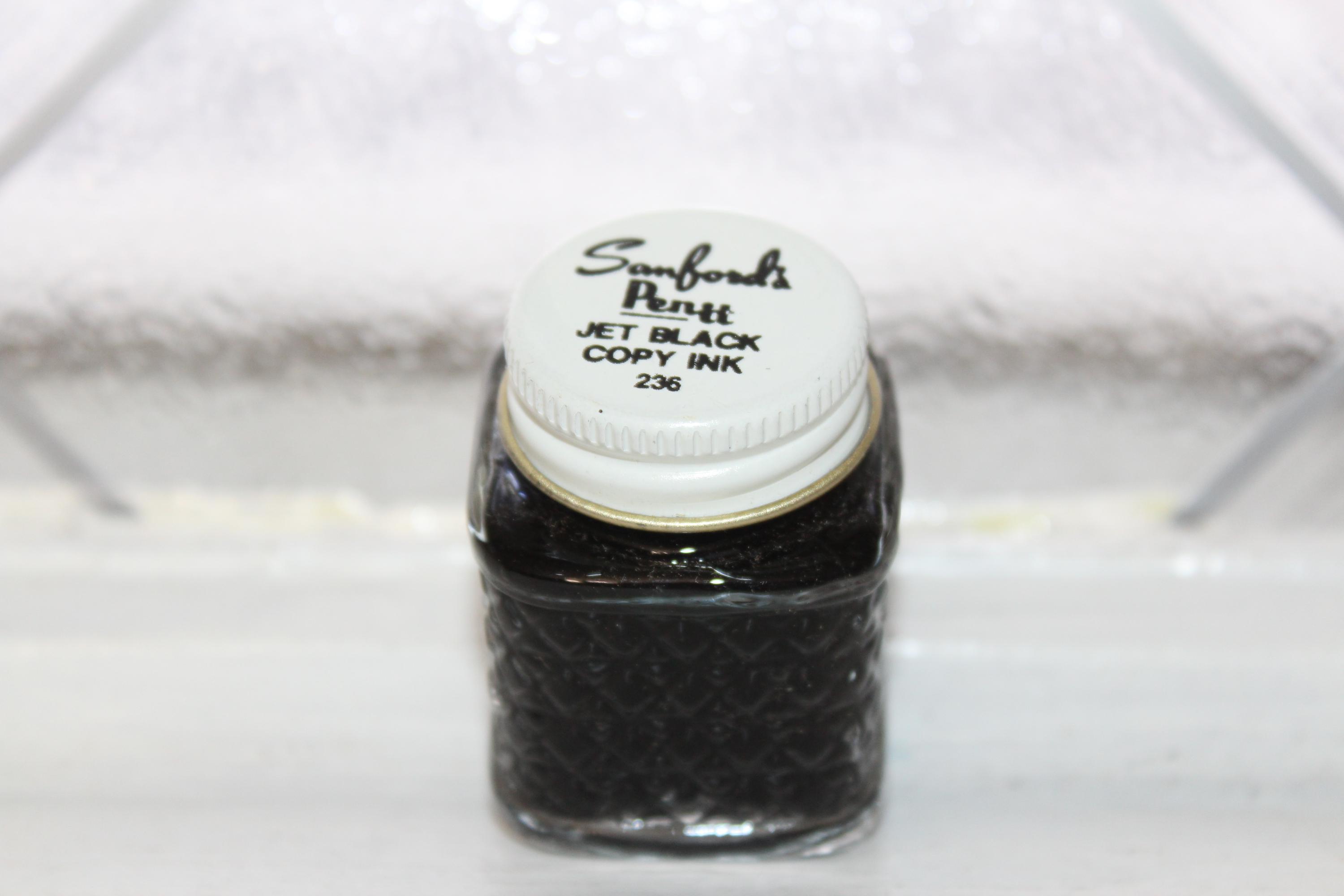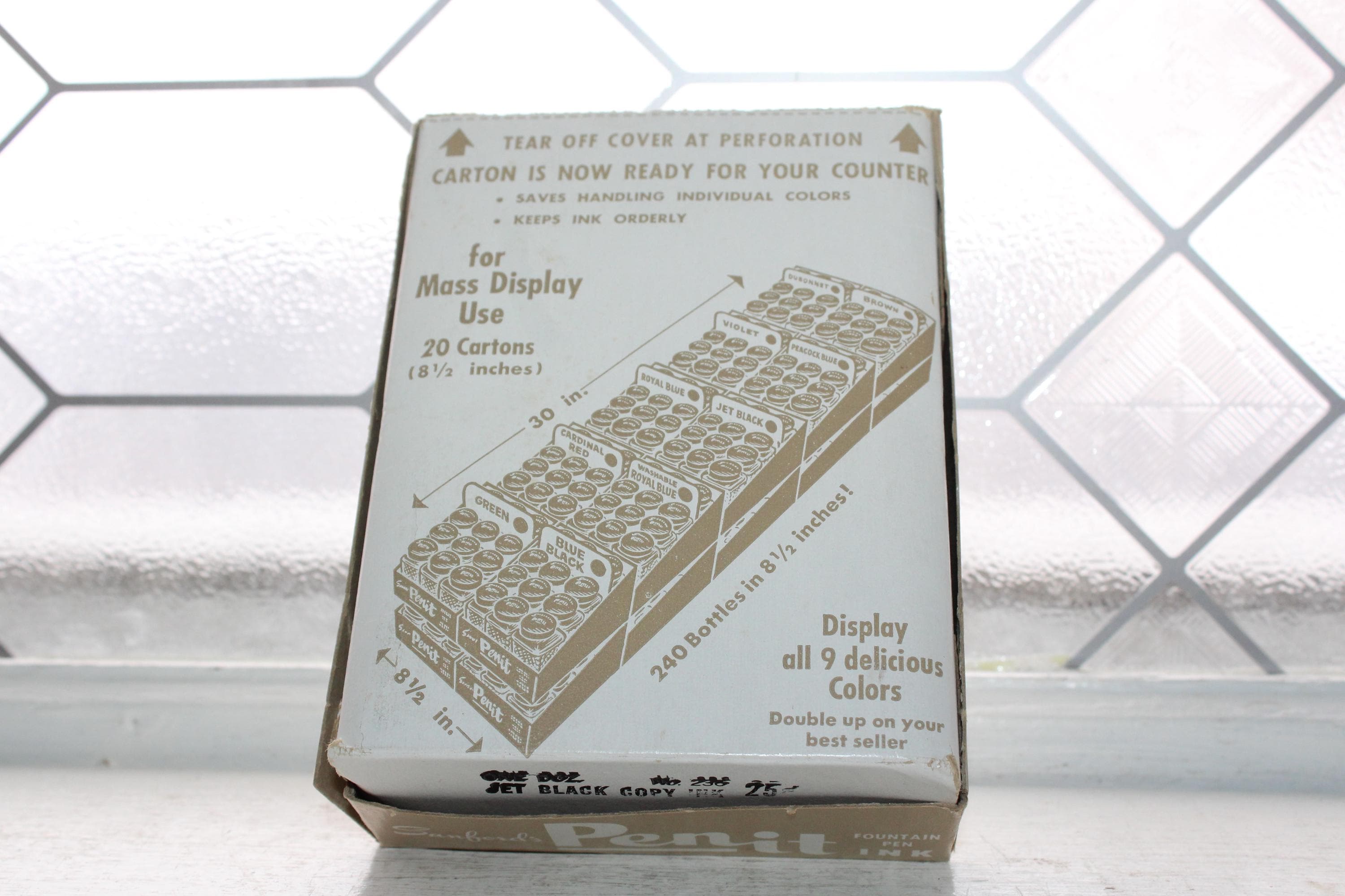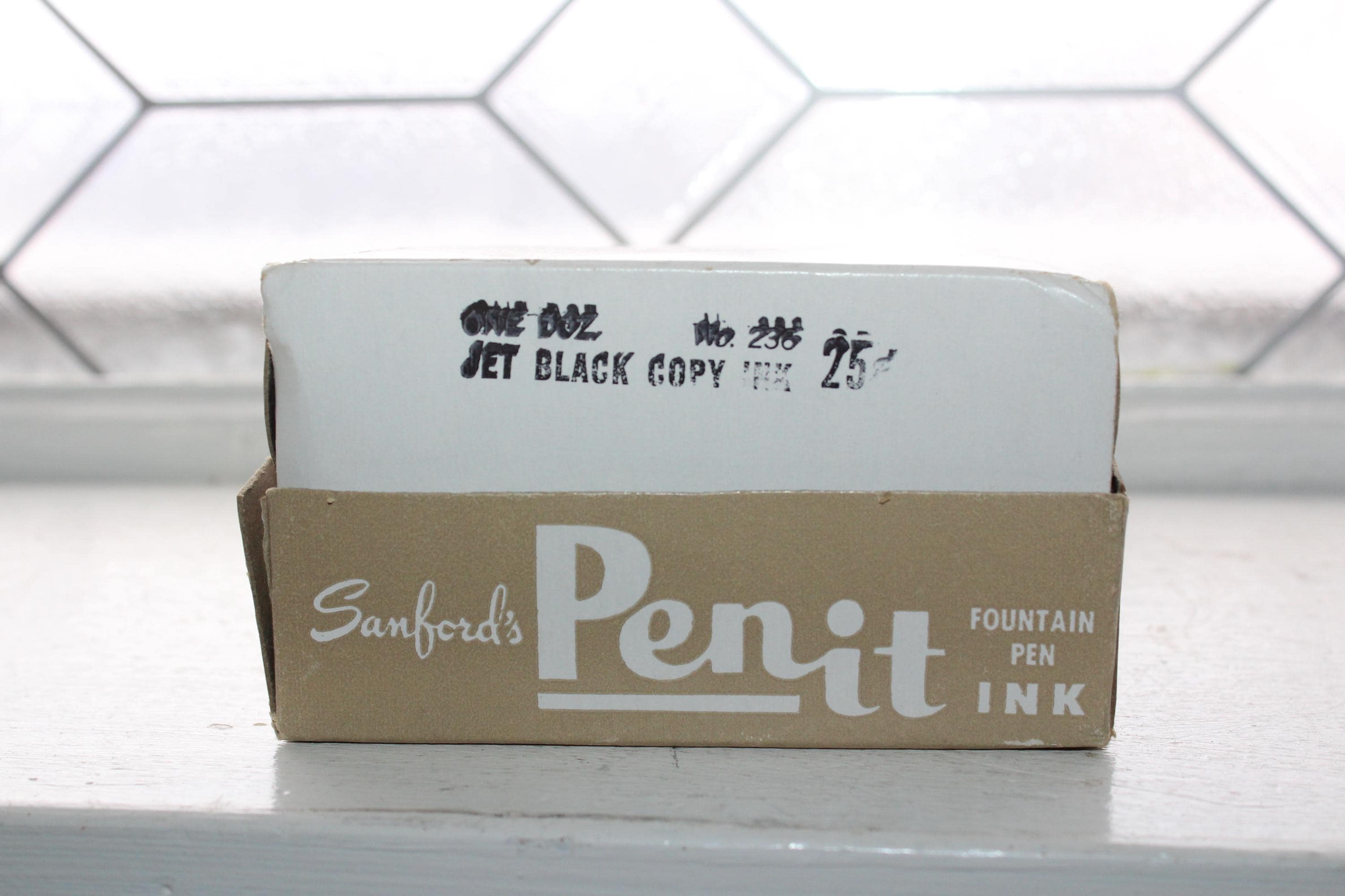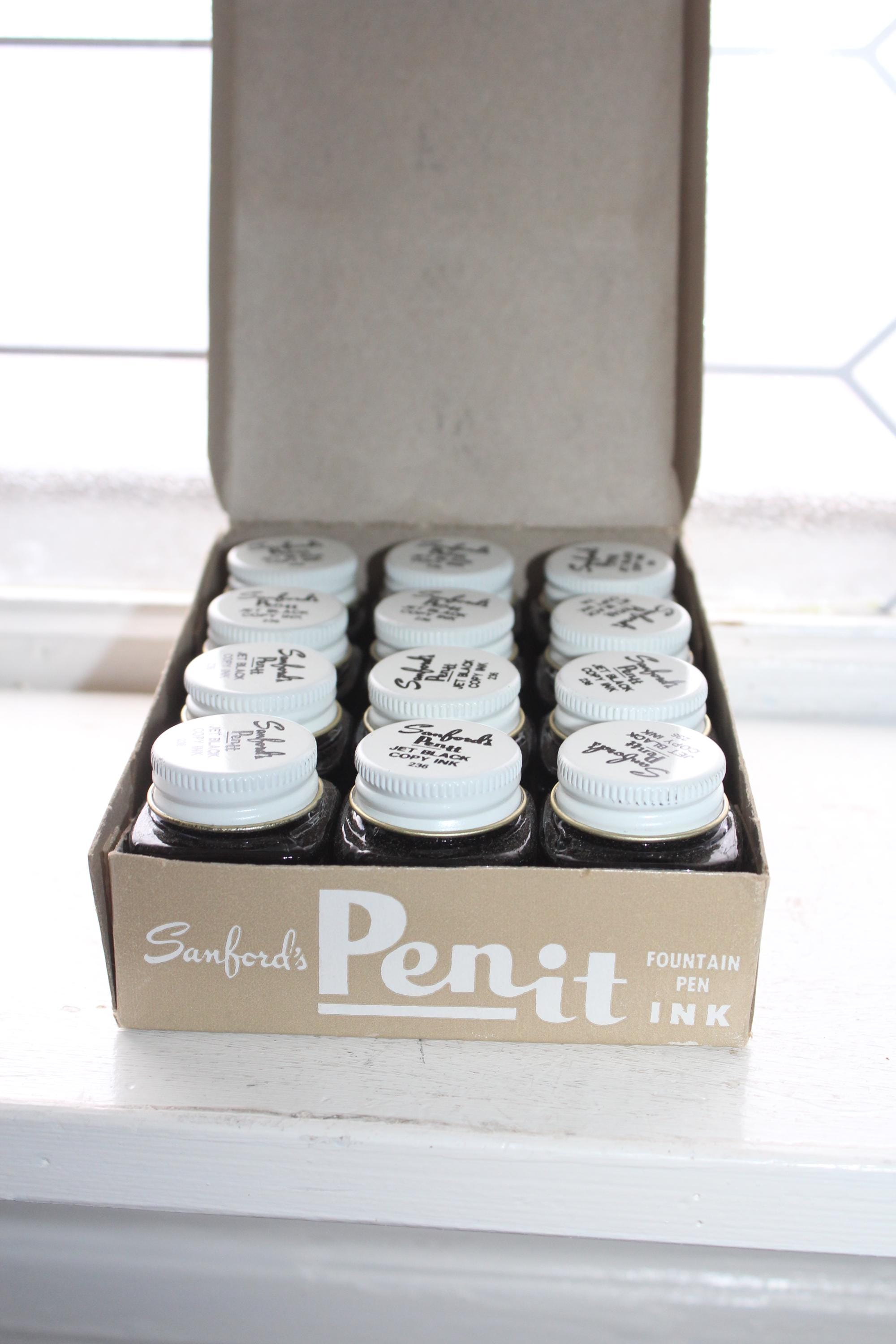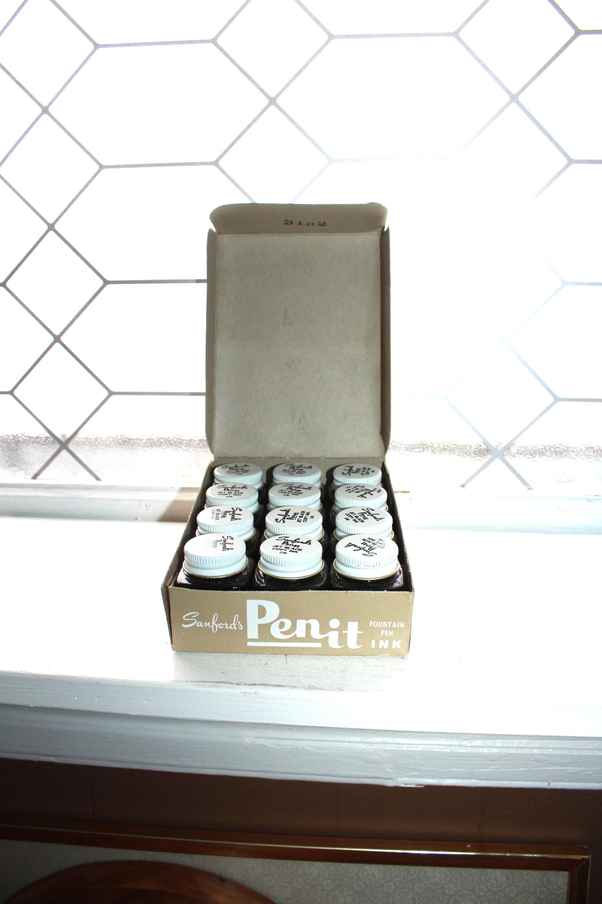 This is a vintage case of 12 Sanford's Penit jet black copy fountain pen ink glass bottles, in very good condition. 3 of them appear to have been used, missing 1/3 of ink. Enjoy!