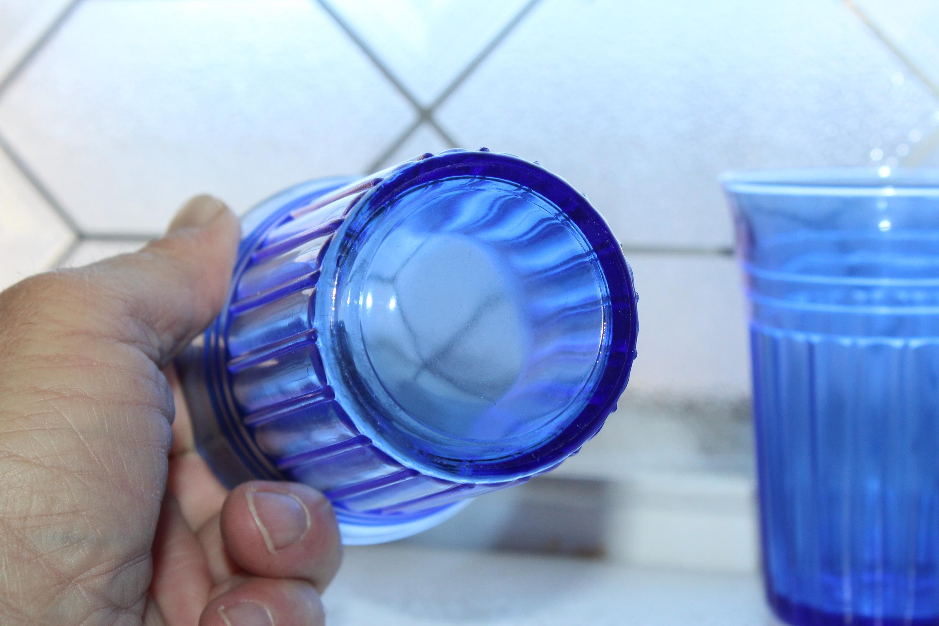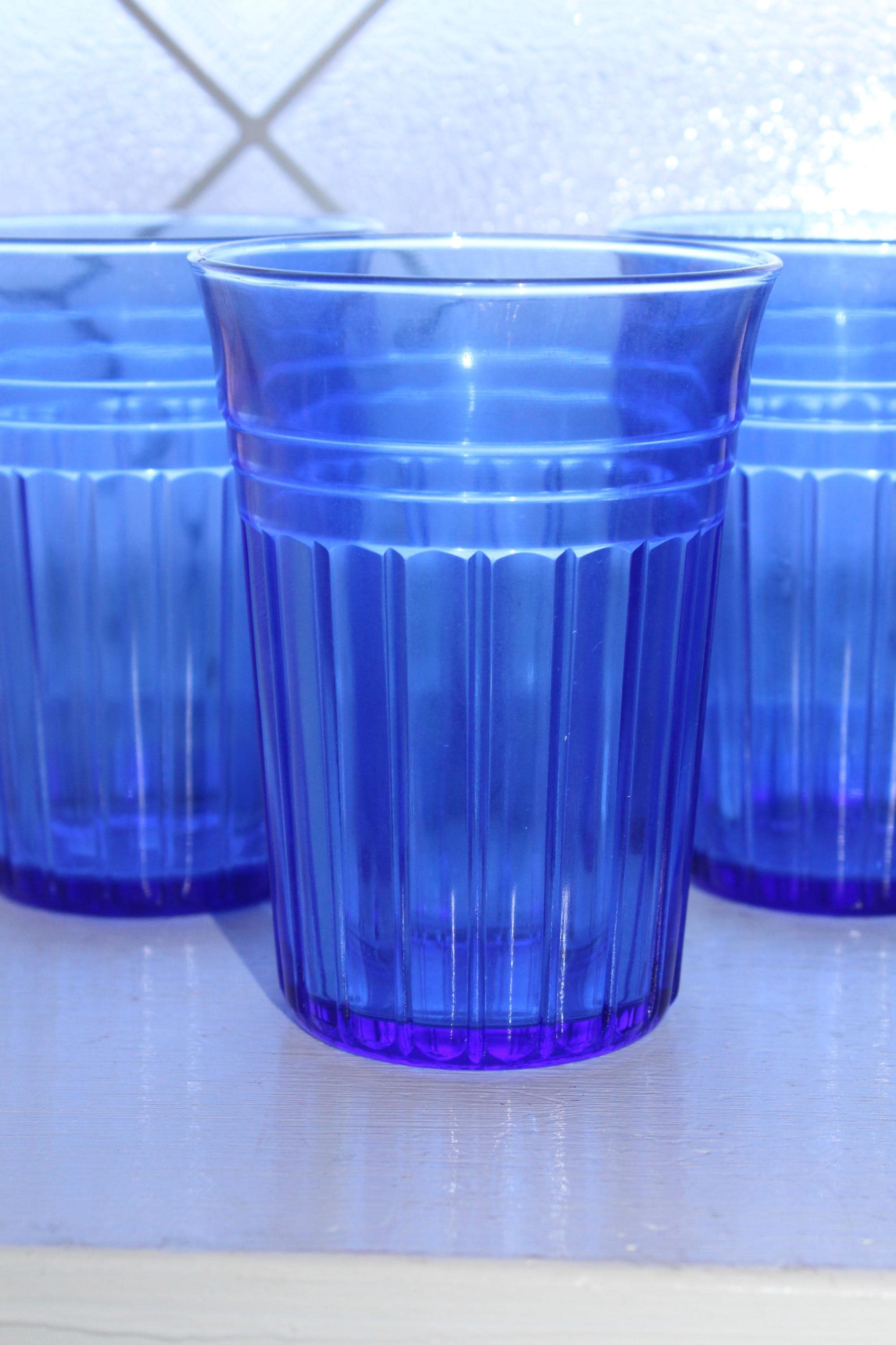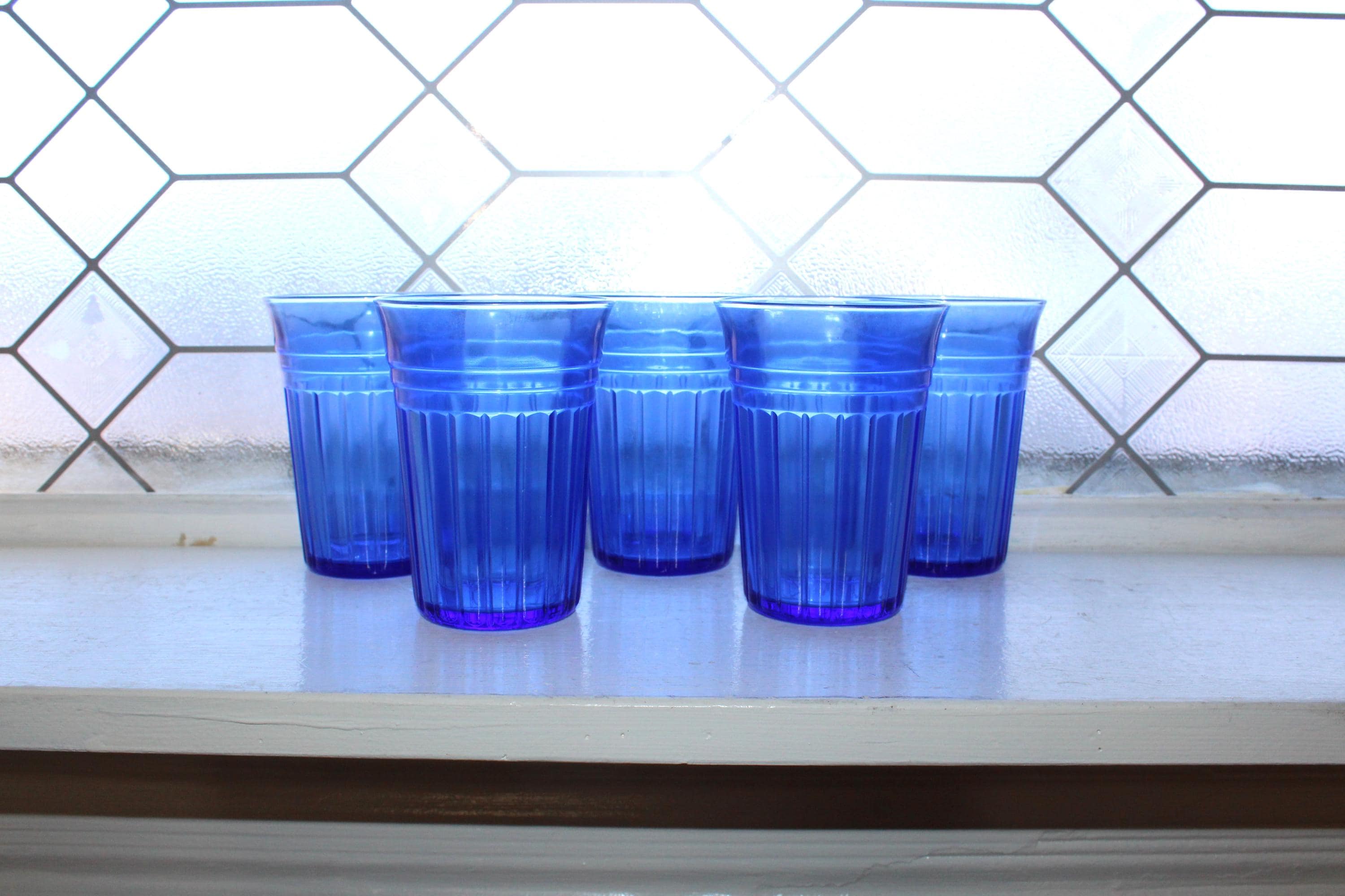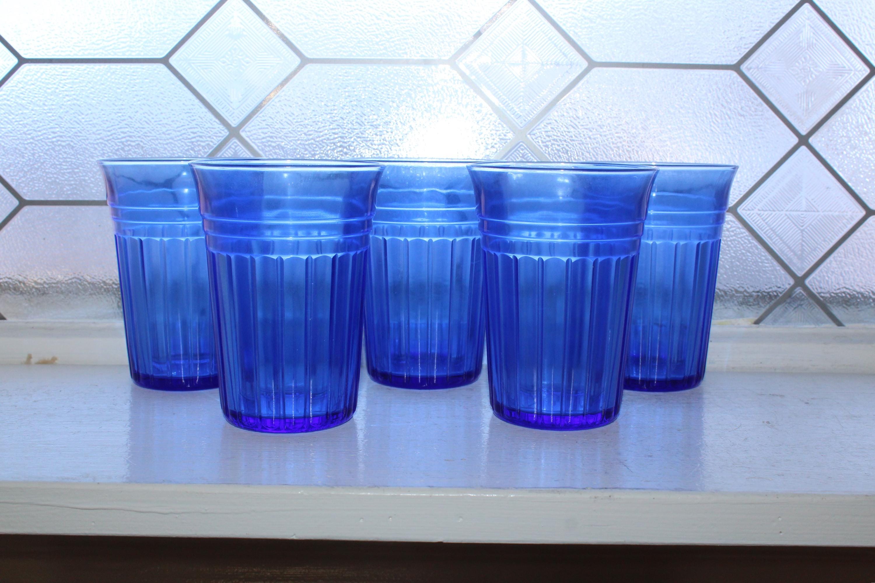 5 vintage 1930s cobalt blue depression glass Hazel Atlas New Century, also known as Lydia Ray, tumblers, in excellent condition. Each one measures 4" high x 3" wide at the top. No chips or cracks, light wear, perfect for use or display. Enjoy!