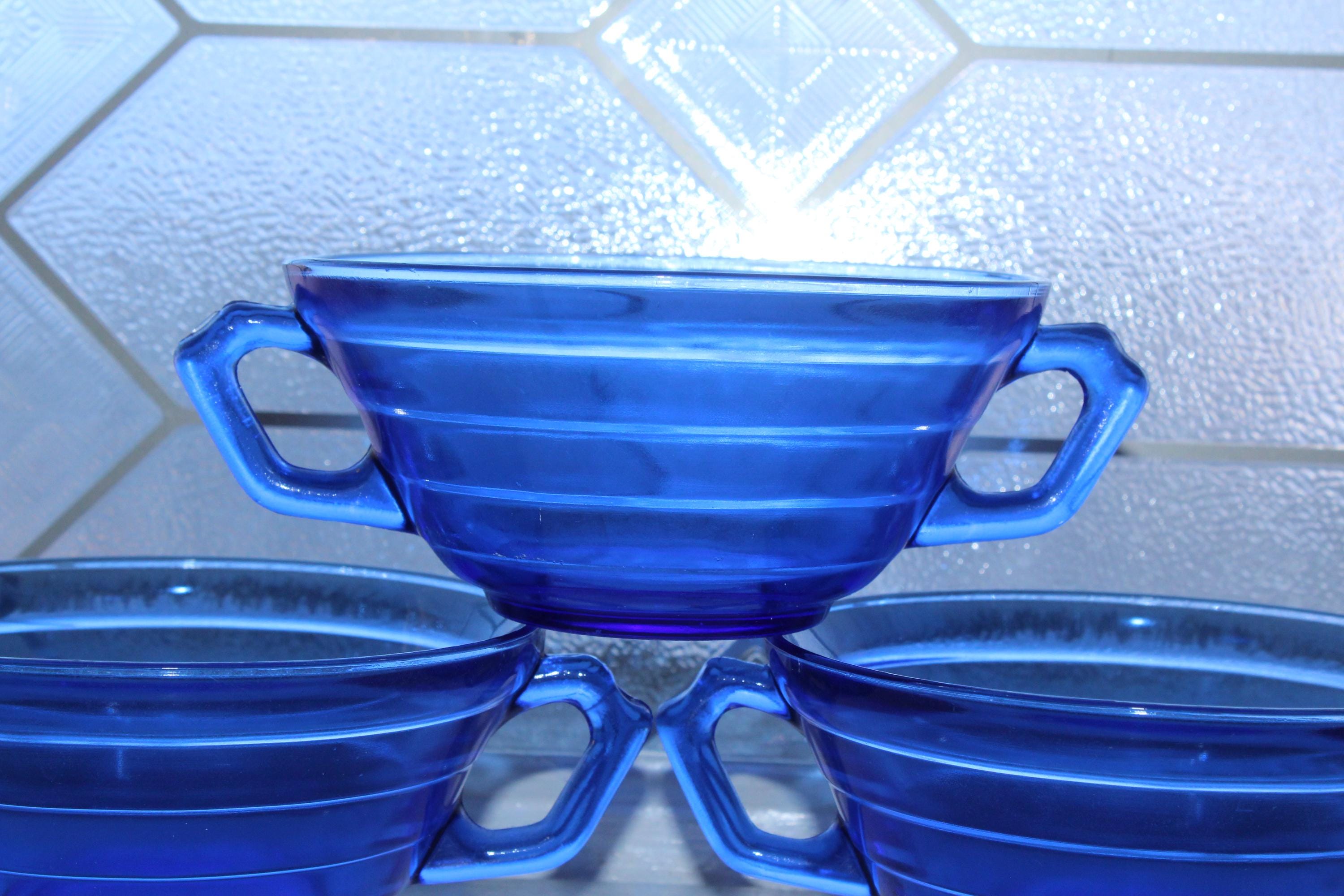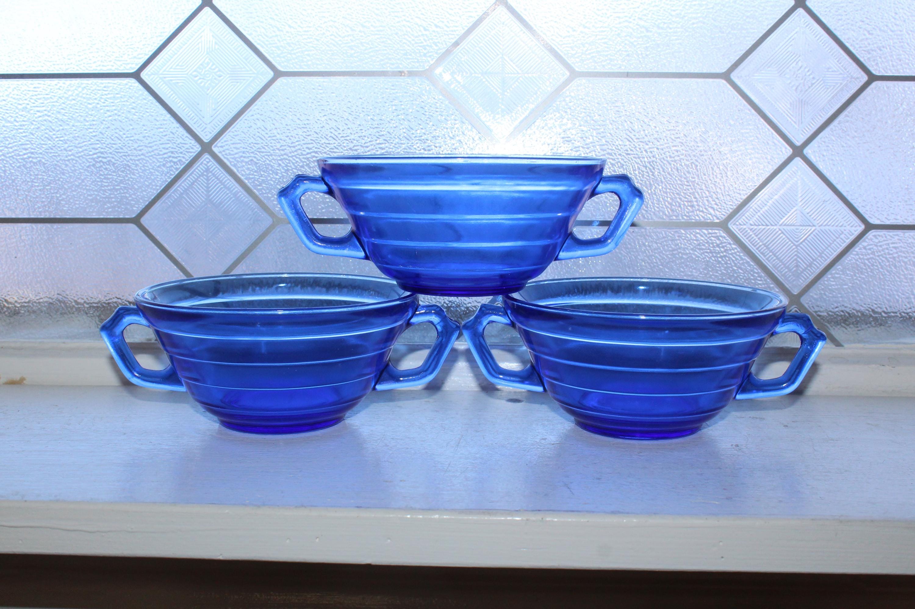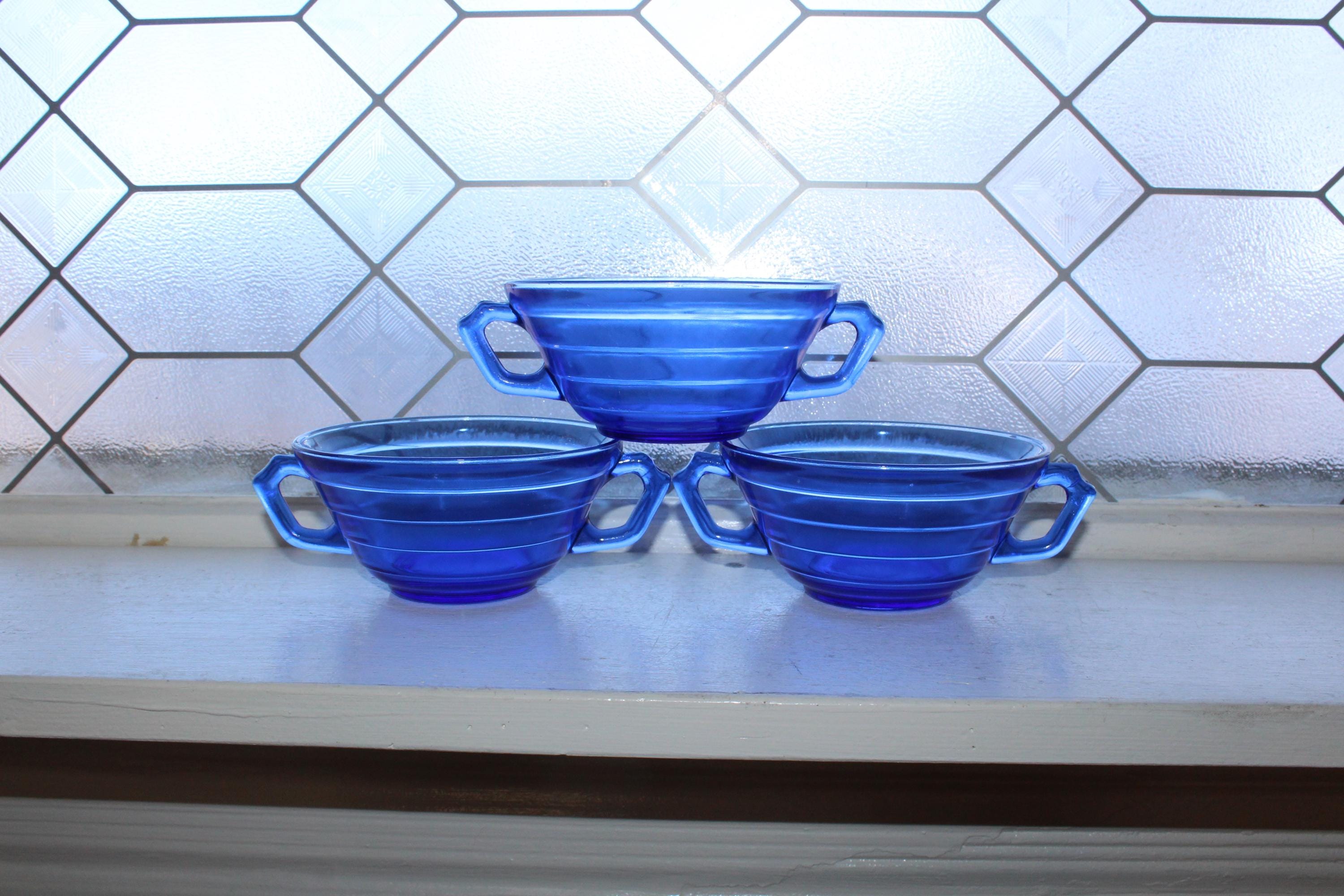 3 vintage 1930s cobalt blue depression glass Hazel Atlas Moderntone cream soup bowls with double handles, in excellent condition. Each bowl measures 2 1/4" high x 4 3/4" wide not including the handles. No chips or cracks, just some light wear, perfect for use or display. I have several other pieces in this pattern available in my shop. Enjoy!