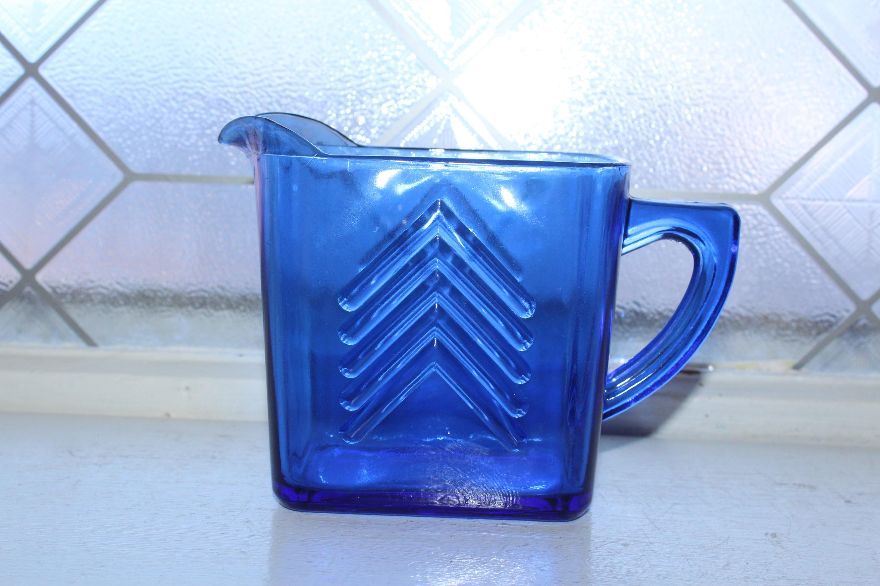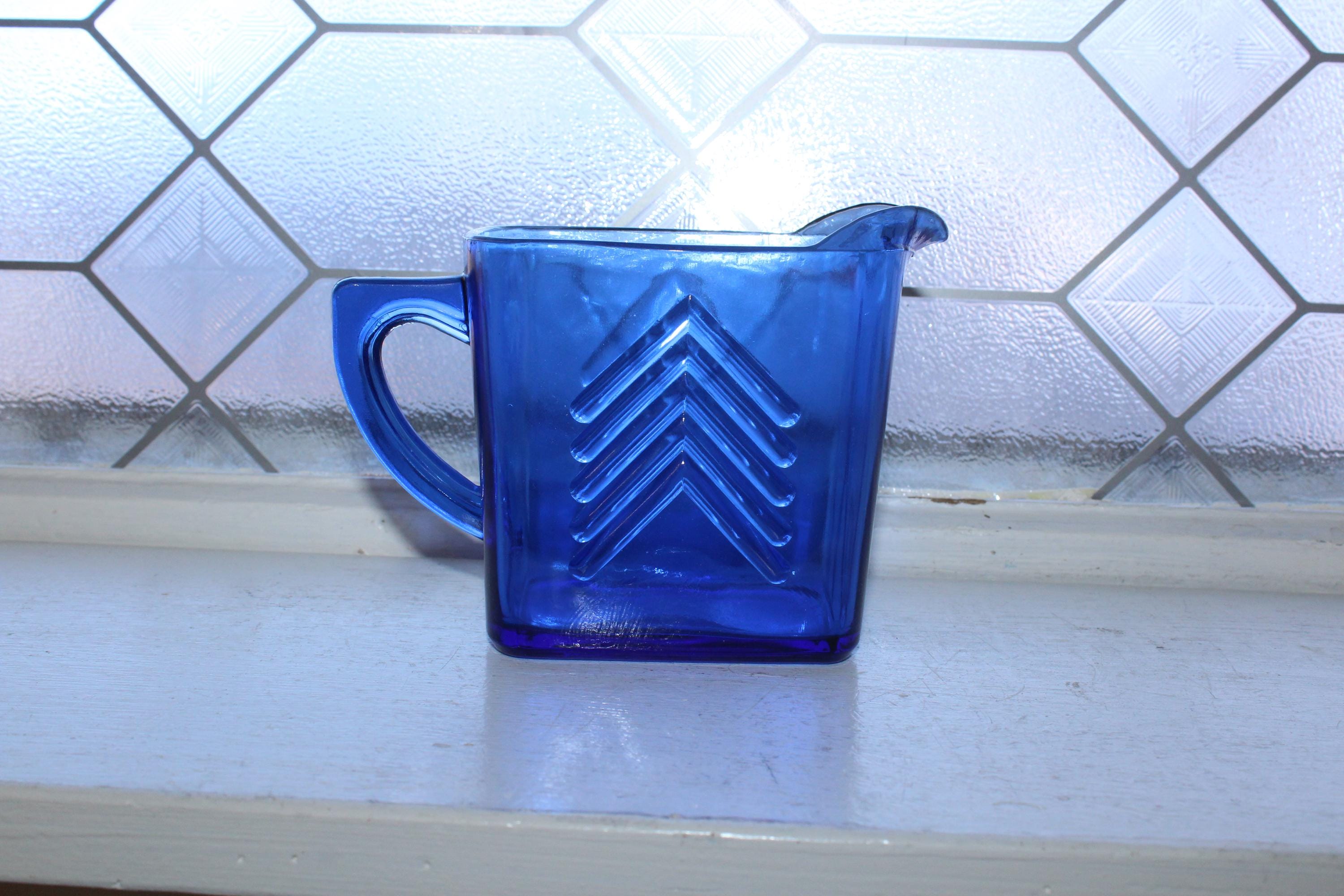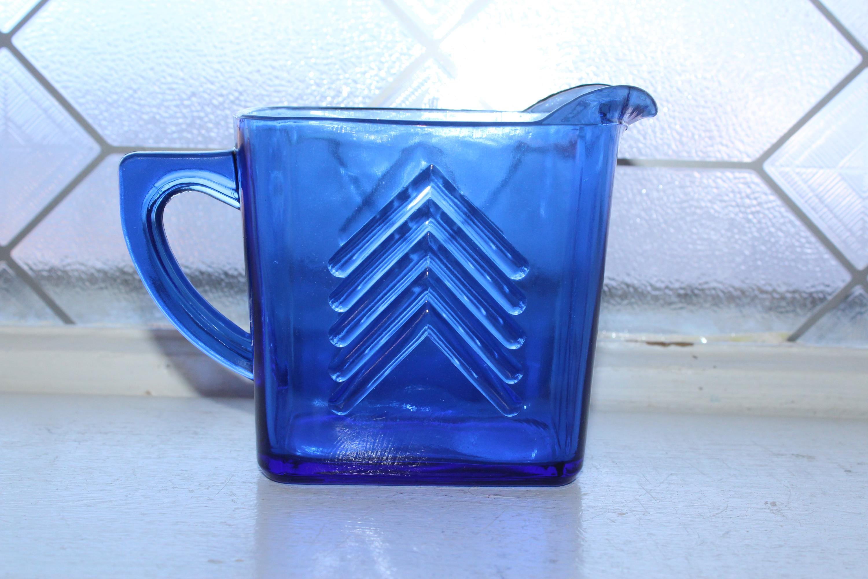 Vintage 1930s Art Deco cobalt blue depression glass creamer/pitcher with chevrons, by Hazel Atlas, in excellent condition. It measures 4 1/8" high. No chips or cracks. Enjoy!