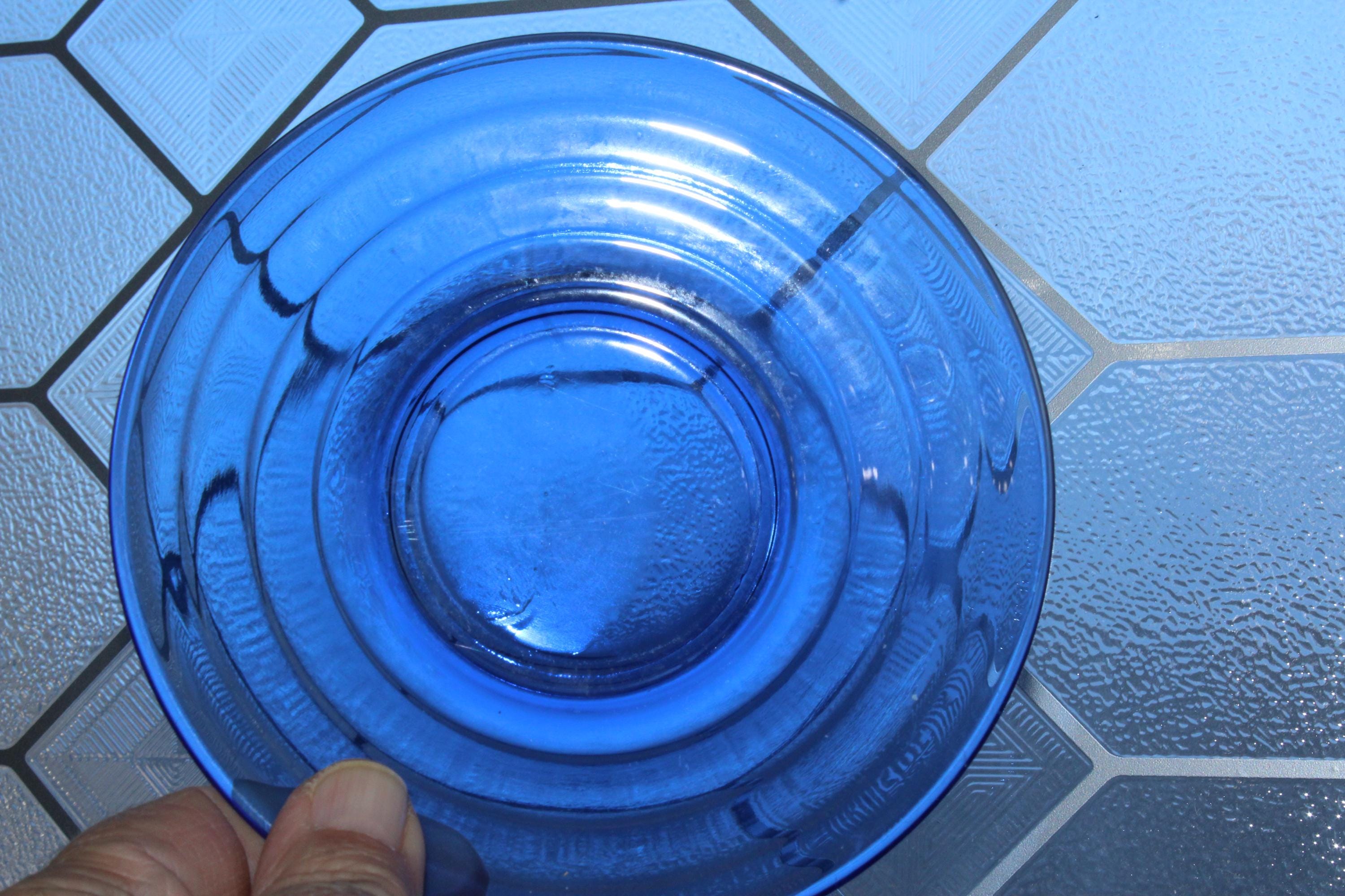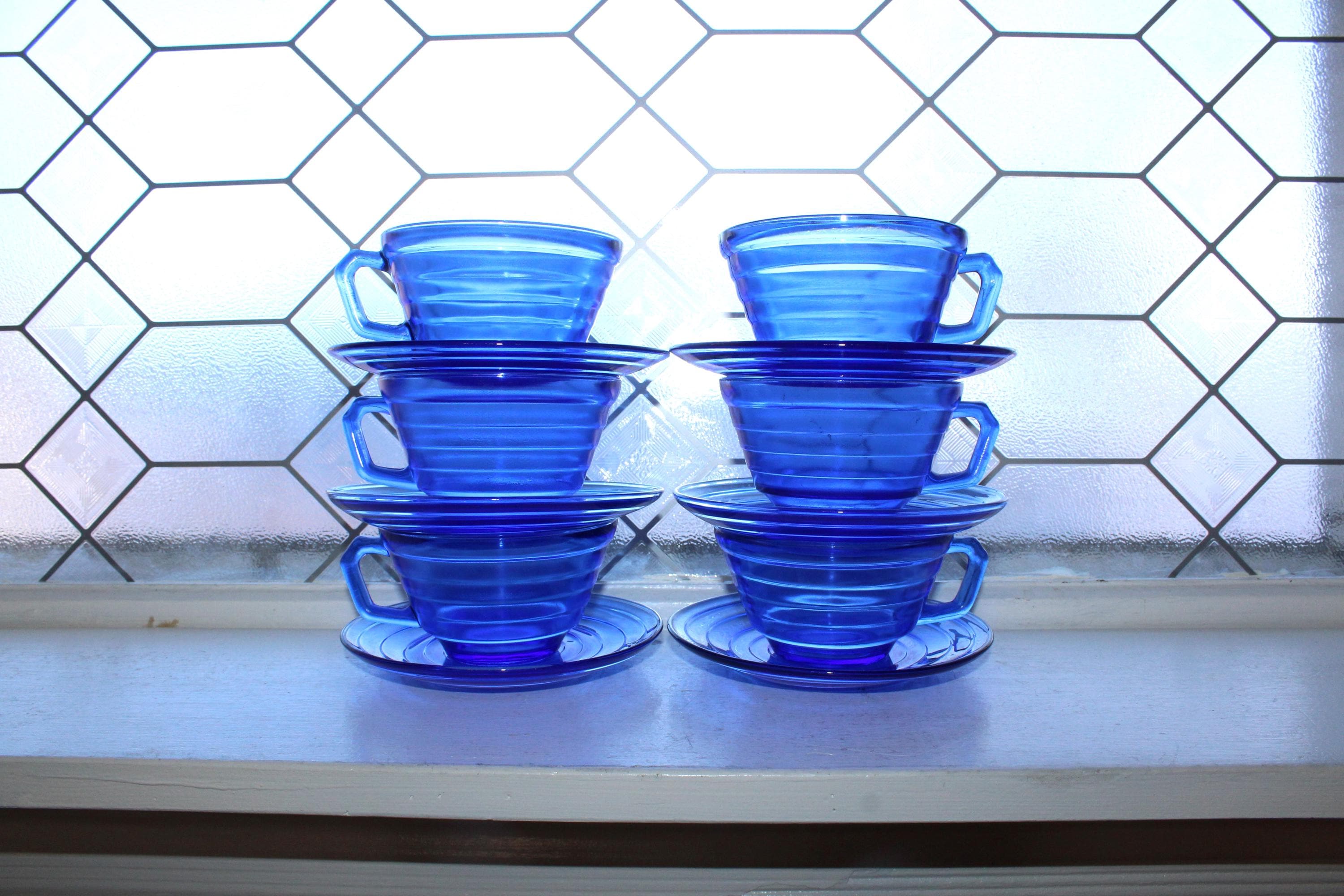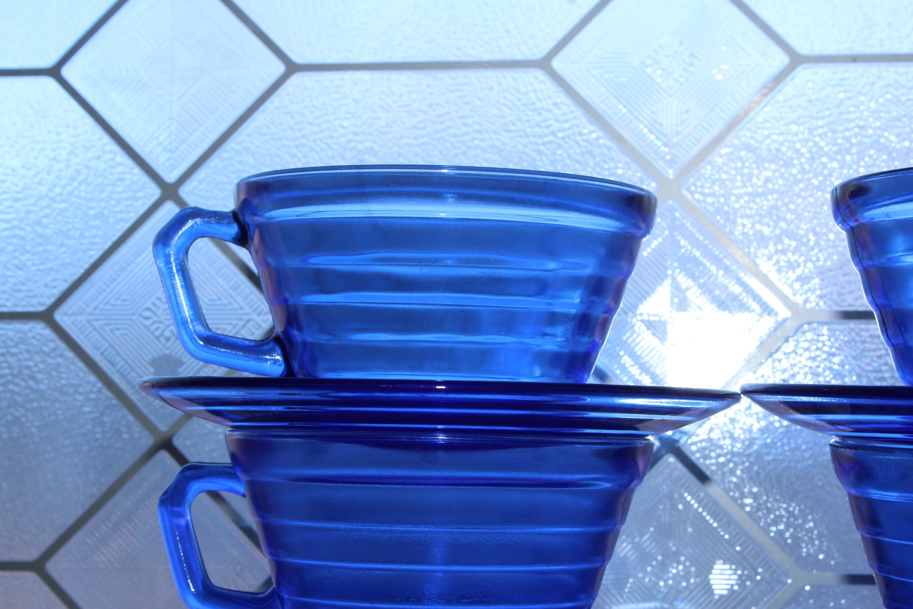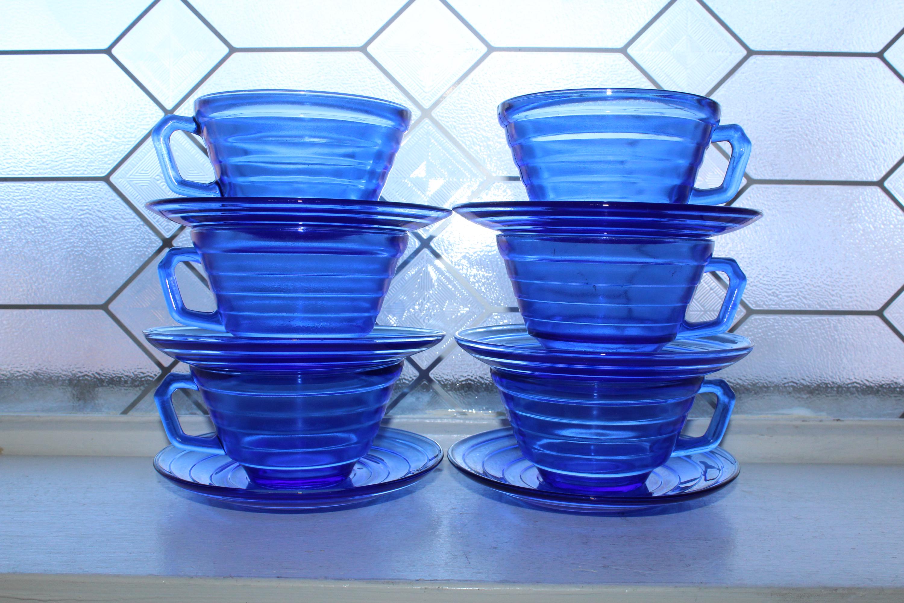 6 vintage 1930s Art Deco cobalt blue depression glass Moderntone cups and saucers, in excellent condition. Each cup measures 4" in diameter x 2 3/8" high, and each saucer measures 5 1/2" wide. No chips or cracks, perfect for use or display. I have several other pieces in this set available in my shop. Enjoy!