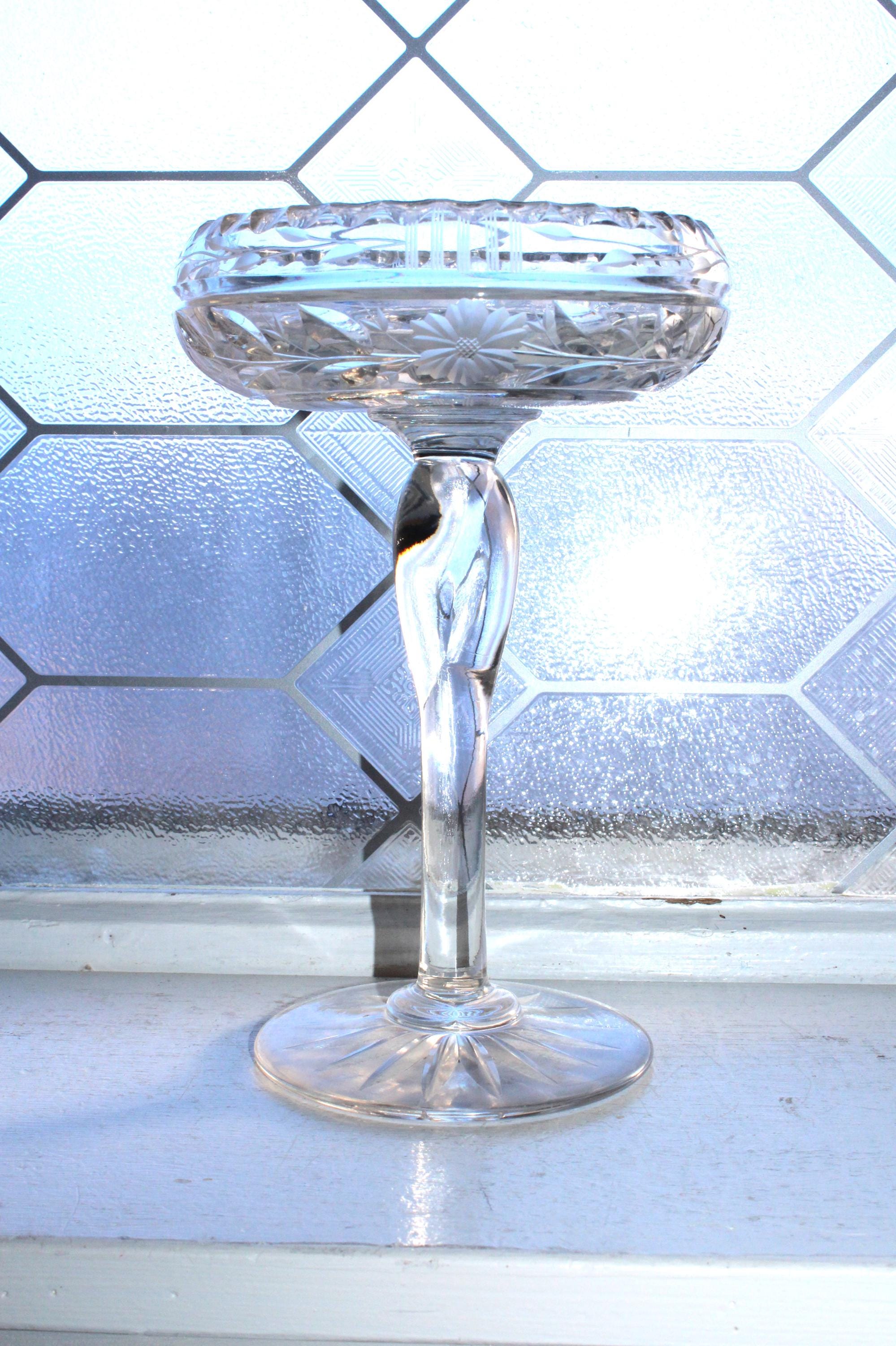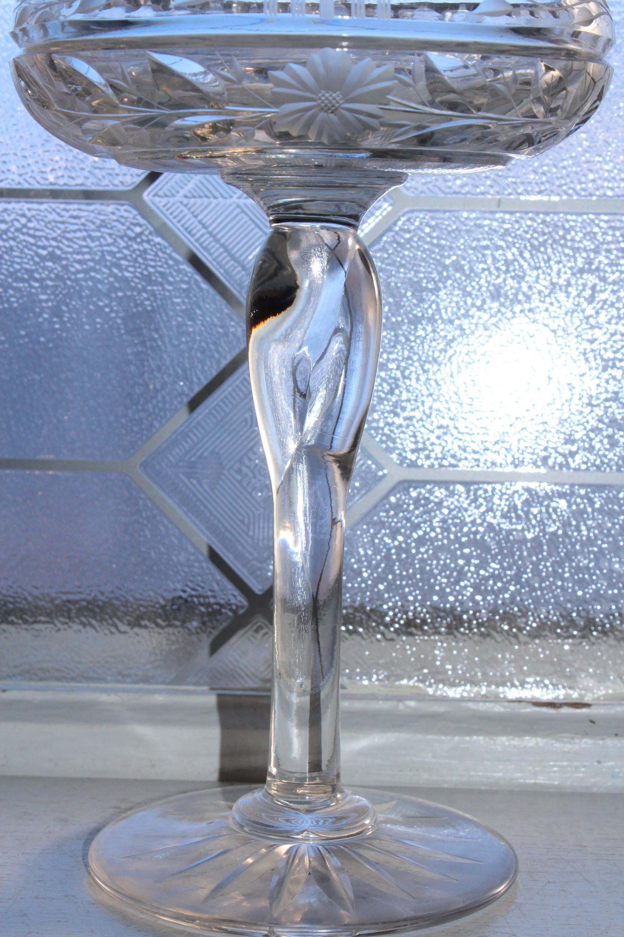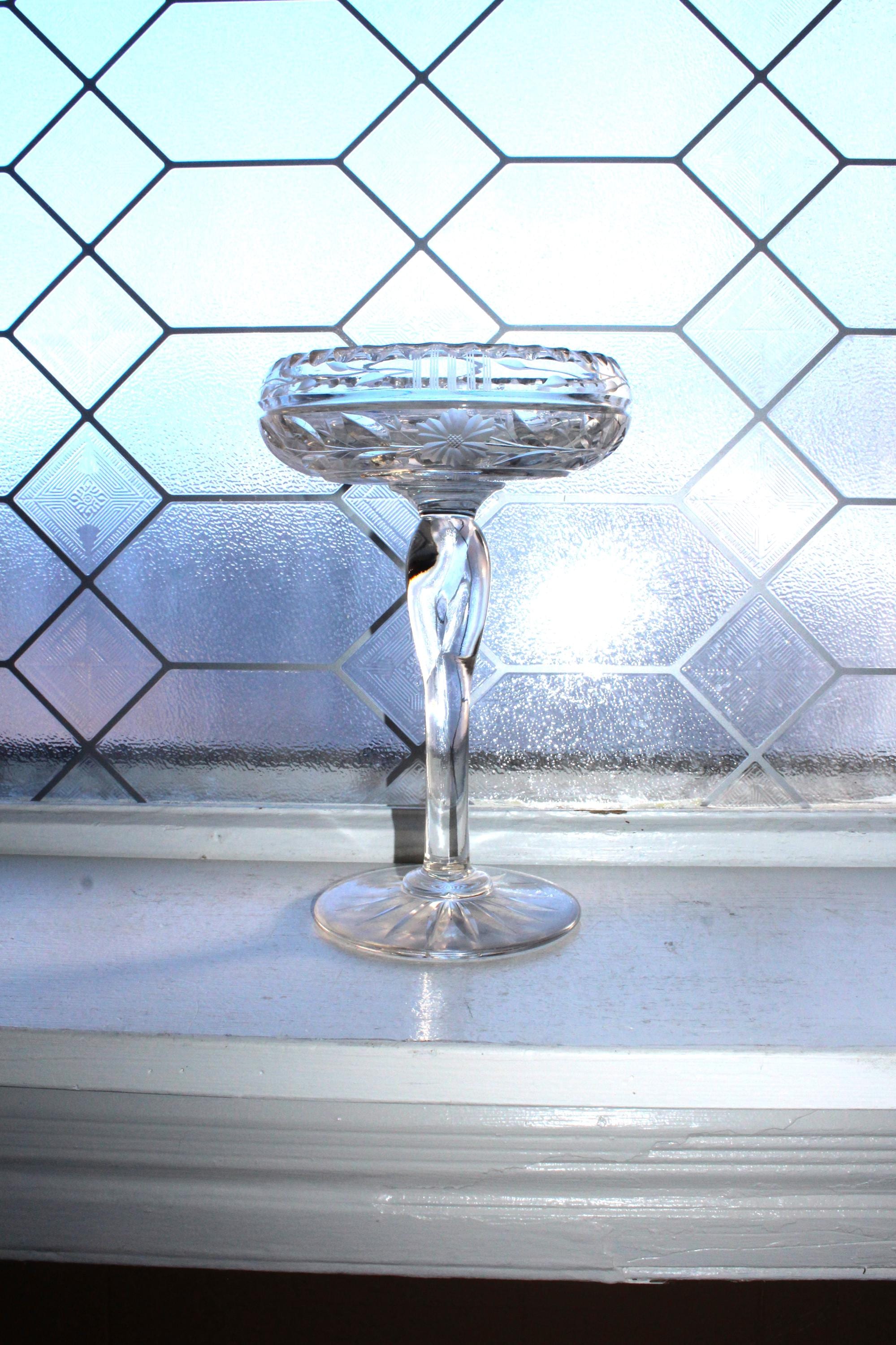 Antique Art Deco cut crystal tazza or compote, in excellent condition. It measures 5 1/4" wide x 8" high, weighs 1 1/2 lbs. and has a wonderful ring to it when pinged. No chips or cracks, perfect for use or display. Enjoy!