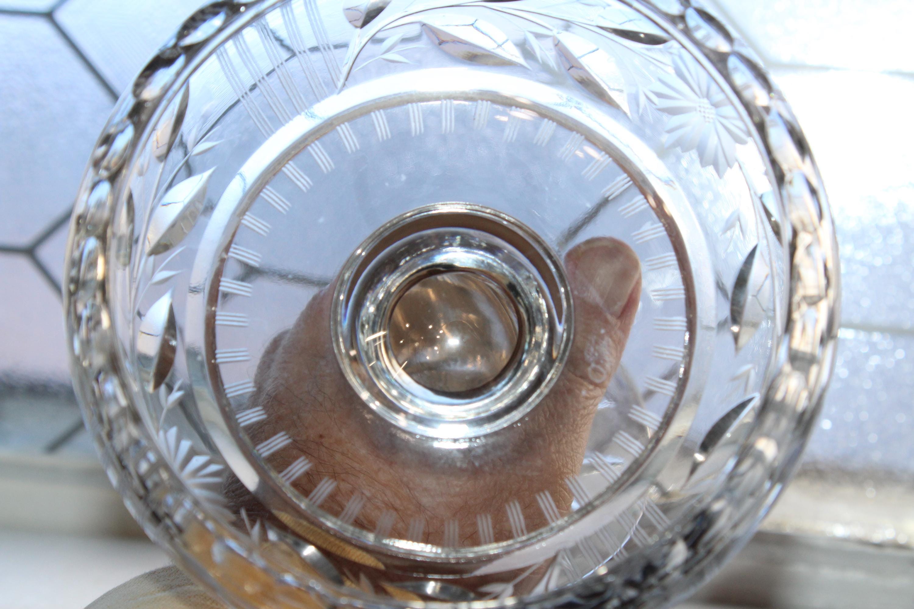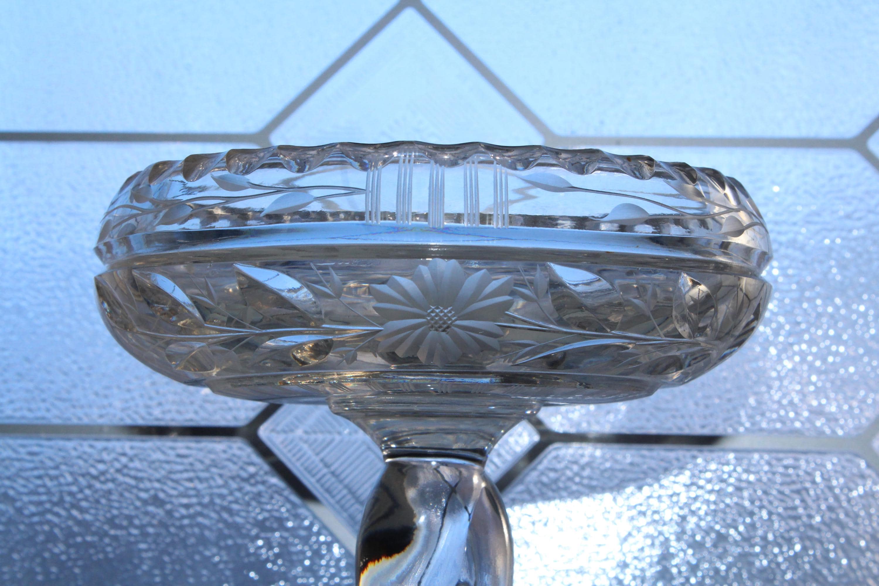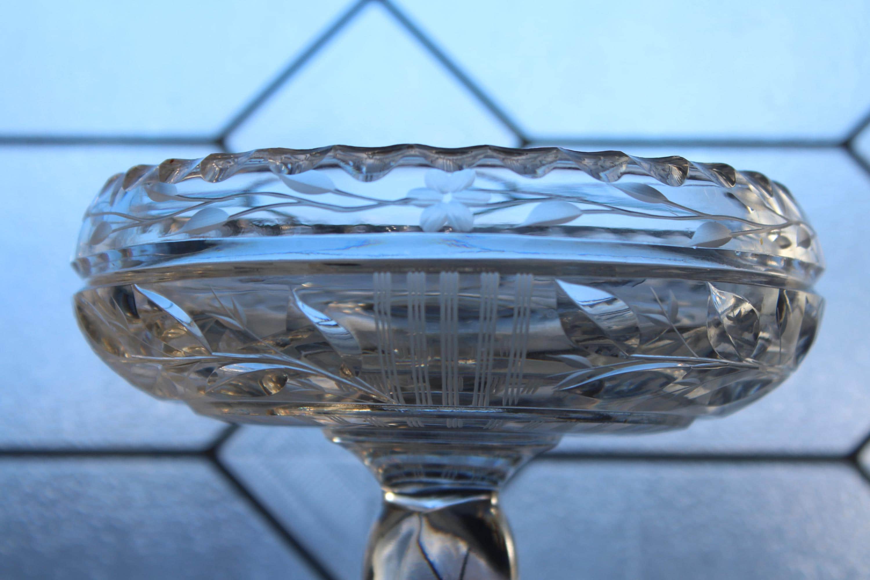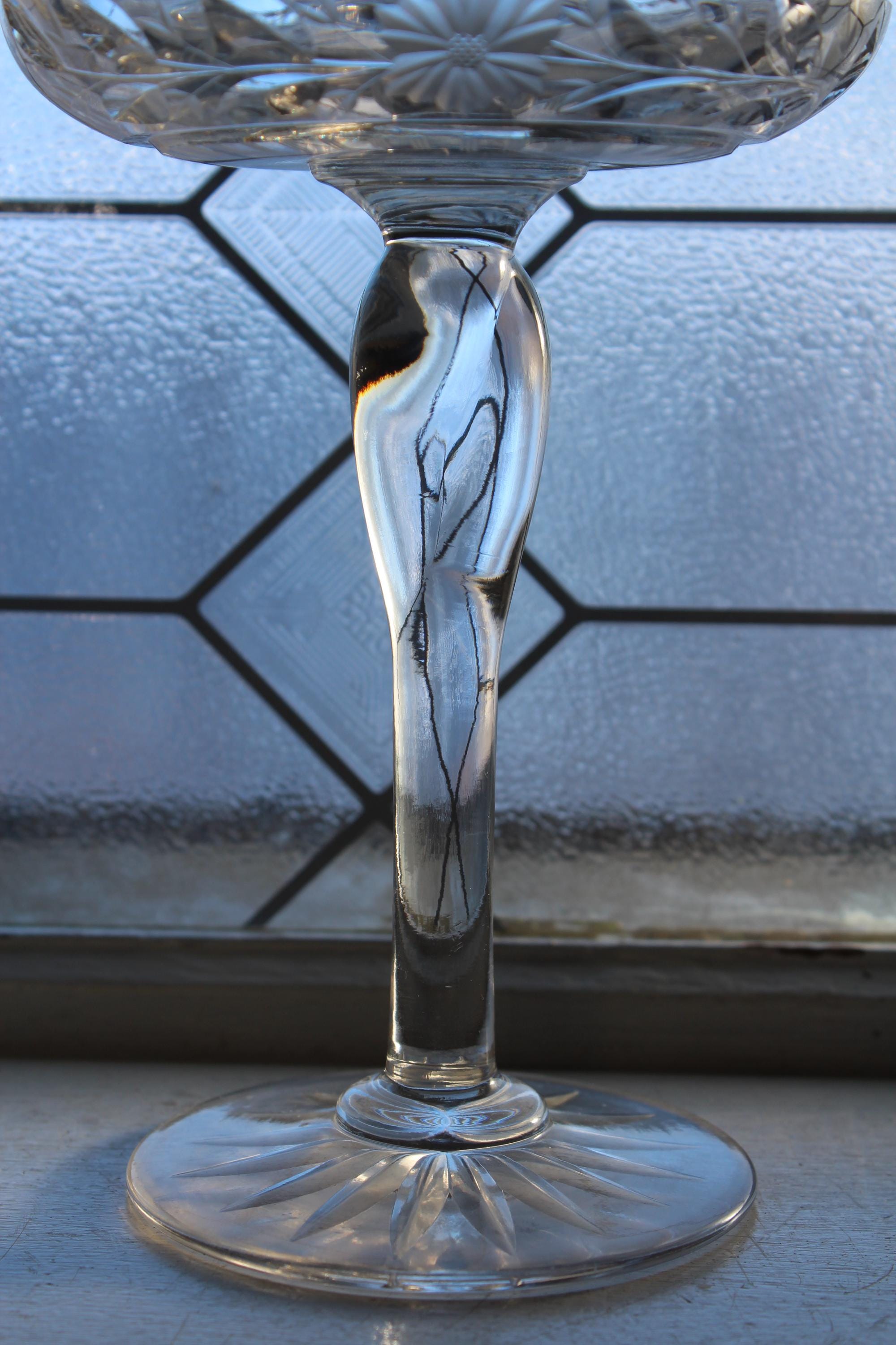 Antique Art Deco cut crystal tazza or compote, in excellent condition. It measures 5 1/4" wide x 8" high, weighs 1 1/2 lbs. and has a wonderful ring to it when pinged. No chips or cracks, perfect for use or display. Enjoy!
