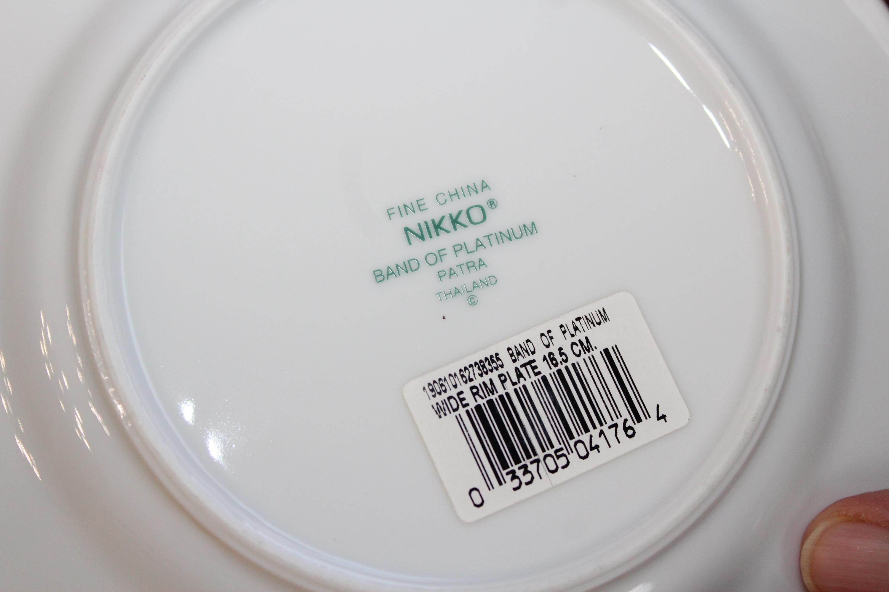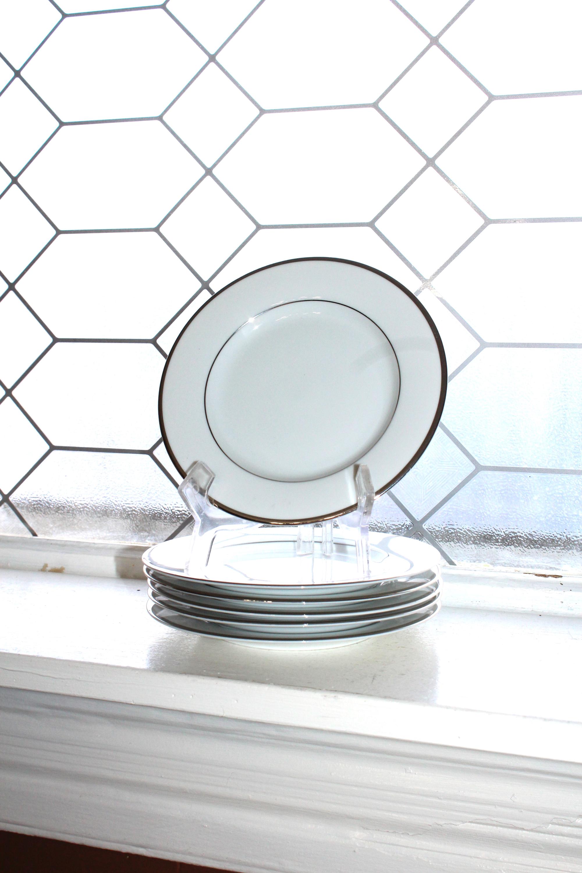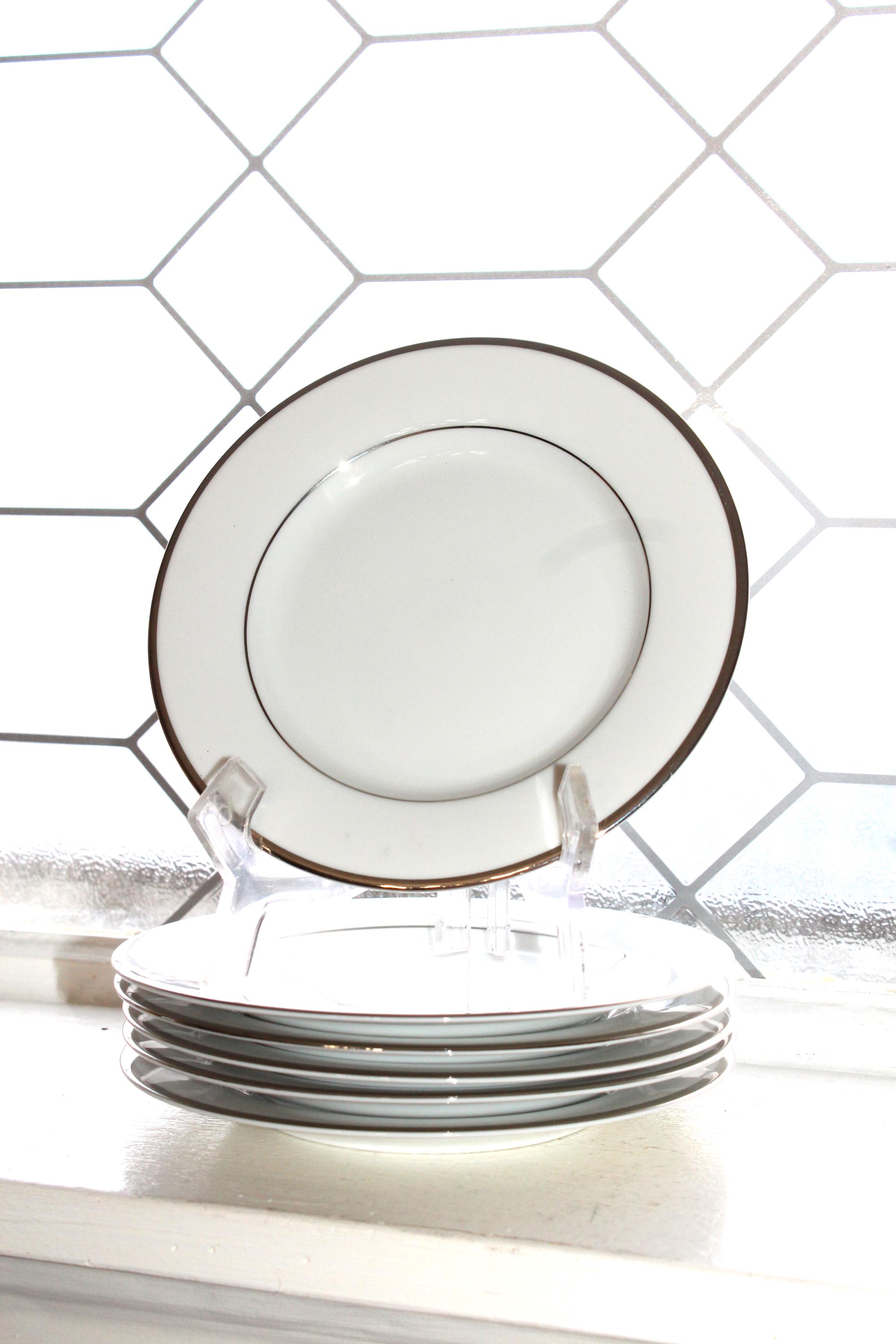 5 Nikko Patra Band of Platinum fine china bread and butter plates, in excellent condition. They measure 6 1/2" wide. No chips, cracks or crazing, perfect for use or display. I HAVE SEVERAL OTHER PIECES OF THIS PATTERN AVAILABLE IN MY SHOP. Enjoy!