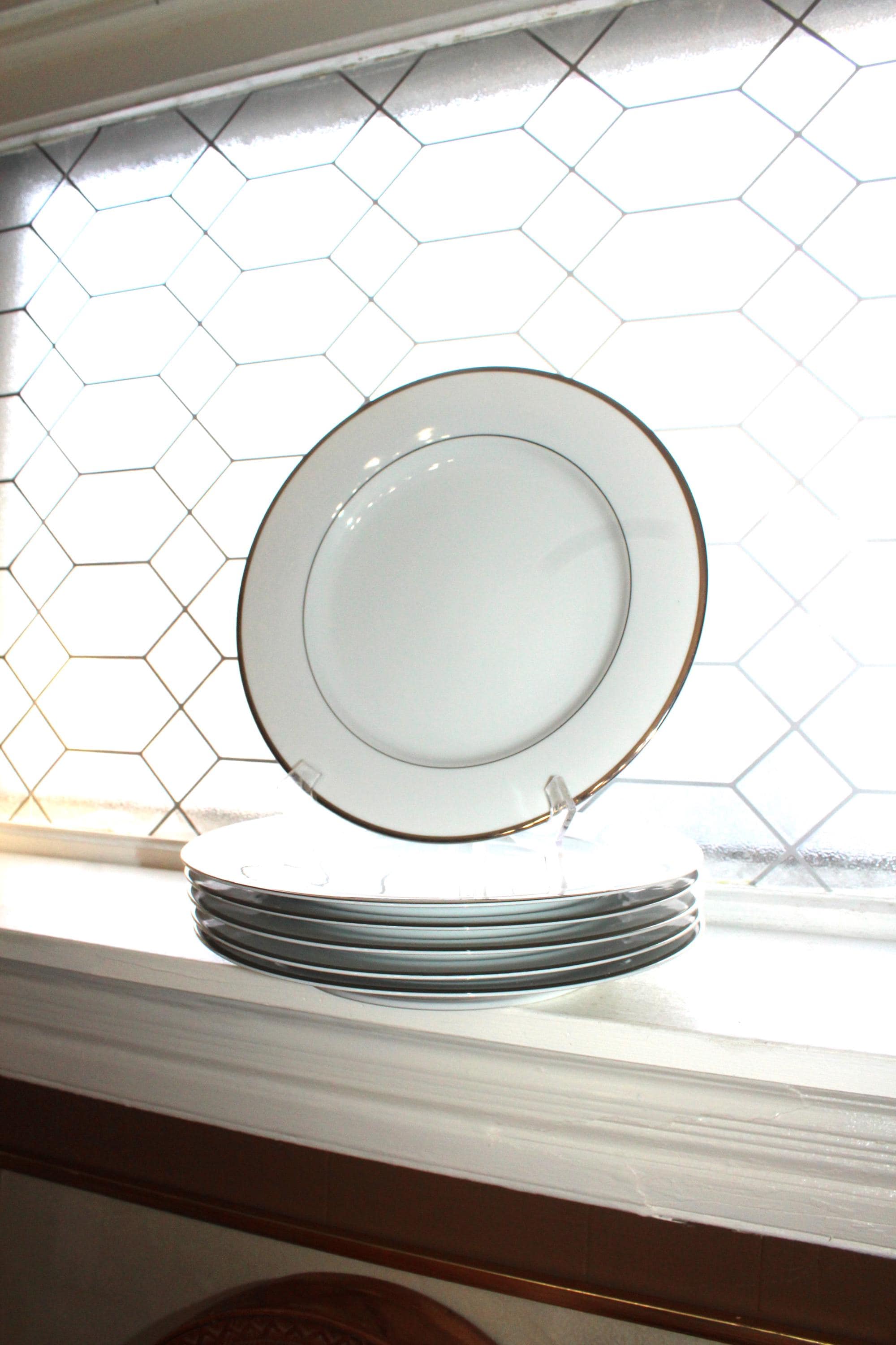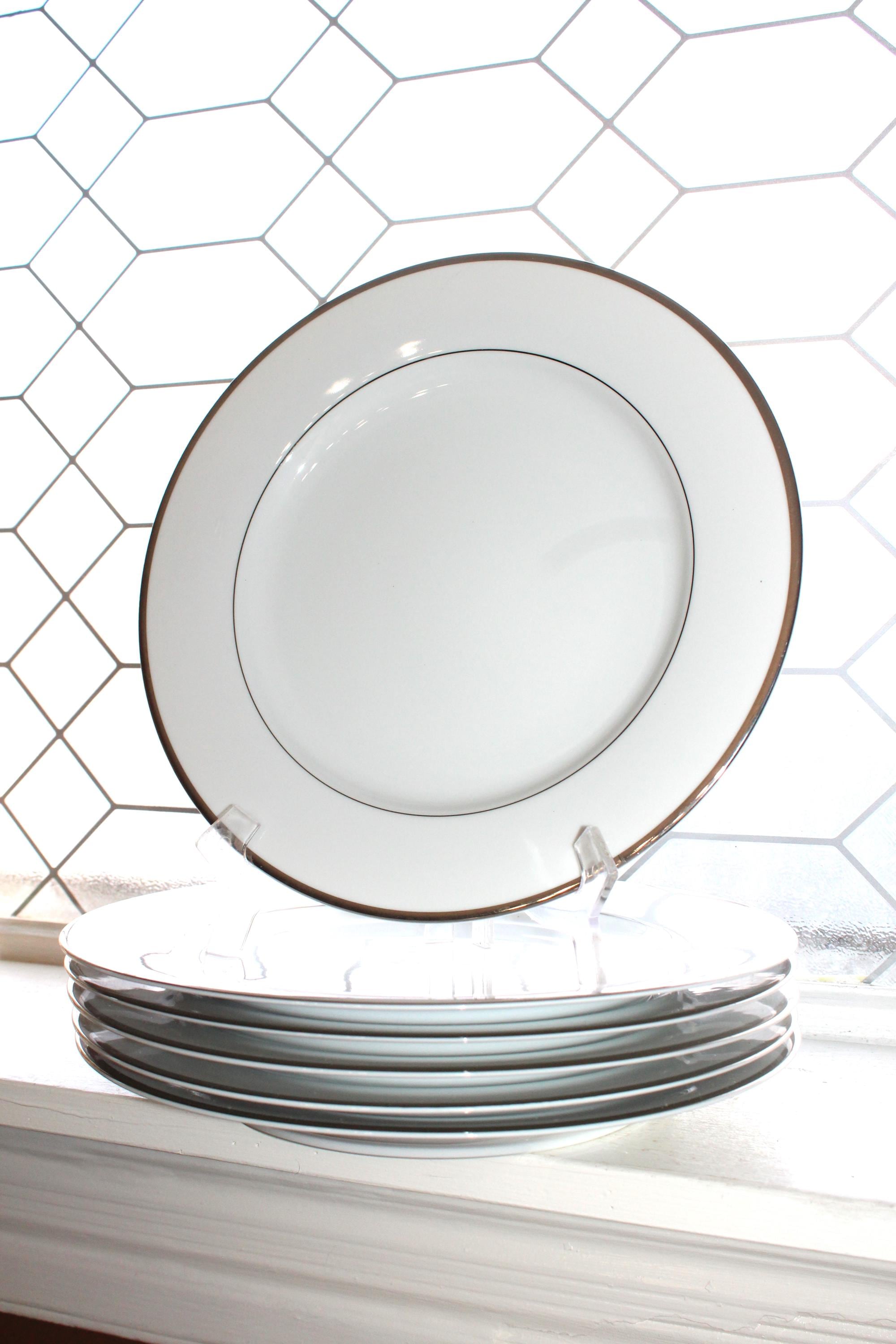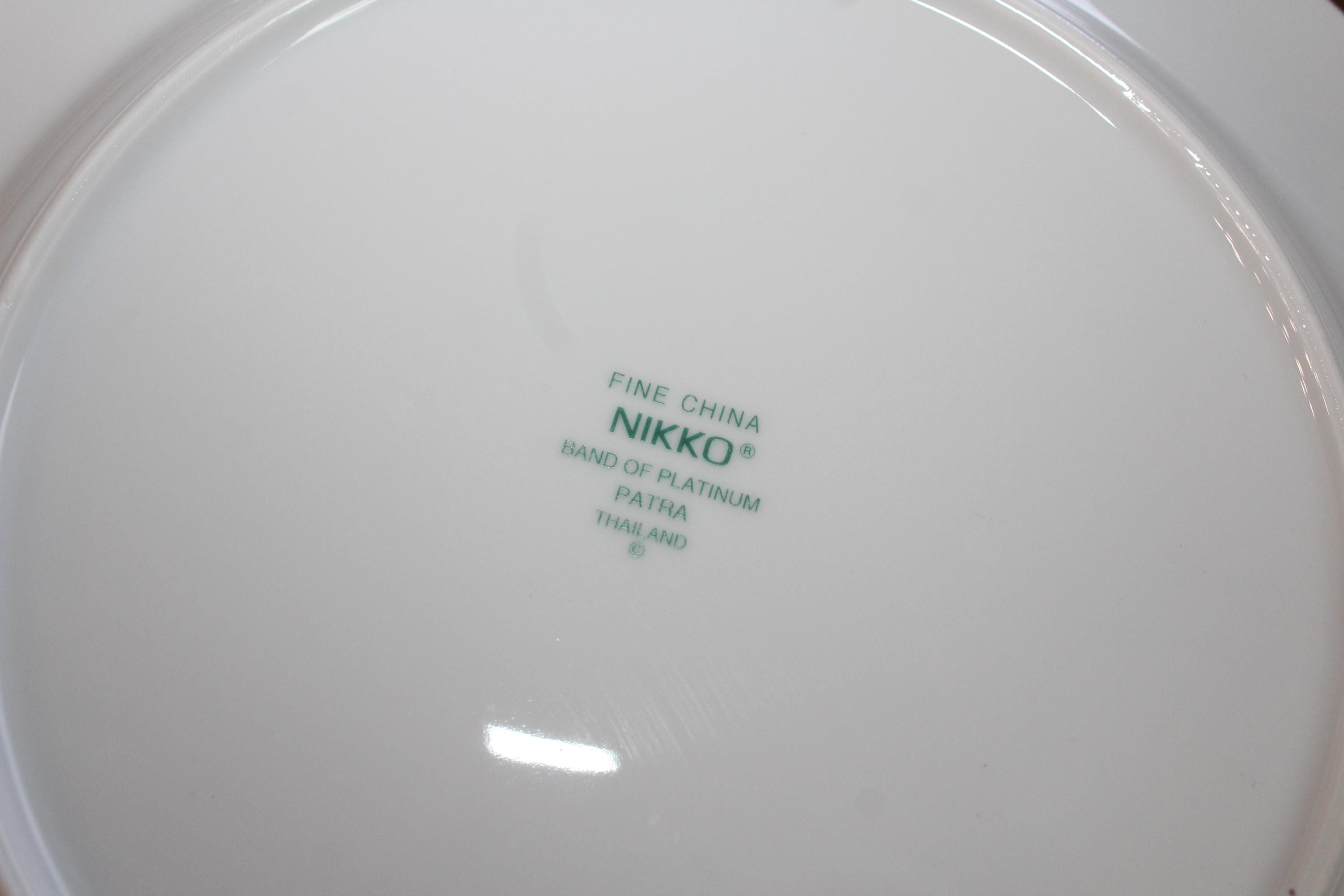 4 Nikko Patra Band of Platinum fine china dinner plates, in excellent condition. They measure 10 3/4" wide. No chips, cracks or crazing, perfect for use or display. THERE ARE 2 SETS OF 4 AVAILABLE VIA THE DROP DOWN BOX. I HAVE SEVERAL OTHER PIECES OF THIS PATTERN AVAILABLE IN MY SHOP. Enjoy!