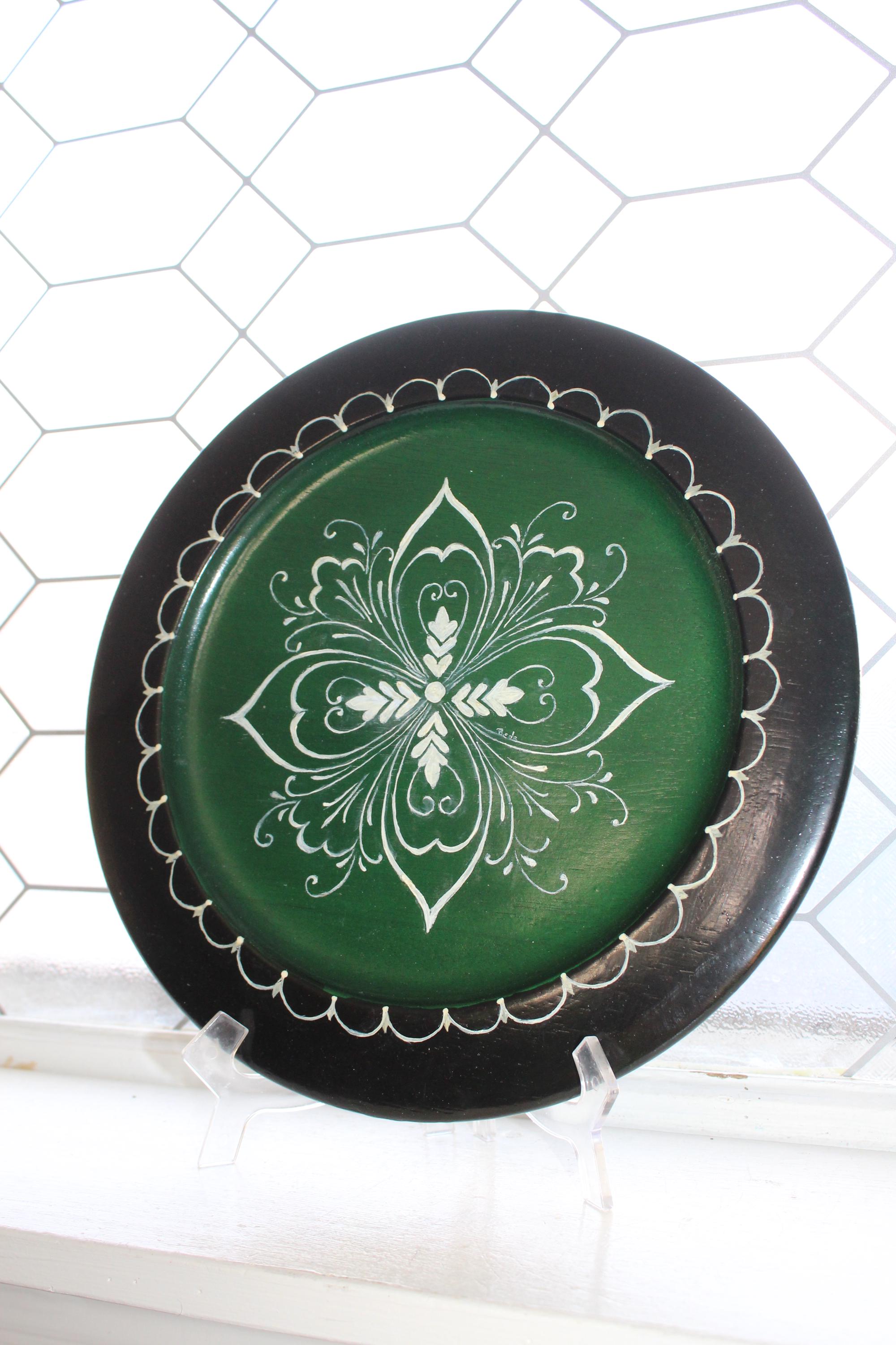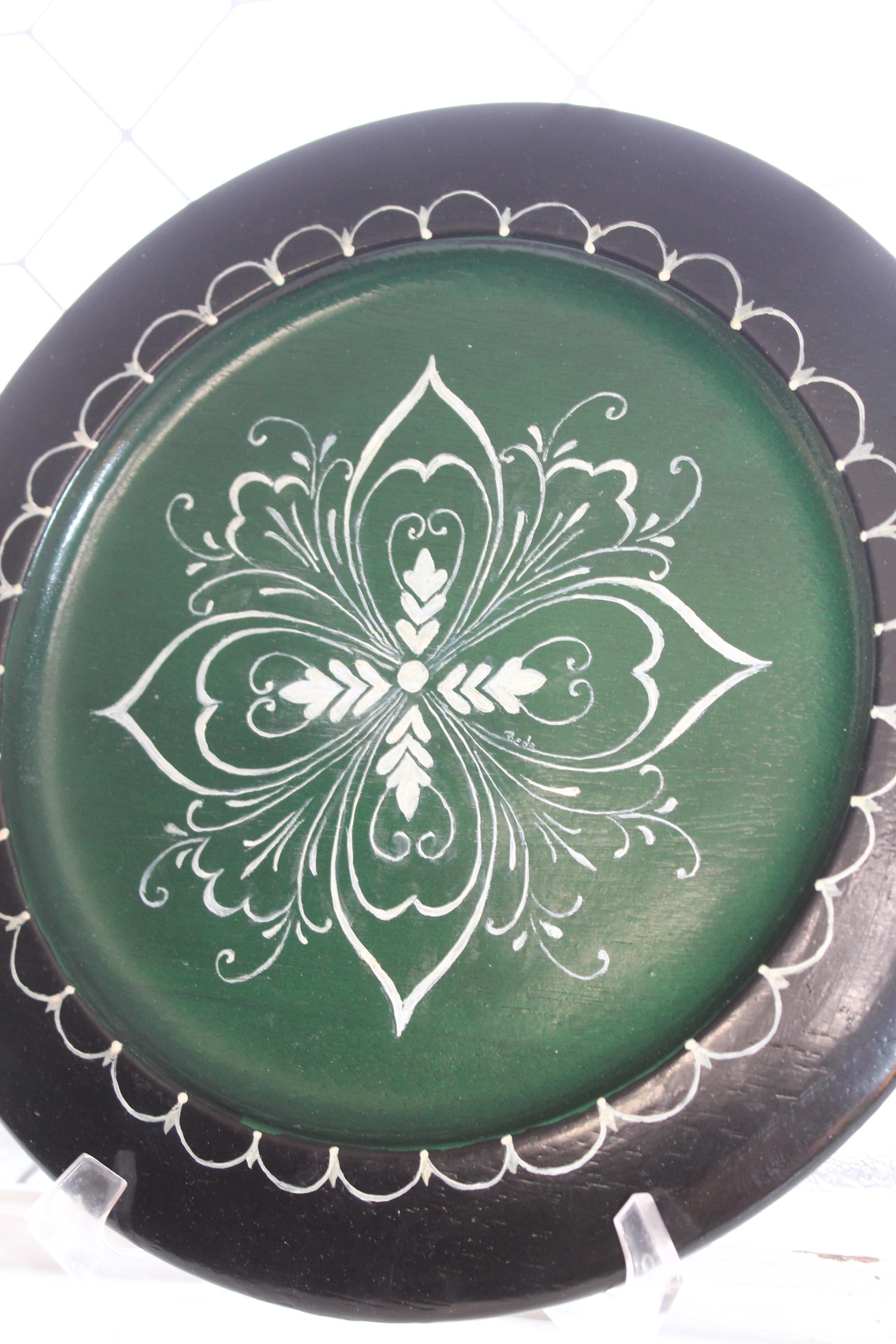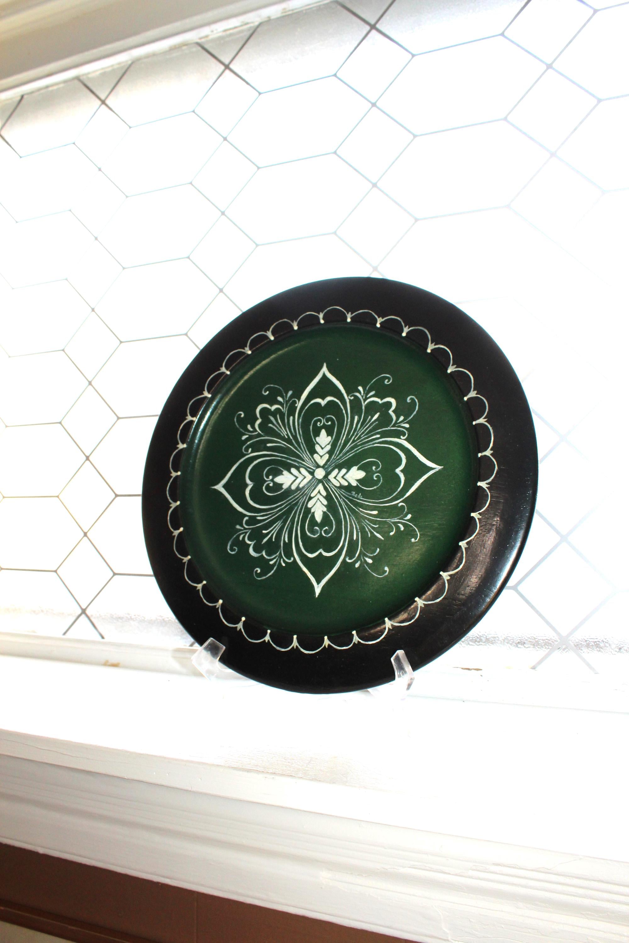 Large vintage wooden platter painted with Norwegian rosemaling, signed by the artist Beda, in good condition. The tray/platter measures 12 1/4" wide. Perfect for display in a country home. Enjoy!