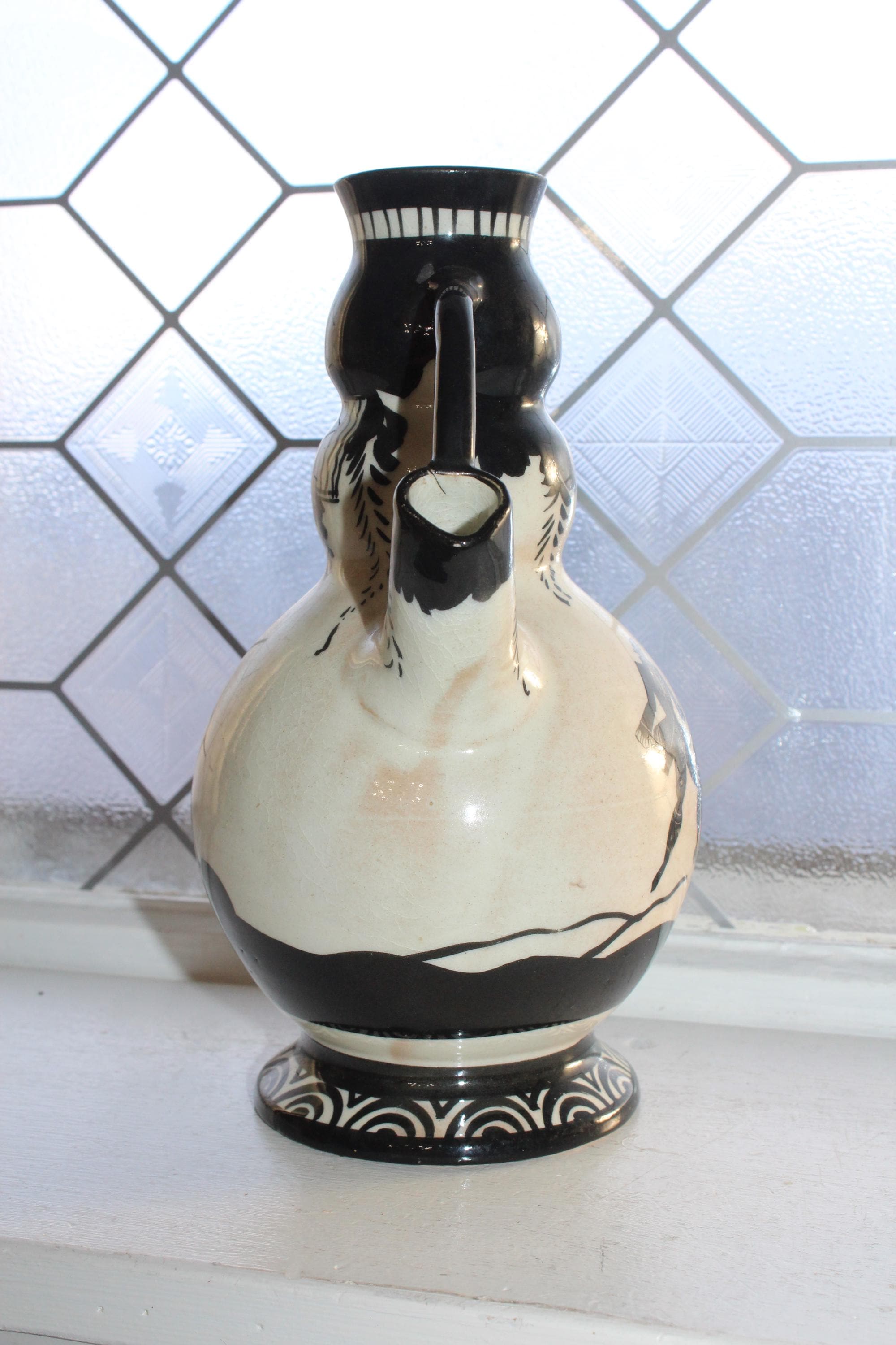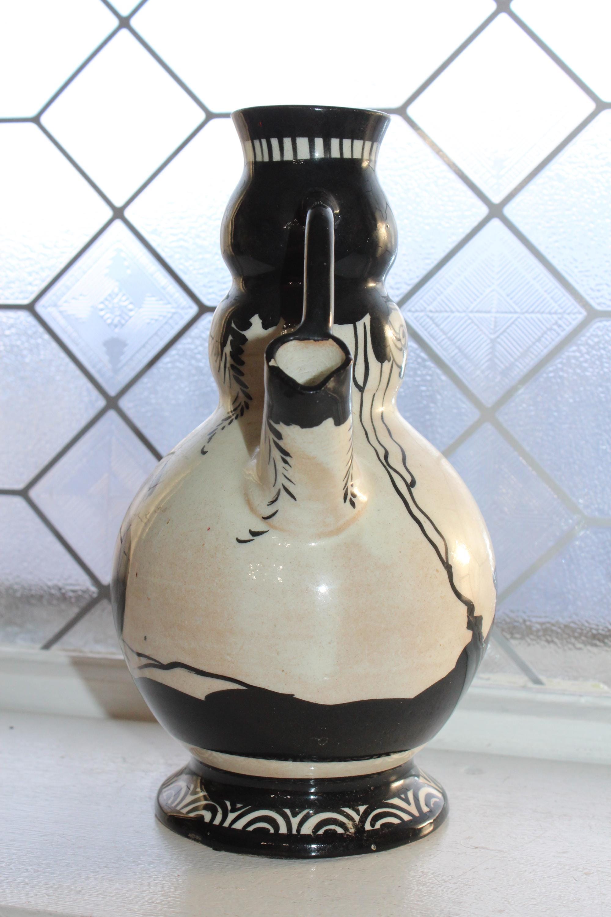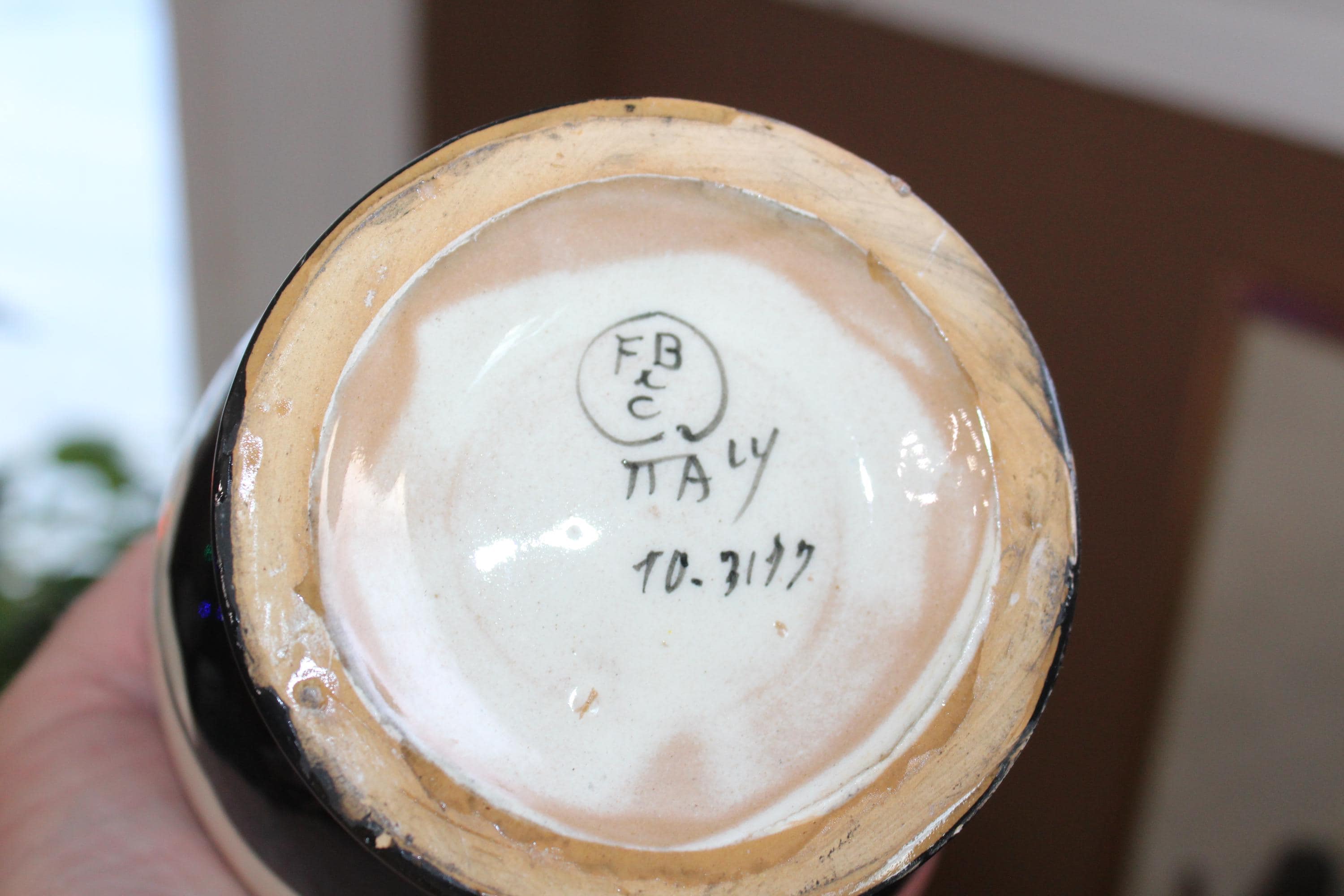 This is a fabulous vintage Art Deco majolica hand-painted pitcher made by Fernando Boldrini and Company in Deruta, Italy. It measures 8 1/2" high. There is a small right side spout rim chip, no other chips or cracks. Displays very well. Enjoy!