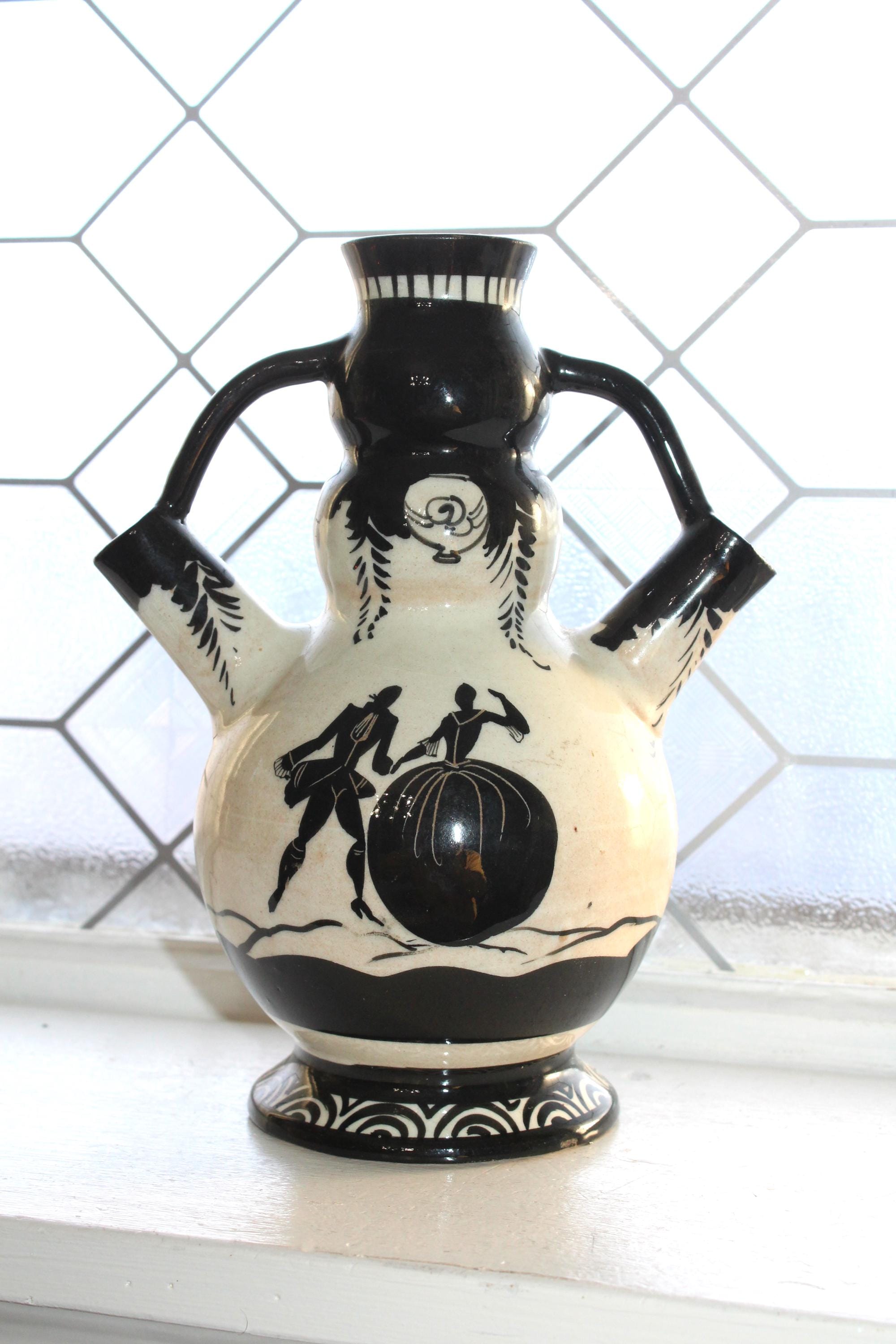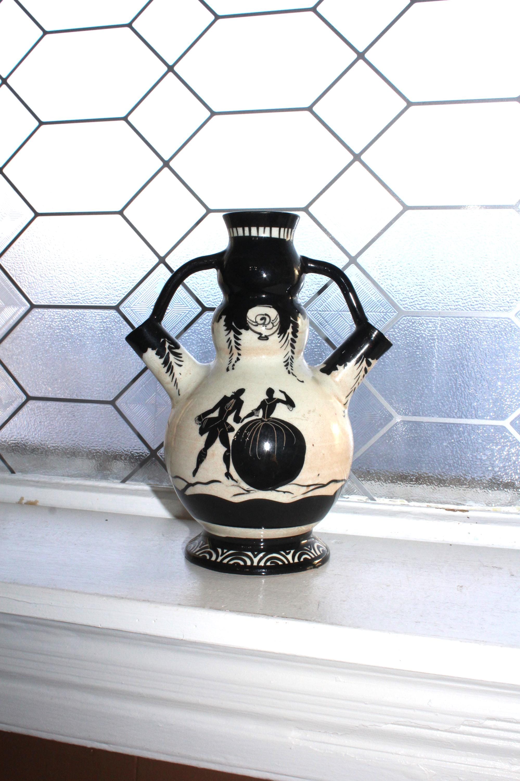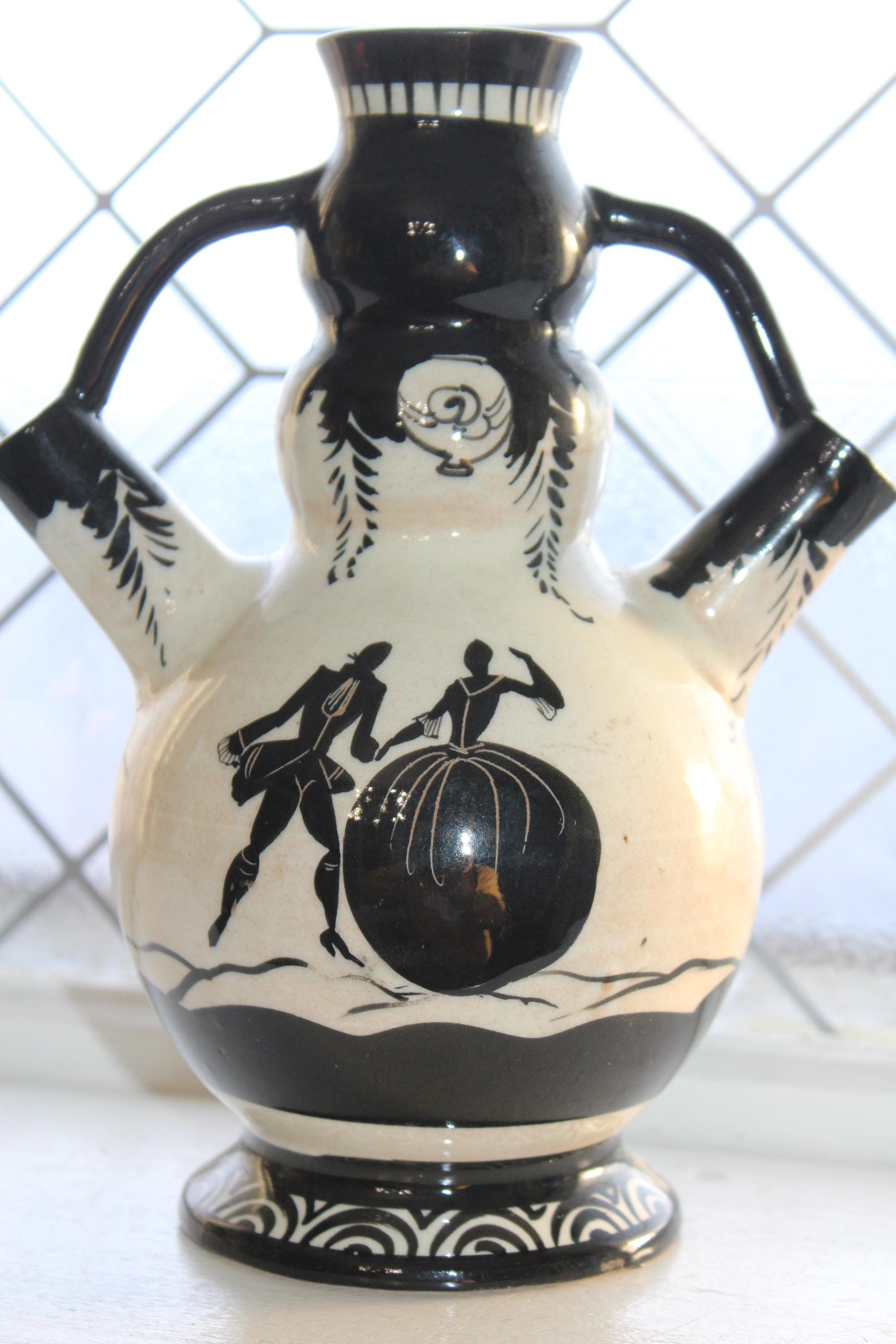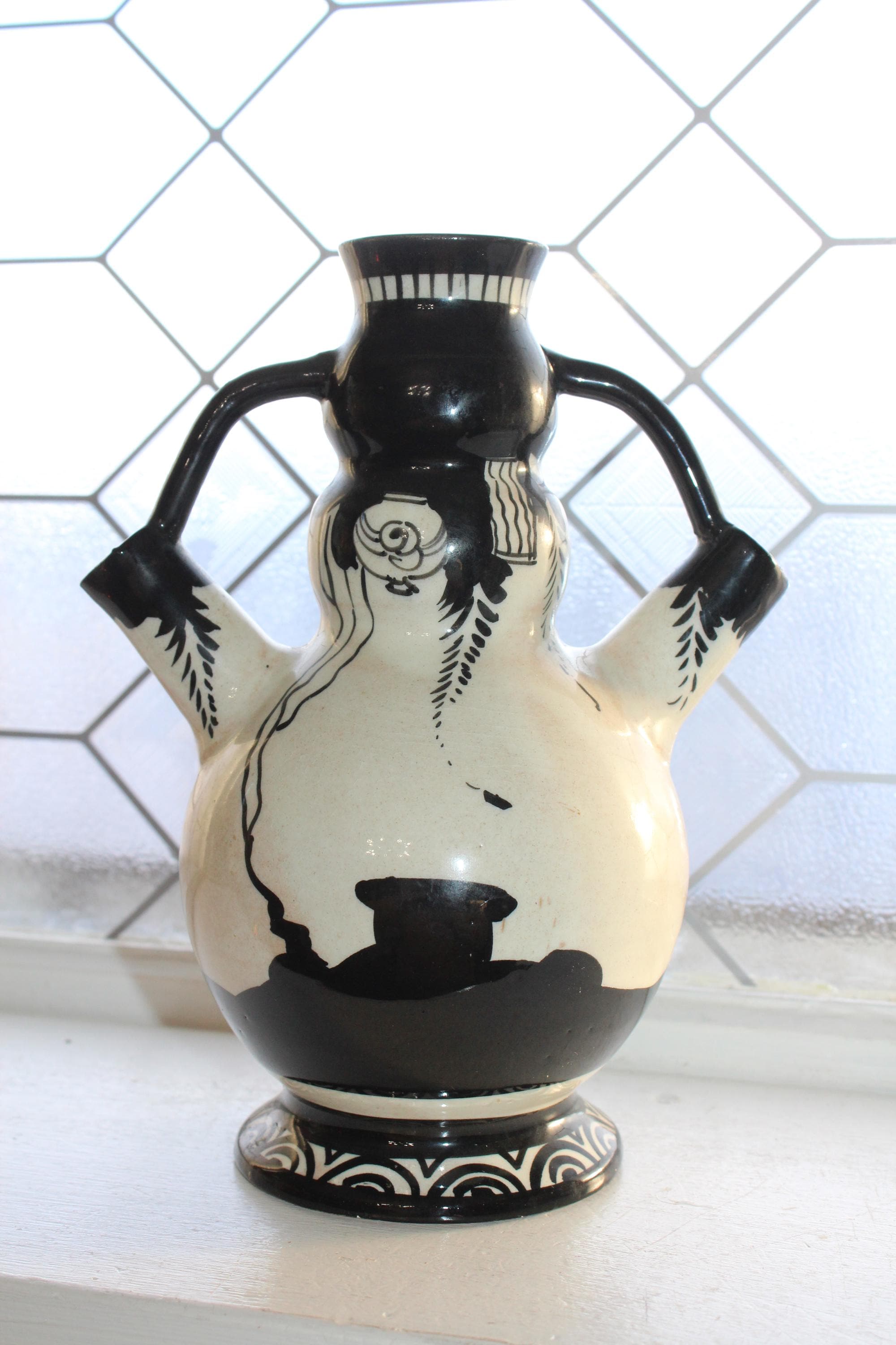 This is a fabulous vintage Art Deco majolica hand-painted pitcher made by Fernando Boldrini and Company in Deruta, Italy. It measures 8 1/2" high. There is a small right side spout rim chip, no other chips or cracks. Displays very well. Enjoy!